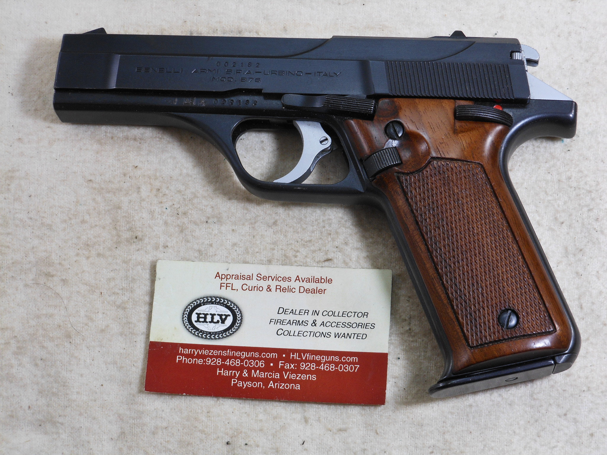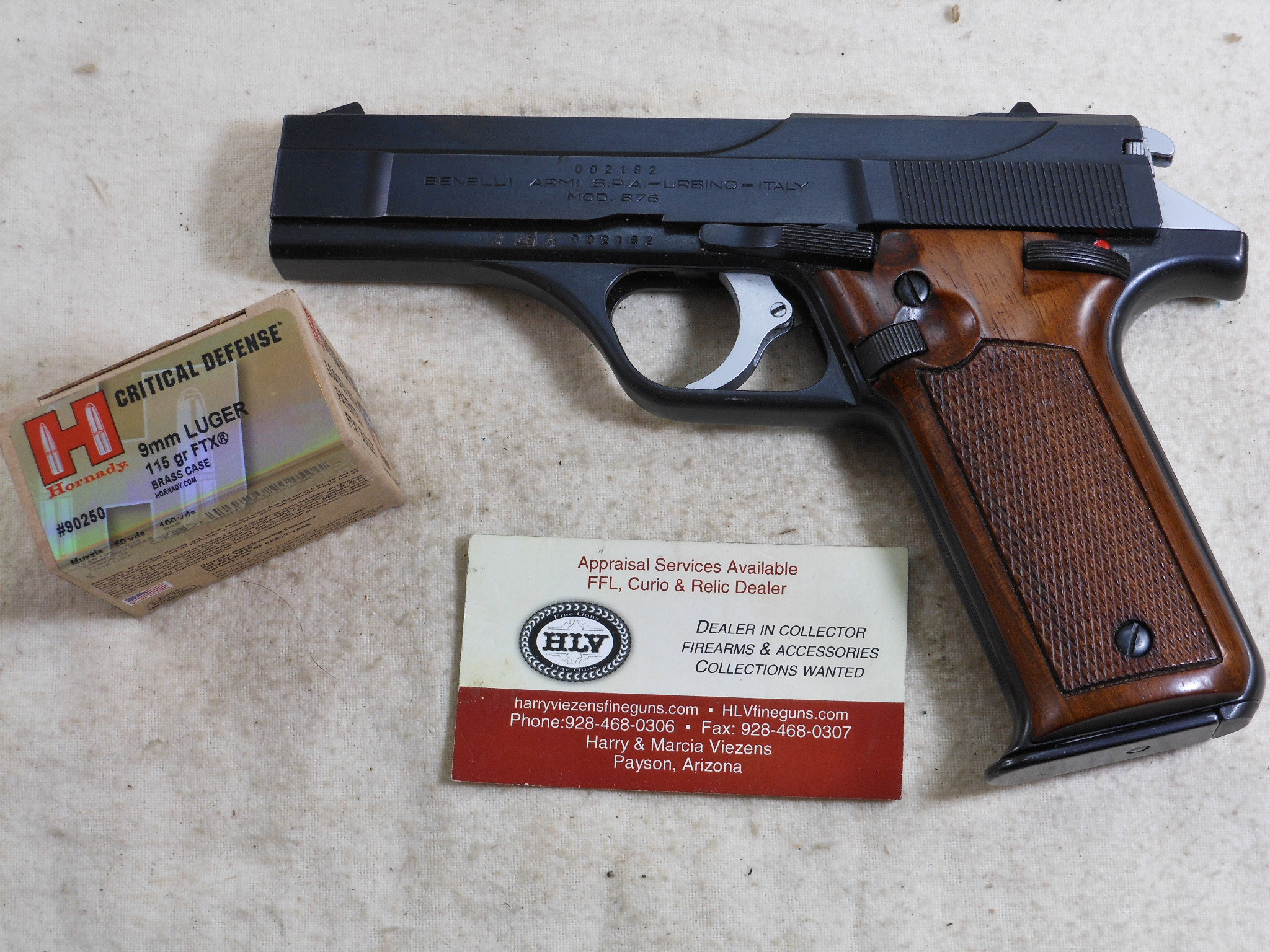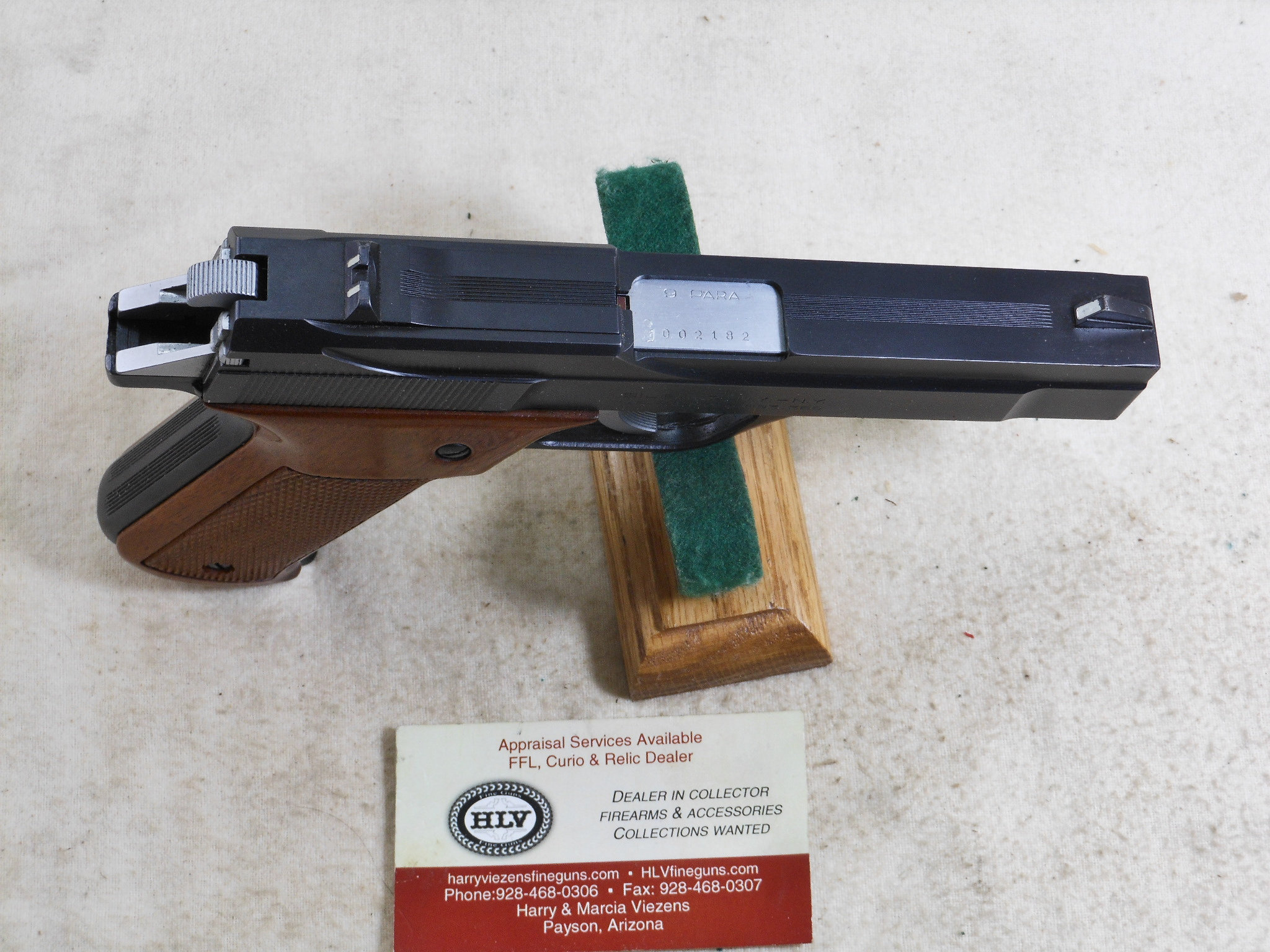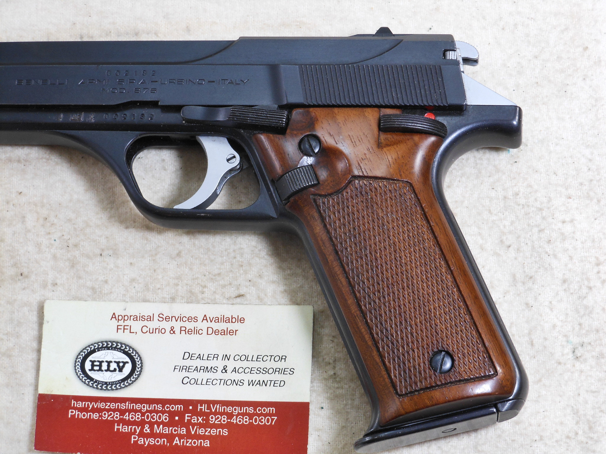 This Pistol’s serial number is 002182. It is chambered for the 9 M/M Luger round. The bore is in minty condition. This pistol is in like new condition. It is all matched serial numbers. The original bluing would rate a 100% condition. The wood grips are in new condition also. The magazine holds 8 rounds. There is no box or papers. The sights are original to this pistol. This pistol can be fired in single action mode as well as double action mode. This would be a great pistol for the Benelli collector! The box of shells is for display only and not for sale.