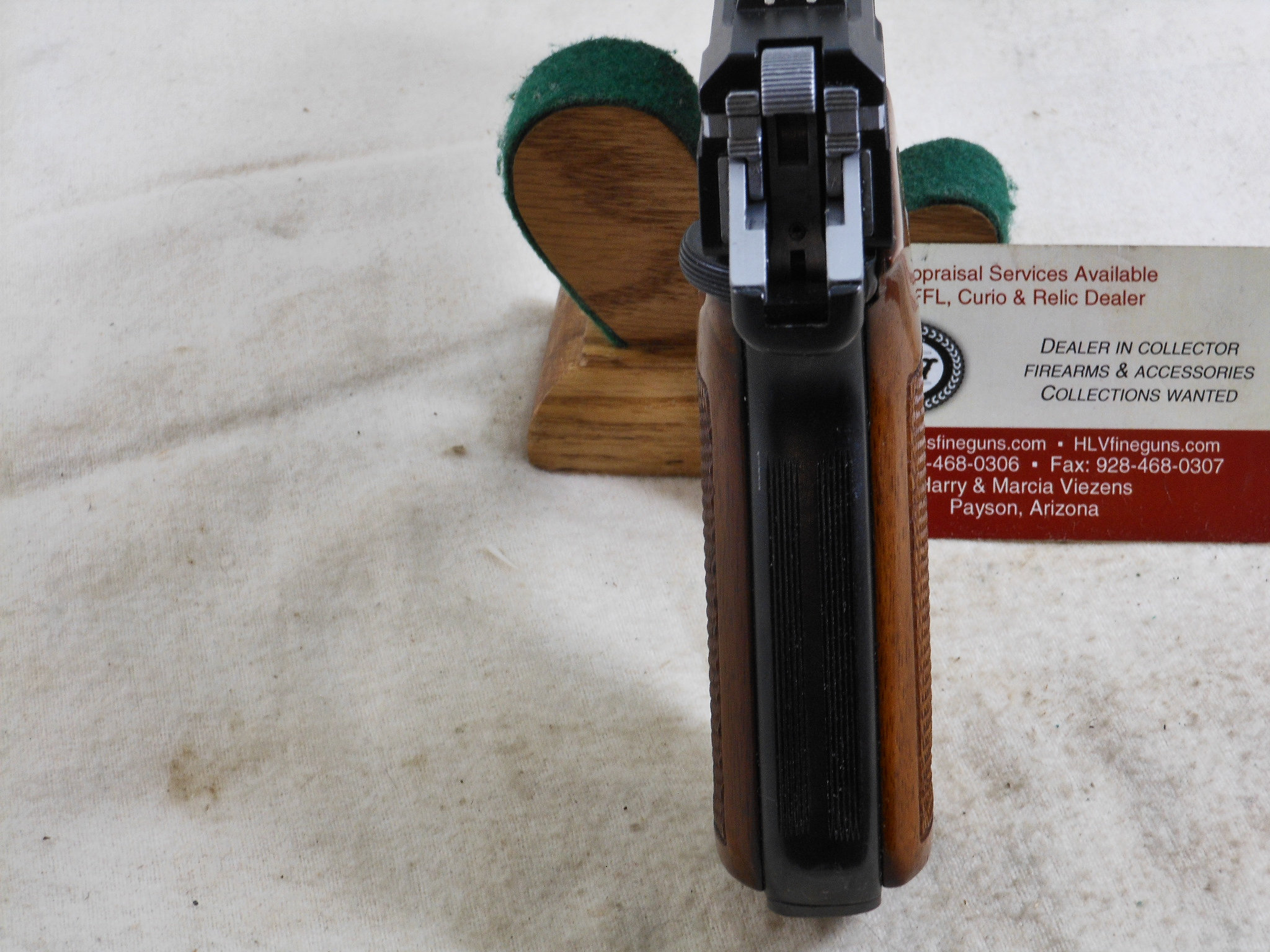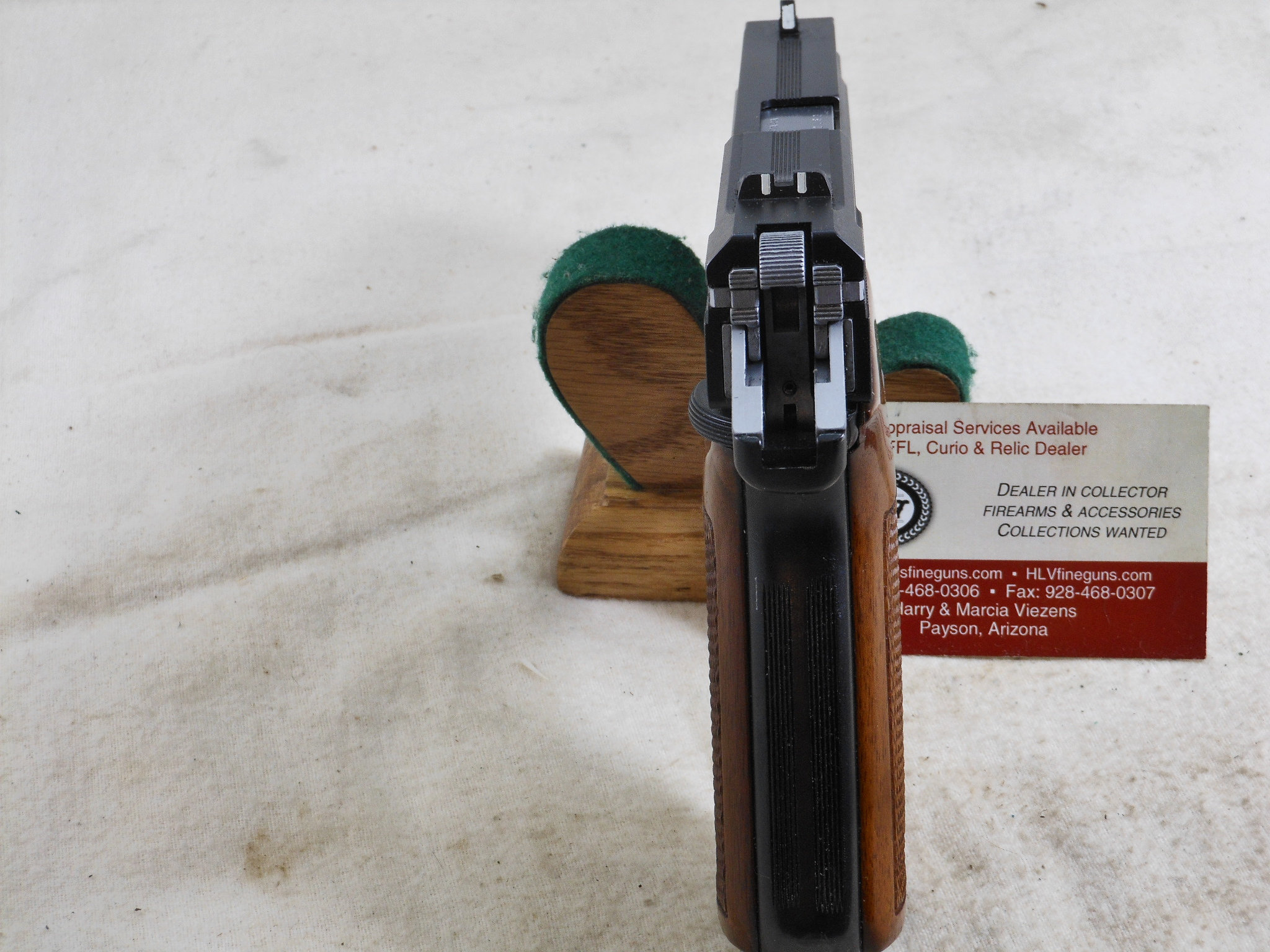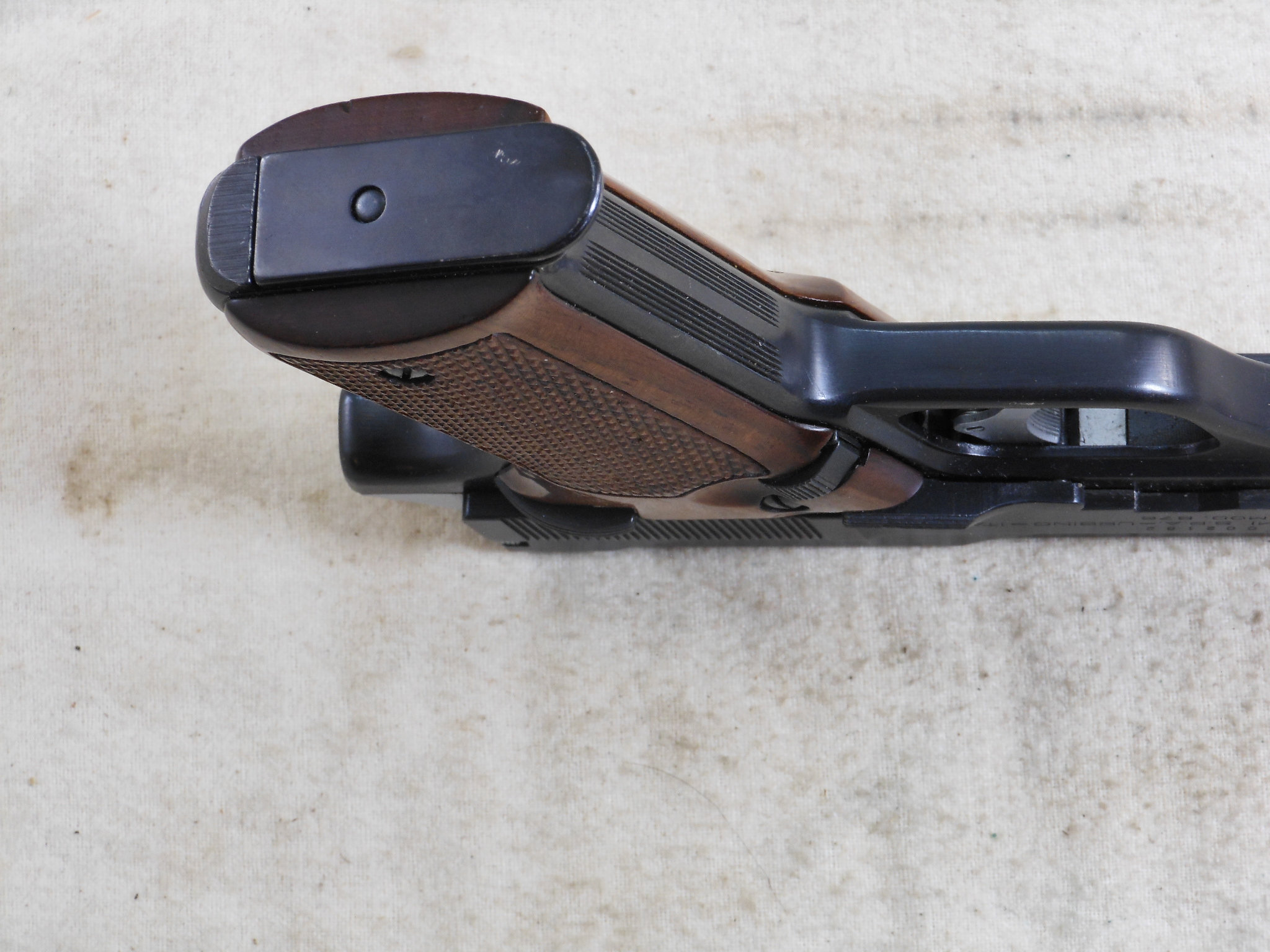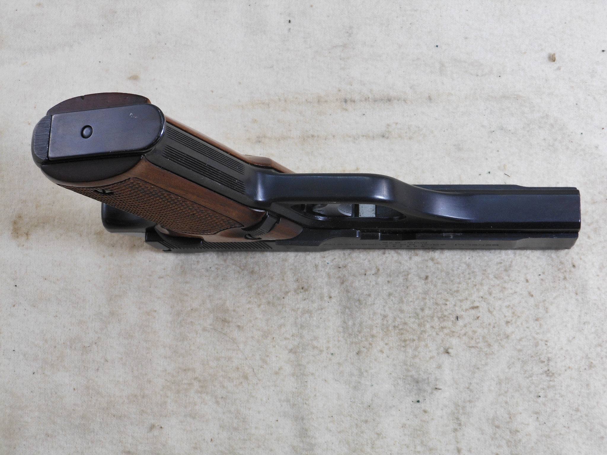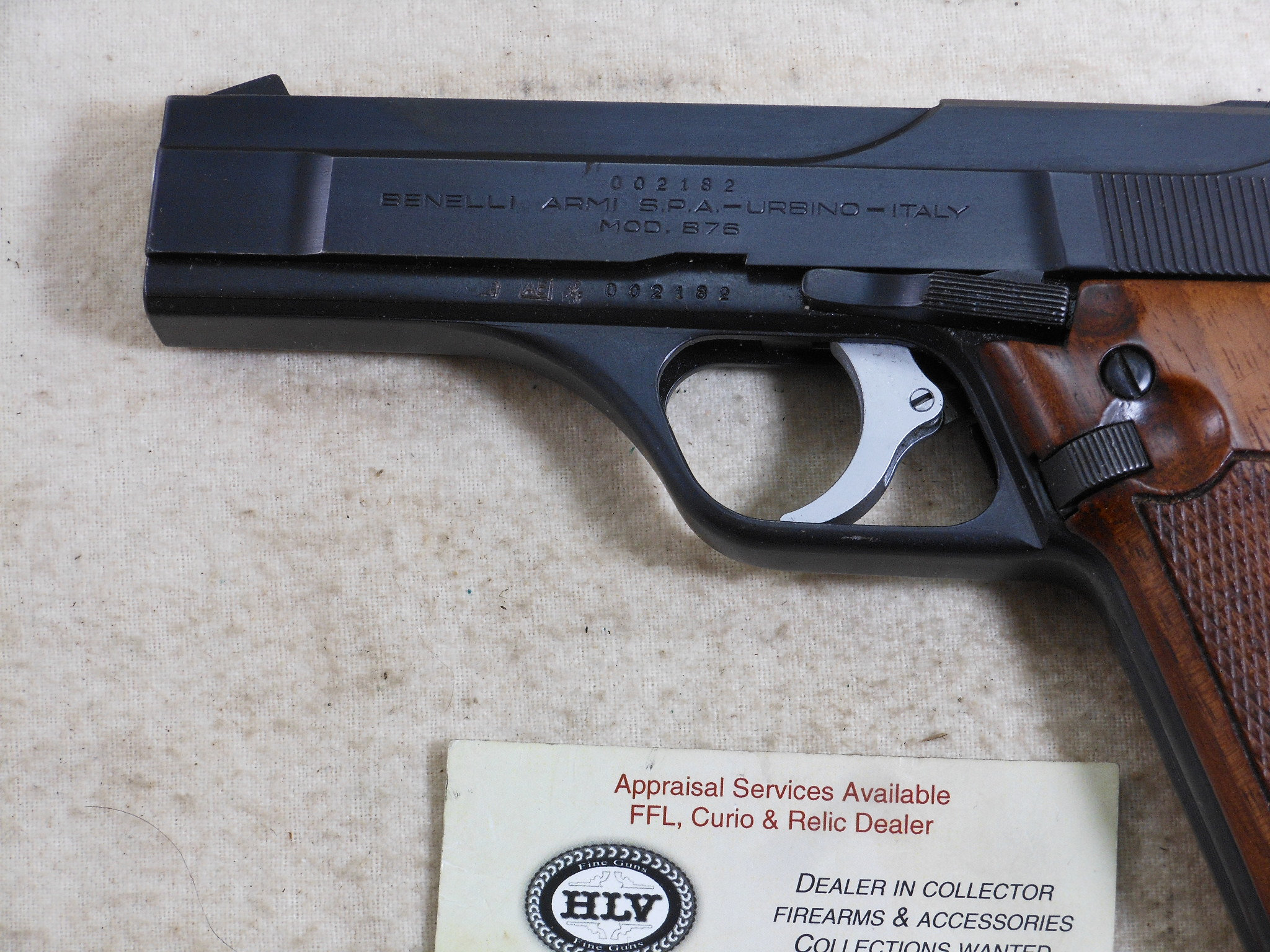 This Pistol’s serial number is 002182. It is chambered for the 9 M/M Luger round. The bore is in minty condition. This pistol is in like new condition. It is all matched serial numbers. The original bluing would rate a 100% condition. The wood grips are in new condition also. The magazine holds 8 rounds. There is no box or papers. The sights are original to this pistol. This pistol can be fired in single action mode as well as double action mode. This would be a great pistol for the Benelli collector! The box of shells is for display only and not for sale.
