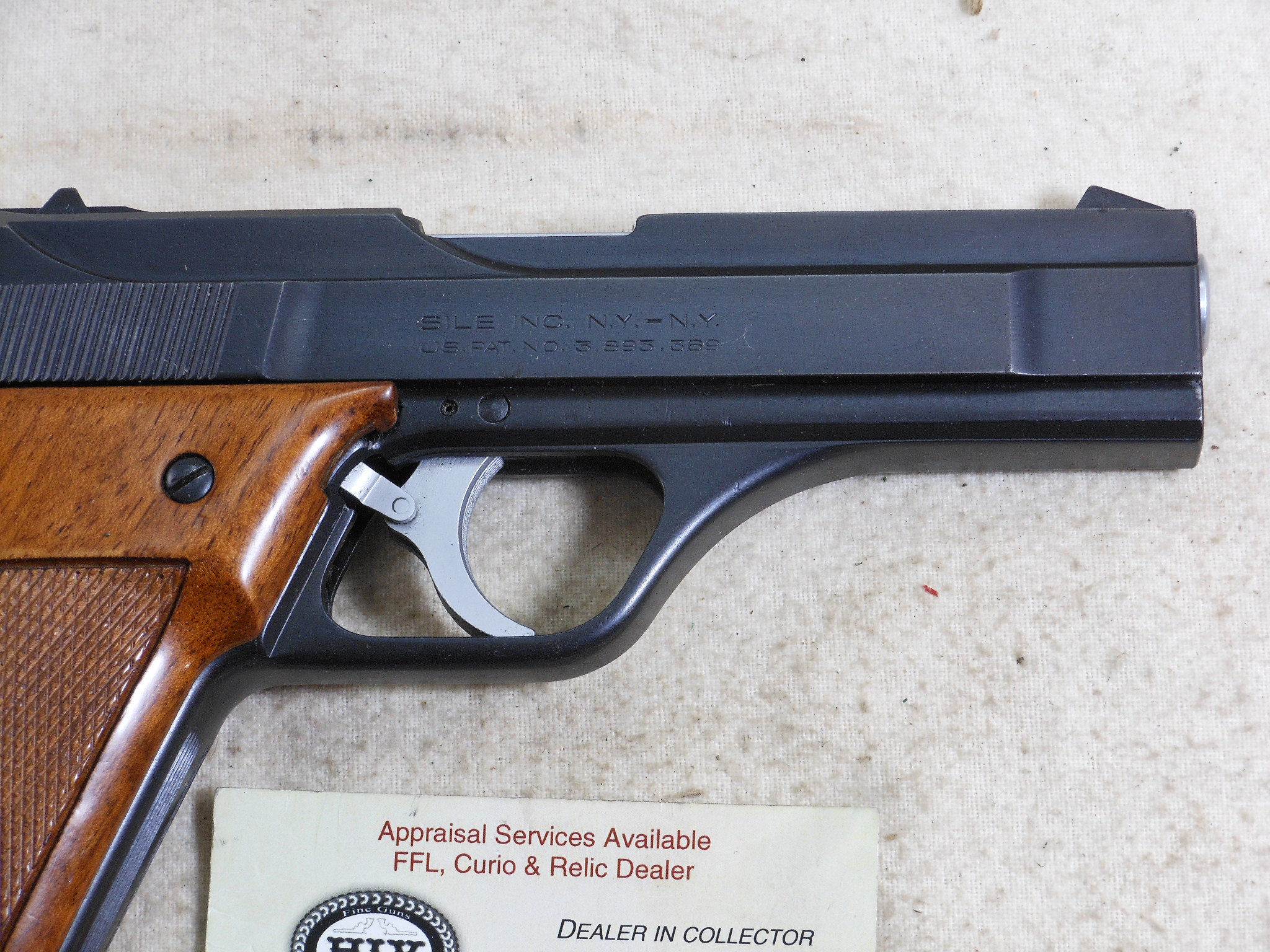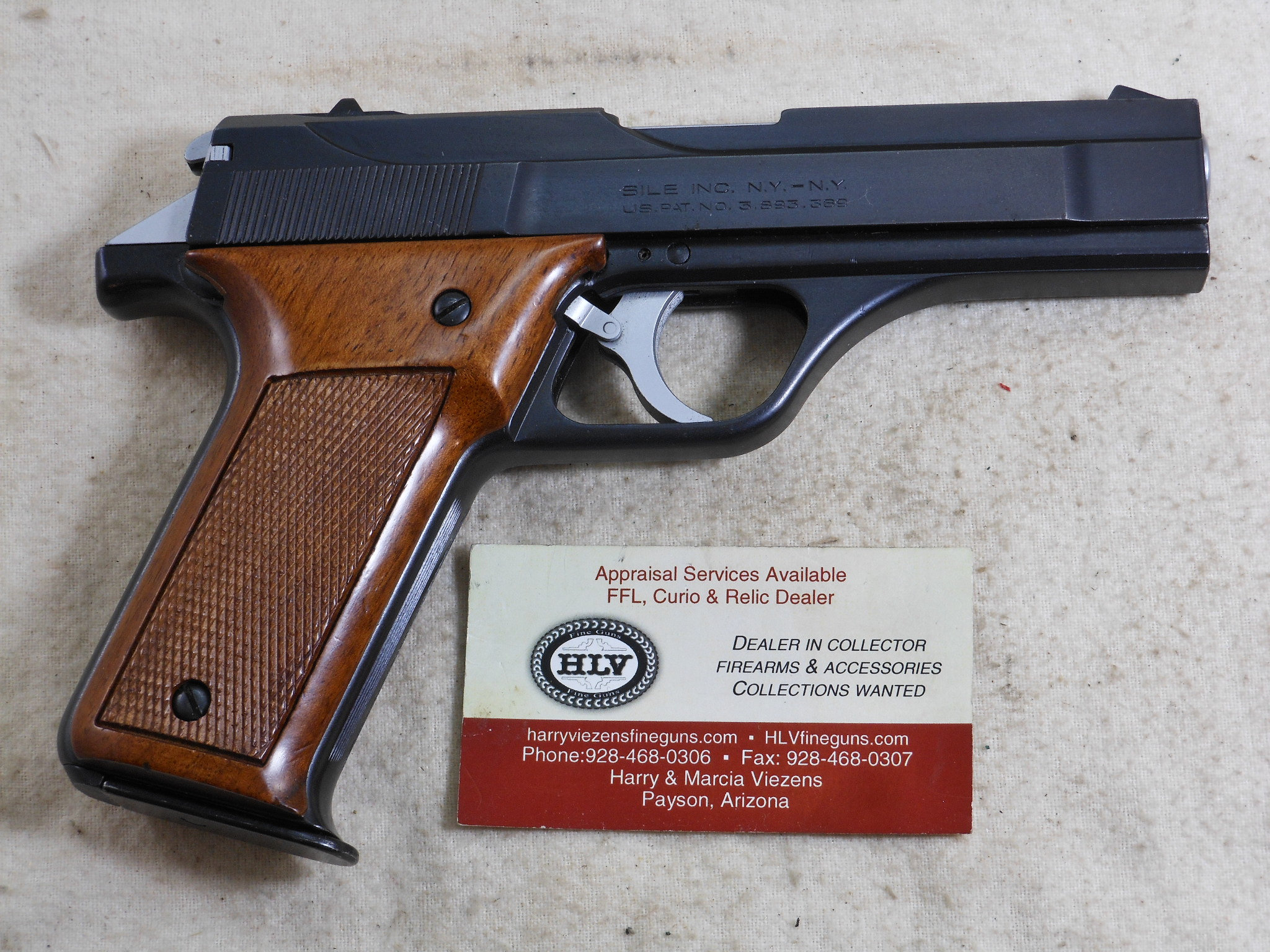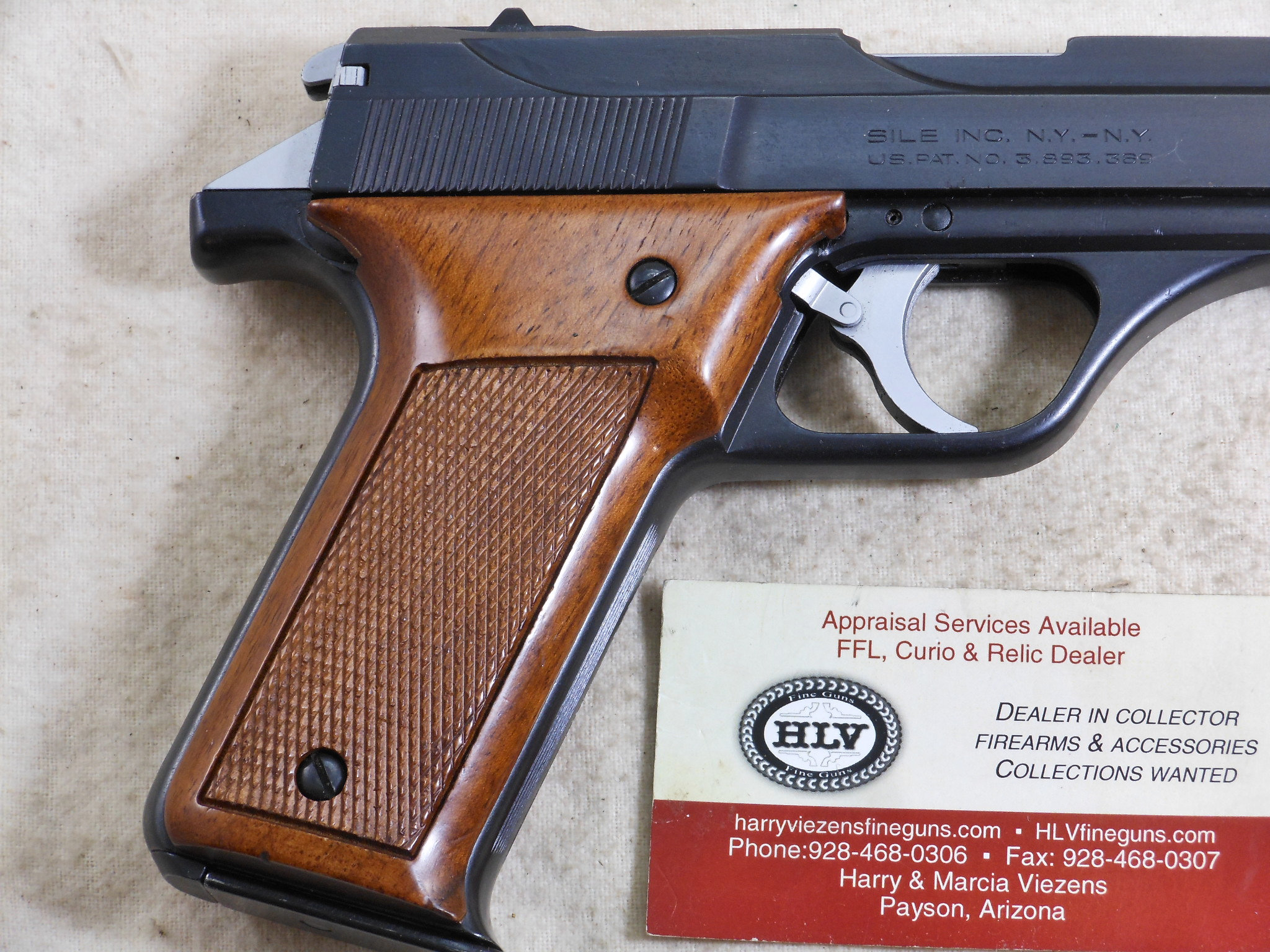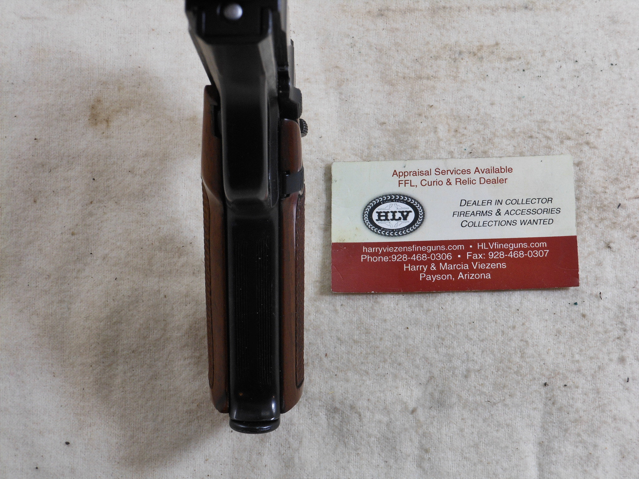 This Pistol’s serial number is 002182. It is chambered for the 9 M/M Luger round. The bore is in minty condition. This pistol is in like new condition. It is all matched serial numbers. The original bluing would rate a 100% condition. The wood grips are in new condition also. The magazine holds 8 rounds. There is no box or papers. The sights are original to this pistol. This pistol can be fired in single action mode as well as double action mode. This would be a great pistol for the Benelli collector! The box of shells is for display only and not for sale.