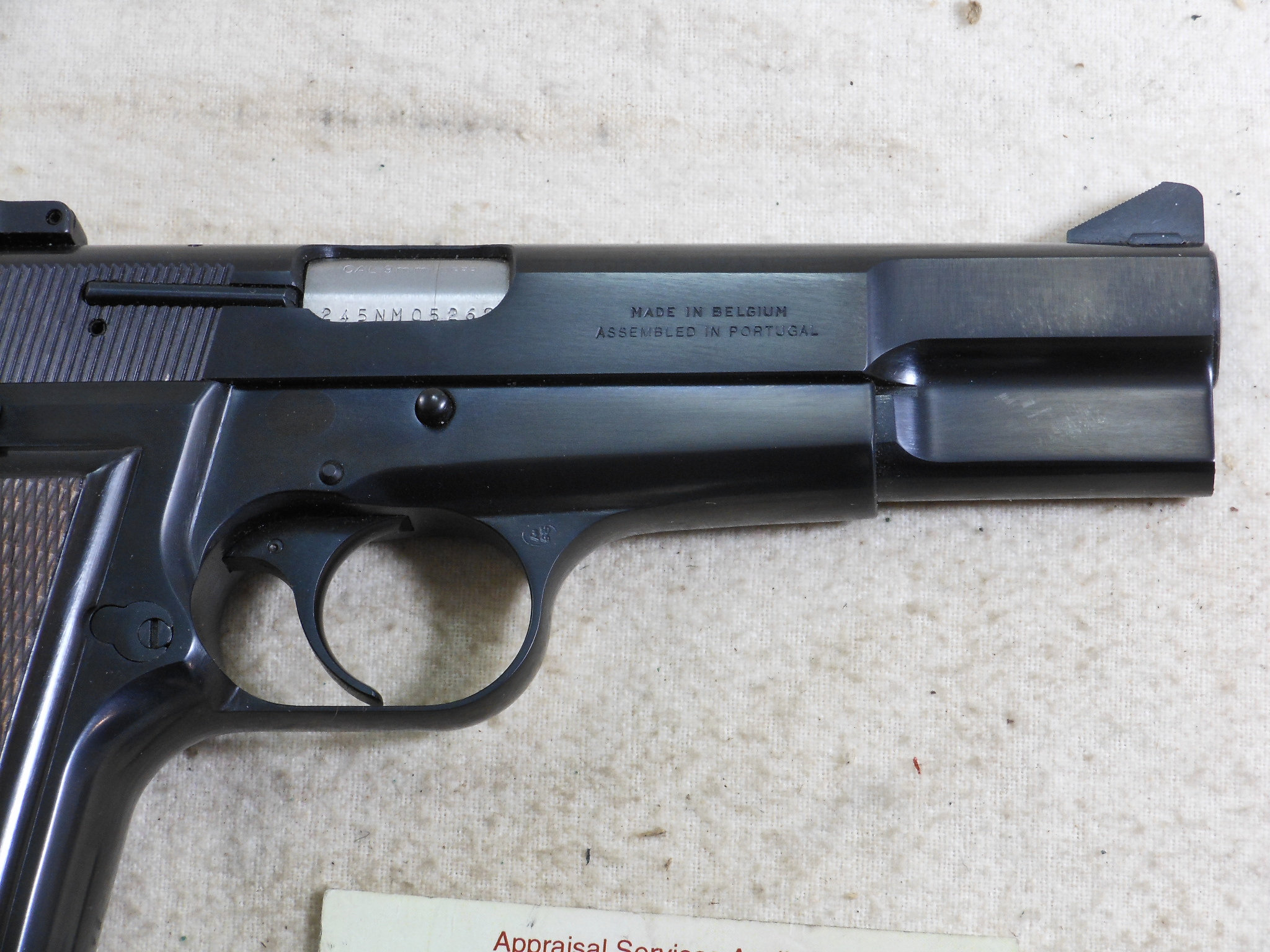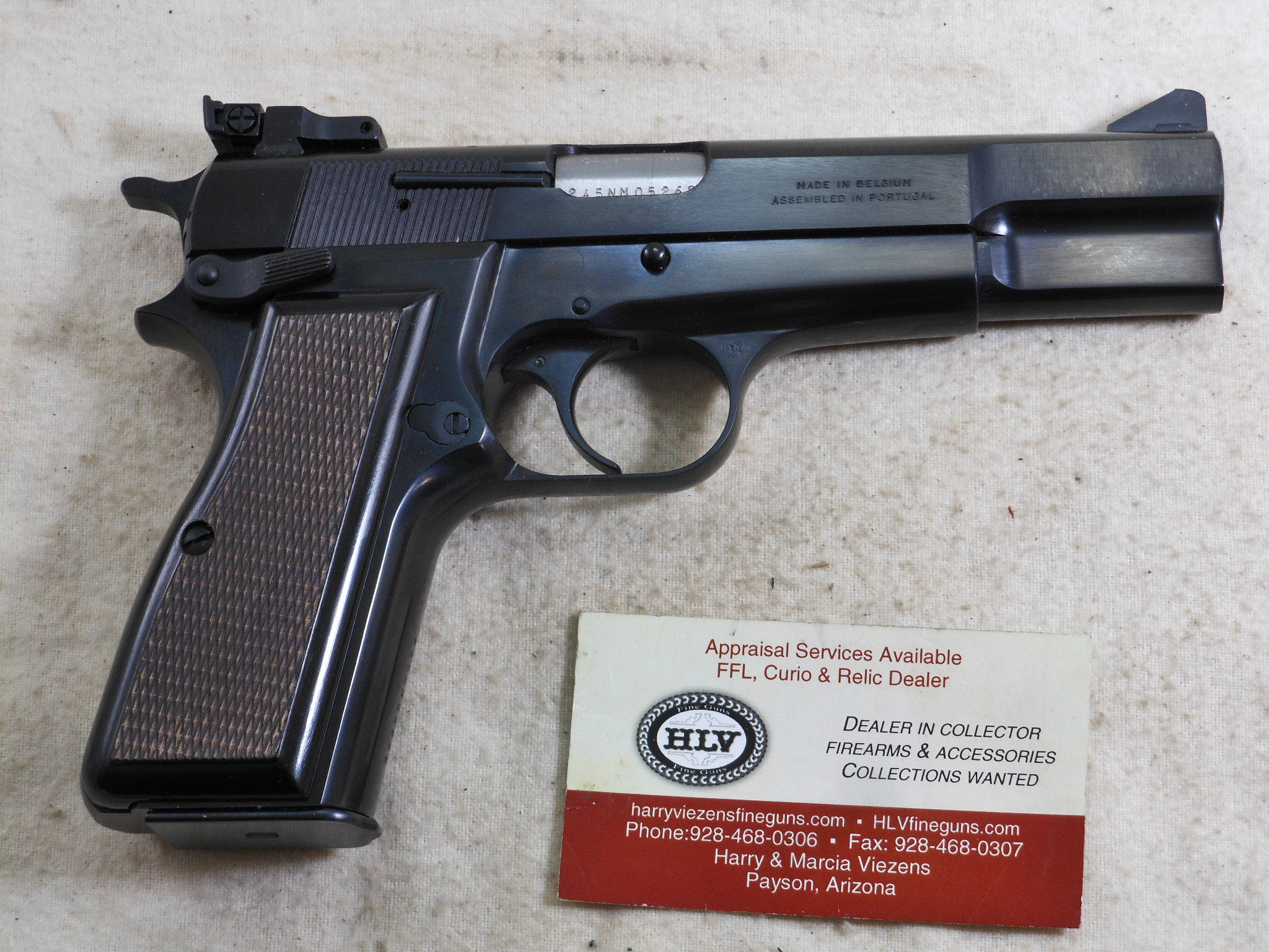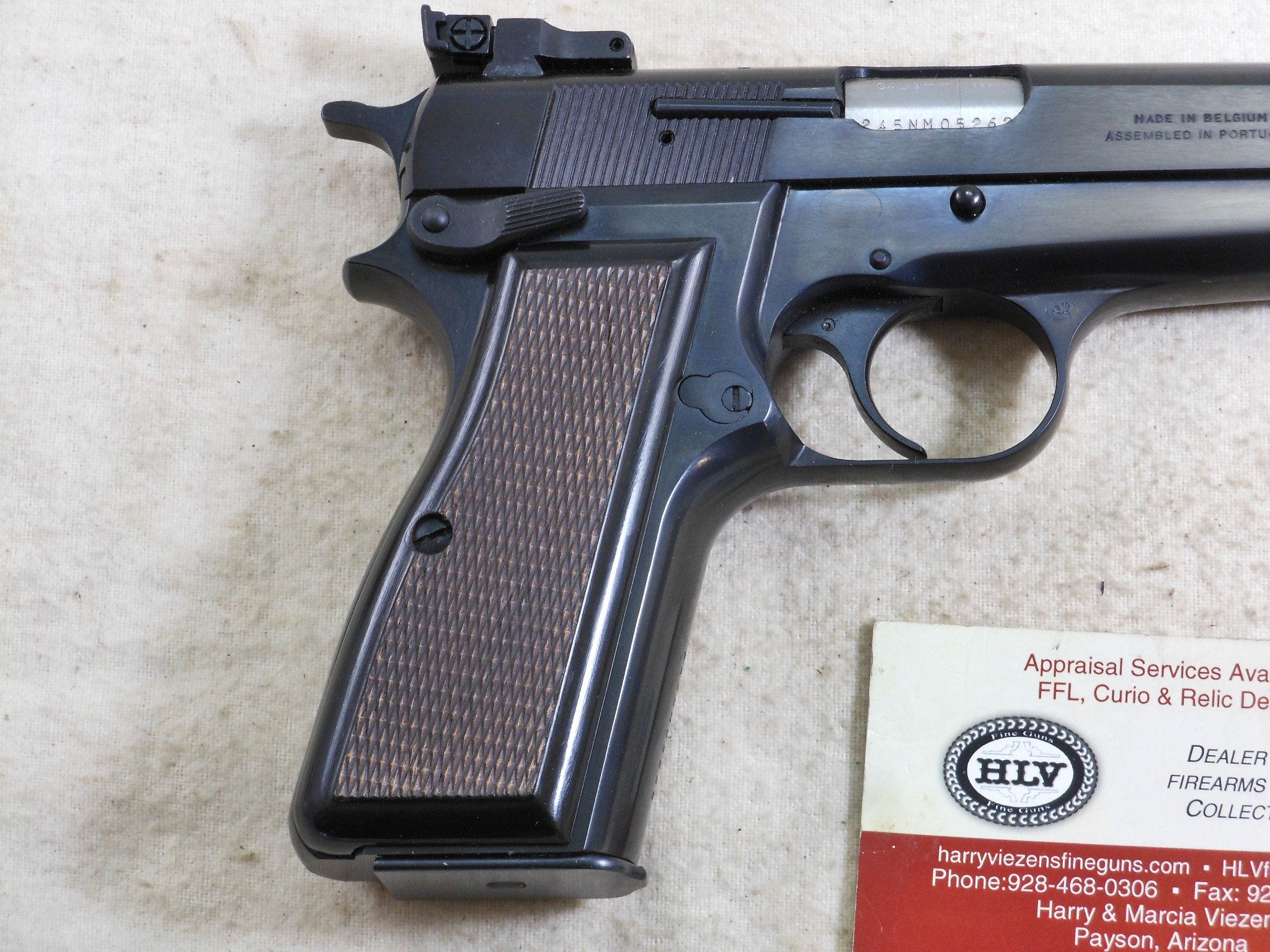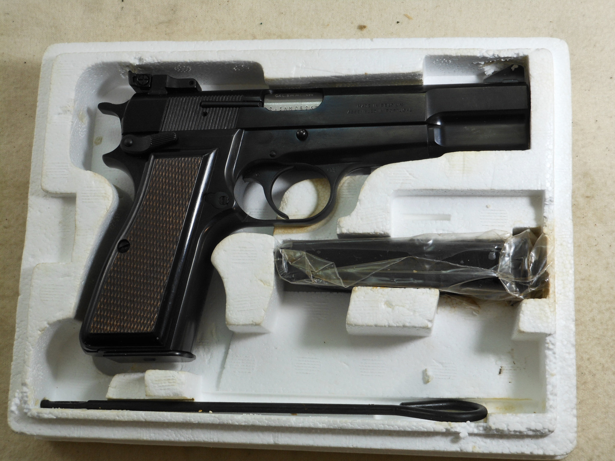 This Browning High Power Pistol was produced in 1990. This pistol’s serial number is 245NM05262. This Browning is in new unfired condition. The bore is in minty condition. There is no handling or working the slide wear. This pistol is fitted with target sights. The rear sight is fully adjustable. The front sight has the high post. The pistol is fitted with ambidextrous safety. The accessories that come with this pistol is a spare magazine, cleaning rod, instruction book and advertising booklet. The foam box compartment is in fine condition. The outer jacket is in fair condition. The end label is intact. This is a highly collectable Browning Pistol that is still new in it’s original box. Not many of these pistols were fitted with target sights. Here is one of these fine pistols!