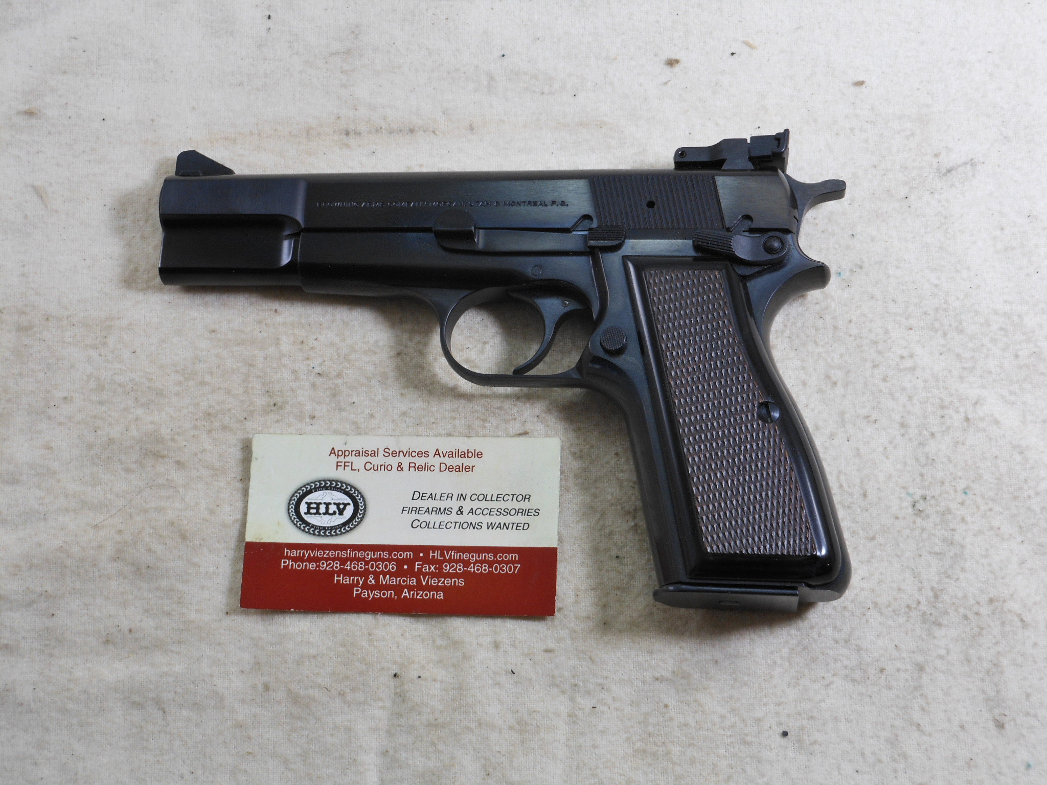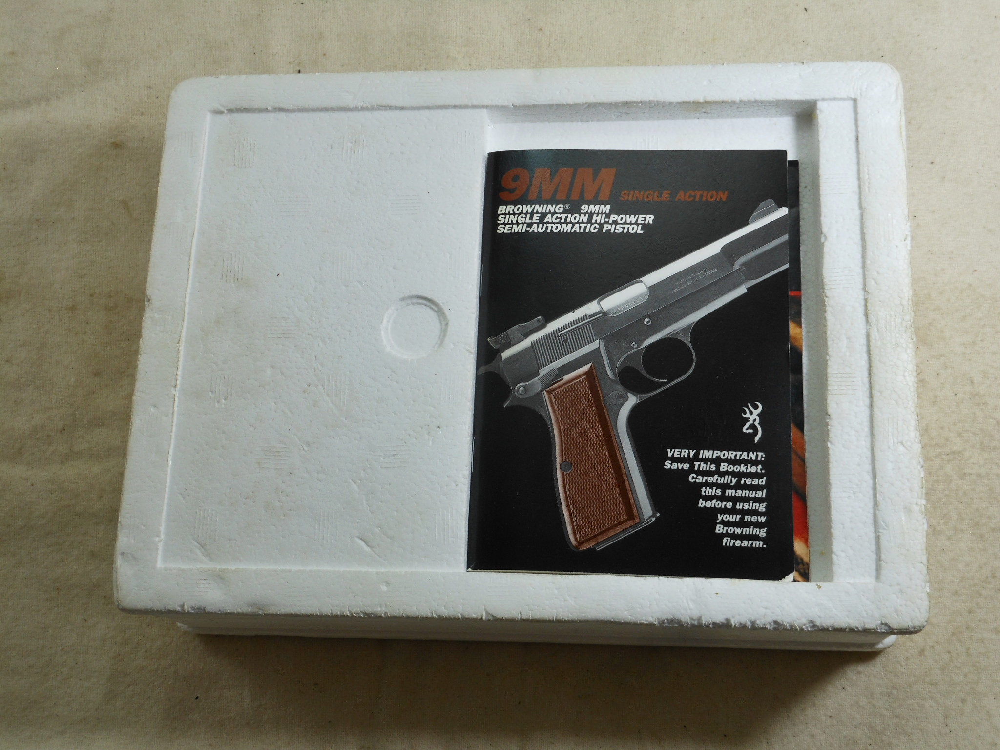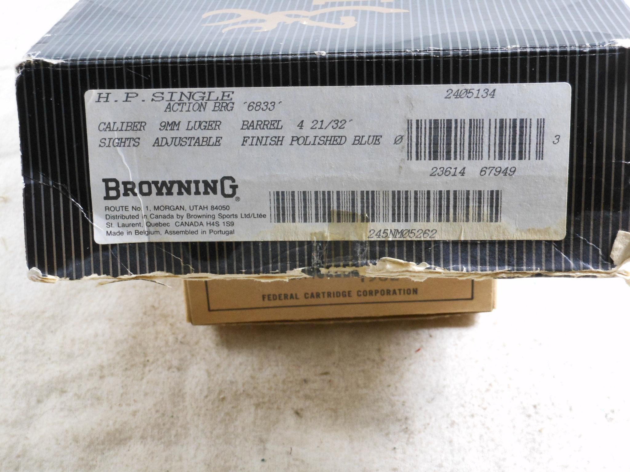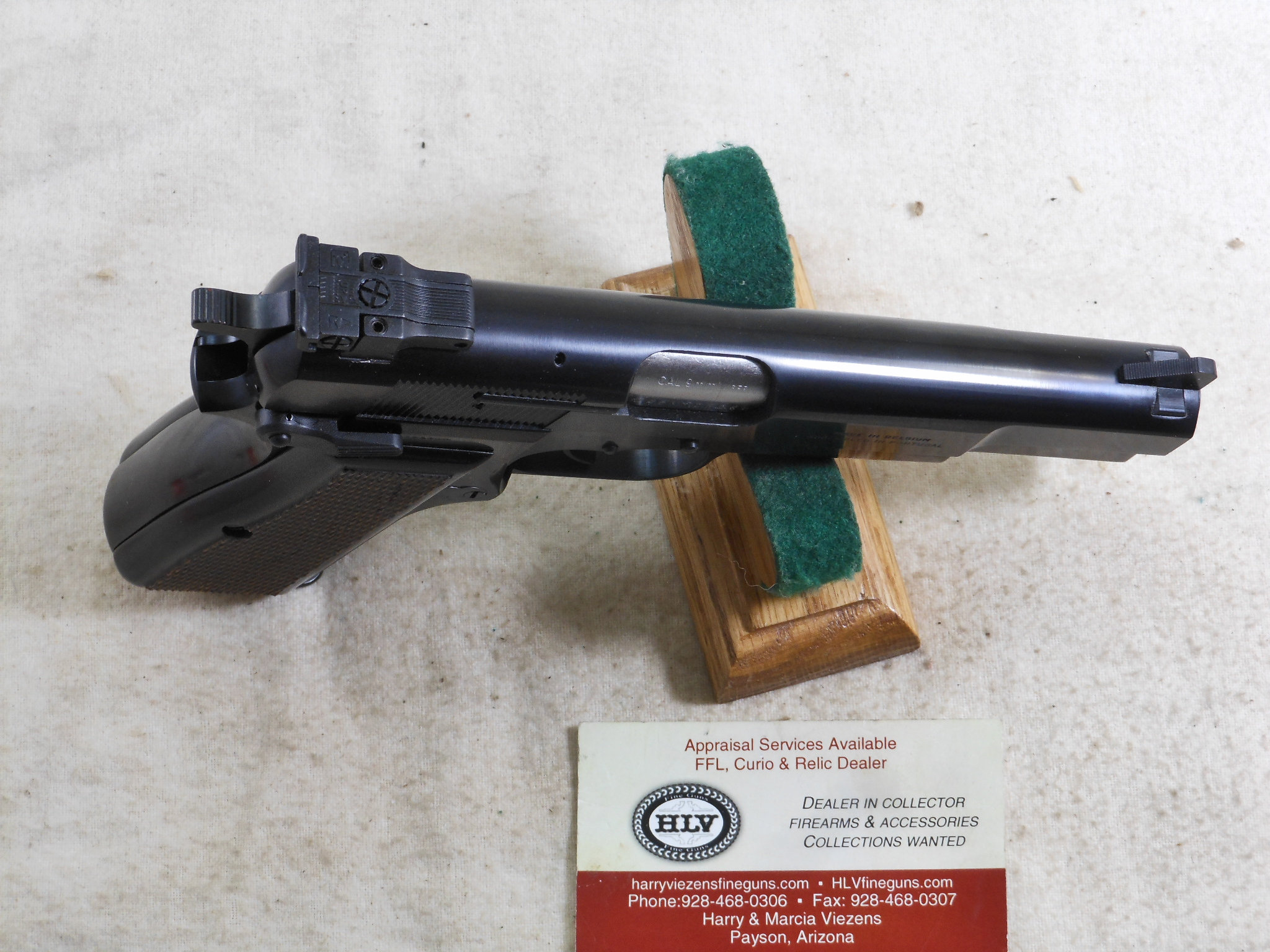 This Browning High Power Pistol was produced in 1990. This pistol’s serial number is 245NM05262. This Browning is in new unfired condition. The bore is in minty condition. There is no handling or working the slide wear. This pistol is fitted with target sights. The rear sight is fully adjustable. The front sight has the high post. The pistol is fitted with ambidextrous safety. The accessories that come with this pistol is a spare magazine, cleaning rod, instruction book and advertising booklet. The foam box compartment is in fine condition. The outer jacket is in fair condition. The end label is intact. This is a highly collectable Browning Pistol that is still new in it’s original box. Not many of these pistols were fitted with target sights. Here is one of these fine pistols!