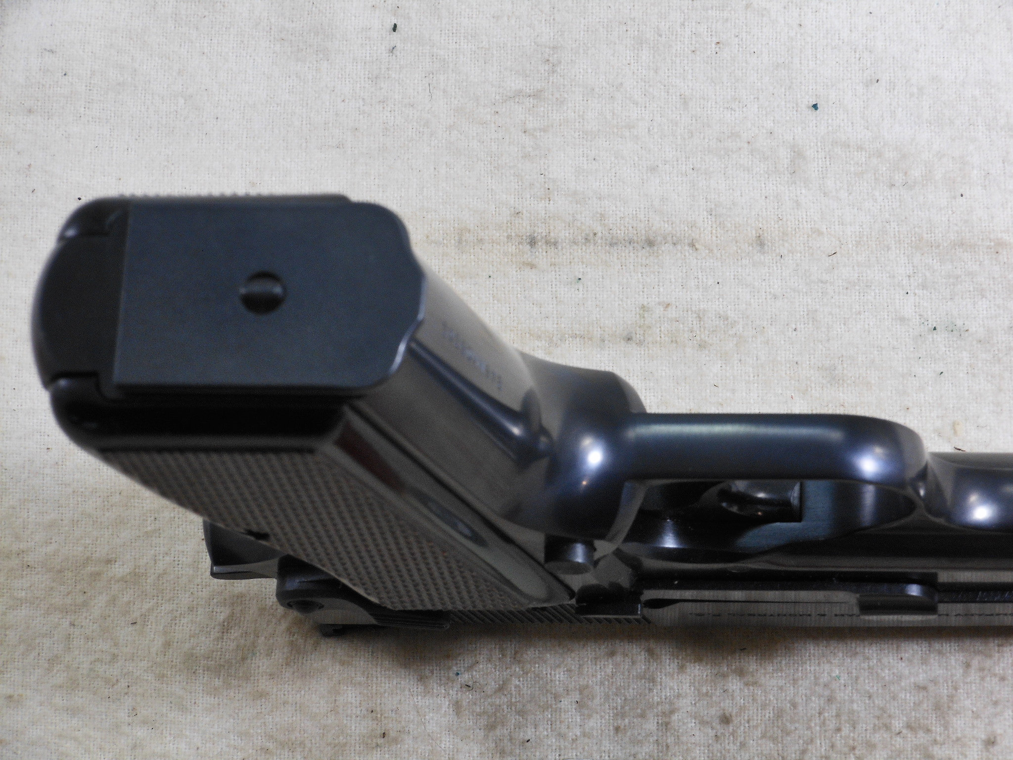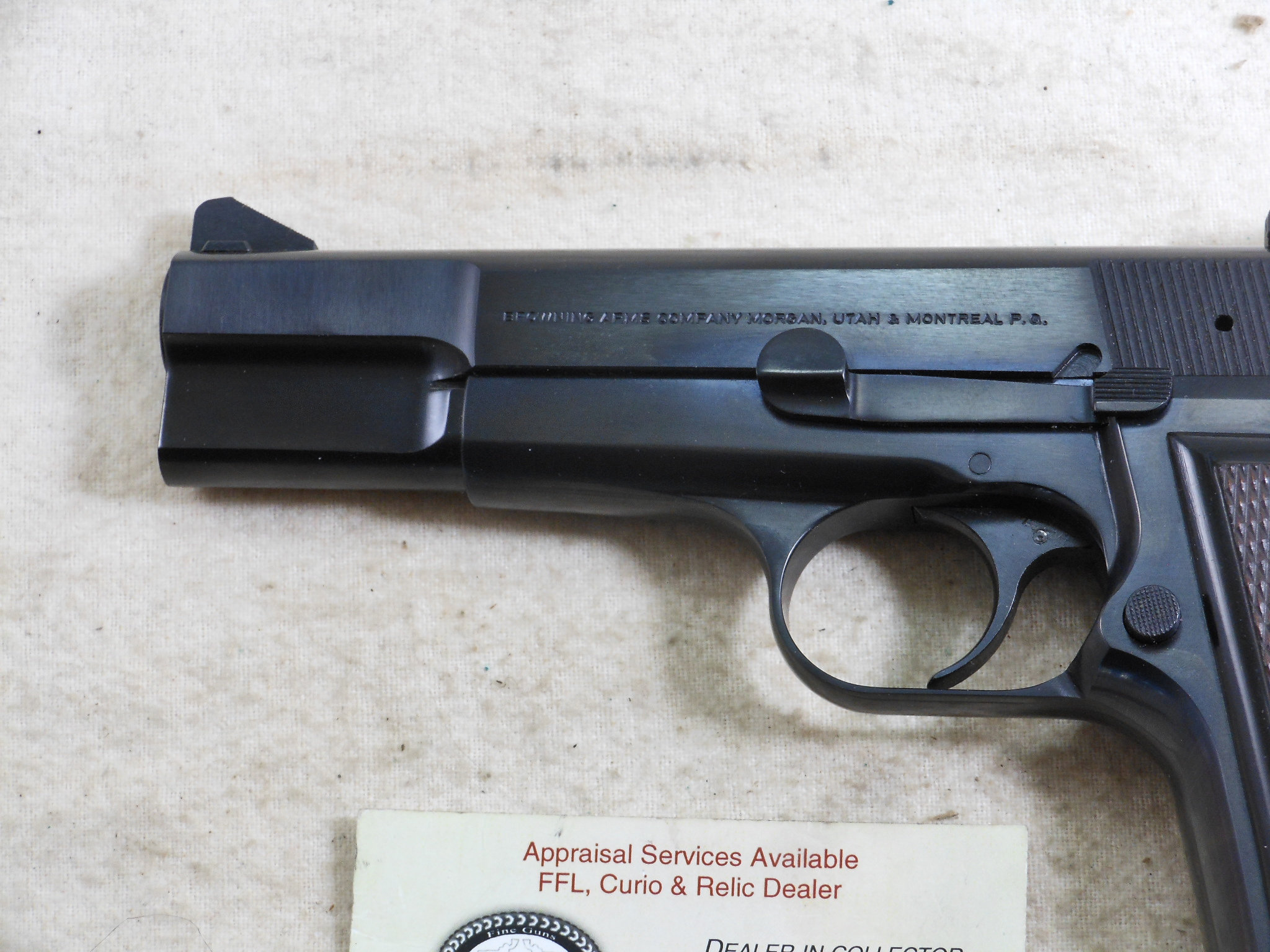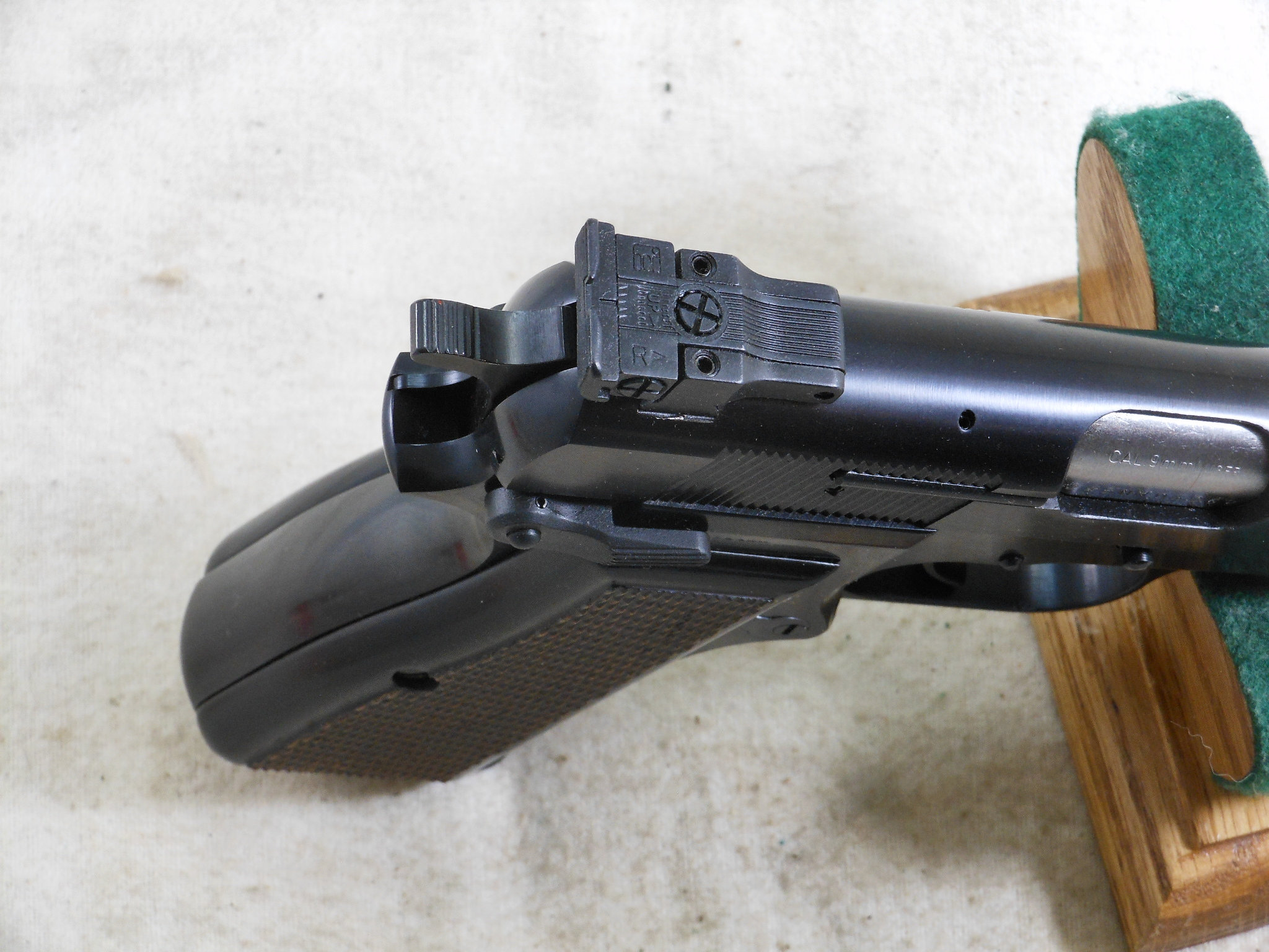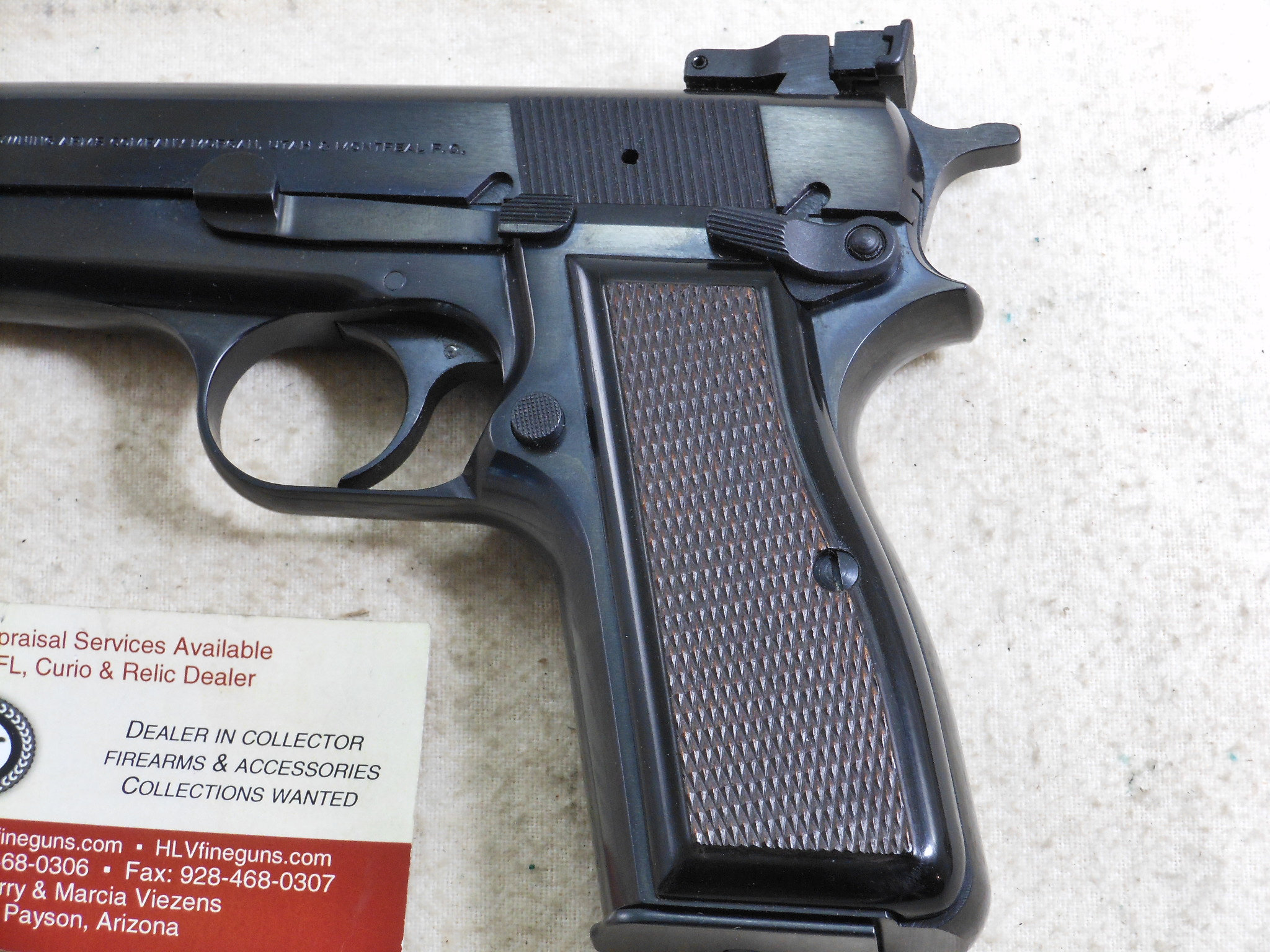 This Browning High Power Pistol was produced in 1990. This pistol’s serial number is 245NM05262. This Browning is in new unfired condition. The bore is in minty condition. There is no handling or working the slide wear. This pistol is fitted with target sights. The rear sight is fully adjustable. The front sight has the high post. The pistol is fitted with ambidextrous safety. The accessories that come with this pistol is a spare magazine, cleaning rod, instruction book and advertising booklet. The foam box compartment is in fine condition. The outer jacket is in fair condition. The end label is intact. This is a highly collectable Browning Pistol that is still new in it’s original box. Not many of these pistols were fitted with target sights. Here is one of these fine pistols!