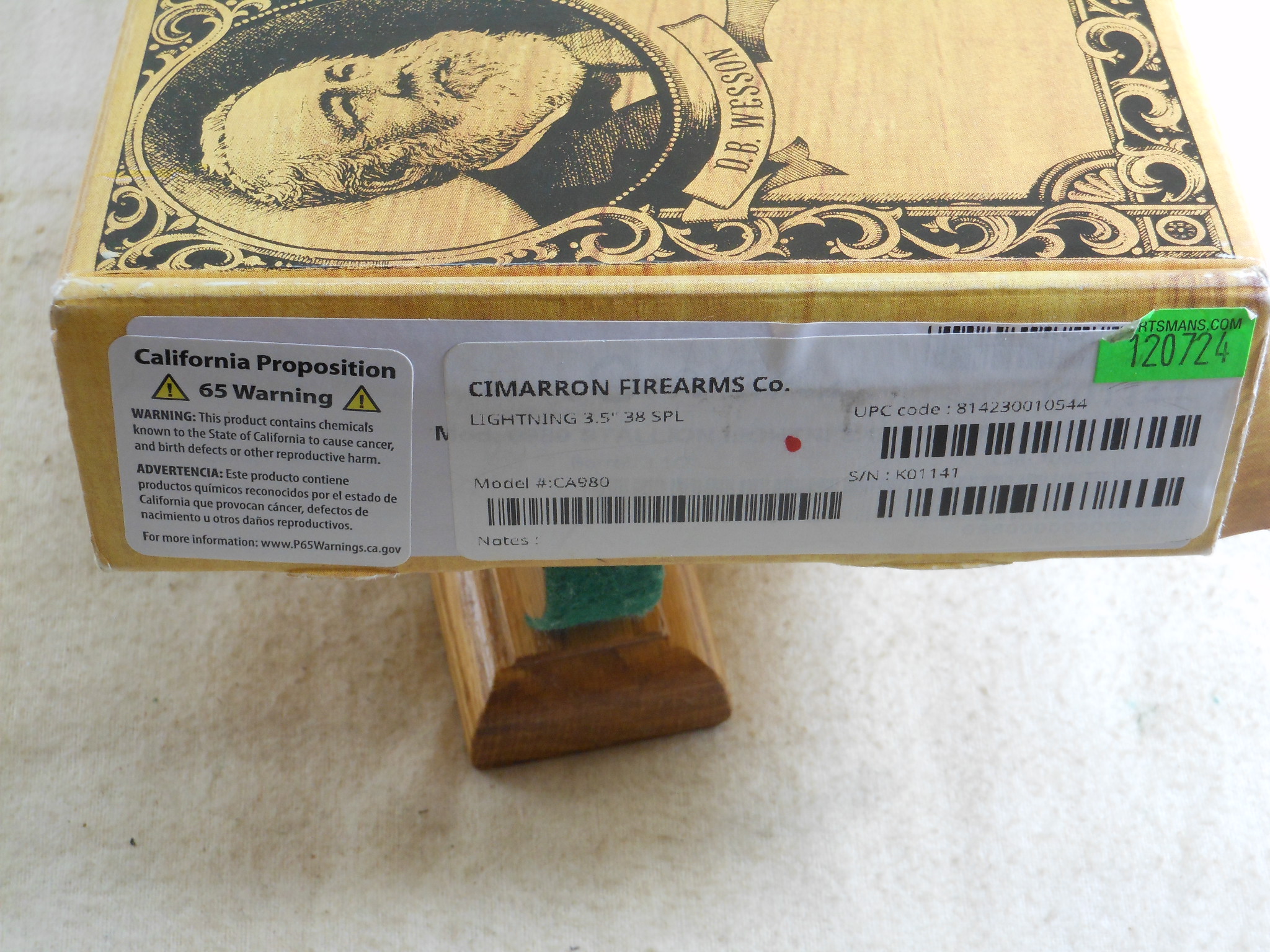 This pistol is in new condition with no sign of being played with. The pistol’s serial number is K01141. This Lightning pistol is chambered to shoot the 38 Special cartridge. The box is in very fine condition. It is serial numbered to this pistol.