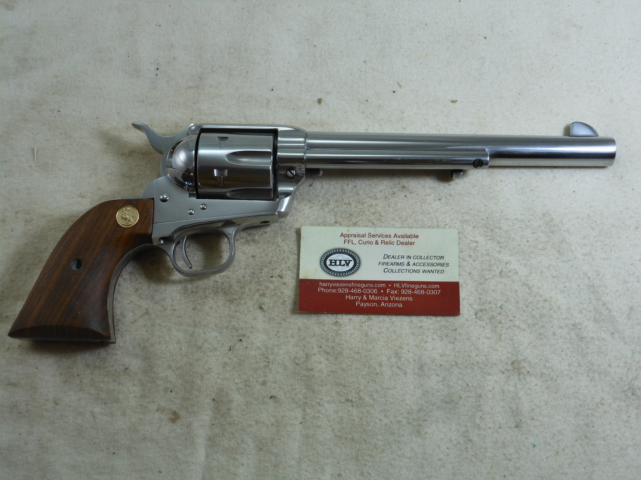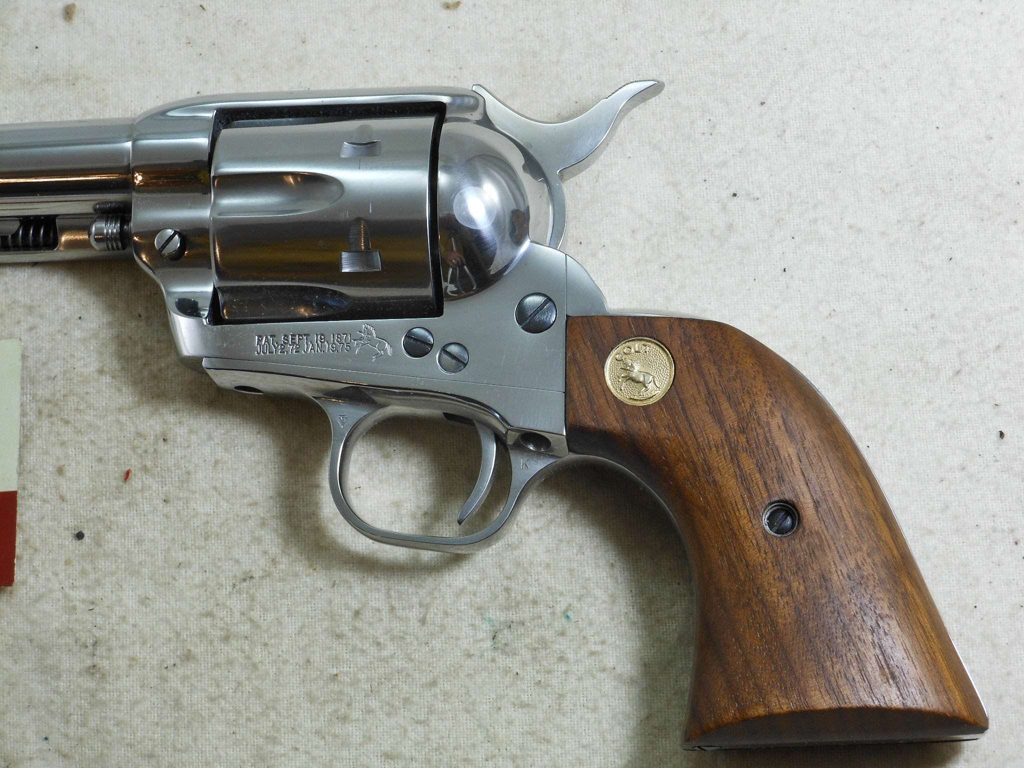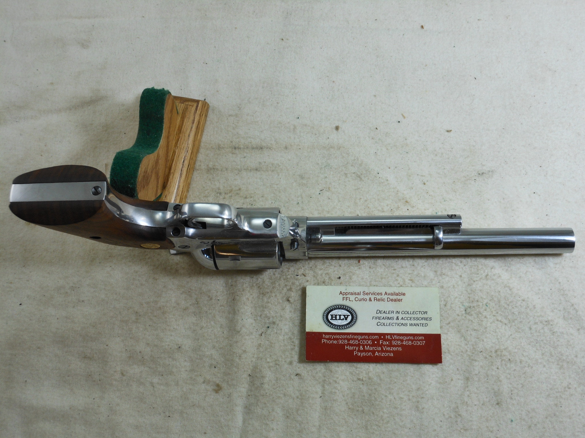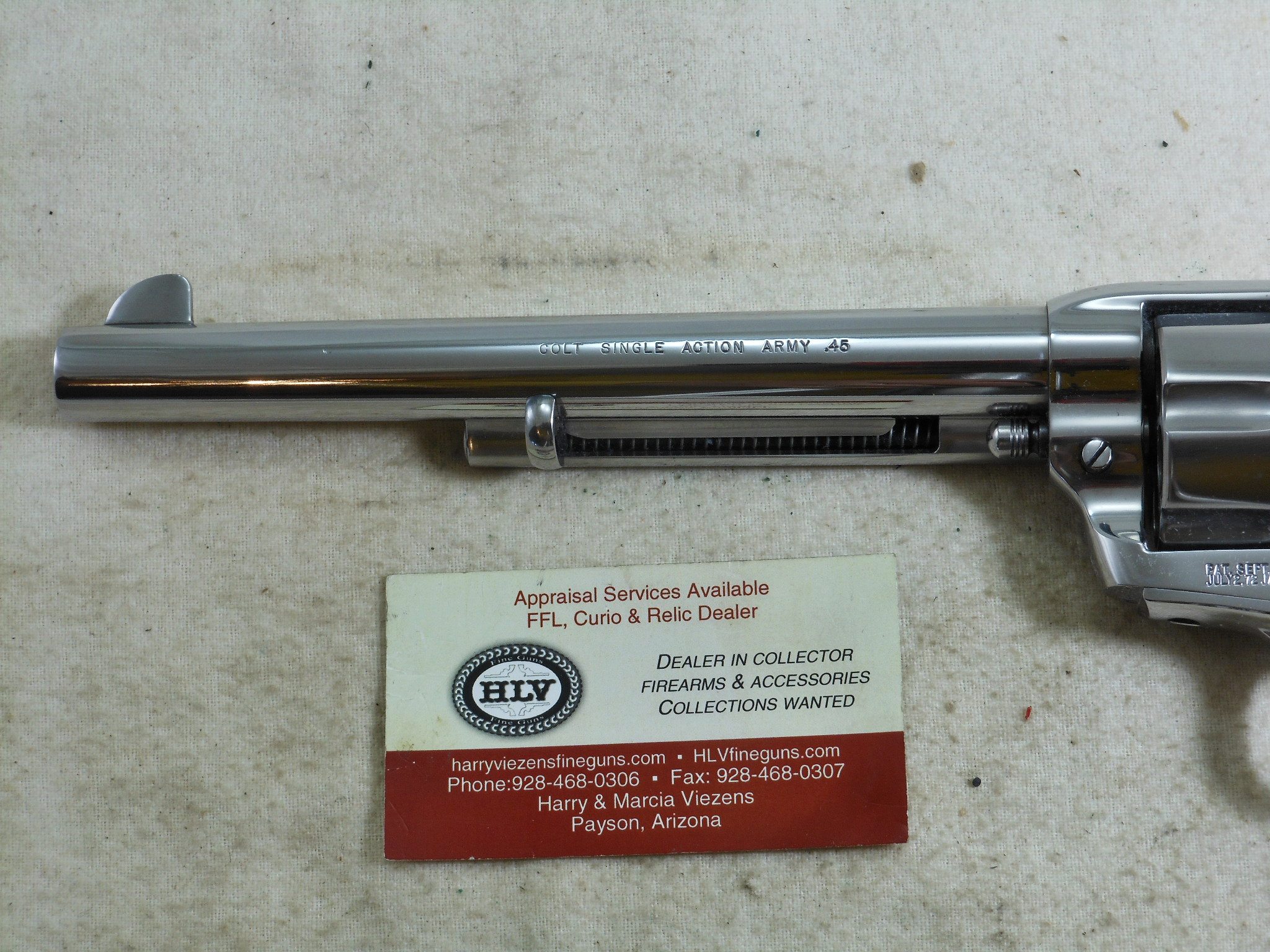 This Colt was produced in 1978. The pistol’s serial number is SA03557. This barrel is the 7 1/2 inch nickel plated barrel chambered to shoot the 45 Colt cartridge. This pistol appears to be in unfired condition. The plating is in new condition with no blemishes. The bore and chambers are bright with no real sign of wear. The wood grips are in new condition with no issues. This is a really stunning pistol with the high polished nickel finish! The 7 1/2 inch barrel in the third generation of the single action army is not very common! Being Nickel Plated adds to the desirability of this fine Colt! The only way you can upgrade this pistol is to have the box!