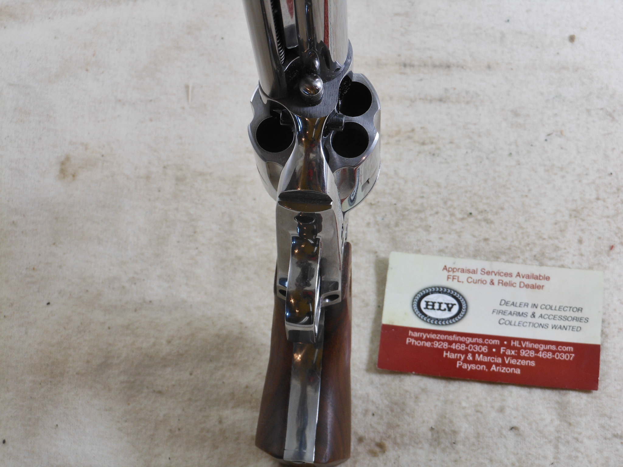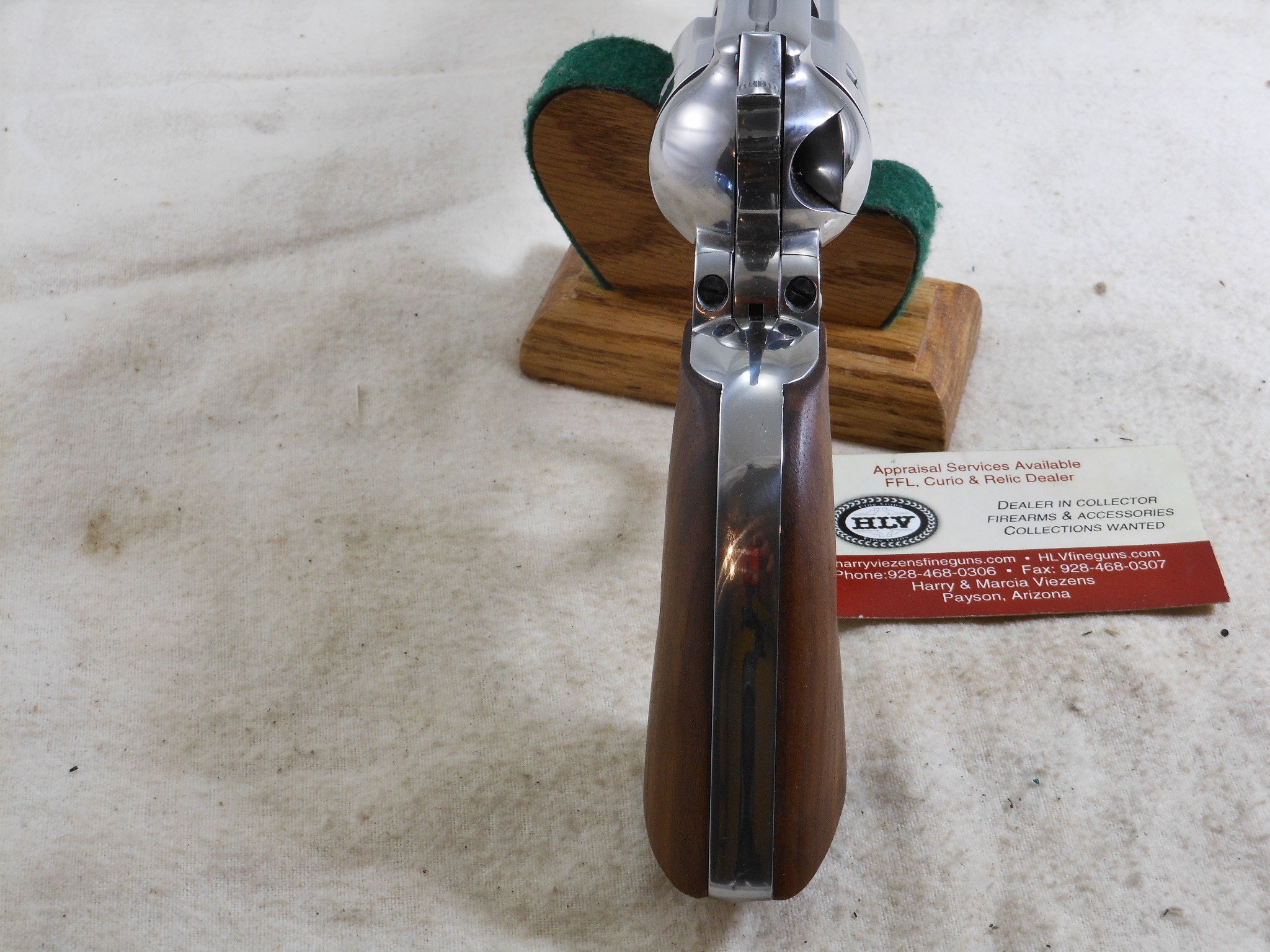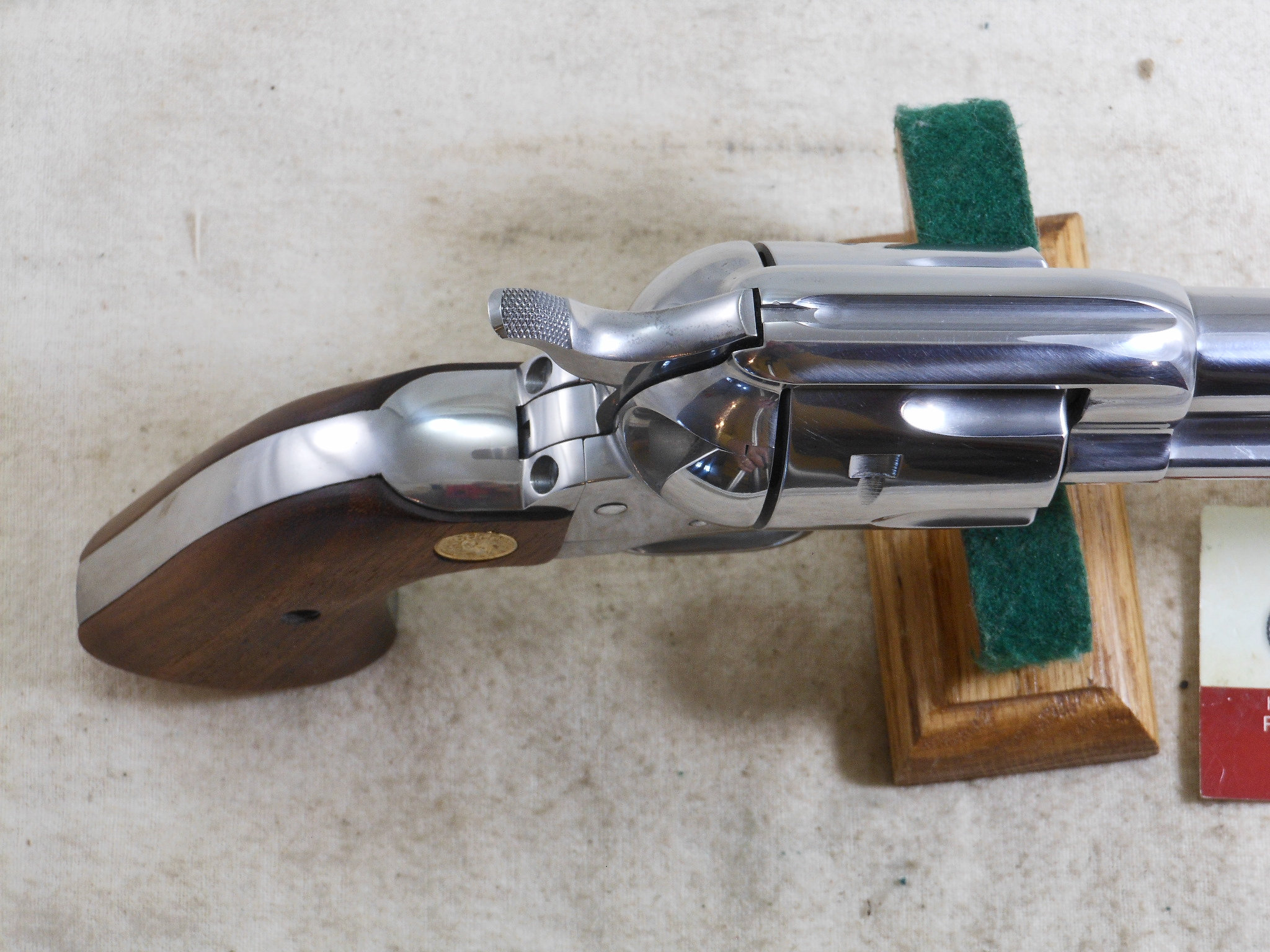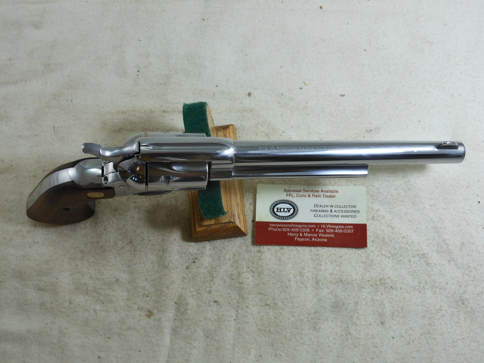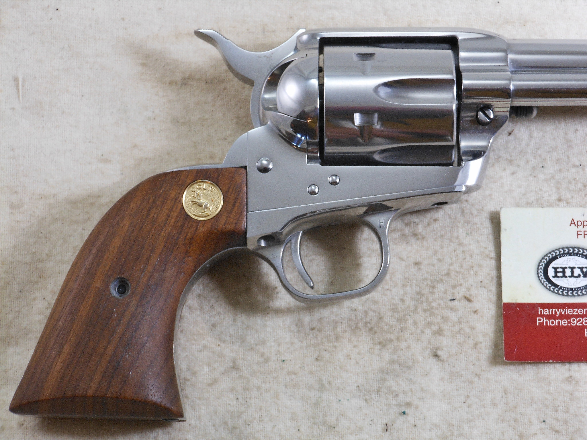 This Colt was produced in 1978. The pistol’s serial number is SA03557. This barrel is the 7 1/2 inch nickel plated barrel chambered to shoot the 45 Colt cartridge. This pistol appears to be in unfired condition. The plating is in new condition with no blemishes. The bore and chambers are bright with no real sign of wear. The wood grips are in new condition with no issues. This is a really stunning pistol with the high polished nickel finish! The 7 1/2 inch barrel in the third generation of the single action army is not very common! Being Nickel Plated adds to the desirability of this fine Colt! The only way you can upgrade this pistol is to have the box!