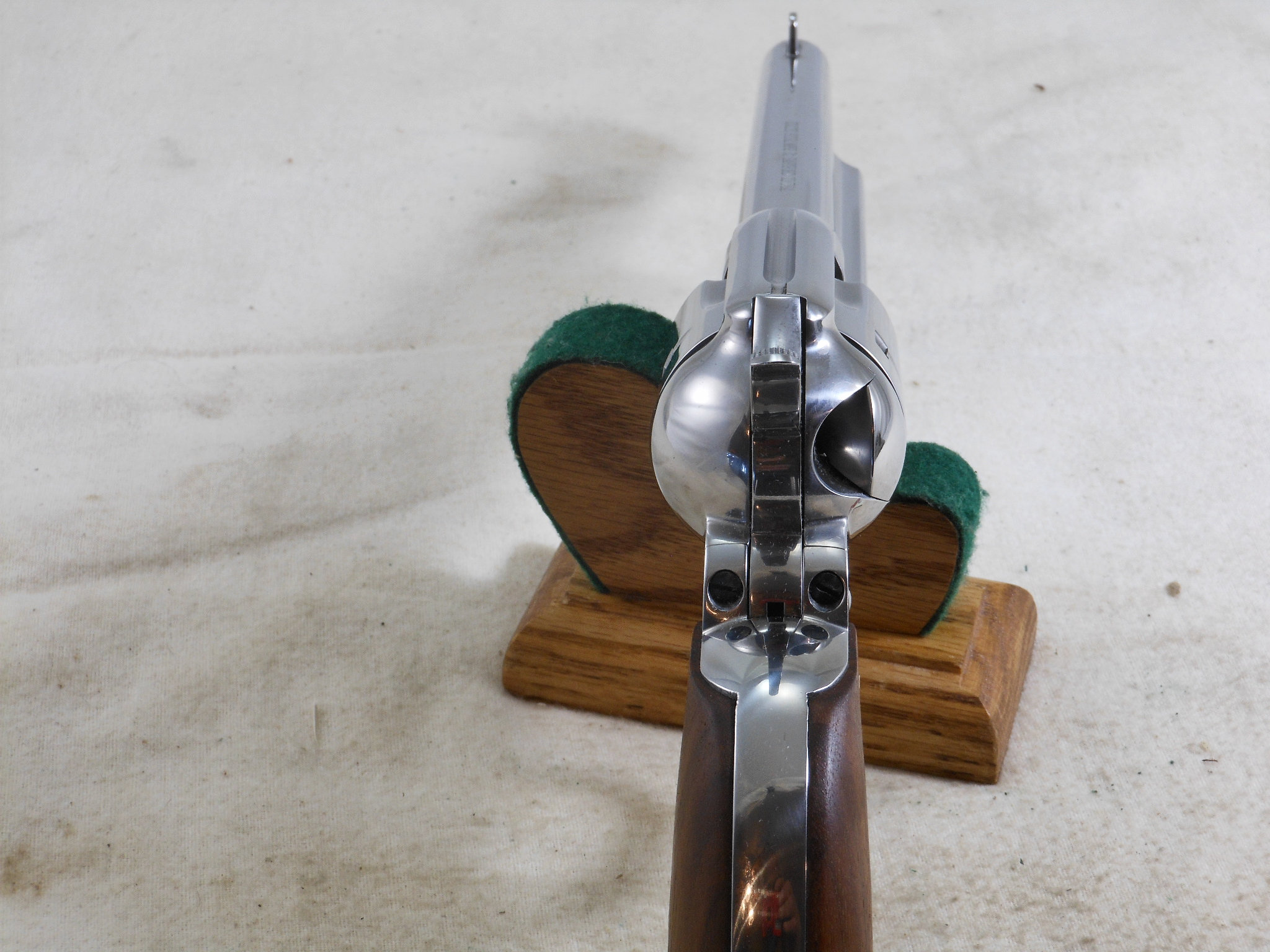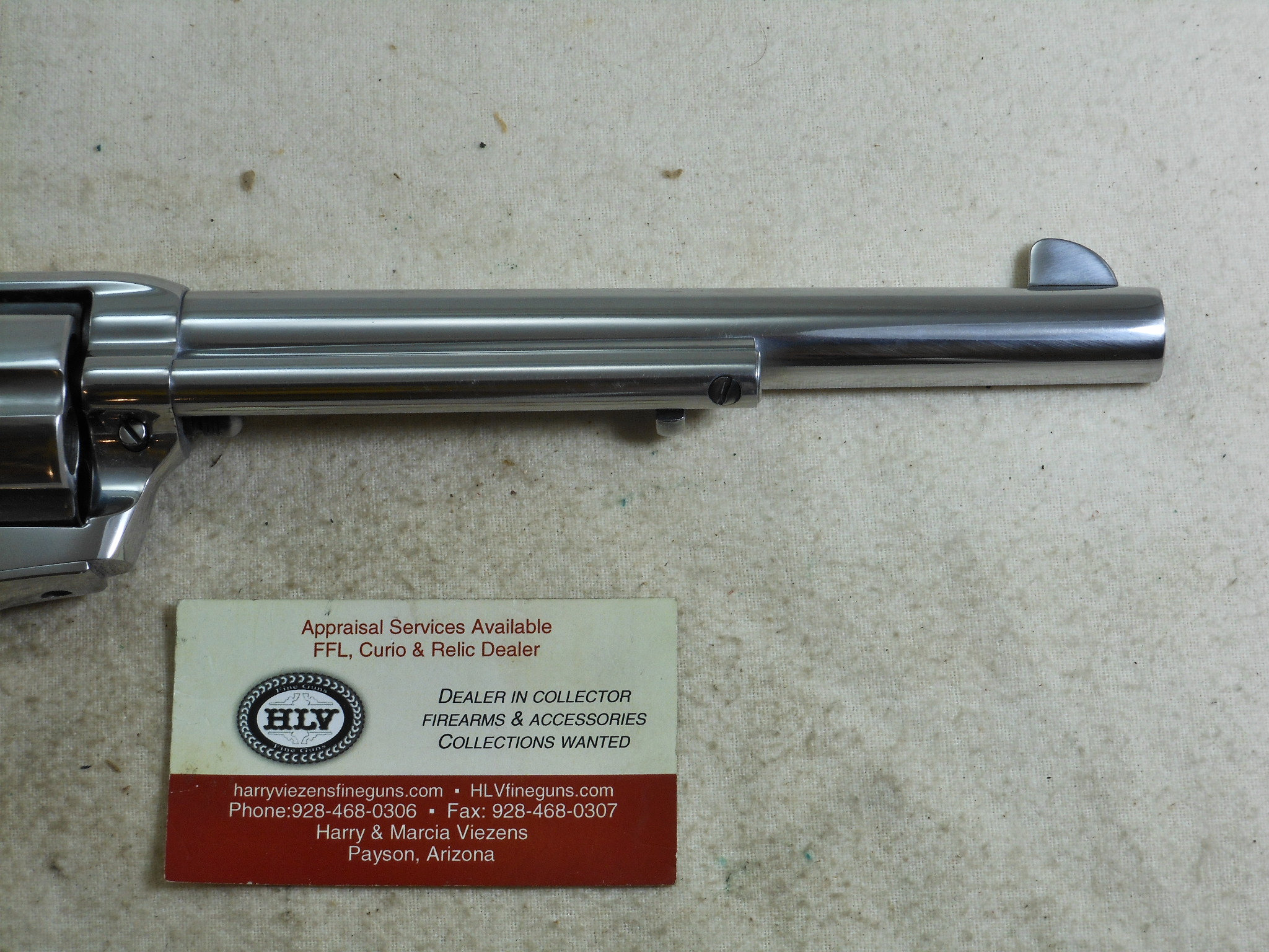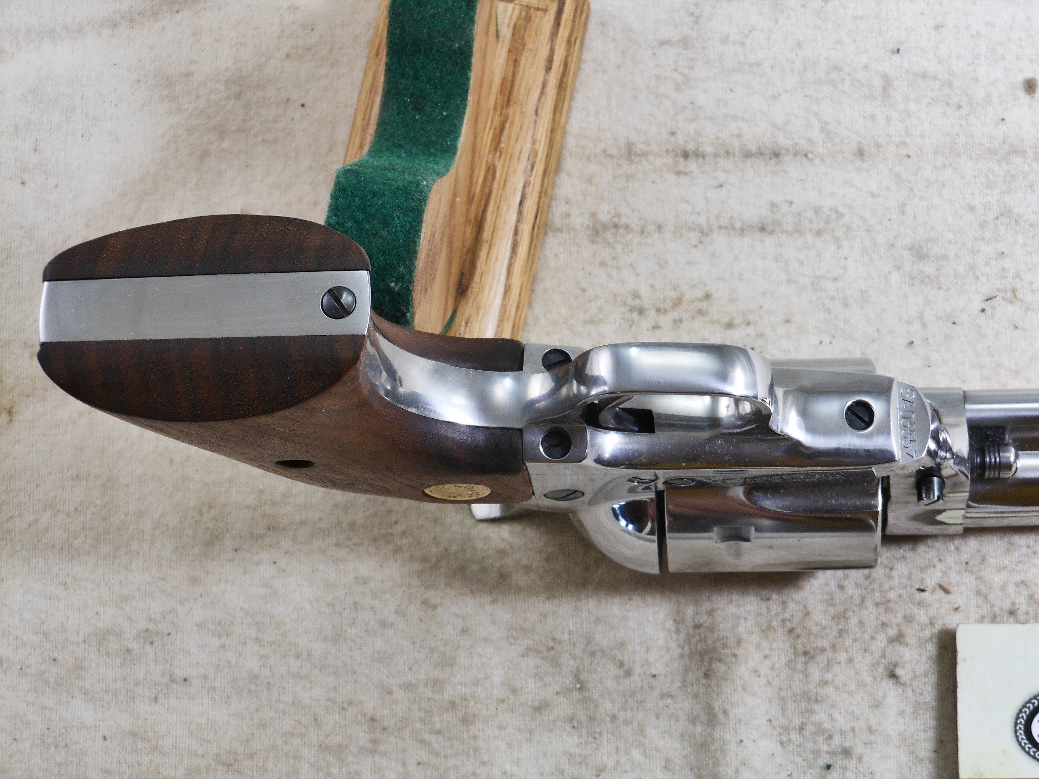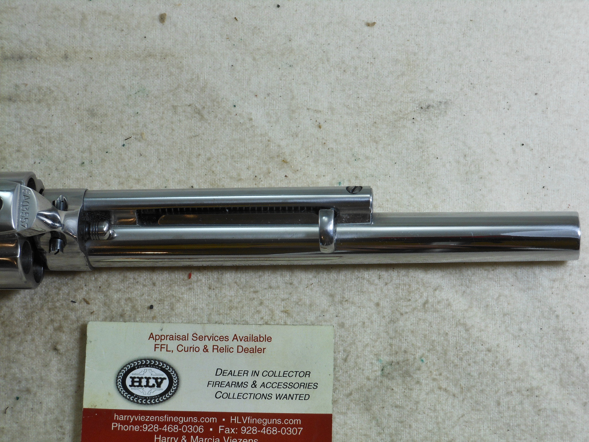 This Colt was produced in 1978. The pistol’s serial number is SA03557. This barrel is the 7 1/2 inch nickel plated barrel chambered to shoot the 45 Colt cartridge. This pistol appears to be in unfired condition. The plating is in new condition with no blemishes. The bore and chambers are bright with no real sign of wear. The wood grips are in new condition with no issues. This is a really stunning pistol with the high polished nickel finish! The 7 1/2 inch barrel in the third generation of the single action army is not very common! Being Nickel Plated adds to the desirability of this fine Colt! The only way you can upgrade this pistol is to have the box!
