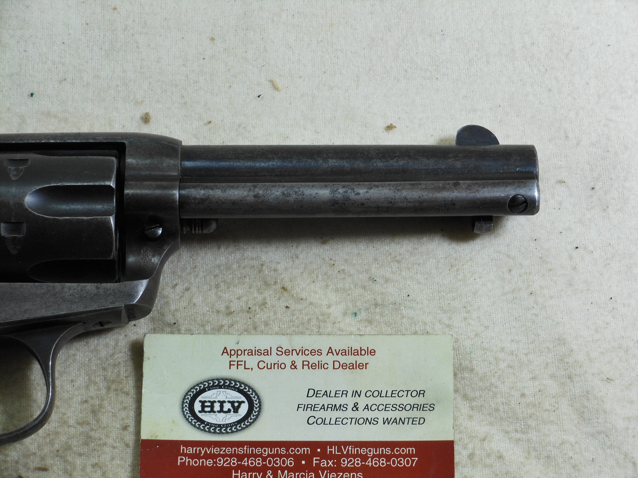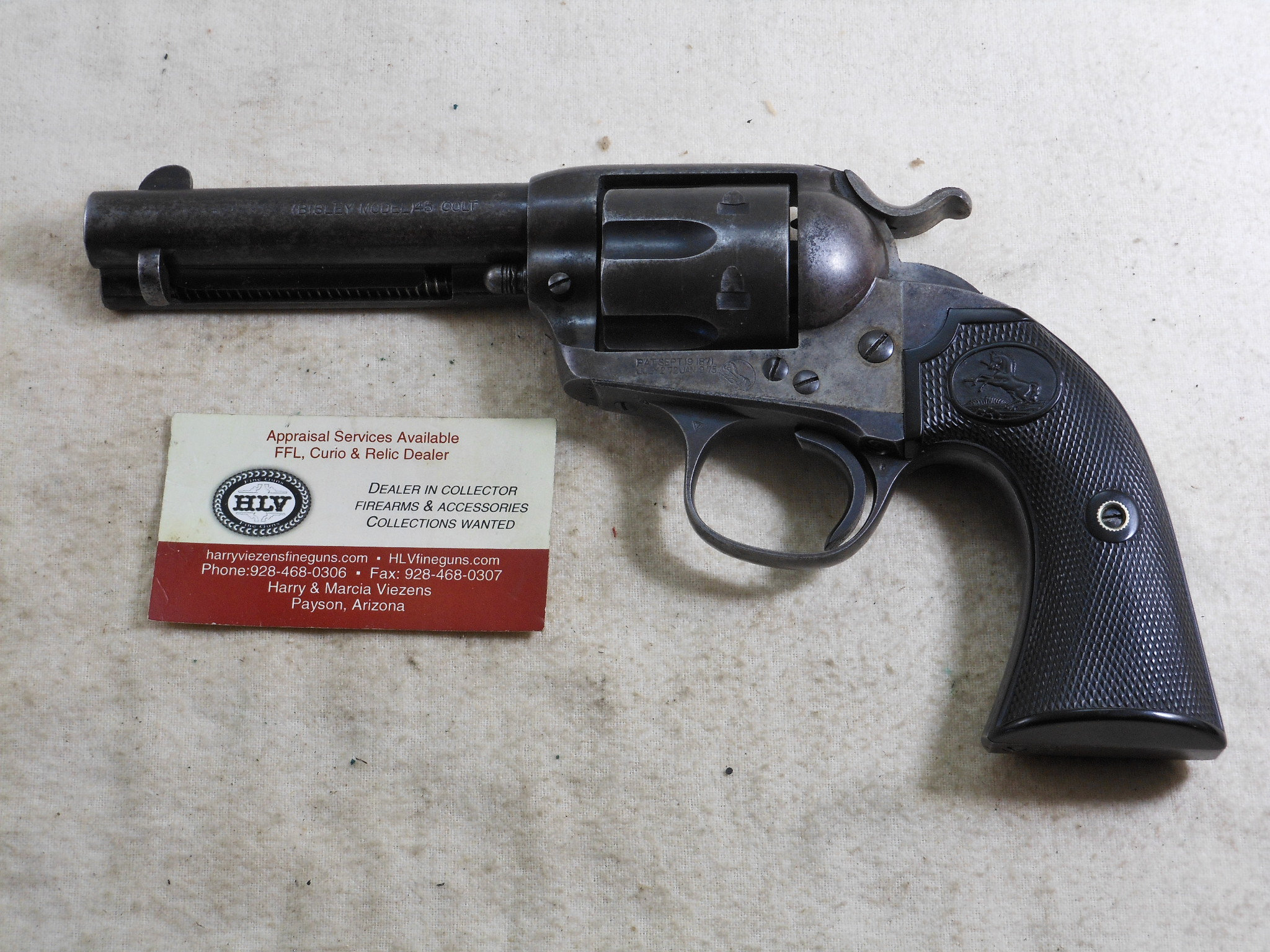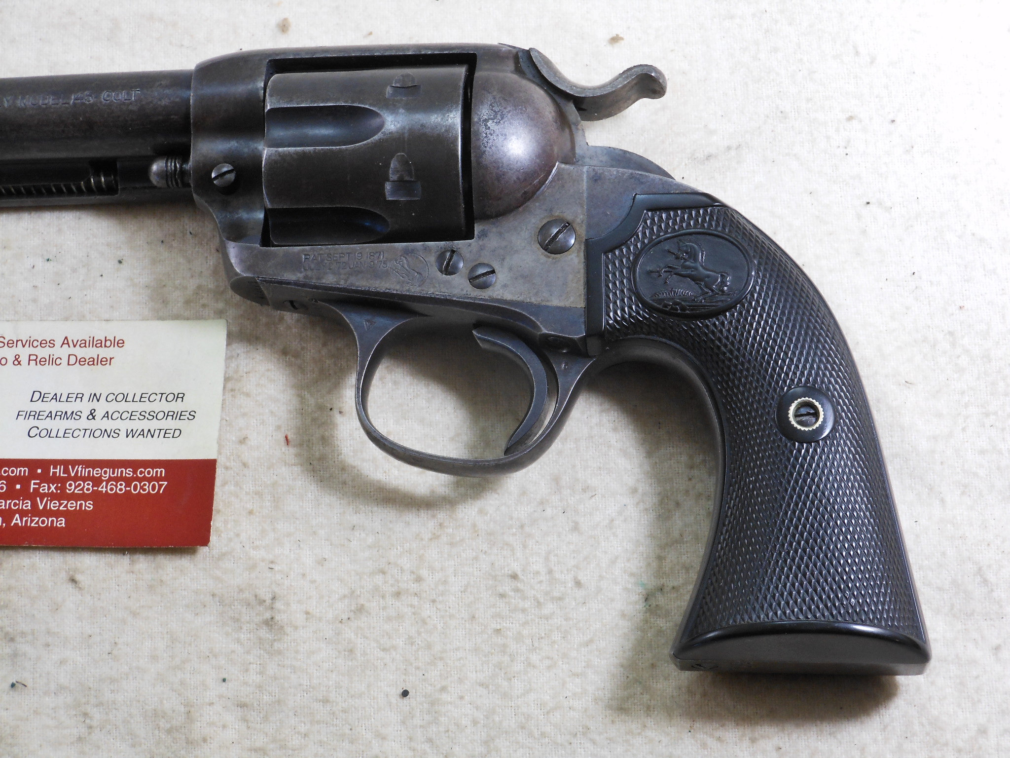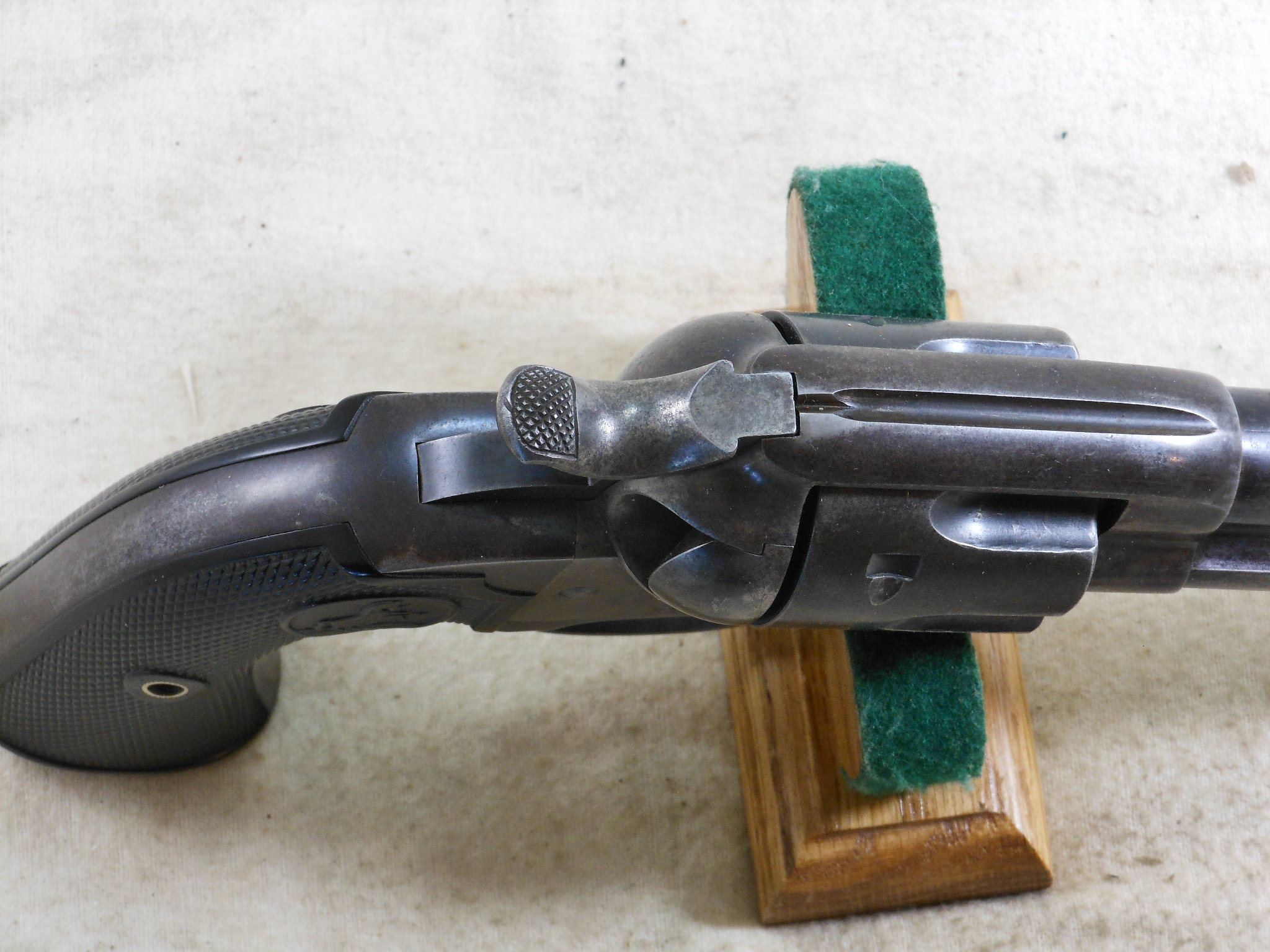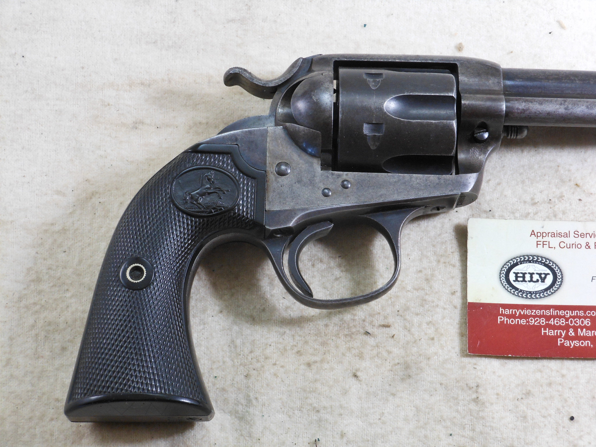This Colt was produced in 1907. The pistol’s serial number is 299883. This pistol has the 4 3/4 inch barrel chambered to shoot the 45 Colt cartridge. This barrel is properly marked “Bisley Model” The bore and chambers are bright with no pitting. The rifling is in very fine sharp condition. The action works very fine with no issues or broken stops. The pistol is mostly patina with traces of bluing in protected places. All of the screws are in fine condition with no burring or other damage to the screw surface. The grips are in fine condition with no chips or other damage. The factory letter states that this Colt was shipped to Speer & Co. Fort Smith Arkansas April 17th 1907. This Colt is a honest used pistol. There is no abuse or damage to this pistol. This pistol shows being used but well cared for. The action is crisp, The bore and chambers have been properly kept clean. Those are signs of a well cared for pistol that has seen frontier use in any kind of weather! This Colt also shoots very fine!