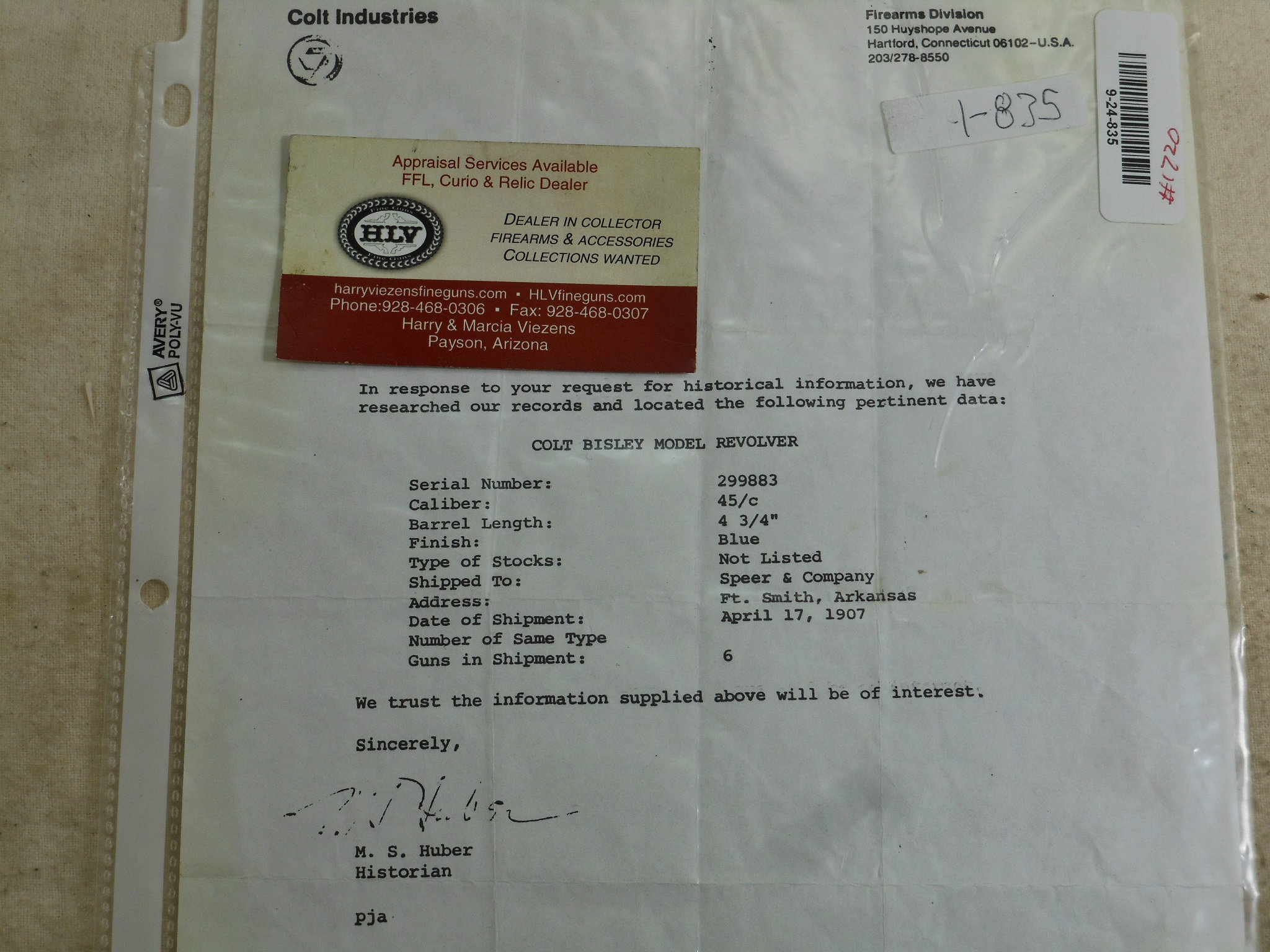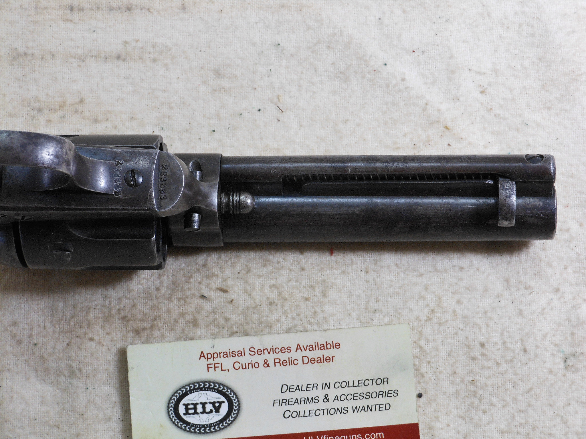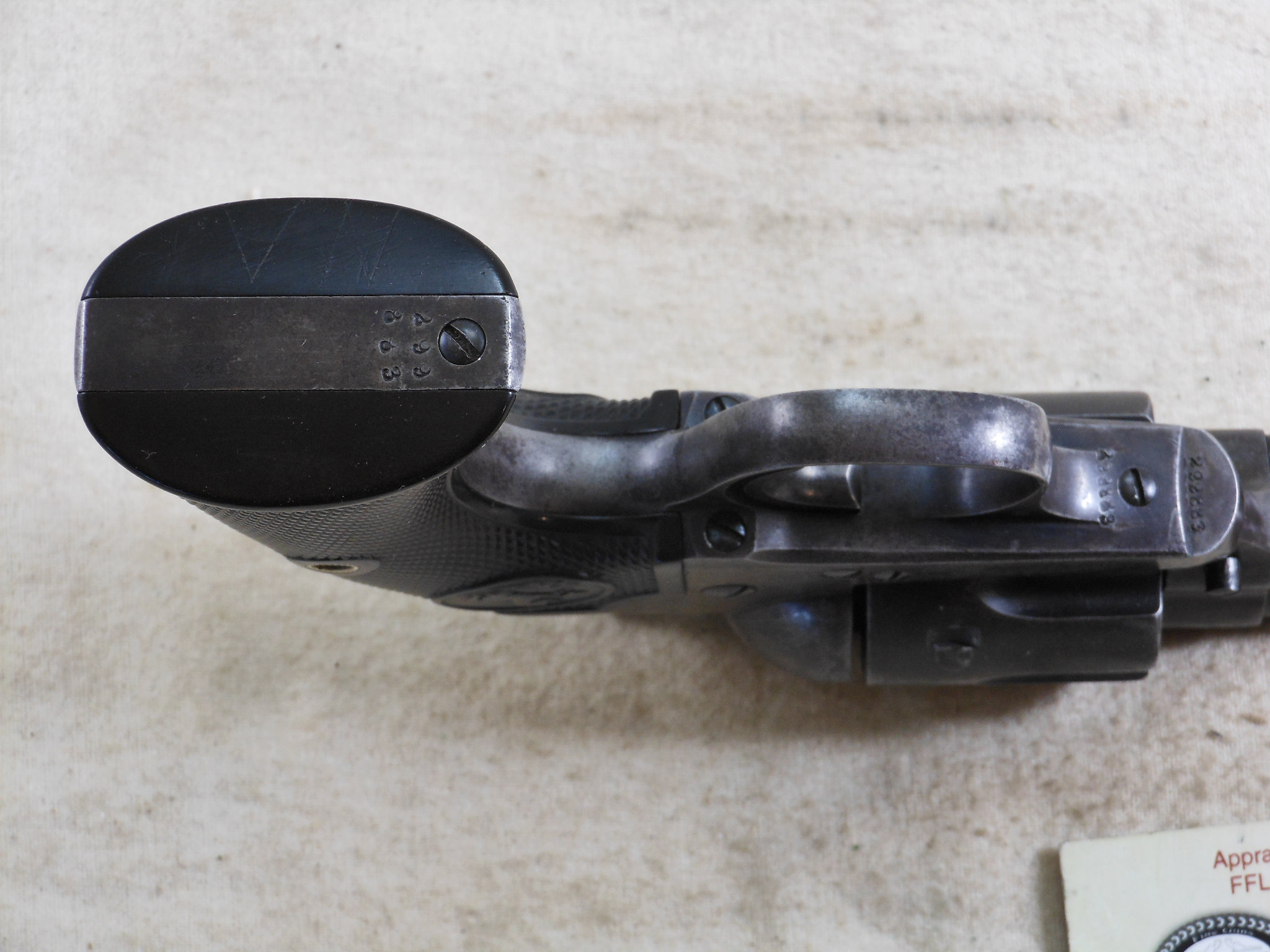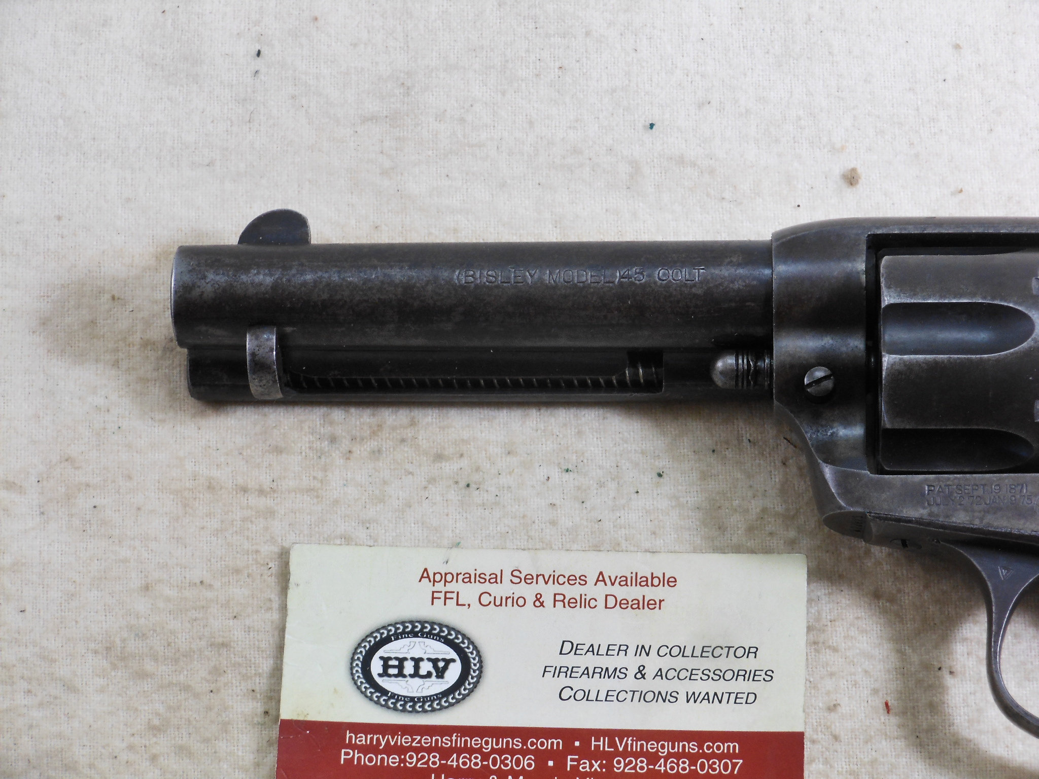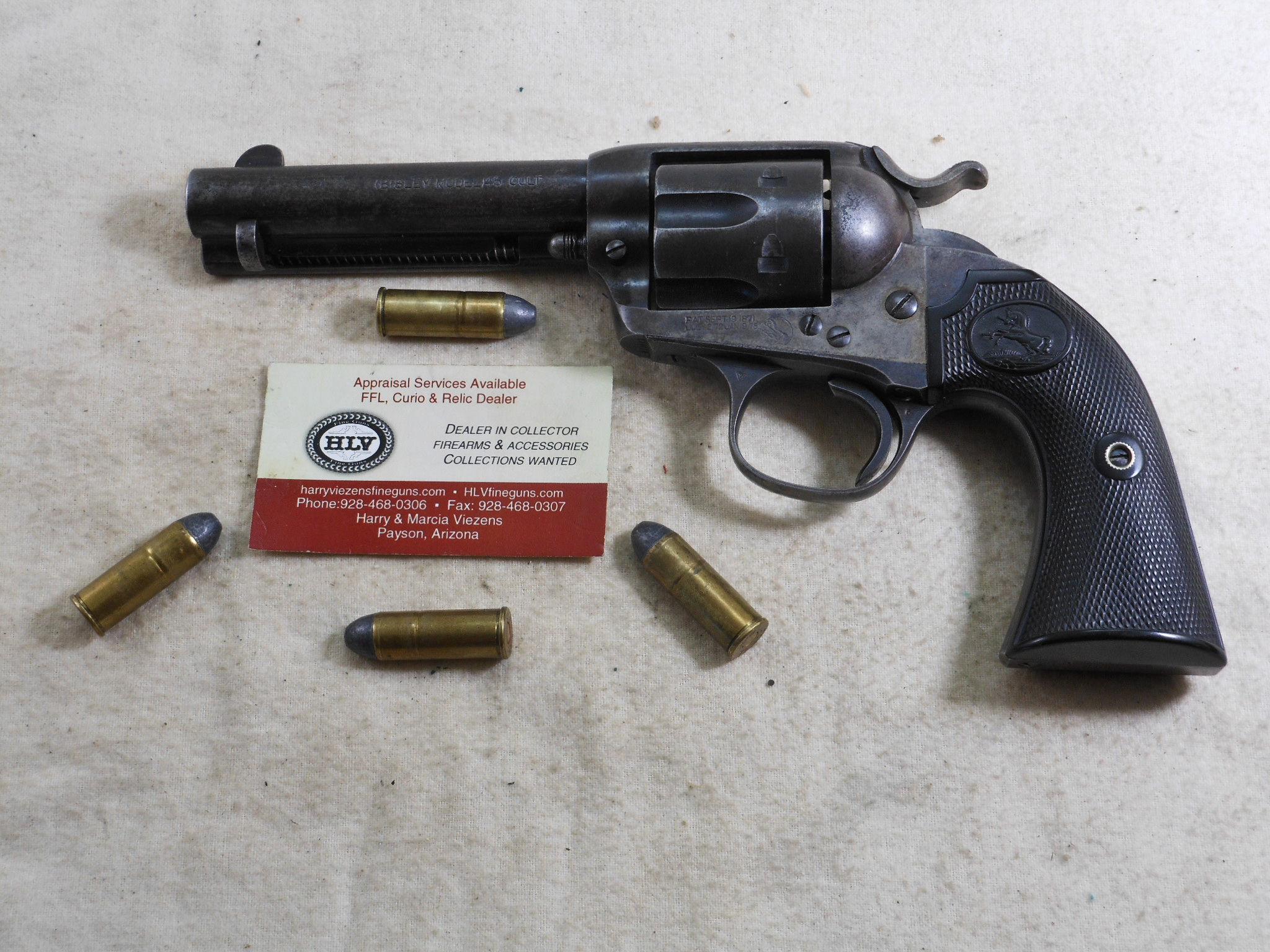 This Colt was produced in 1907. The pistol’s serial number is 299883. This pistol has the 4 3/4 inch barrel chambered to shoot the 45 Colt cartridge. This barrel is properly marked “Bisley Model” The bore and chambers are bright with no pitting. The rifling is in very fine sharp condition. The action works very fine with no issues or broken stops. The pistol is mostly patina with traces of bluing in protected places. All of the screws are in fine condition with no burring or other damage to the screw surface. The grips are in fine condition with no chips or other damage. The factory letter states that this Colt was shipped to Speer & Co. Fort Smith Arkansas April 17th 1907. This Colt is a honest used pistol. There is no abuse or damage to this pistol. This pistol shows being used but well cared for. The action is crisp, The bore and chambers have been properly kept clean. Those are signs of a well cared for pistol that has seen frontier use in any kind of weather! This Colt also shoots very fine!