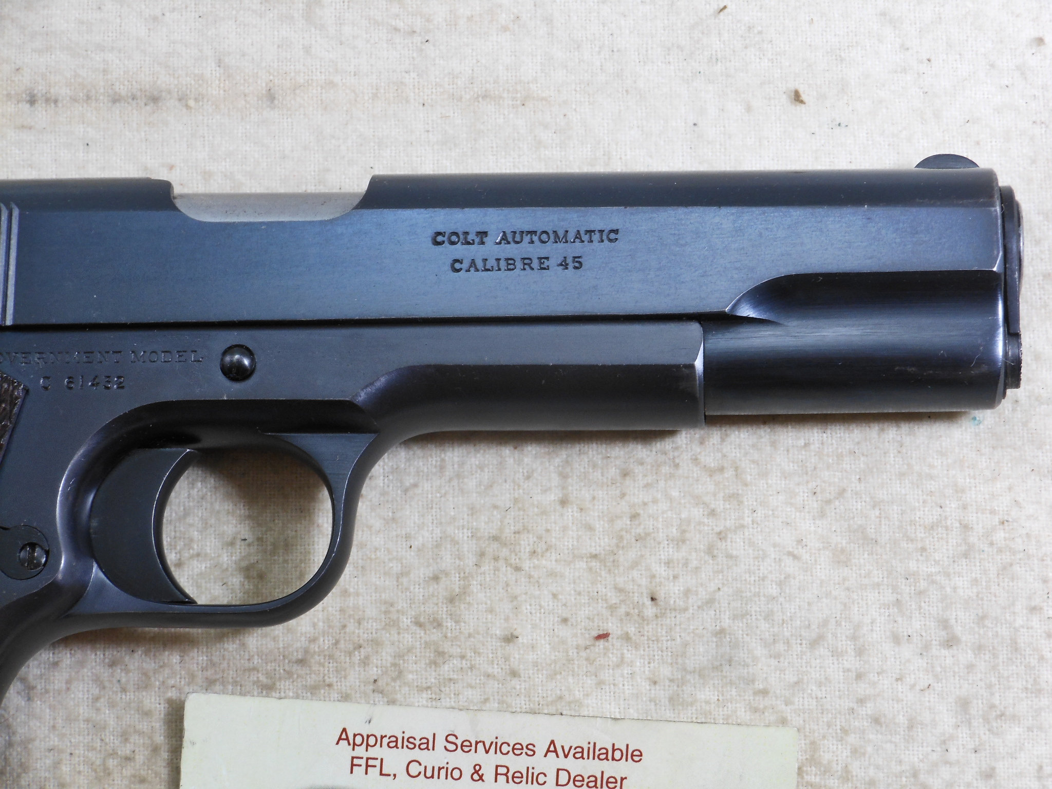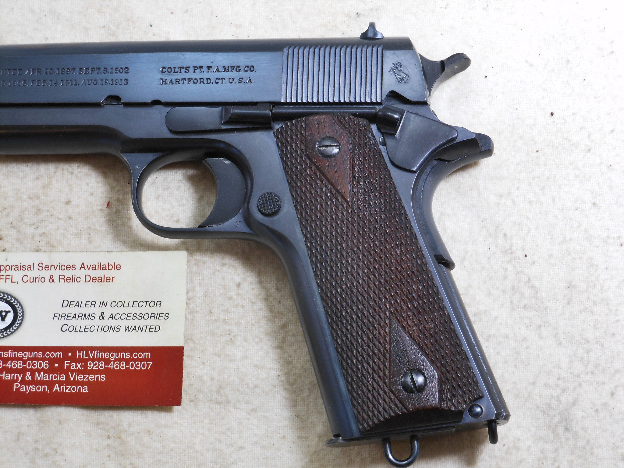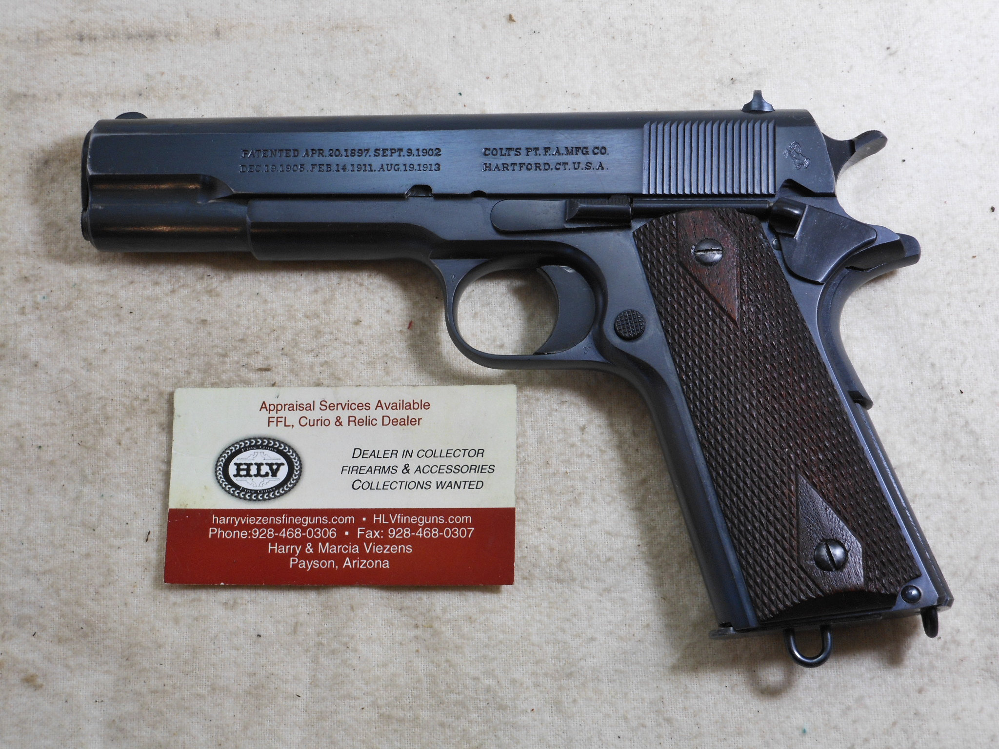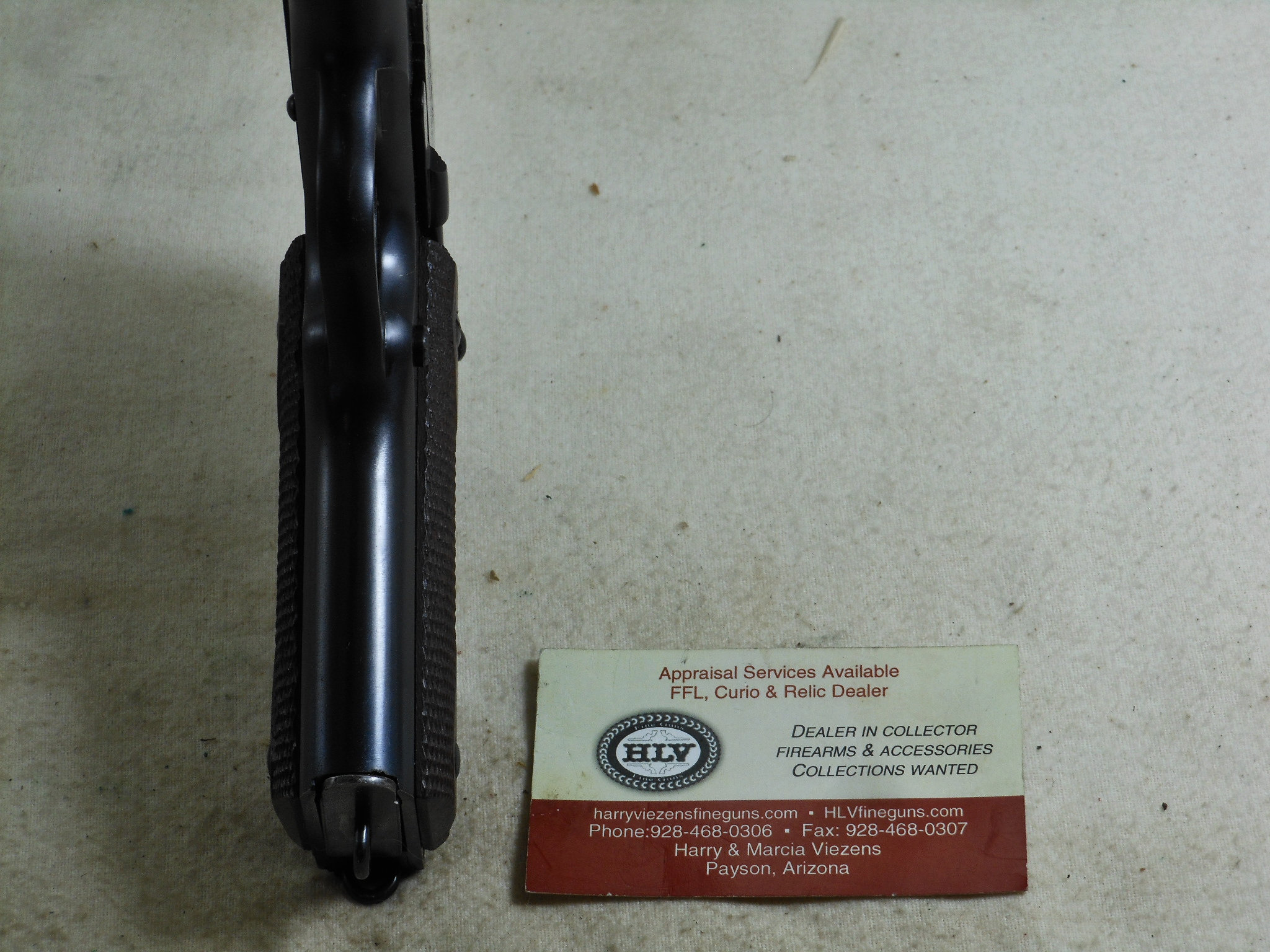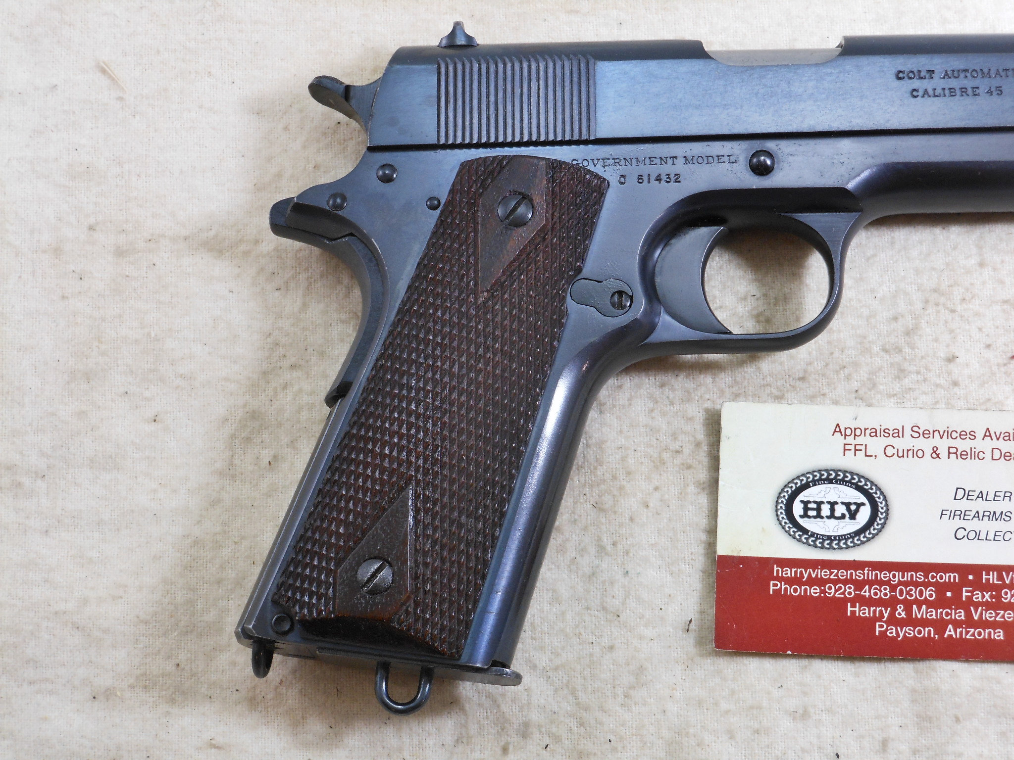 This Colt Government Model 1911 was produced in 1916. The Pistol’s serial number is C 61432. This Colt is in near unfired condition! The bore is in minty condition. The bolt face retains almost all of the original blue. The Barrel is the correct unmarked commercial barrel. The barrel retains almost all of the original bluing. The ejection port area of the barrel top is correctly in the white. The slide retains 98+% of the original bluing. The frame also retains about 99% of the original bluing. The correct wood grips are in new minty condition. The original magazine is the correct high polish commercial two tone magazine with the “U” staple on the floor plate. The action is crisp with no issues. This is a very rare pre World War One Colt in this fine of condition! All this Colt needs is a box! This Pistol belongs in a high end Colt Collection! This pistol is one stunning gun! The Box Of Shells Is Not For SALE! For Display Only!