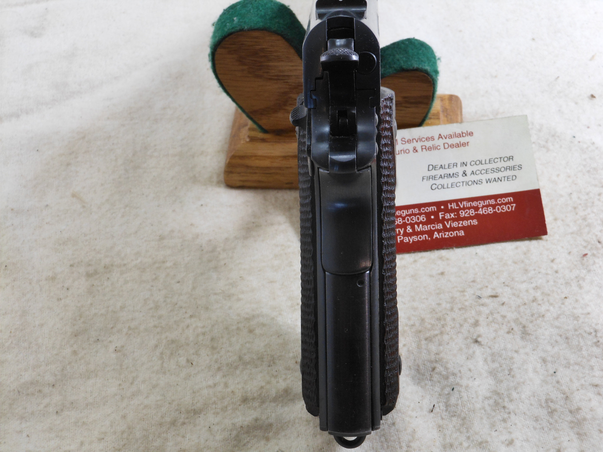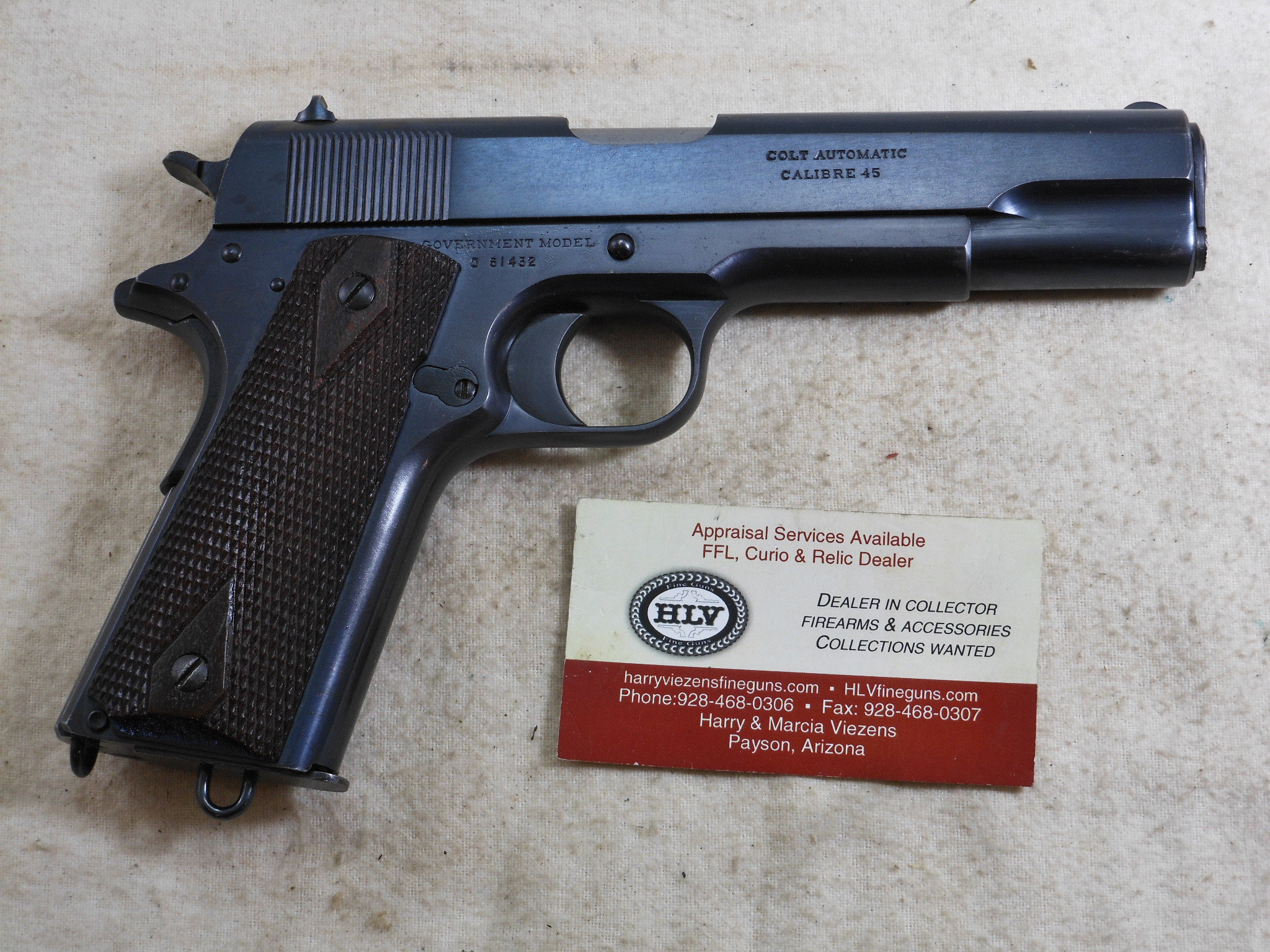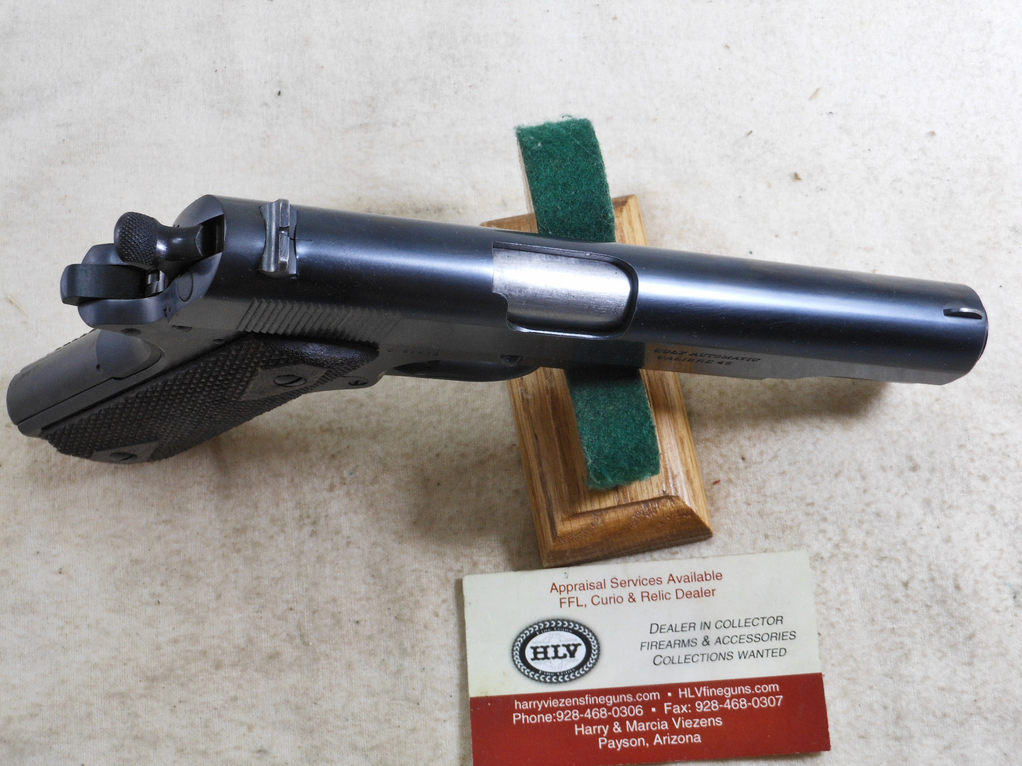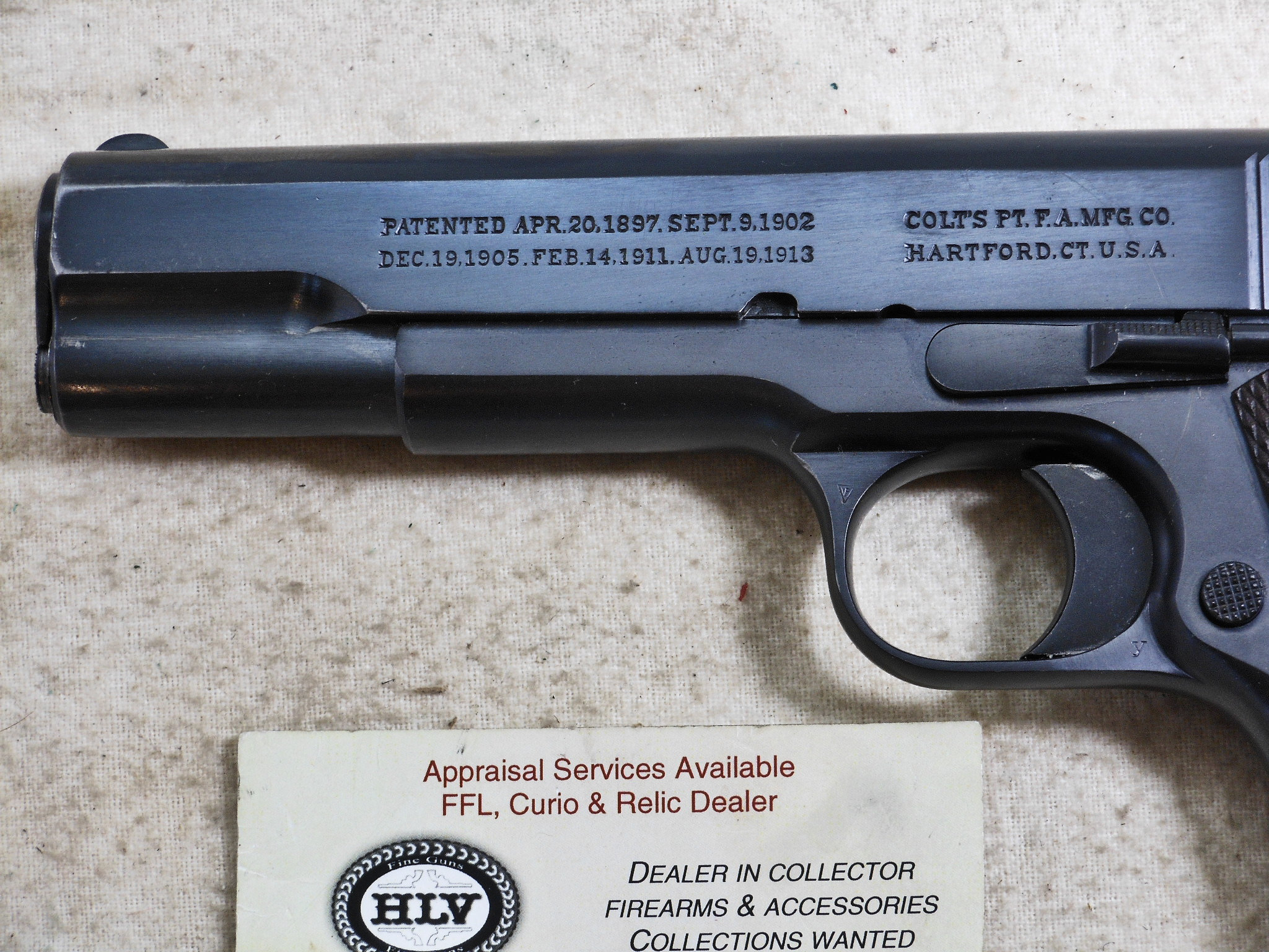 This Colt Government Model 1911 was produced in 1916. The Pistol’s serial number is C 61432. This Colt is in near unfired condition! The bore is in minty condition. The bolt face retains almost all of the original blue. The Barrel is the correct unmarked commercial barrel. The barrel retains almost all of the original bluing. The ejection port area of the barrel top is correctly in the white. The slide retains 98+% of the original bluing. The frame also retains about 99% of the original bluing. The correct wood grips are in new minty condition. The original magazine is the correct high polish commercial two tone magazine with the “U” staple on the floor plate. The action is crisp with no issues. This is a very rare pre World War One Colt in this fine of condition! All this Colt needs is a box! This Pistol belongs in a high end Colt Collection! This pistol is one stunning gun! The Box Of Shells Is Not For SALE! For Display Only!