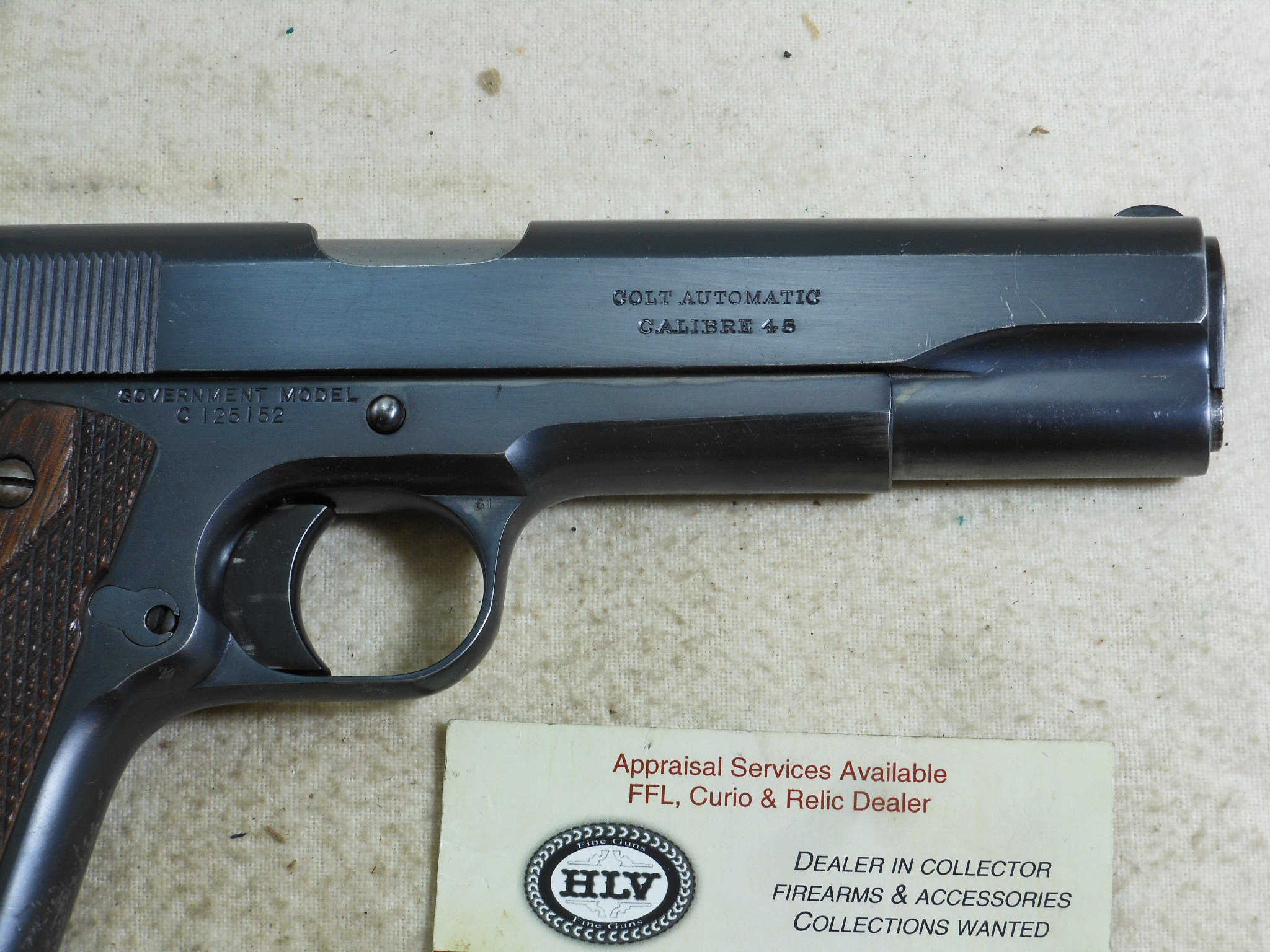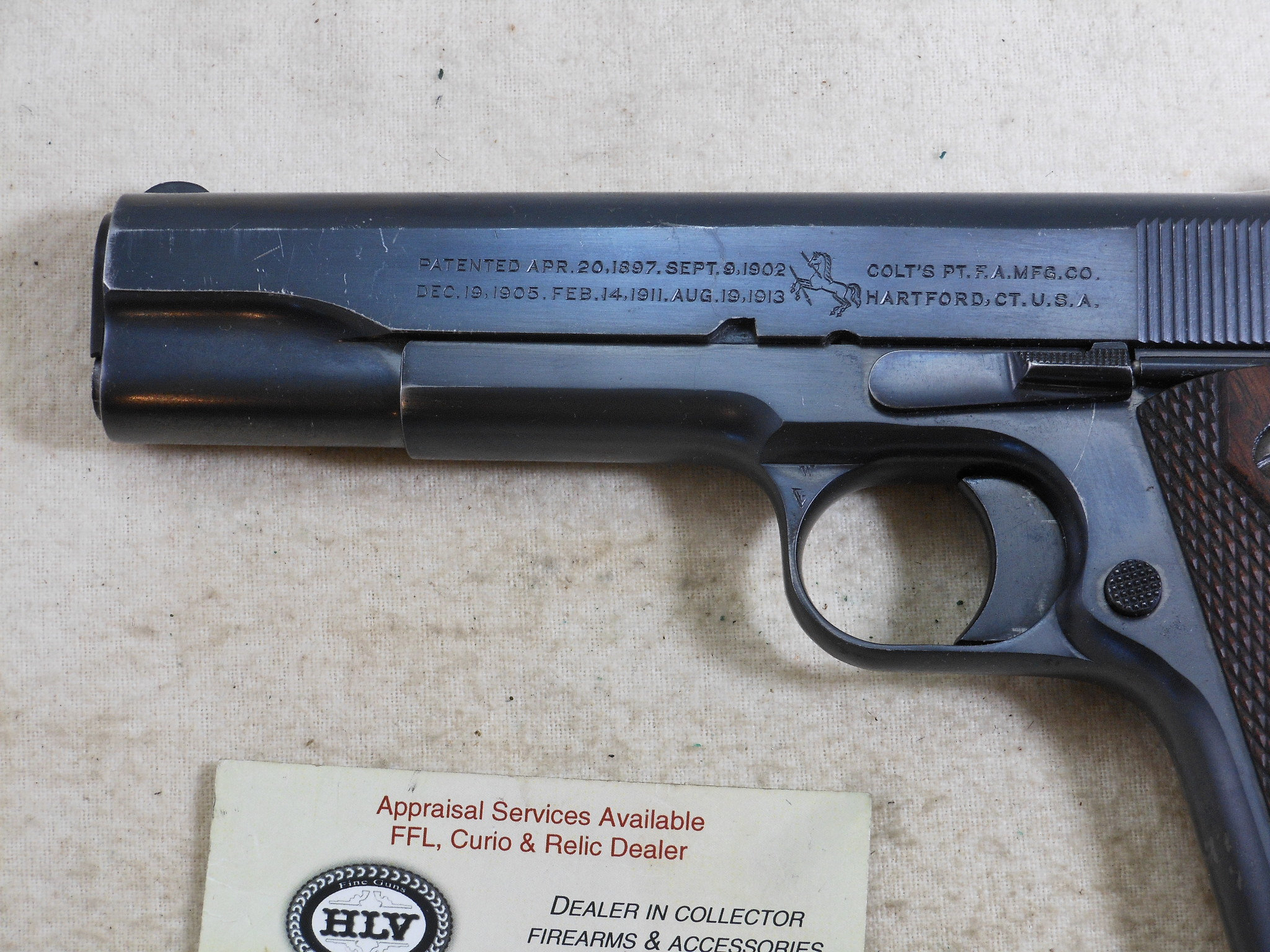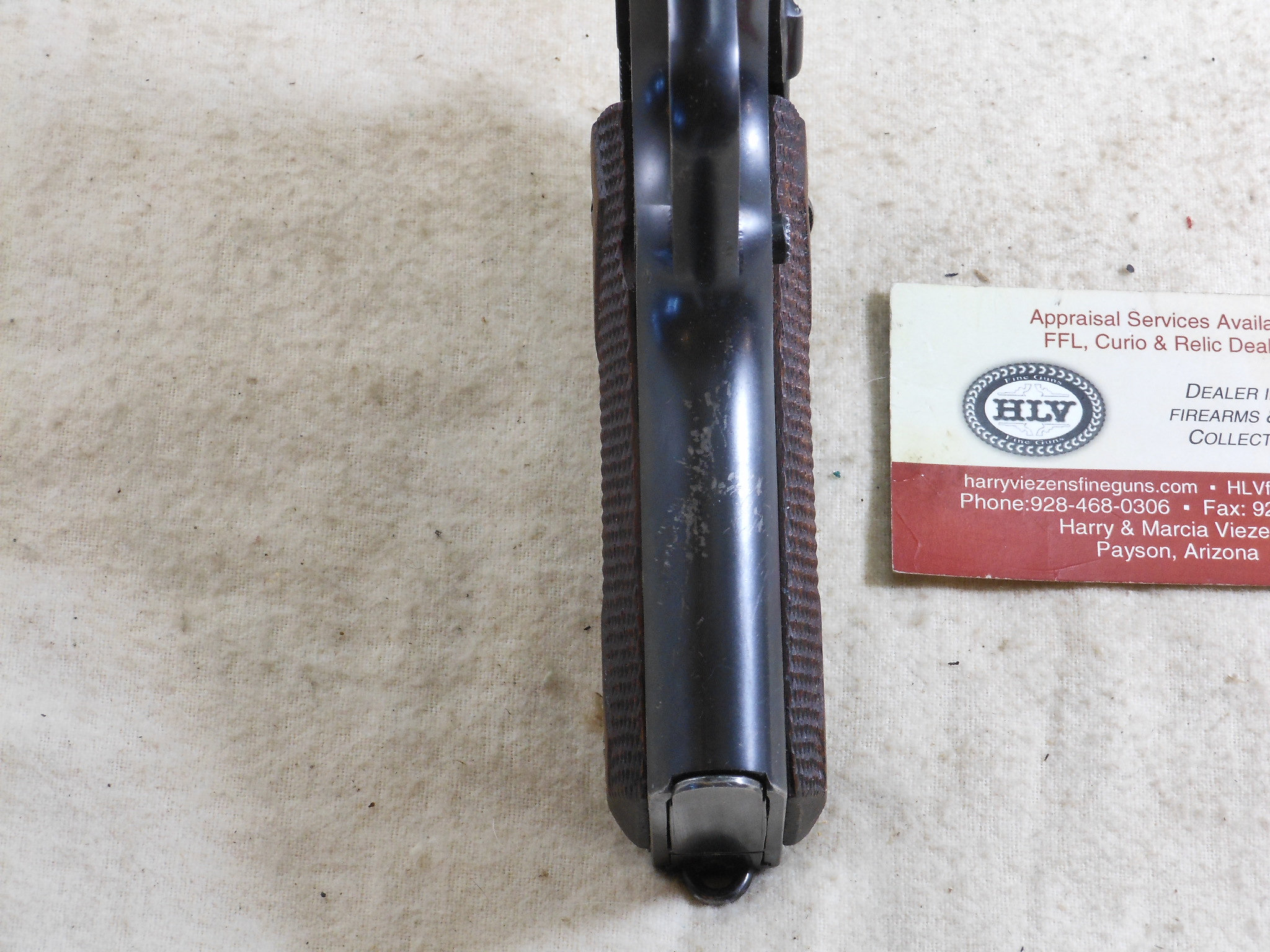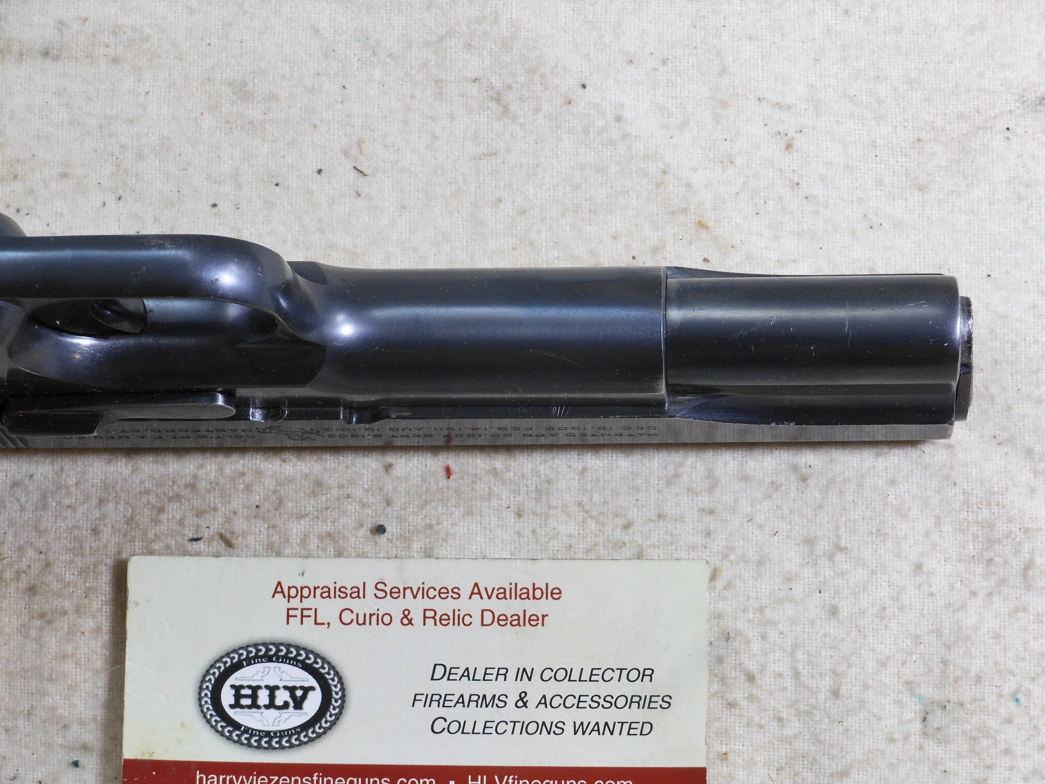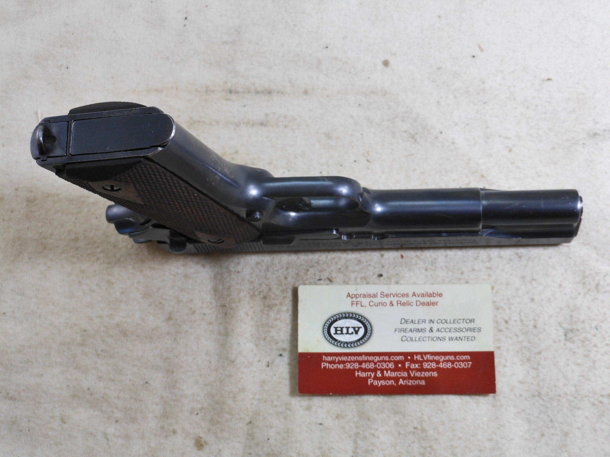 This Colt was produced in 1920. The pistol’s serial number is C125152. This Colt has seen very little use or being fired. The bore is in very fine bright condition. The original 45 A.C.P. barrel has the polished top of the barrel that is seen by the ejection port. This barrel retains most of the original bluing beyond the barrel top. The slide is snug and has no play on the rails. The slide retains about 97% of the original high polish bluing. The sights are original to this pistol. The frame retains about 97% or better of the original bluing. The action works perfectly fine with no issues. The original wood grips are in fine condition with no damage or flattened checkering points. The magazine is the correct high polish commercial two tone magazine with no magazine floor plate markings. There has not been any alterations or switched parts on this Colt. This Colt Government Model Commercial 45 A.C.P. is in really fine high condition! This pistol is the kind of high condition pistol collectors dream of finding for their collections! This Box Of Shells Is Not For Sale, For Display Only!