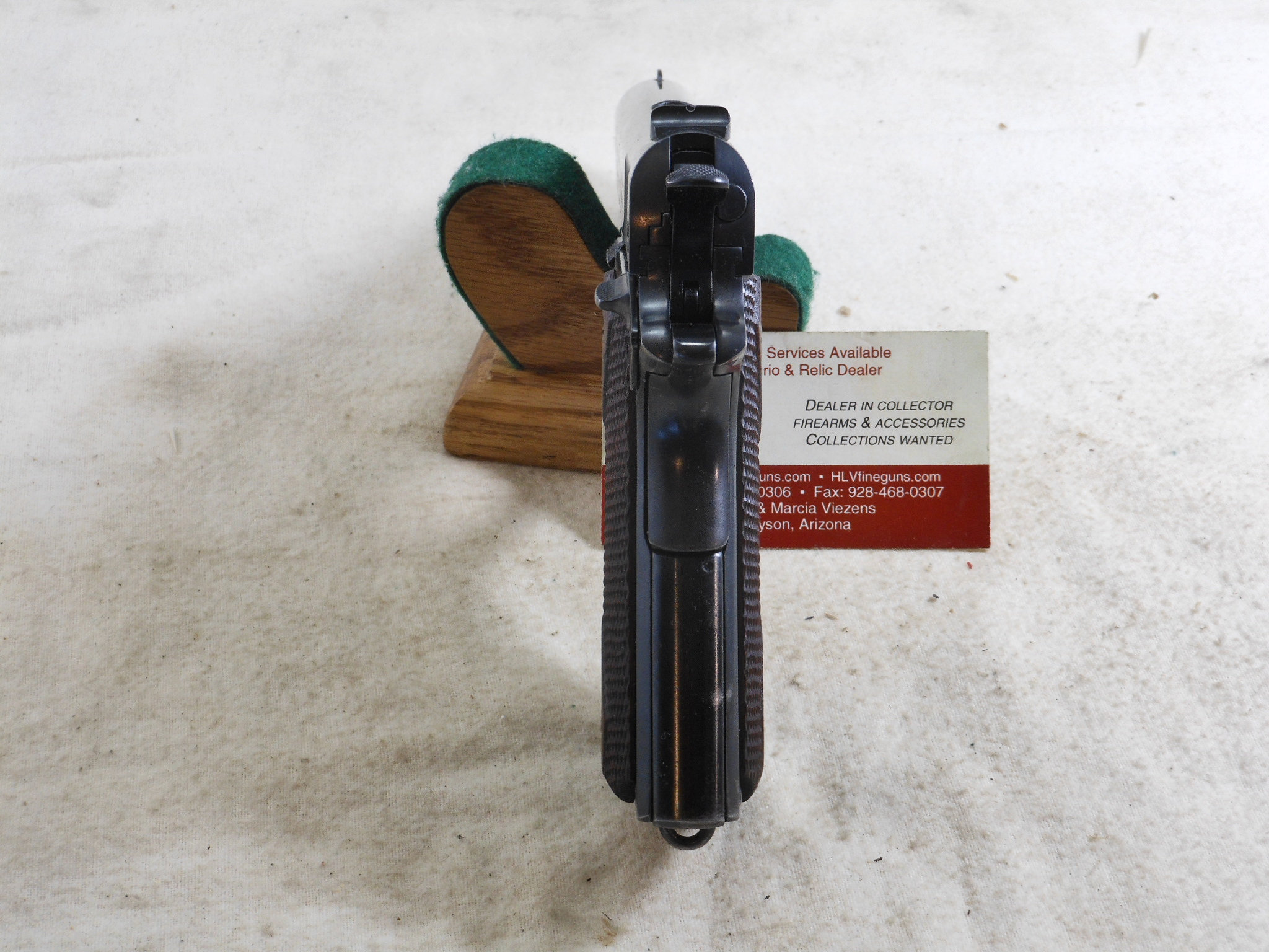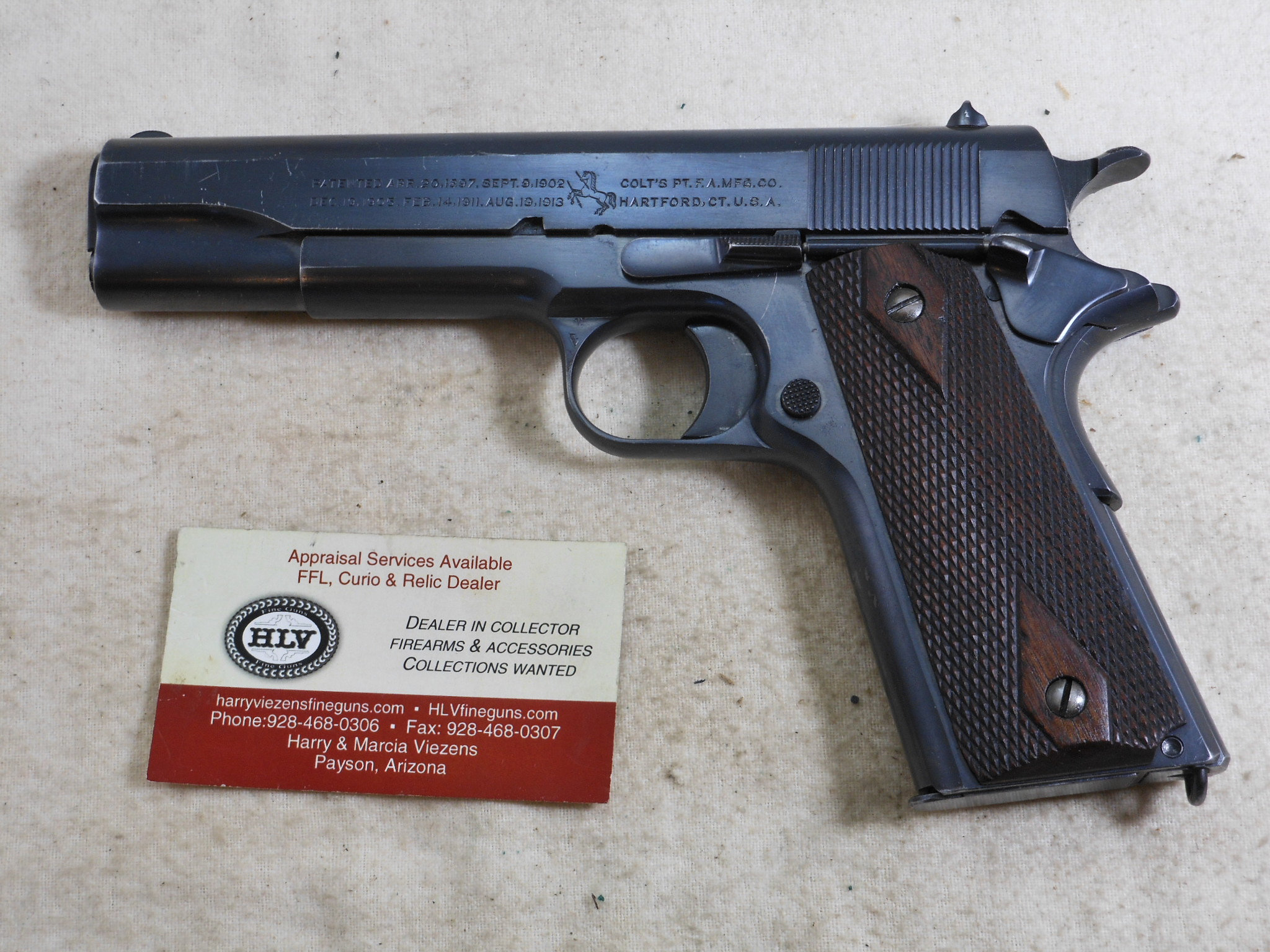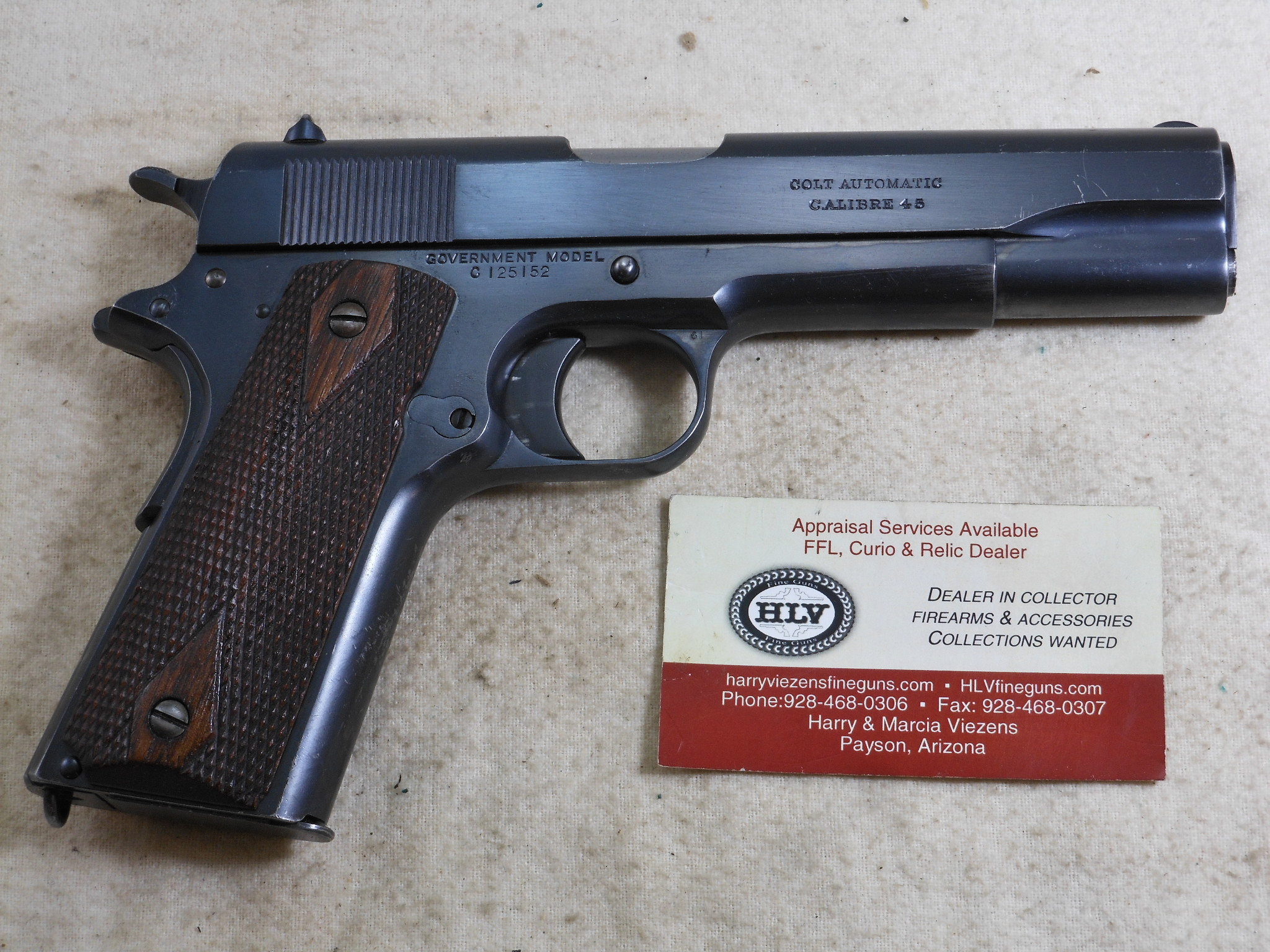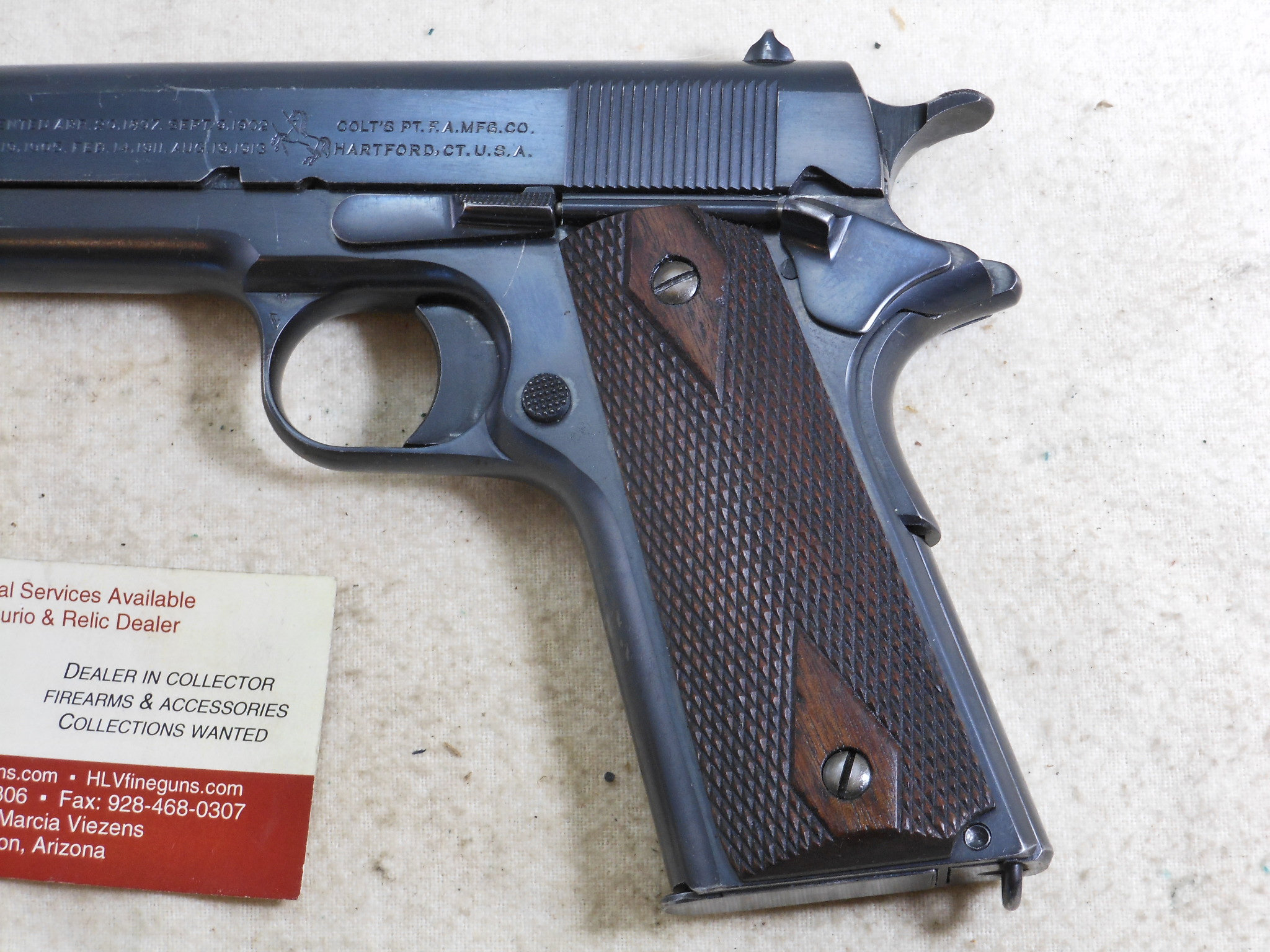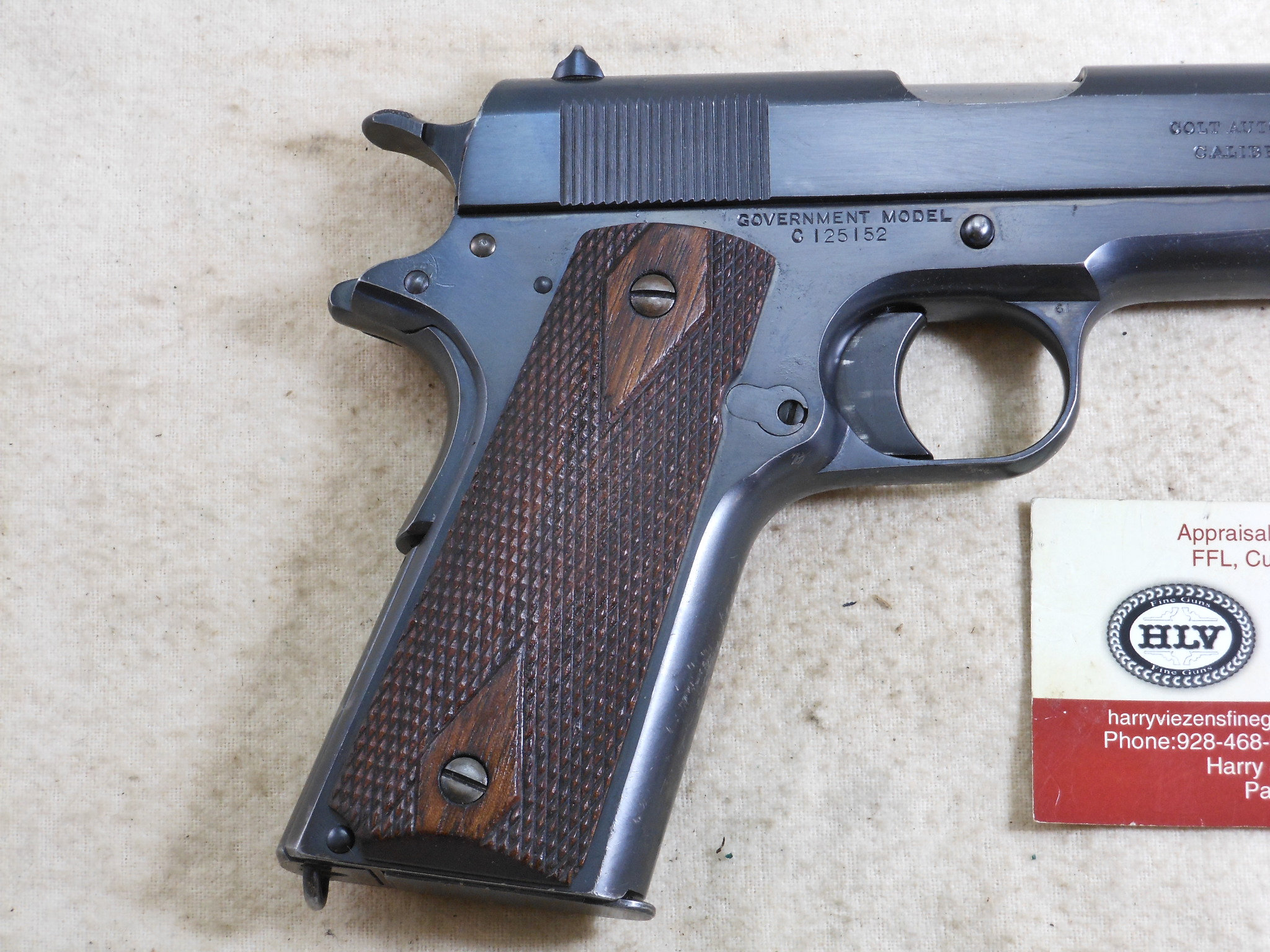This Colt was produced in 1920. The pistol’s serial number is C125152. This Colt has seen very little use or being fired. The bore is in very fine bright condition. The original 45 A.C.P. barrel has the polished top of the barrel that is seen by the ejection port. This barrel retains most of the original bluing beyond the barrel top. The slide is snug and has no play on the rails. The slide retains about 97% of the original high polish bluing. The sights are original to this pistol. The frame retains about 97% or better of the original bluing. The action works perfectly fine with no issues. The original wood grips are in fine condition with no damage or flattened checkering points. The magazine is the correct high polish commercial two tone magazine with no magazine floor plate markings. There has not been any alterations or switched parts on this Colt. This Colt Government Model Commercial 45 A.C.P. is in really fine high condition! This pistol is the kind of high condition pistol collectors dream of finding for their collections! This Box Of Shells Is Not For Sale, For Display Only!
