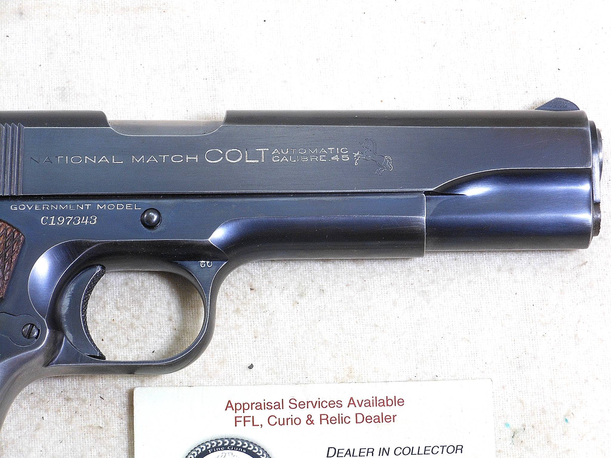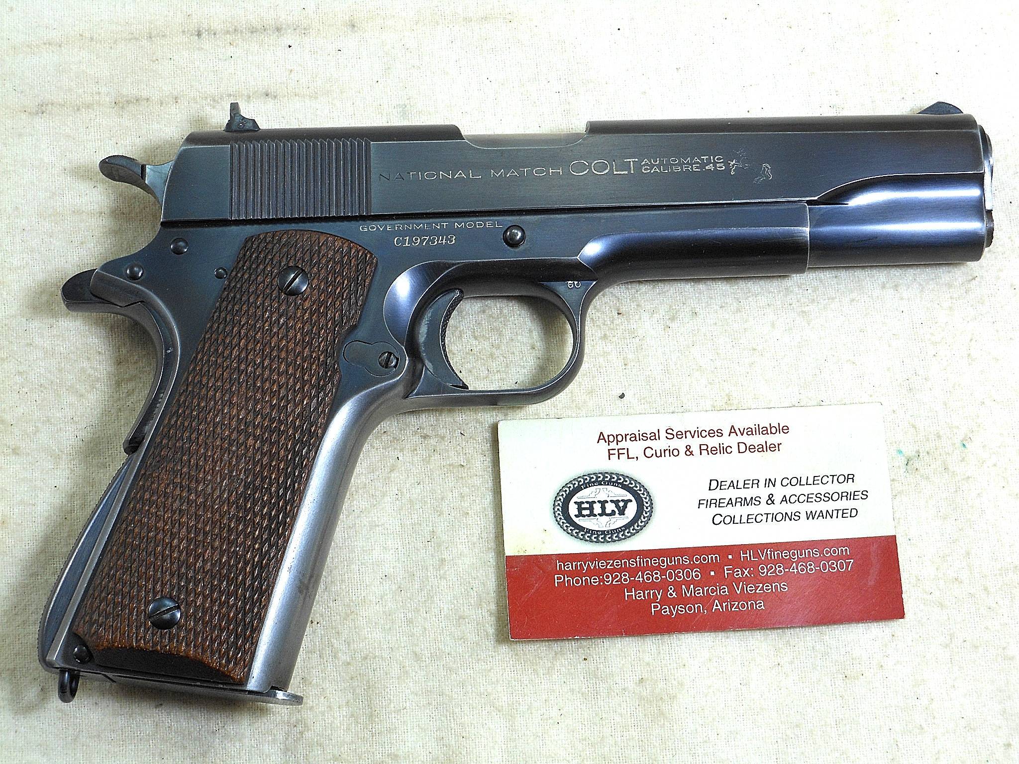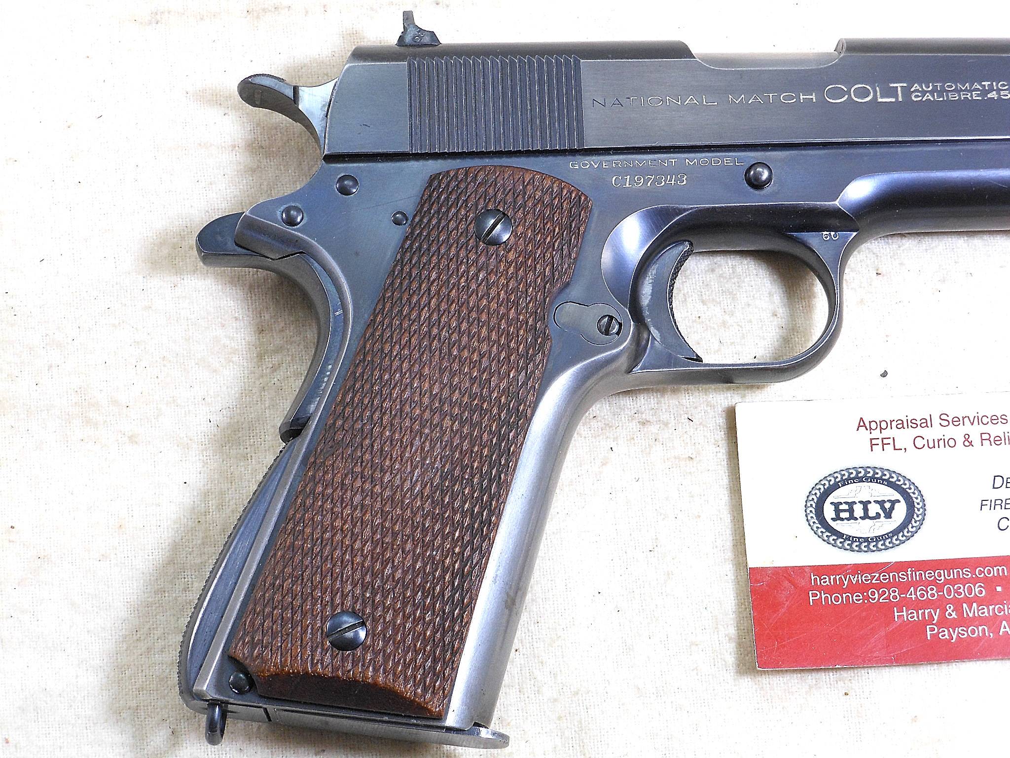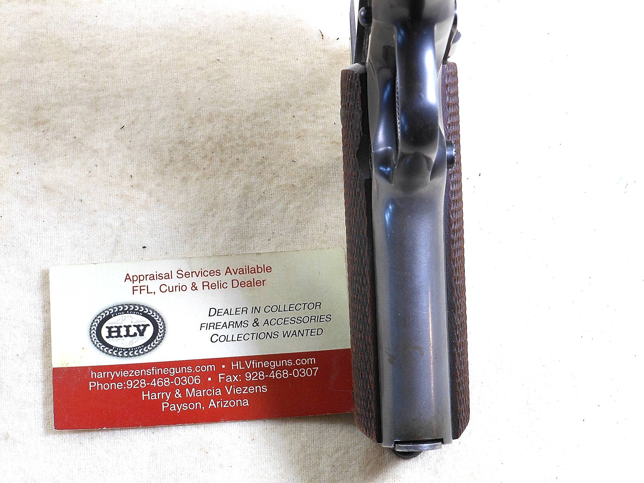 This Colt National Match was produced in 1939. The pistol’s serial number is C 197343. This 45 A.C.P. National Match pistol has the correct MB in a circle stamped on the left side barrel lug. It also has the Colt 45 Auto Match stamped under the left side of the barrel above the barrel lug. The bore is in very fine condition. This pistol is also fitted with the rare Swartz safety device. The Swartz safety is fully functional and works correctly. This Colt also has the correct time period King windage adjustable rear sight. The King Sight was well known and was fitted to many models of the Colt line up as well as being fitted to other makers such as Smith & Wesson. Adjustable rear sight was seldom seen on these National Match pistols. This pistol is one of these pistols that has the adjustable sight. There were about 1475 of these sights fitted to the pre war National Match pistols! The total production of these pre war National Match pistols was 4813 pistols! Of those National Match Pistols less than 1200 of these pistols were fitted with the Swartz safety. This production number of these Swartz Safety pistols was figured out by the well known author of the Colt 1911 and A1’s, Charles Clawson. This makes this Colt quite Rare! This Colt has the matching serial numbered slide. The serial number is stamped inside the firing pin chamber. The original bluing would rate a 85% or better condition. Most of the blue loss is by the grip frame. This magazine is the correct all blued magazine for this pistol with the Colt 45 Auto stamped on the magazine floor plate. The wood grips are original to this Colt. The grips are in fine condition. The checkering is sharp with high points. There is no cracks or other damage to these grips. These early National Match pistols had hand honed actions and carefully fitted parts. The workmanship was of the best Colt had to offer. This is a very fine rare Colt for the discerning collector to acquire for their collection!