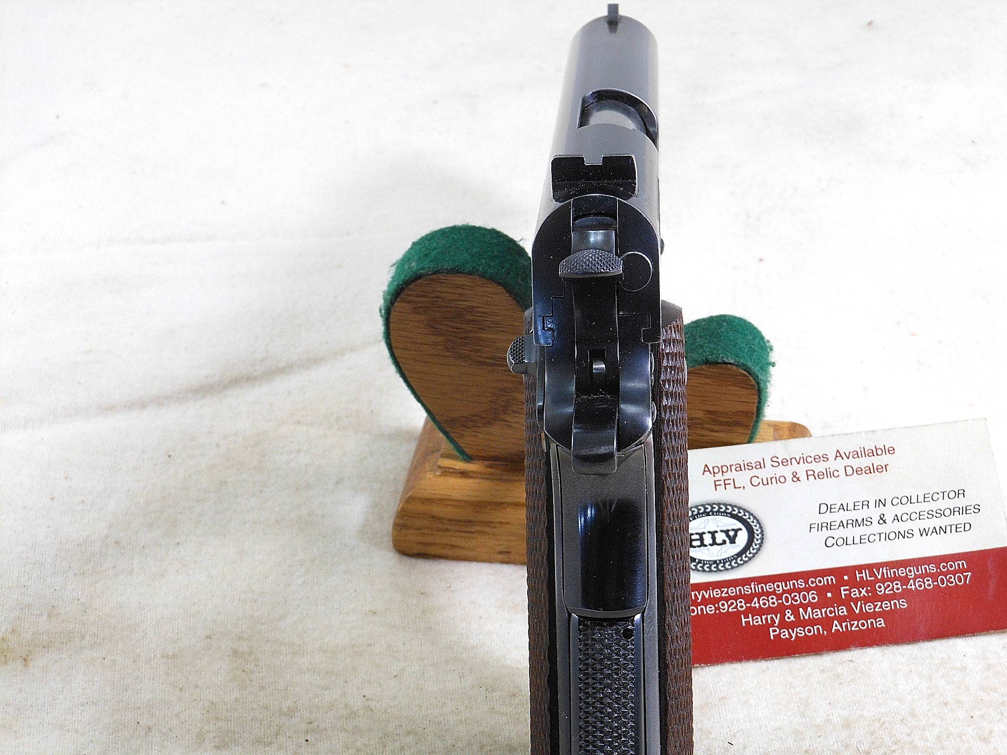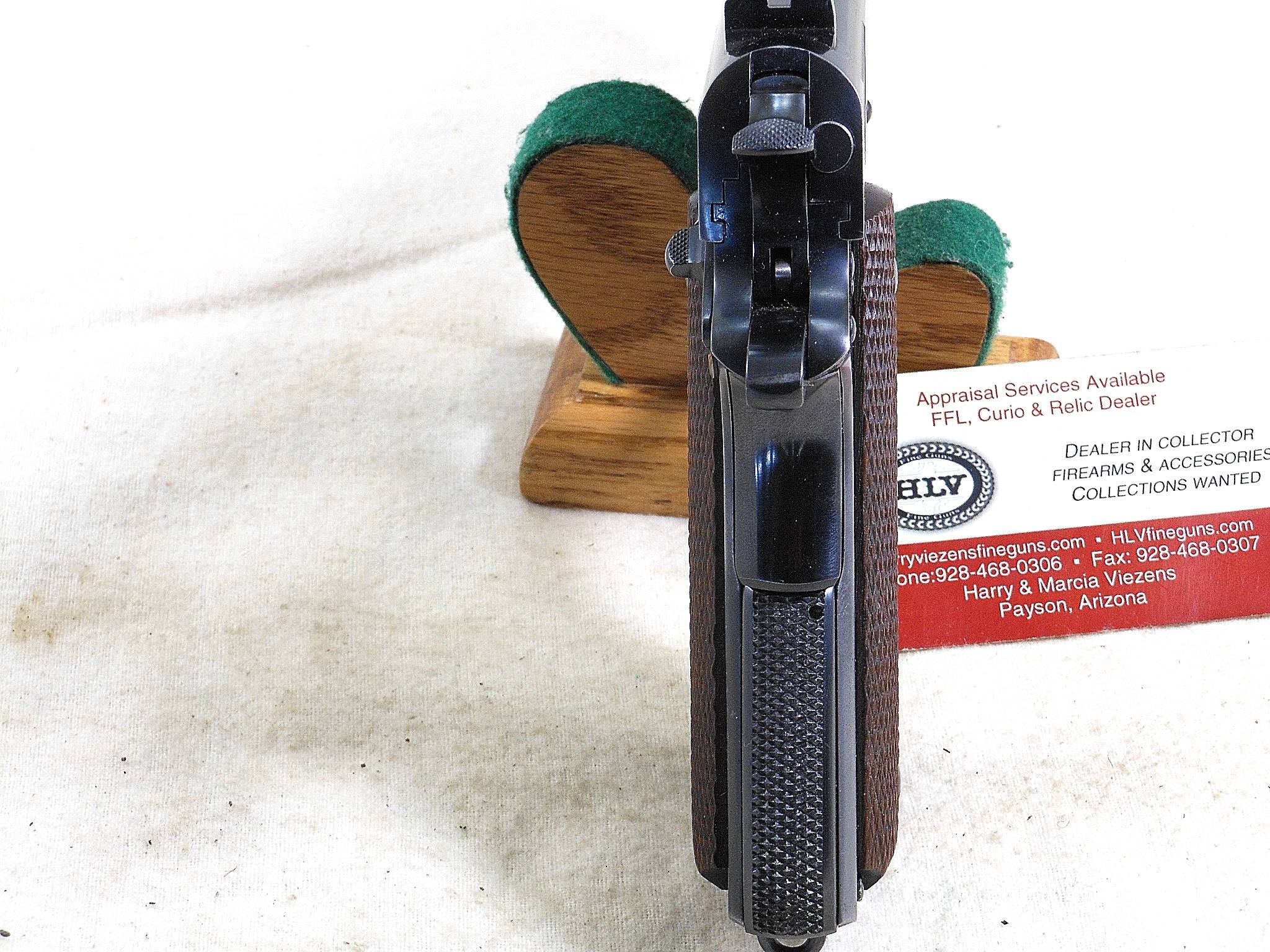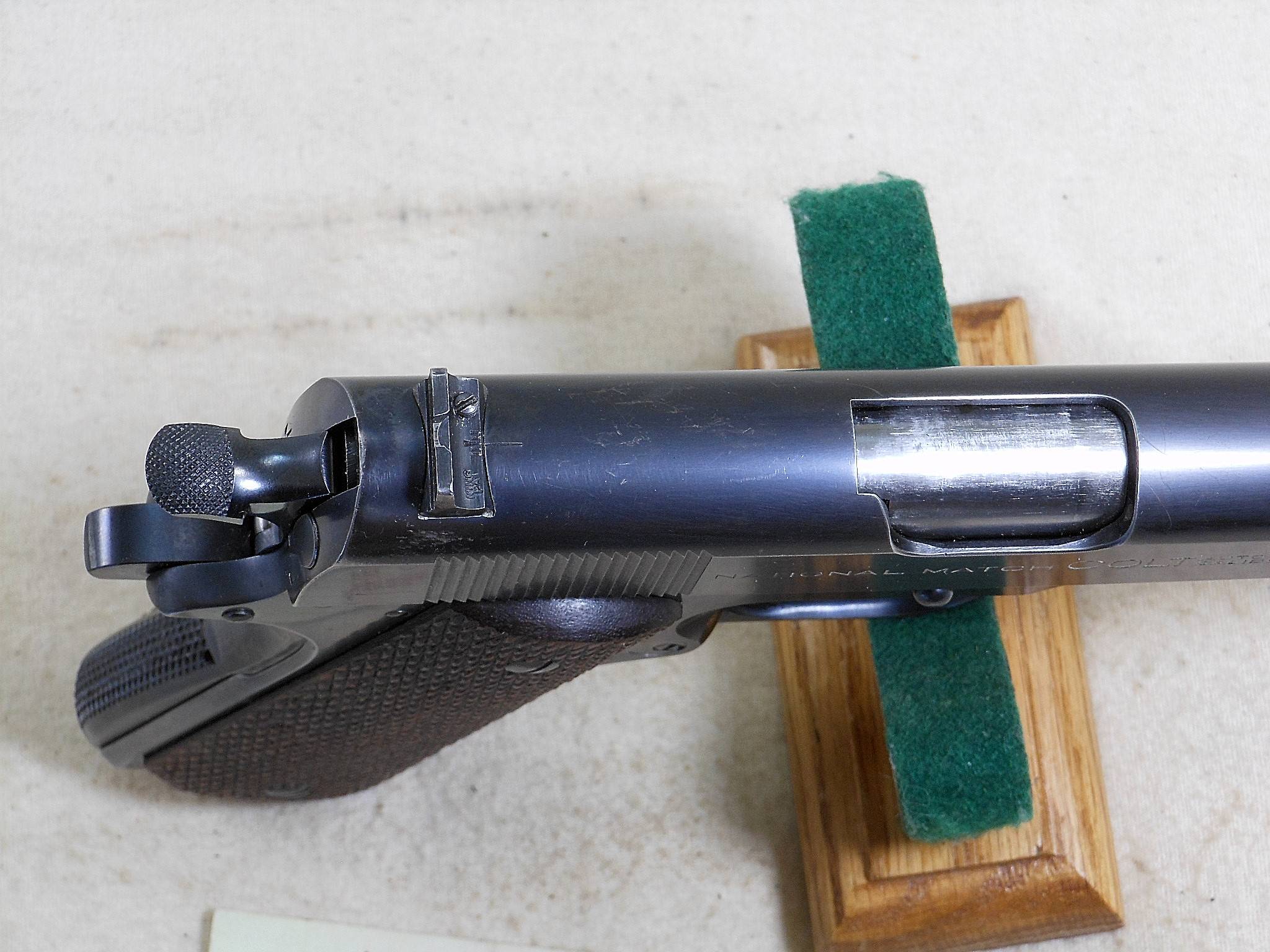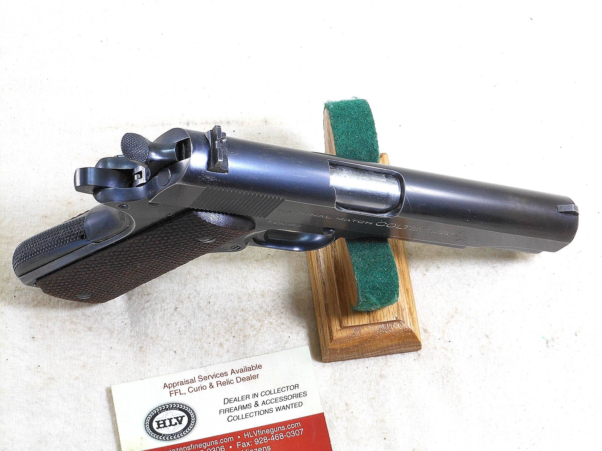 This Colt National Match was produced in 1939. The pistol’s serial number is C 197343. This 45 A.C.P. National Match pistol has the correct MB in a circle stamped on the left side barrel lug. It also has the Colt 45 Auto Match stamped under the left side of the barrel above the barrel lug. The bore is in very fine condition. This pistol is also fitted with the rare Swartz safety device. The Swartz safety is fully functional and works correctly. This Colt also has the correct time period King windage adjustable rear sight. The King Sight was well known and was fitted to many models of the Colt line up as well as being fitted to other makers such as Smith & Wesson. Adjustable rear sight was seldom seen on these National Match pistols. This pistol is one of these pistols that has the adjustable sight. There were about 1475 of these sights fitted to the pre war National Match pistols! The total production of these pre war National Match pistols was 4813 pistols! Of those National Match Pistols less than 1200 of these pistols were fitted with the Swartz safety. This production number of these Swartz Safety pistols was figured out by the well known author of the Colt 1911 and A1’s, Charles Clawson. This makes this Colt quite Rare! This Colt has the matching serial numbered slide. The serial number is stamped inside the firing pin chamber. The original bluing would rate a 85% or better condition. Most of the blue loss is by the grip frame. This magazine is the correct all blued magazine for this pistol with the Colt 45 Auto stamped on the magazine floor plate. The wood grips are original to this Colt. The grips are in fine condition. The checkering is sharp with high points. There is no cracks or other damage to these grips. These early National Match pistols had hand honed actions and carefully fitted parts. The workmanship was of the best Colt had to offer. This is a very fine rare Colt for the discerning collector to acquire for their collection!
