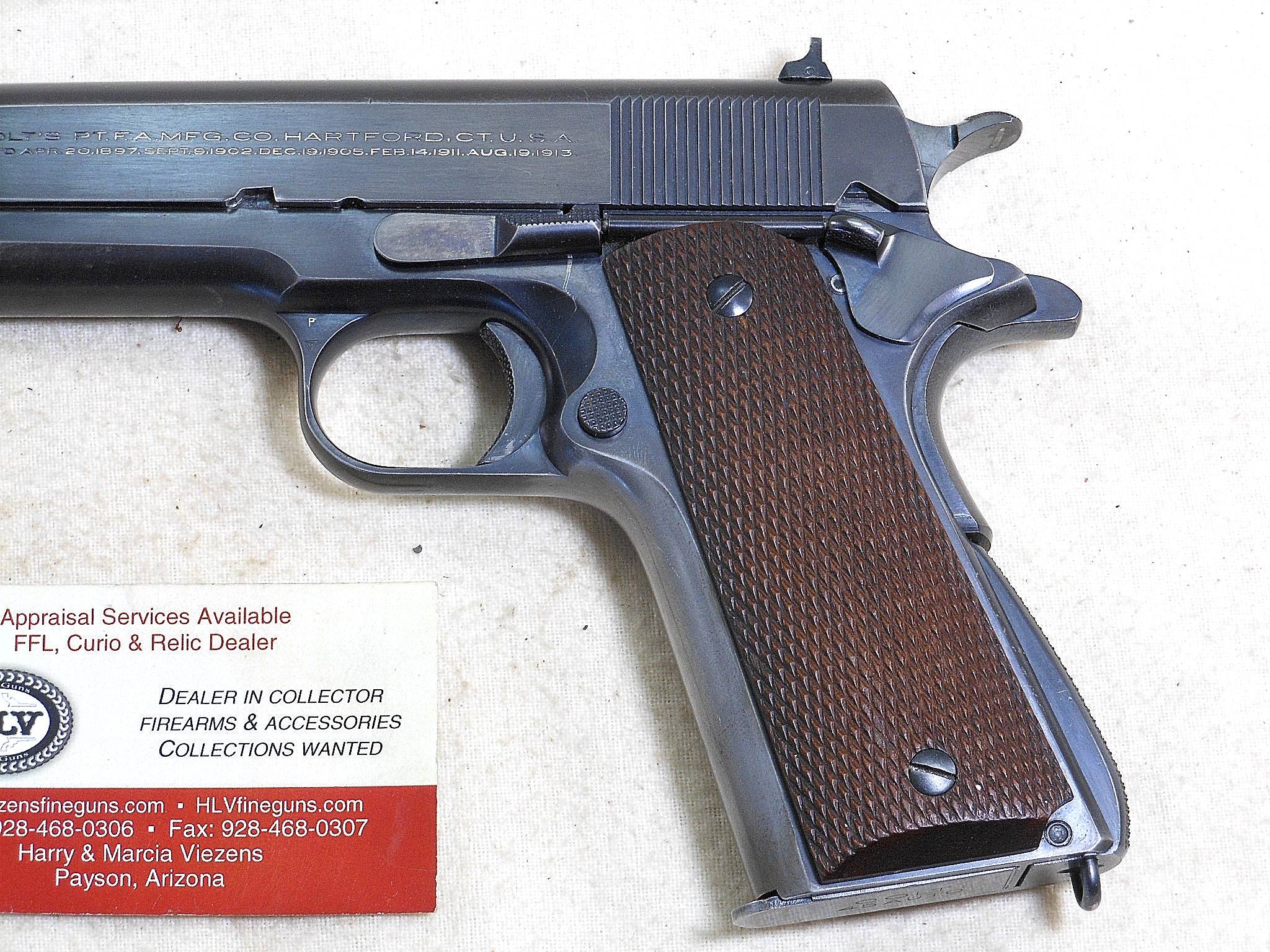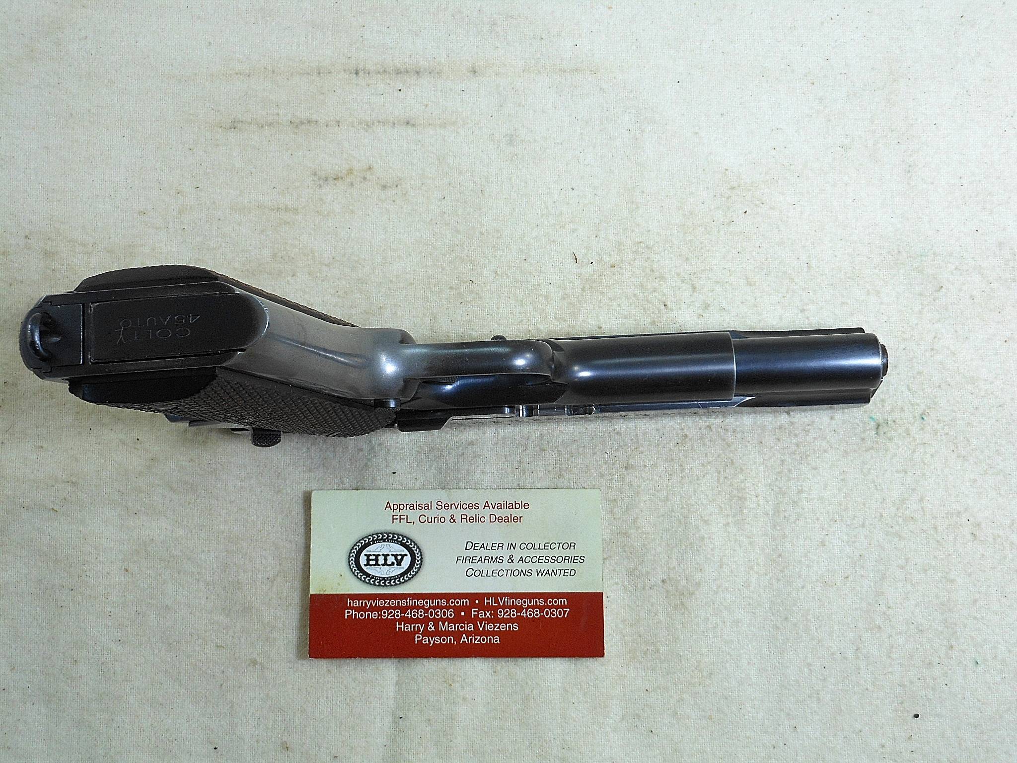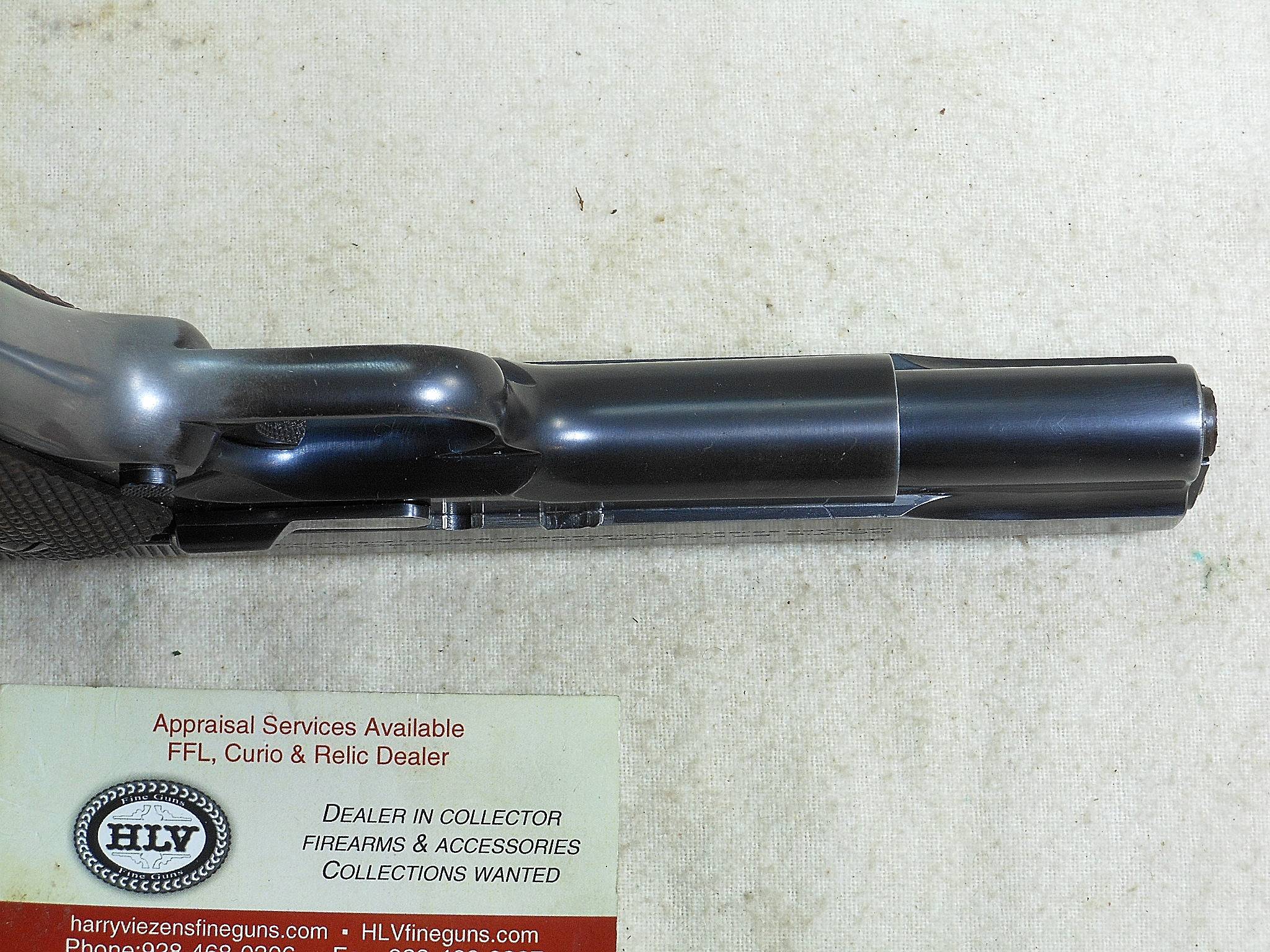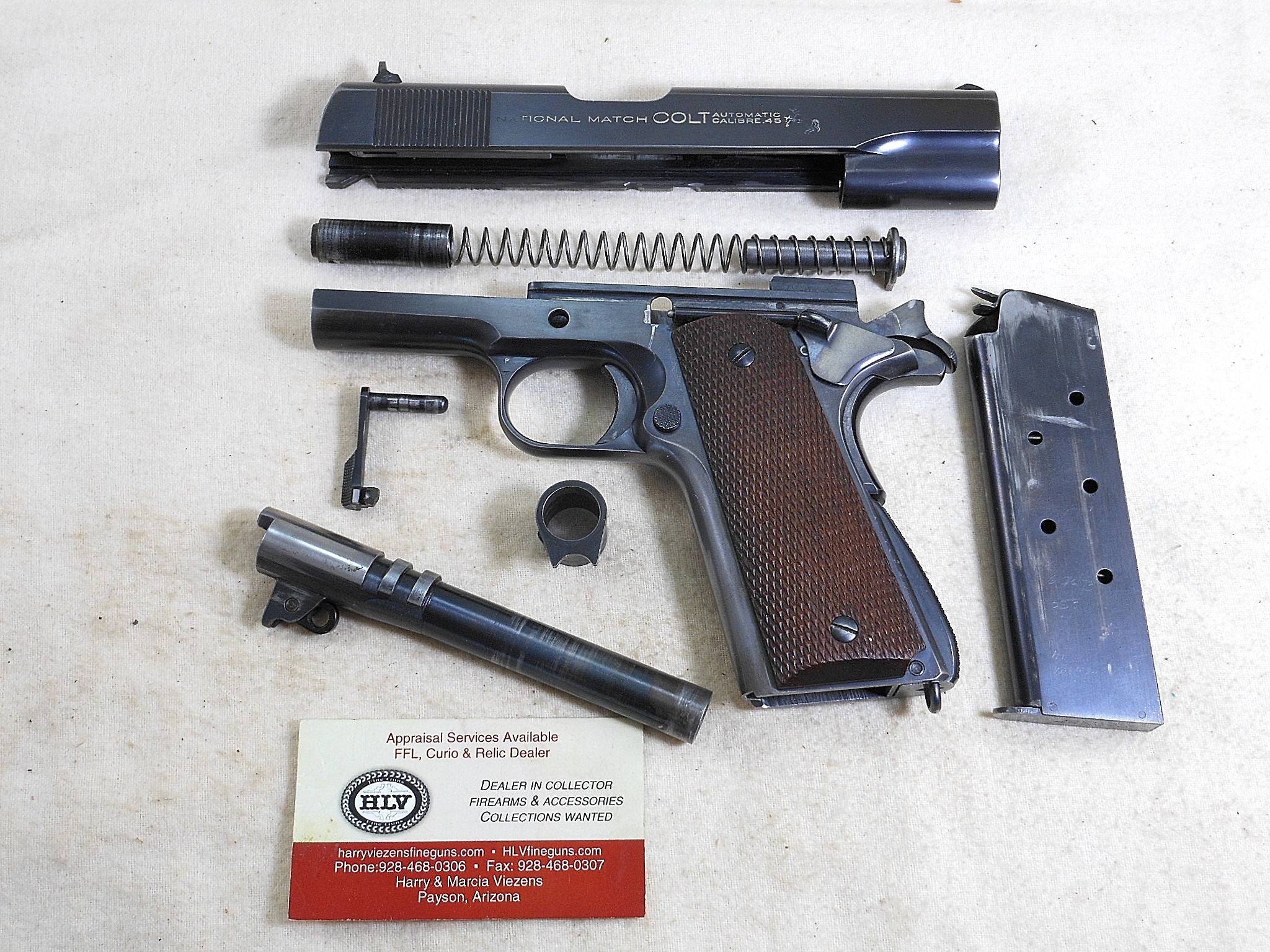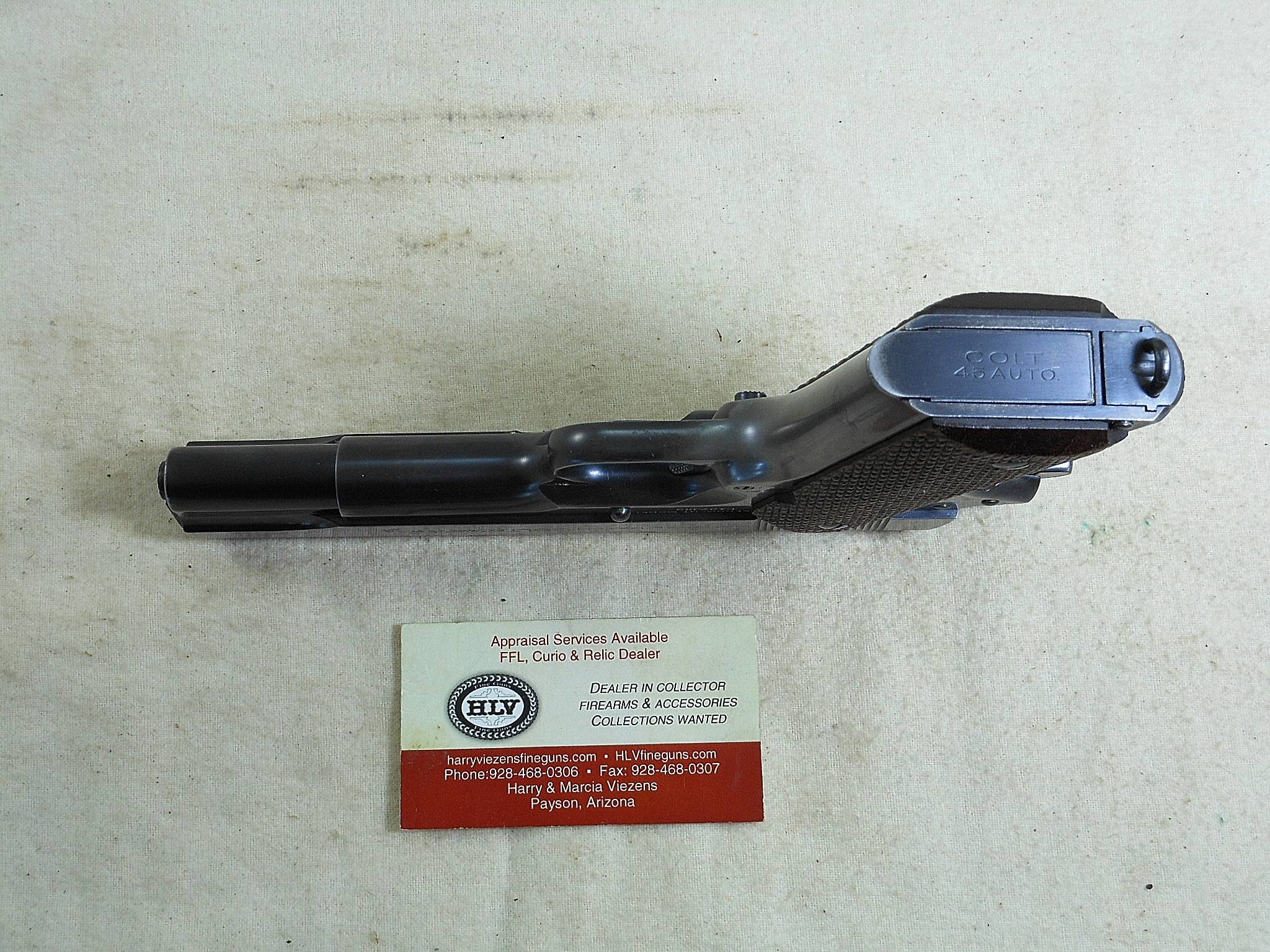 This Colt National Match was produced in 1939. The pistol’s serial number is C 197343. This 45 A.C.P. National Match pistol has the correct MB in a circle stamped on the left side barrel lug. It also has the Colt 45 Auto Match stamped under the left side of the barrel above the barrel lug. The bore is in very fine condition. This pistol is also fitted with the rare Swartz safety device. The Swartz safety is fully functional and works correctly. This Colt also has the correct time period King windage adjustable rear sight. The King Sight was well known and was fitted to many models of the Colt line up as well as being fitted to other makers such as Smith & Wesson. Adjustable rear sight was seldom seen on these National Match pistols. This pistol is one of these pistols that has the adjustable sight. There were about 1475 of these sights fitted to the pre war National Match pistols! The total production of these pre war National Match pistols was 4813 pistols! Of those National Match Pistols less than 1200 of these pistols were fitted with the Swartz safety. This production number of these Swartz Safety pistols was figured out by the well known author of the Colt 1911 and A1’s, Charles Clawson. This makes this Colt quite Rare! This Colt has the matching serial numbered slide. The serial number is stamped inside the firing pin chamber. The original bluing would rate a 85% or better condition. Most of the blue loss is by the grip frame. This magazine is the correct all blued magazine for this pistol with the Colt 45 Auto stamped on the magazine floor plate. The wood grips are original to this Colt. The grips are in fine condition. The checkering is sharp with high points. There is no cracks or other damage to these grips. These early National Match pistols had hand honed actions and carefully fitted parts. The workmanship was of the best Colt had to offer. This is a very fine rare Colt for the discerning collector to acquire for their collection!