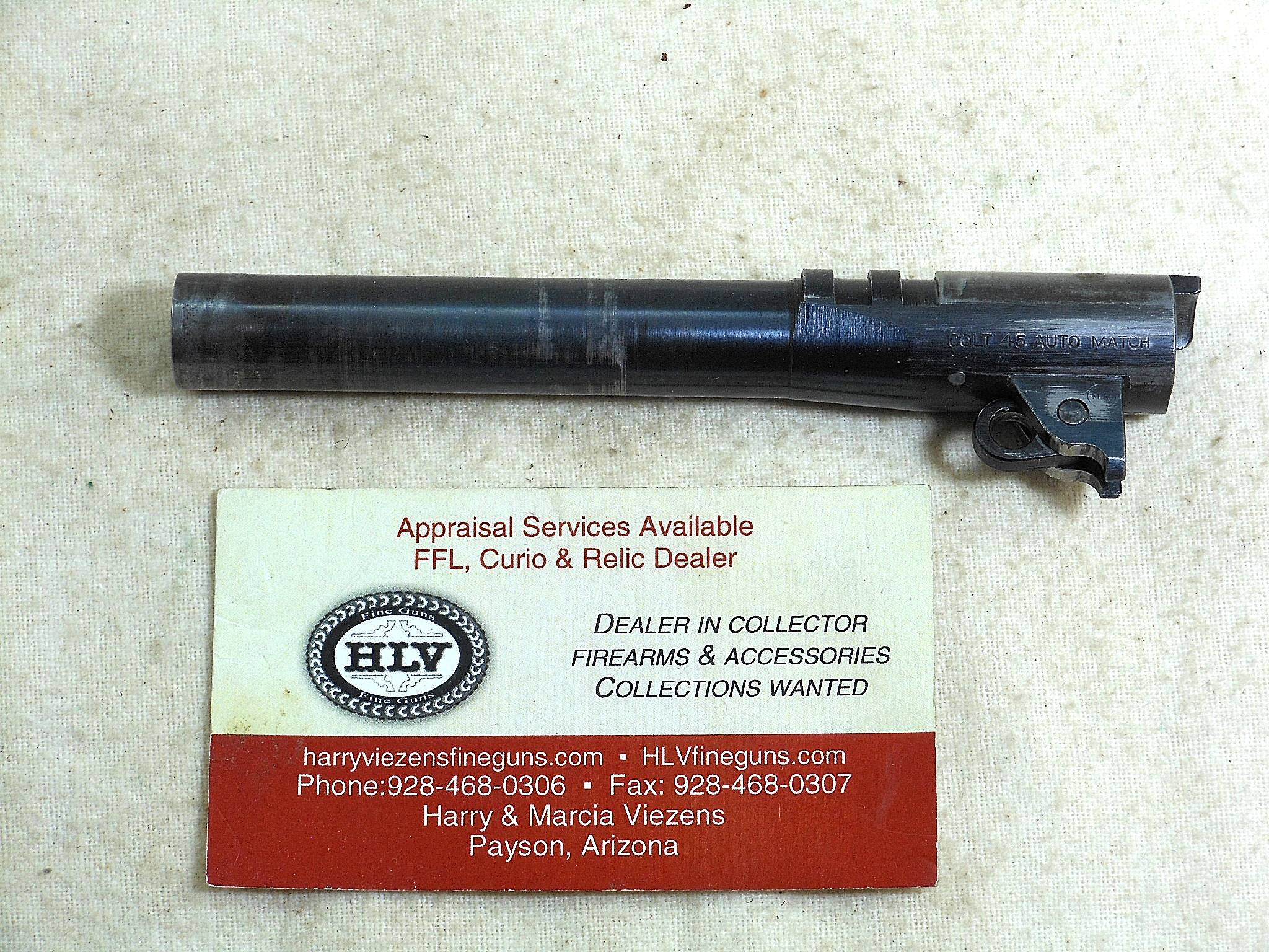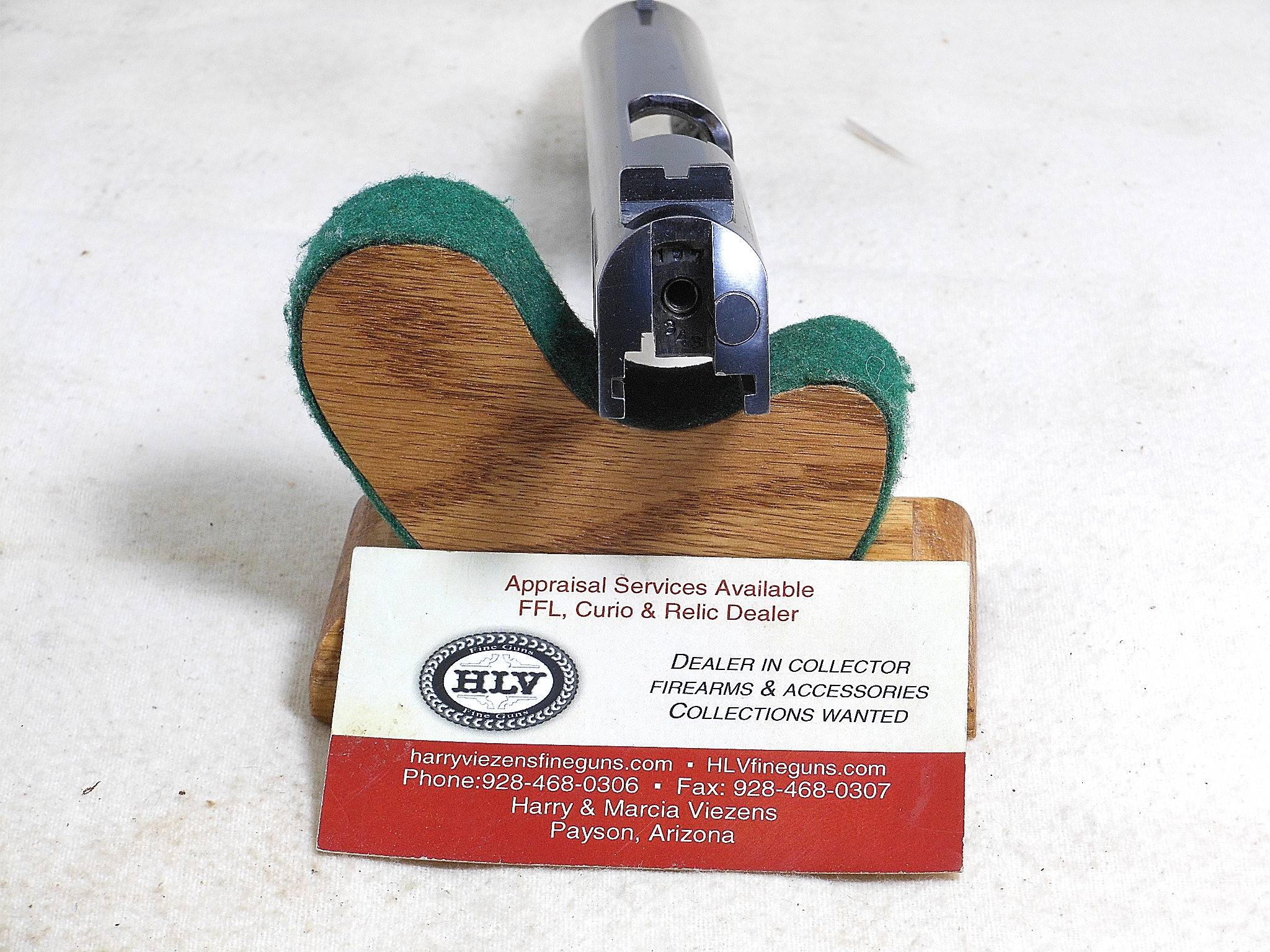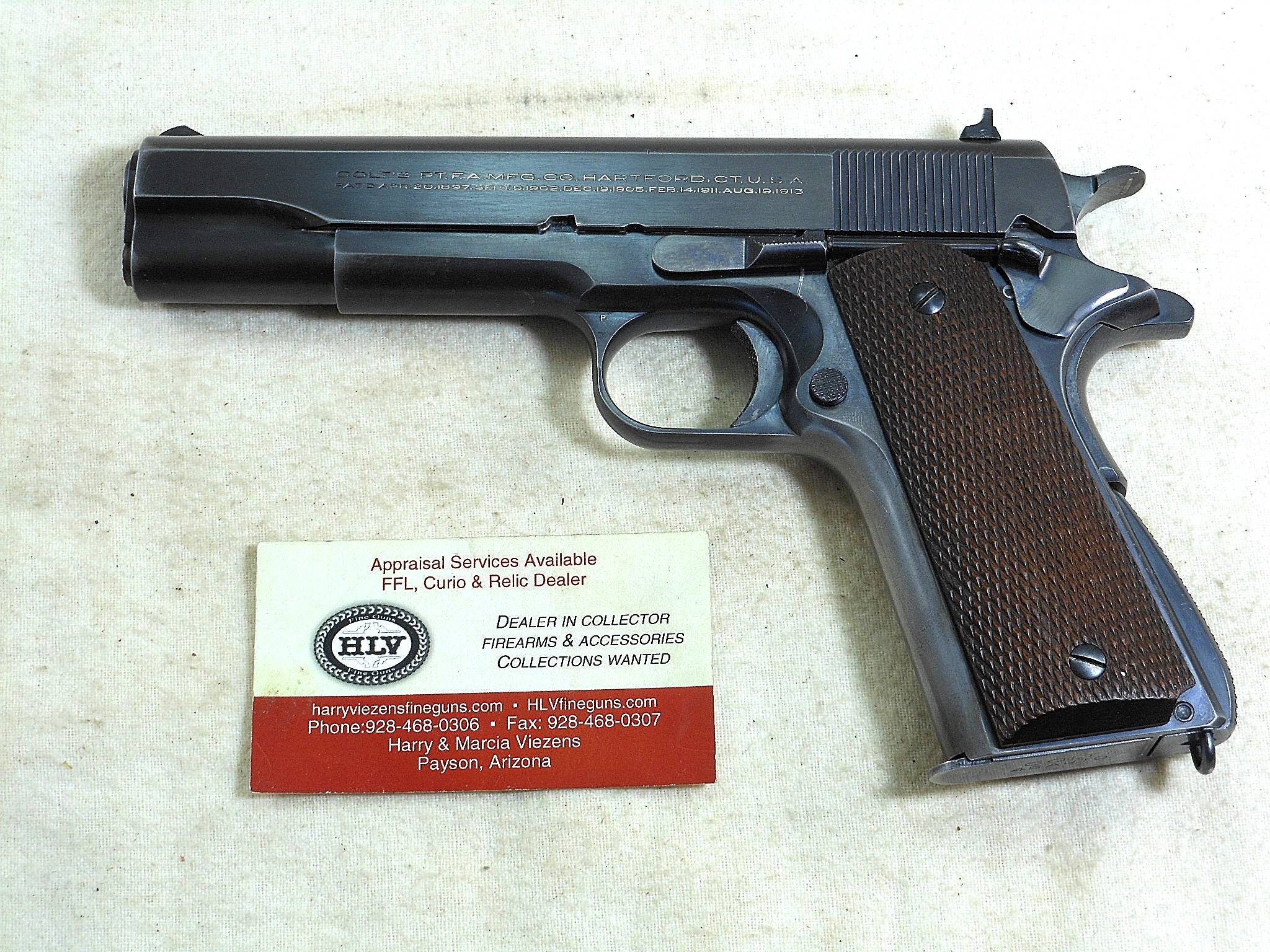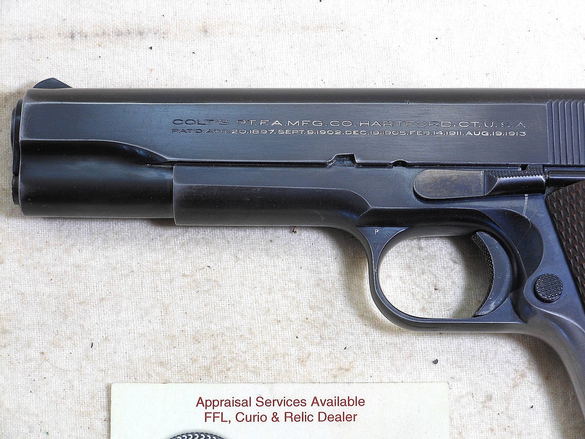This Colt National Match was produced in 1939. The pistol’s serial number is C 197343. This 45 A.C.P. National Match pistol has the correct MB in a circle stamped on the left side barrel lug. It also has the Colt 45 Auto Match stamped under the left side of the barrel above the barrel lug. The bore is in very fine condition. This pistol is also fitted with the rare Swartz safety device. The Swartz safety is fully functional and works correctly. This Colt also has the correct time period King windage adjustable rear sight. The King Sight was well known and was fitted to many models of the Colt line up as well as being fitted to other makers such as Smith & Wesson. Adjustable rear sight was seldom seen on these National Match pistols. This pistol is one of these pistols that has the adjustable sight. There were about 1475 of these sights fitted to the pre war National Match pistols! The total production of these pre war National Match pistols was 4813 pistols! Of those National Match Pistols less than 1200 of these pistols were fitted with the Swartz safety. This production number of these Swartz Safety pistols was figured out by the well known author of the Colt 1911 and A1’s, Charles Clawson. This makes this Colt quite Rare! This Colt has the matching serial numbered slide. The serial number is stamped inside the firing pin chamber. The original bluing would rate a 85% or better condition. Most of the blue loss is by the grip frame. This magazine is the correct all blued magazine for this pistol with the Colt 45 Auto stamped on the magazine floor plate. The wood grips are original to this Colt. The grips are in fine condition. The checkering is sharp with high points. There is no cracks or other damage to these grips. These early National Match pistols had hand honed actions and carefully fitted parts. The workmanship was of the best Colt had to offer. This is a very fine rare Colt for the discerning collector to acquire for their collection!