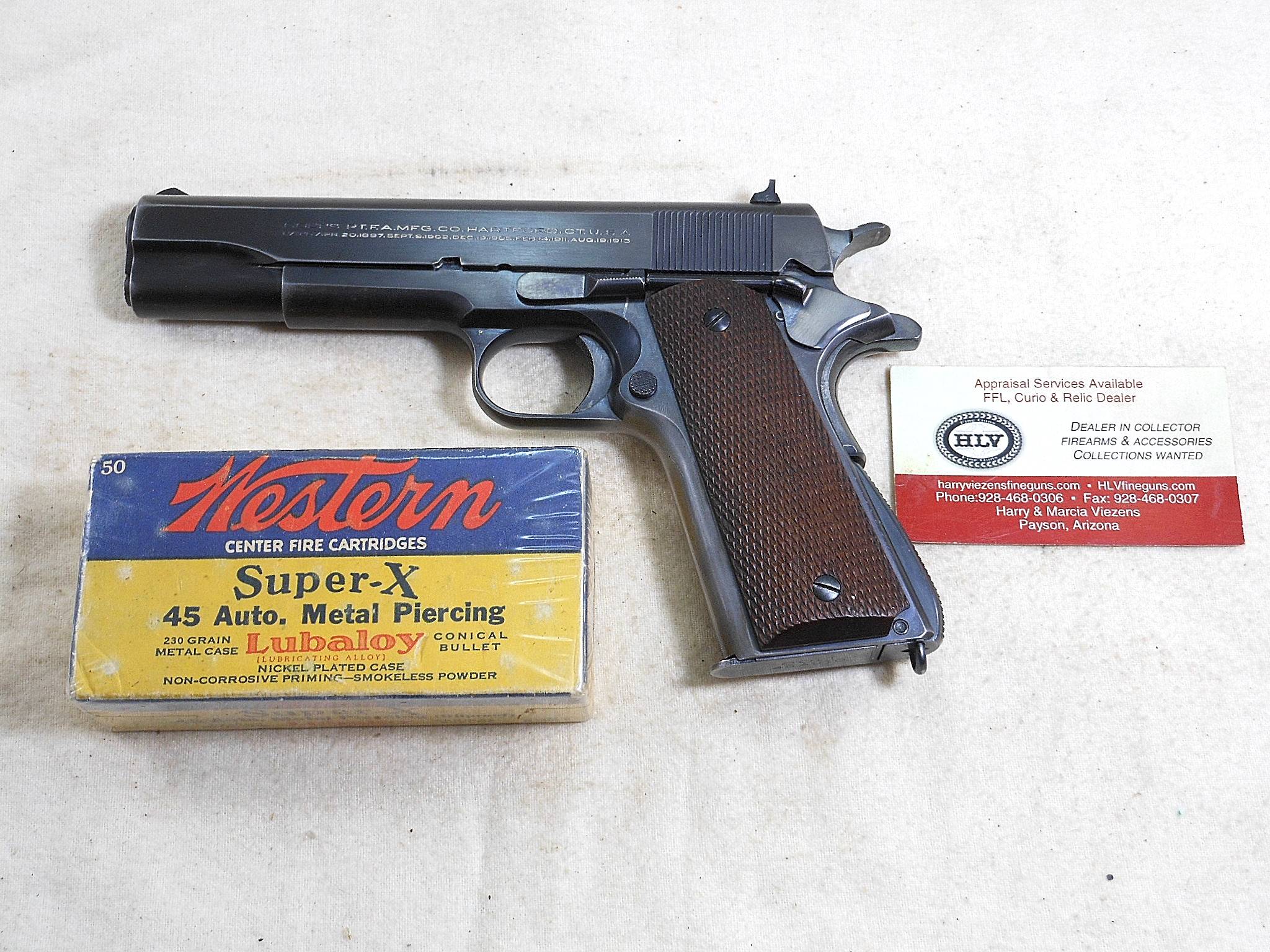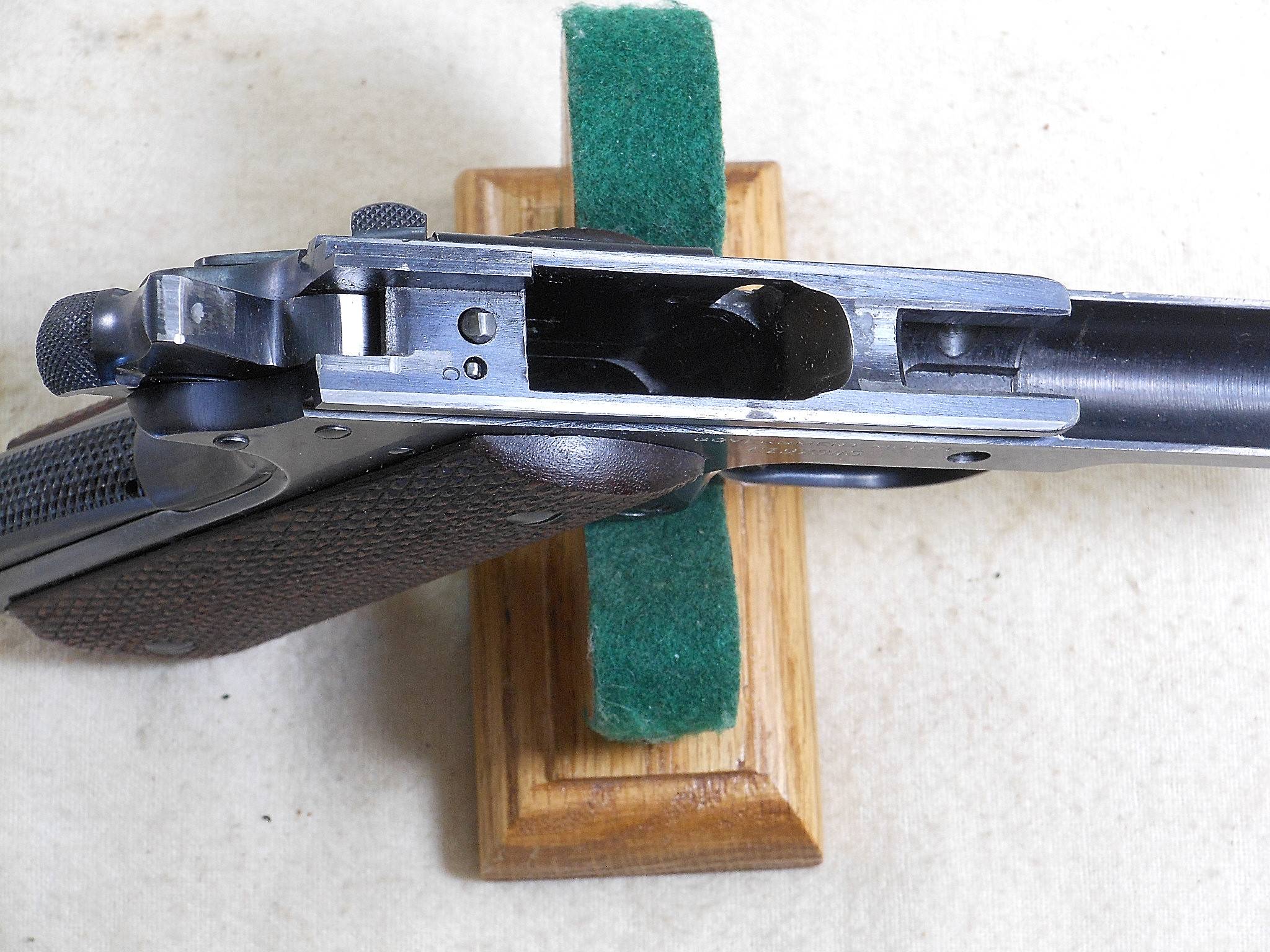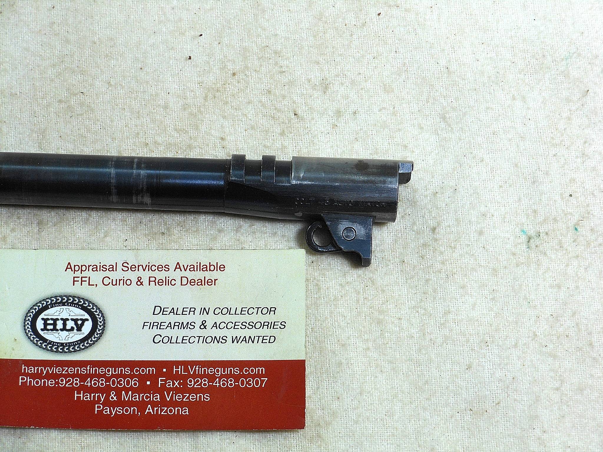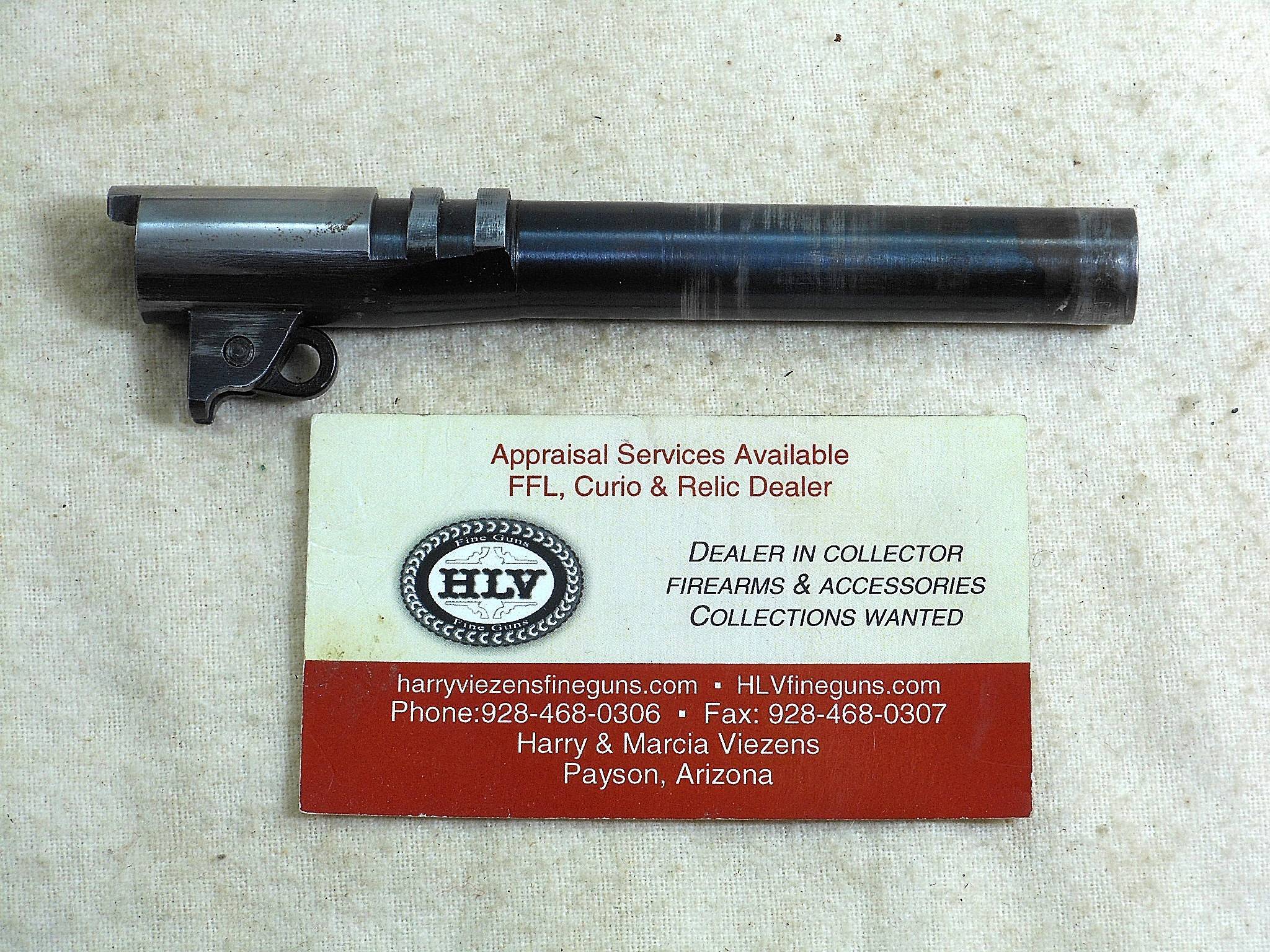 This Colt National Match was produced in 1939. The pistol’s serial number is C 197343. This 45 A.C.P. National Match pistol has the correct MB in a circle stamped on the left side barrel lug. It also has the Colt 45 Auto Match stamped under the left side of the barrel above the barrel lug. The bore is in very fine condition. This pistol is also fitted with the rare Swartz safety device. The Swartz safety is fully functional and works correctly. This Colt also has the correct time period King windage adjustable rear sight. The King Sight was well known and was fitted to many models of the Colt line up as well as being fitted to other makers such as Smith & Wesson. Adjustable rear sight was seldom seen on these National Match pistols. This pistol is one of these pistols that has the adjustable sight. There were about 1475 of these sights fitted to the pre war National Match pistols! The total production of these pre war National Match pistols was 4813 pistols! Of those National Match Pistols less than 1200 of these pistols were fitted with the Swartz safety. This production number of these Swartz Safety pistols was figured out by the well known author of the Colt 1911 and A1’s, Charles Clawson. This makes this Colt quite Rare! This Colt has the matching serial numbered slide. The serial number is stamped inside the firing pin chamber. The original bluing would rate a 85% or better condition. Most of the blue loss is by the grip frame. This magazine is the correct all blued magazine for this pistol with the Colt 45 Auto stamped on the magazine floor plate. The wood grips are original to this Colt. The grips are in fine condition. The checkering is sharp with high points. There is no cracks or other damage to these grips. These early National Match pistols had hand honed actions and carefully fitted parts. The workmanship was of the best Colt had to offer. This is a very fine rare Colt for the discerning collector to acquire for their collection!