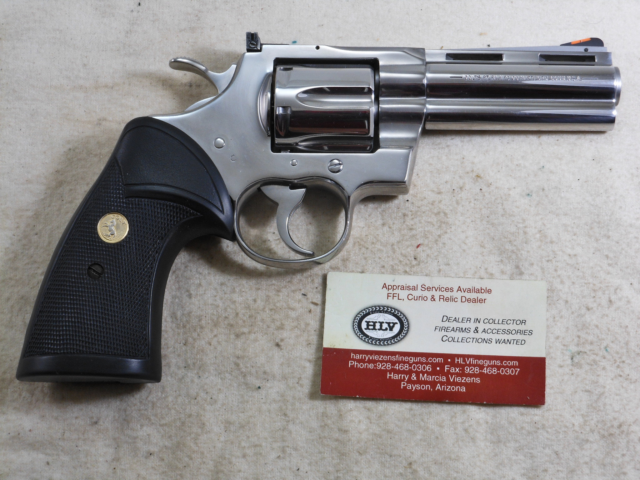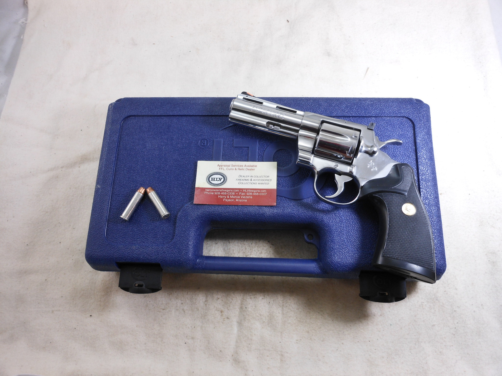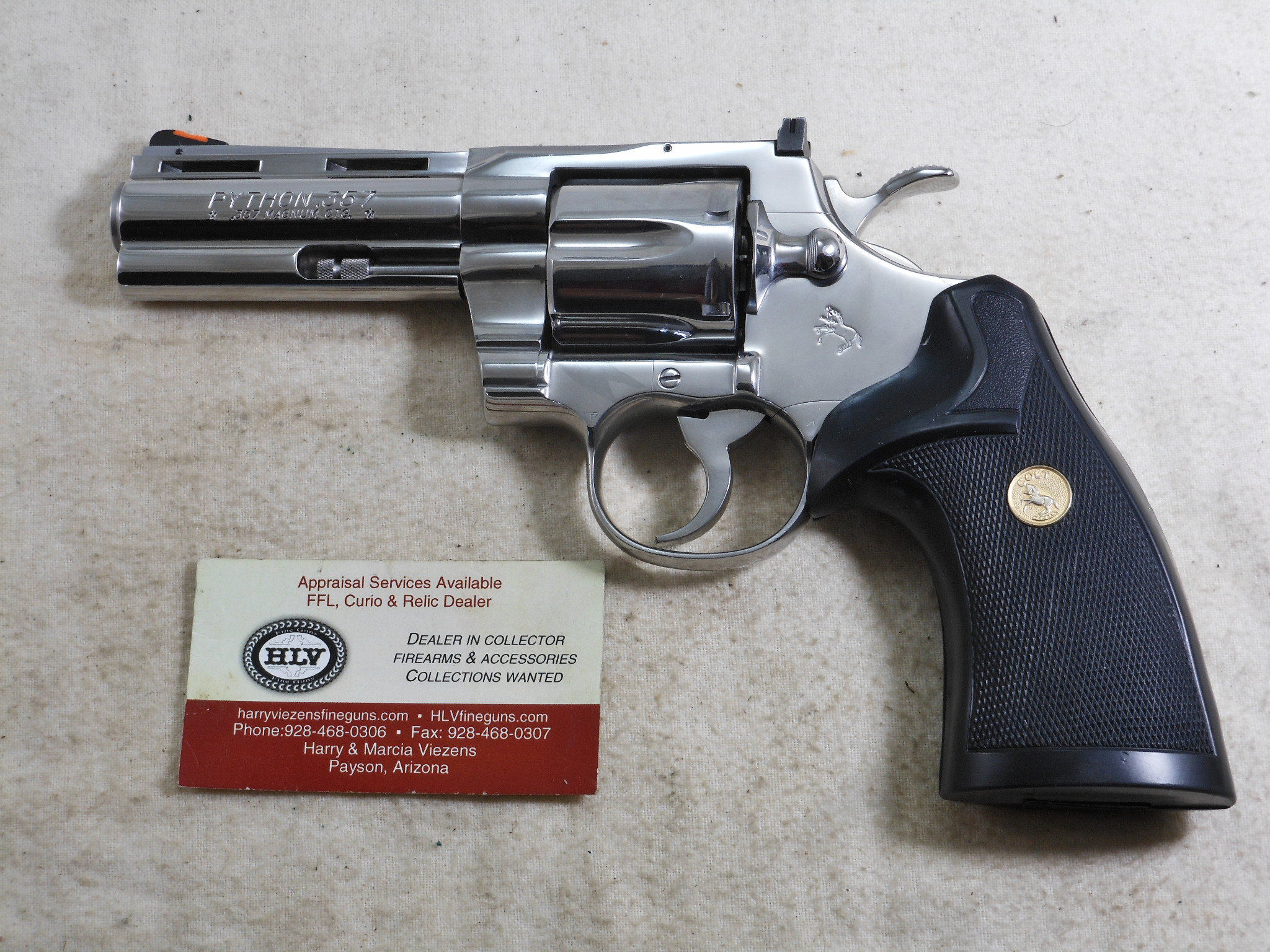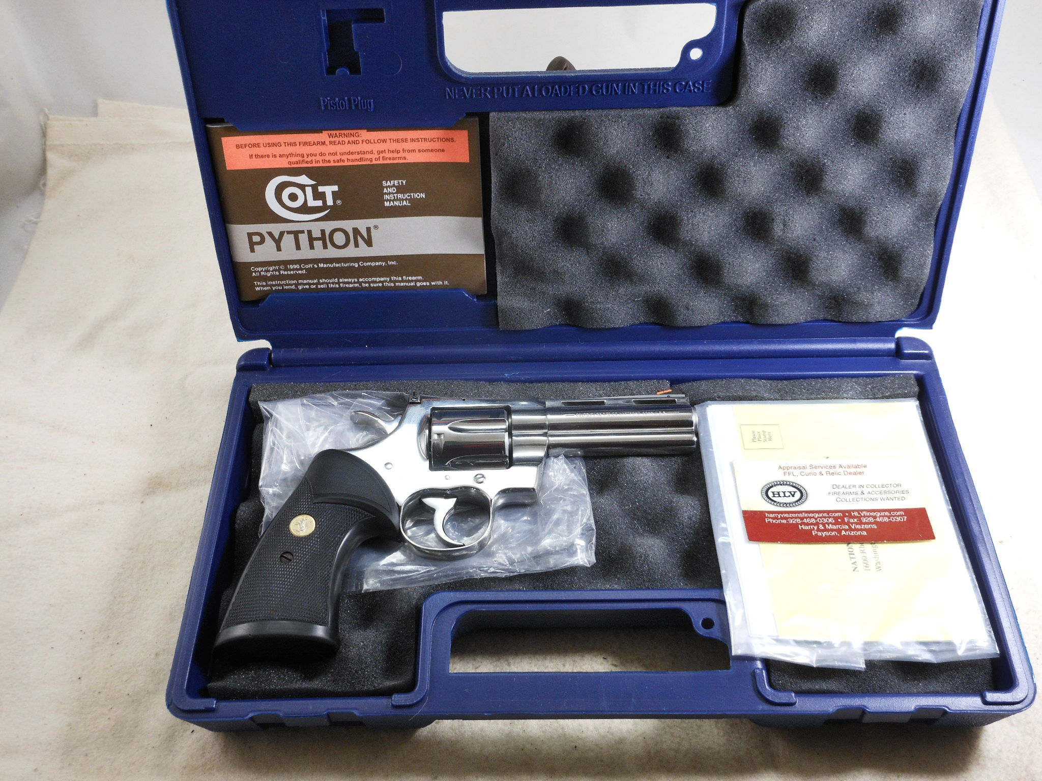 This Colt Python is new in it’s box. The pistol’s serial number is PN 08910. This pistol has the 4 inch barrel chambered to shoot the 357 Magnum cartridge. The high polish finish is in new condition. There is no sign that this Colt has been fired or handled. The black rubber grips have the Colt medallions installed on each side of the grips. The sights are original to this pistol. The box has the Colt instruction pamphlet and other papers in this box. This is a very stunning pistol! This Colt is ready to join a collection or go to the range!