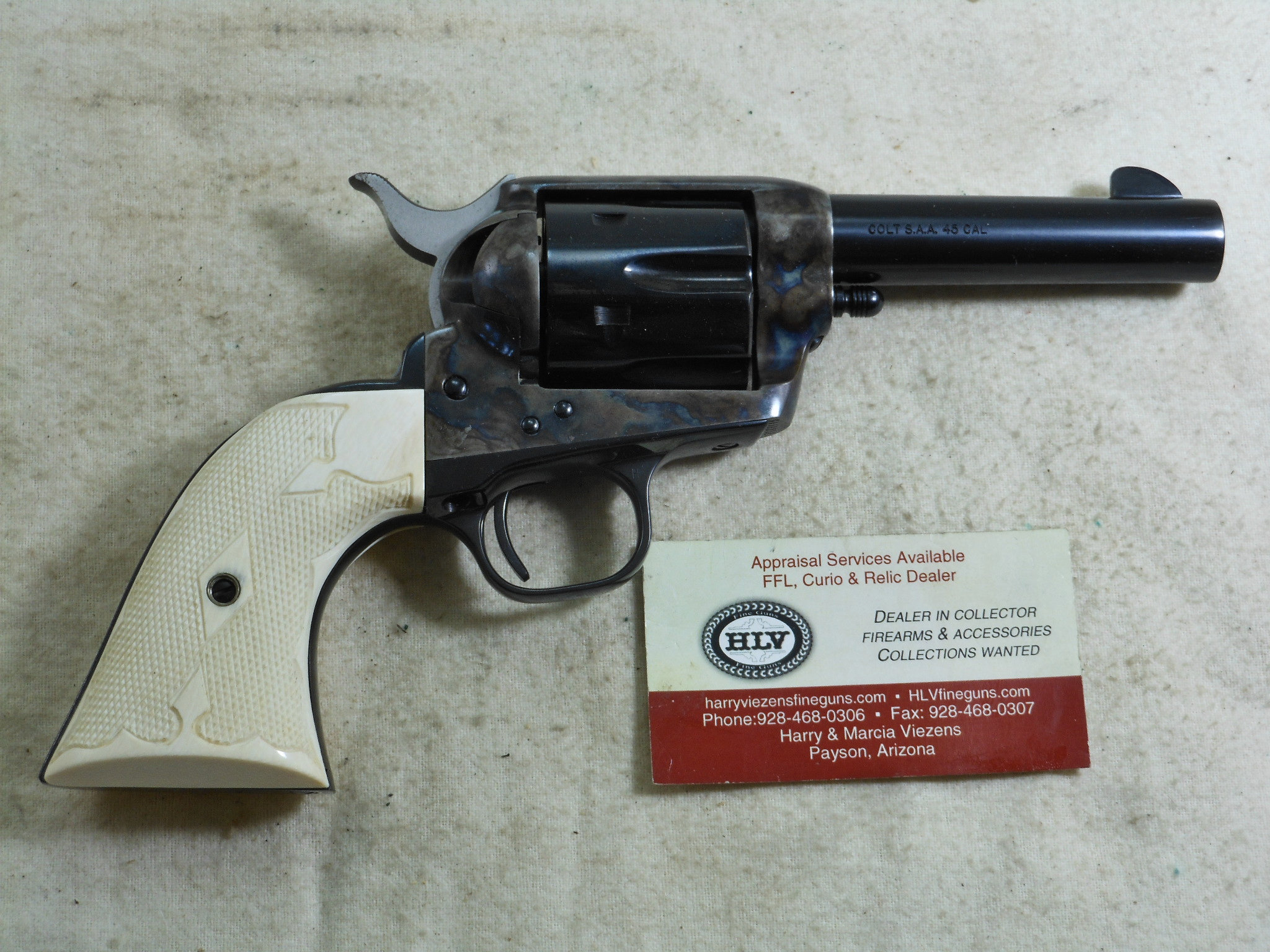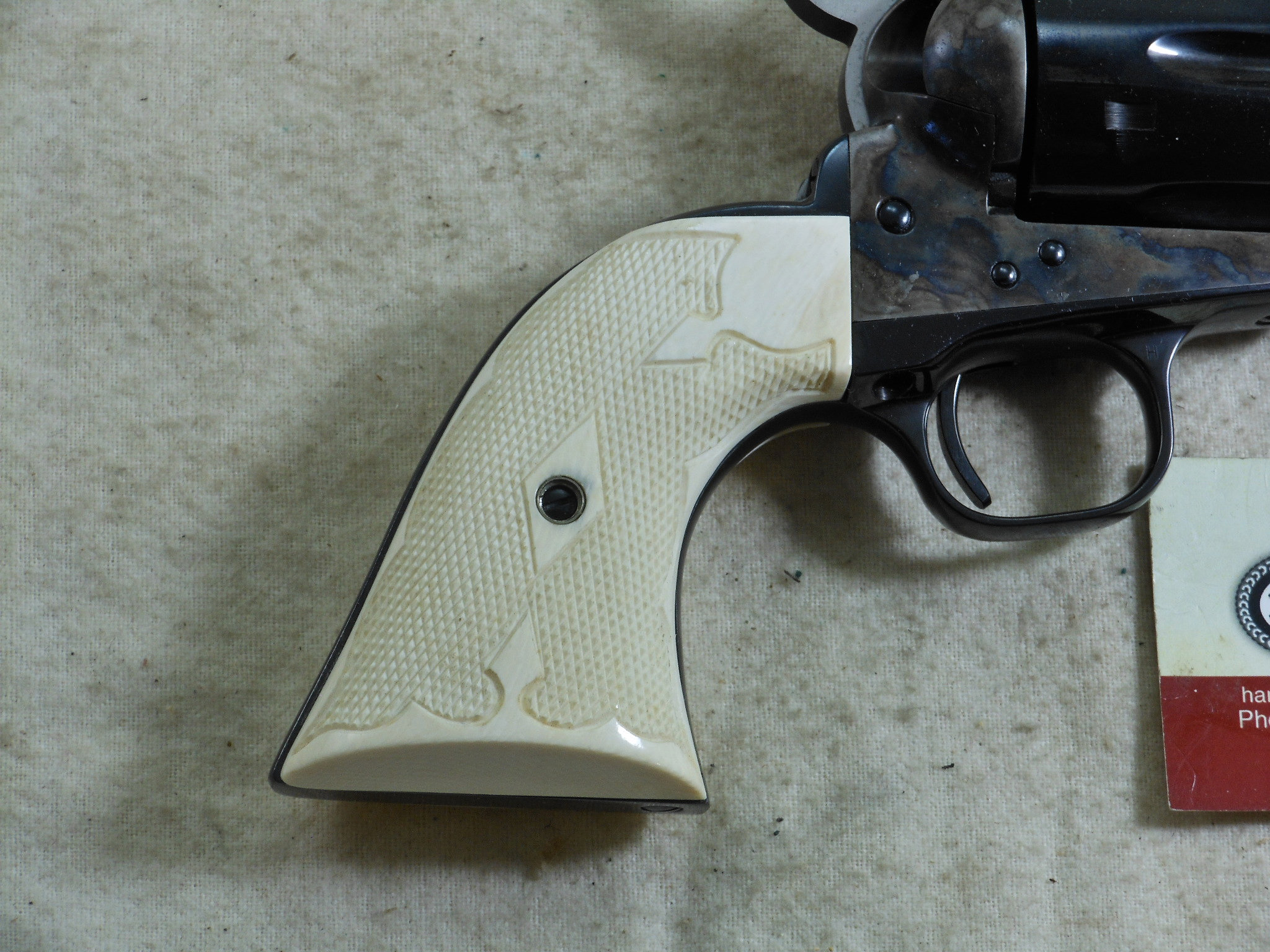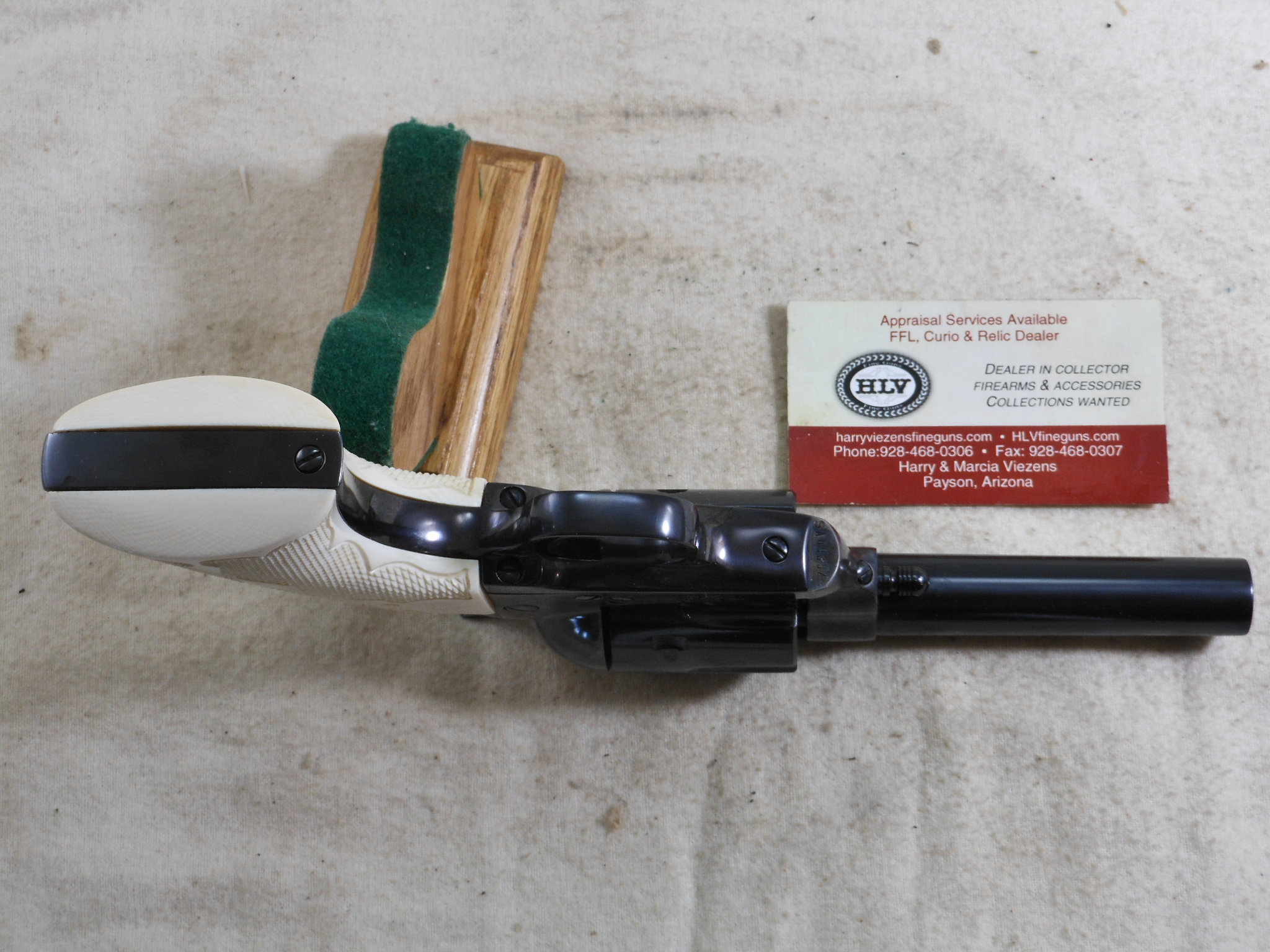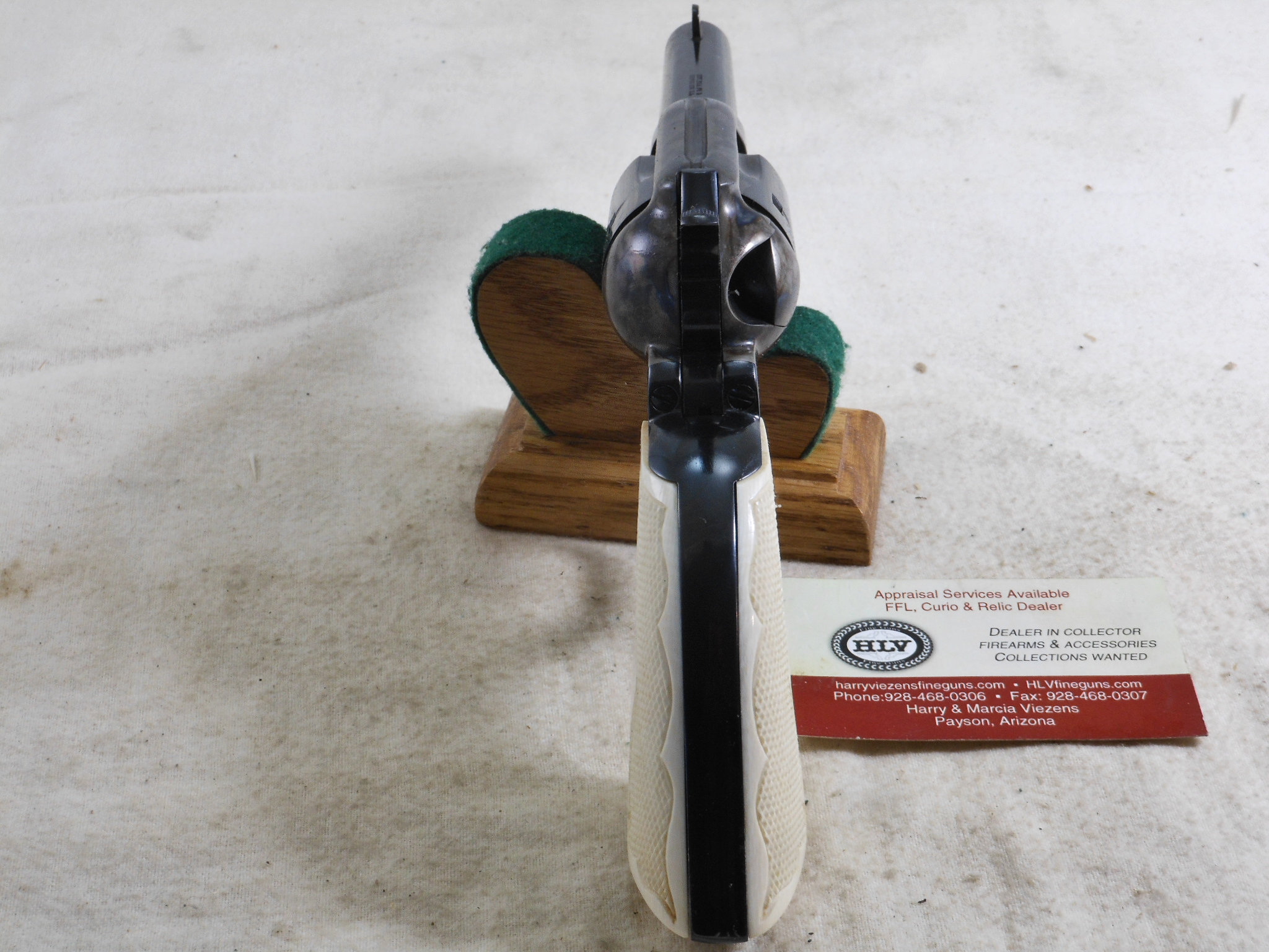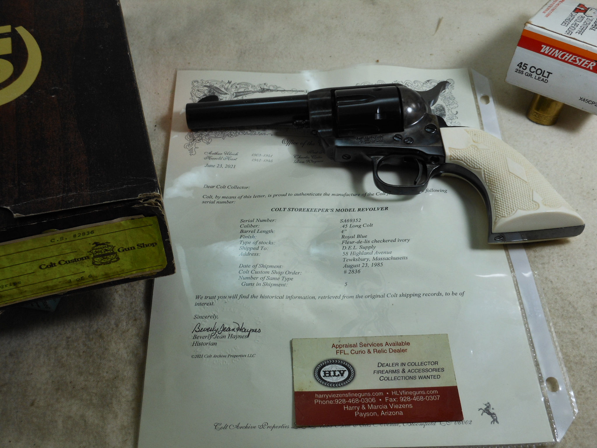 This Colt was produced in 1985. The pistol’s serial number is SA69352. The factory Letter confirms the special Ivory grips and special barrel length. This Colt is chambered for the 45 Colt cartridge. This pistol is in new condition with it’s original box and papers. The barrel is a special order 4 inch barrel without the ejector housing. The frame is the black powder frame without the cross bolt for the cylinder base pin. The ivory grips are checkered in the Fleur De Lis pattern. These ivory grips are stunning with this checkering pattern! The color cased frame is really stunning! There is no sign of being cocked or being played with. The original box has the custom shop label on the end tab. The box jacket is in good condition with no separated end tabs. All of the papers and booklet are present with this box. This is a really special Colt from the Custom Shop! This is the kind of pistol that will always be in high demand for collectors! The special barrel and grips as well as being on the black powder frame really add to the rarity of this fine Colt!