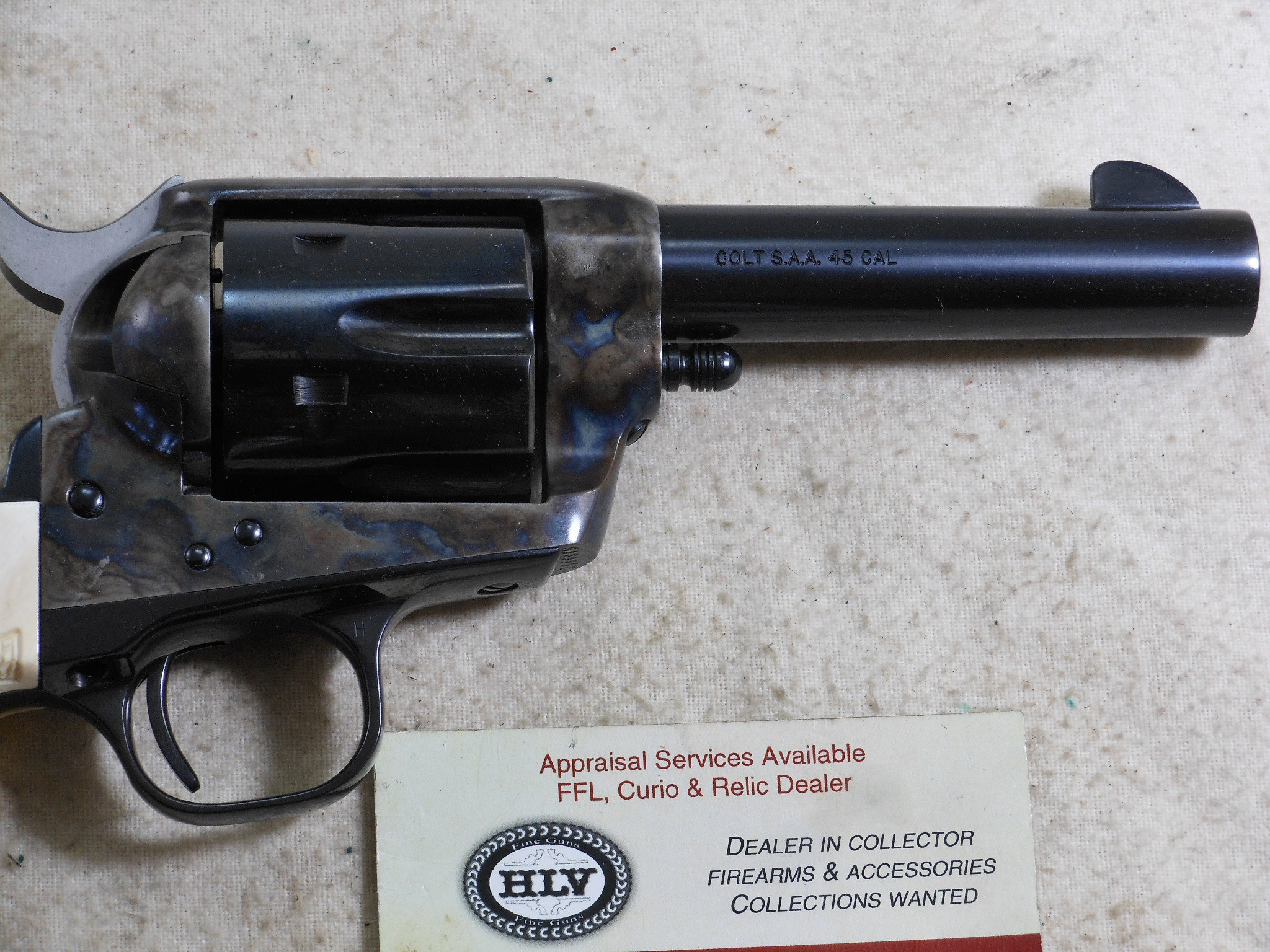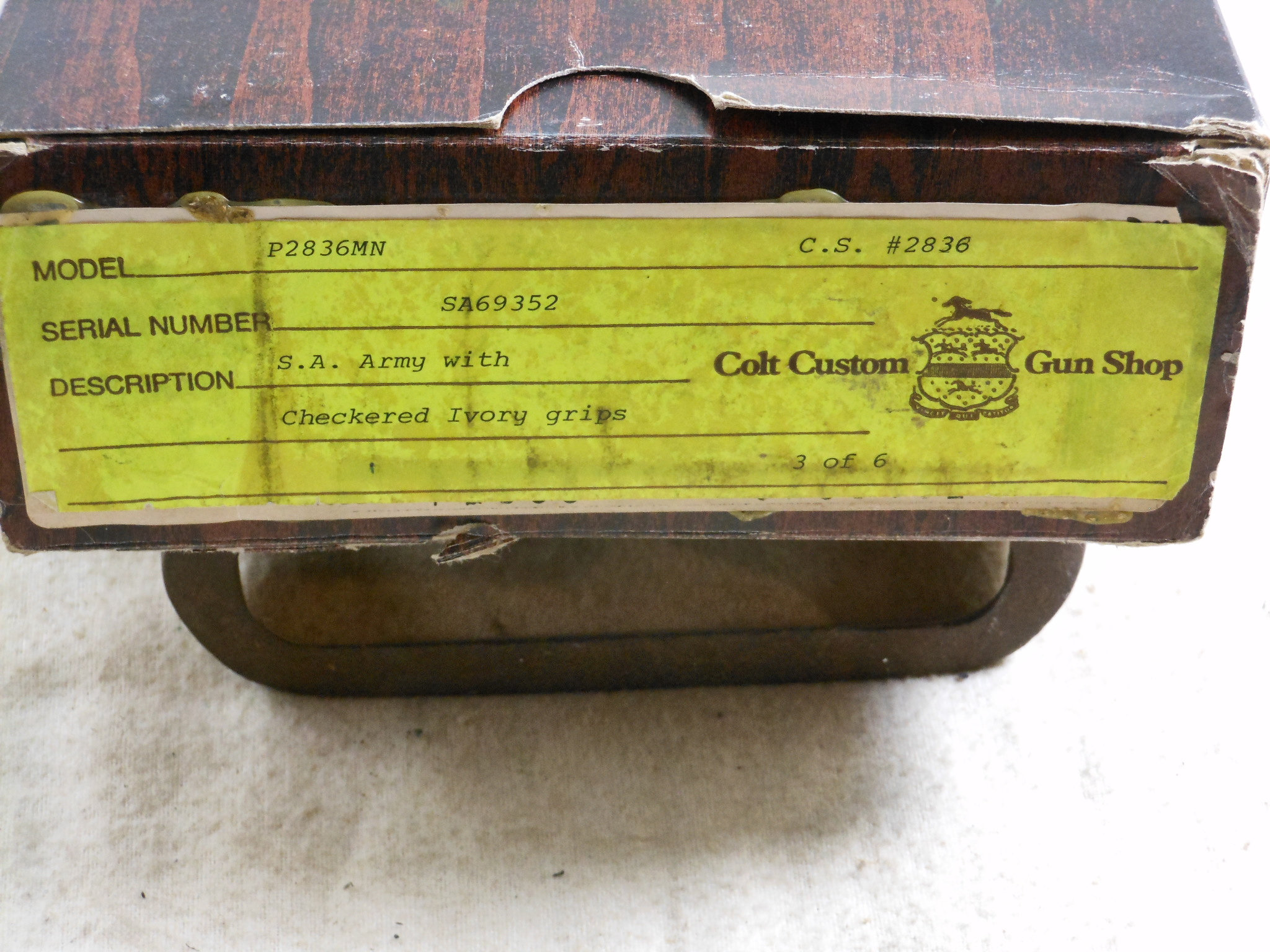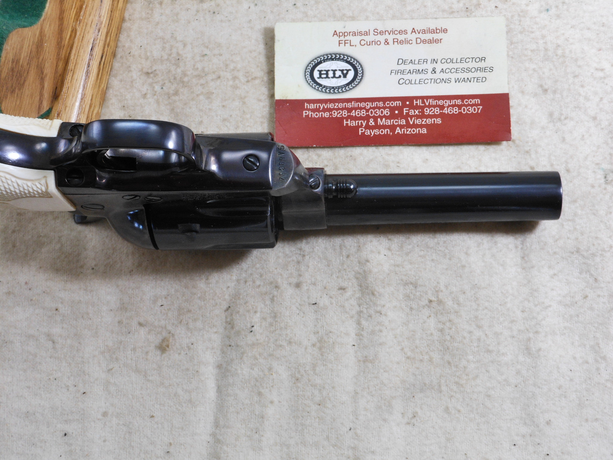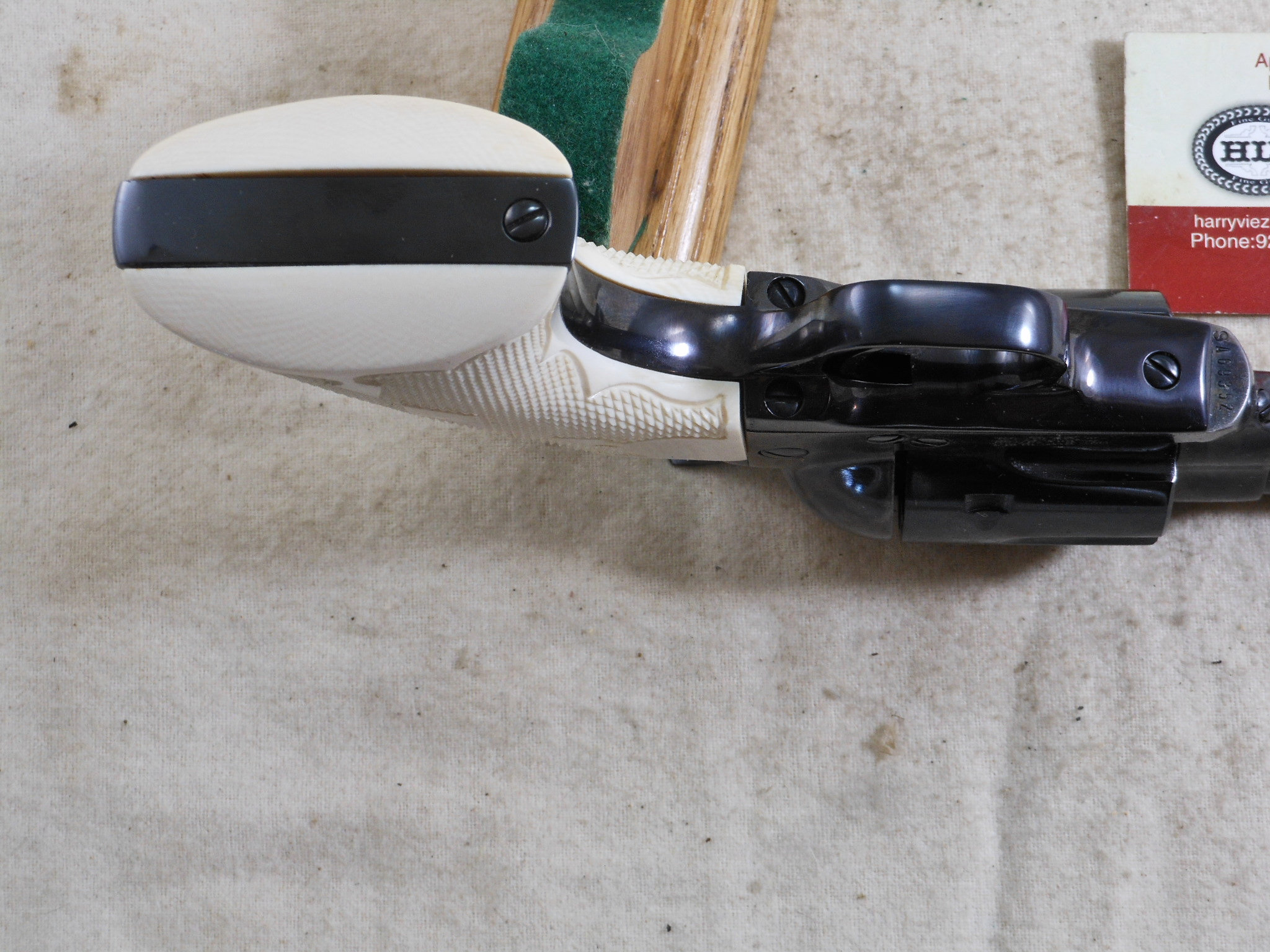 This Colt was produced in 1985. The pistol’s serial number is SA69352. The factory Letter confirms the special Ivory grips and special barrel length. This Colt is chambered for the 45 Colt cartridge. This pistol is in new condition with it’s original box and papers. The barrel is a special order 4 inch barrel without the ejector housing. The frame is the black powder frame without the cross bolt for the cylinder base pin. The ivory grips are checkered in the Fleur De Lis pattern. These ivory grips are stunning with this checkering pattern! The color cased frame is really stunning! There is no sign of being cocked or being played with. The original box has the custom shop label on the end tab. The box jacket is in good condition with no separated end tabs. All of the papers and booklet are present with this box. This is a really special Colt from the Custom Shop! This is the kind of pistol that will always be in high demand for collectors! The special barrel and grips as well as being on the black powder frame really add to the rarity of this fine Colt!