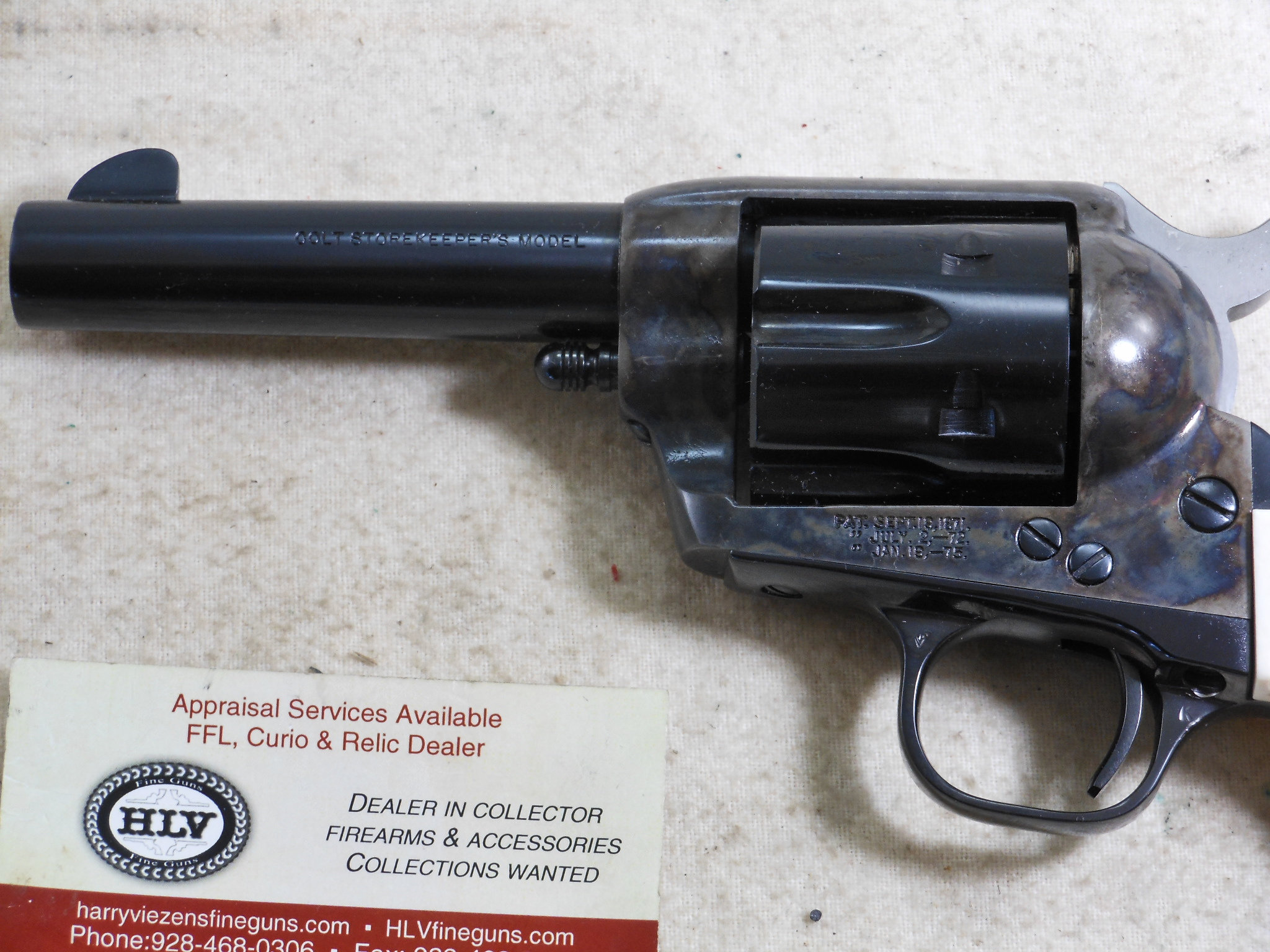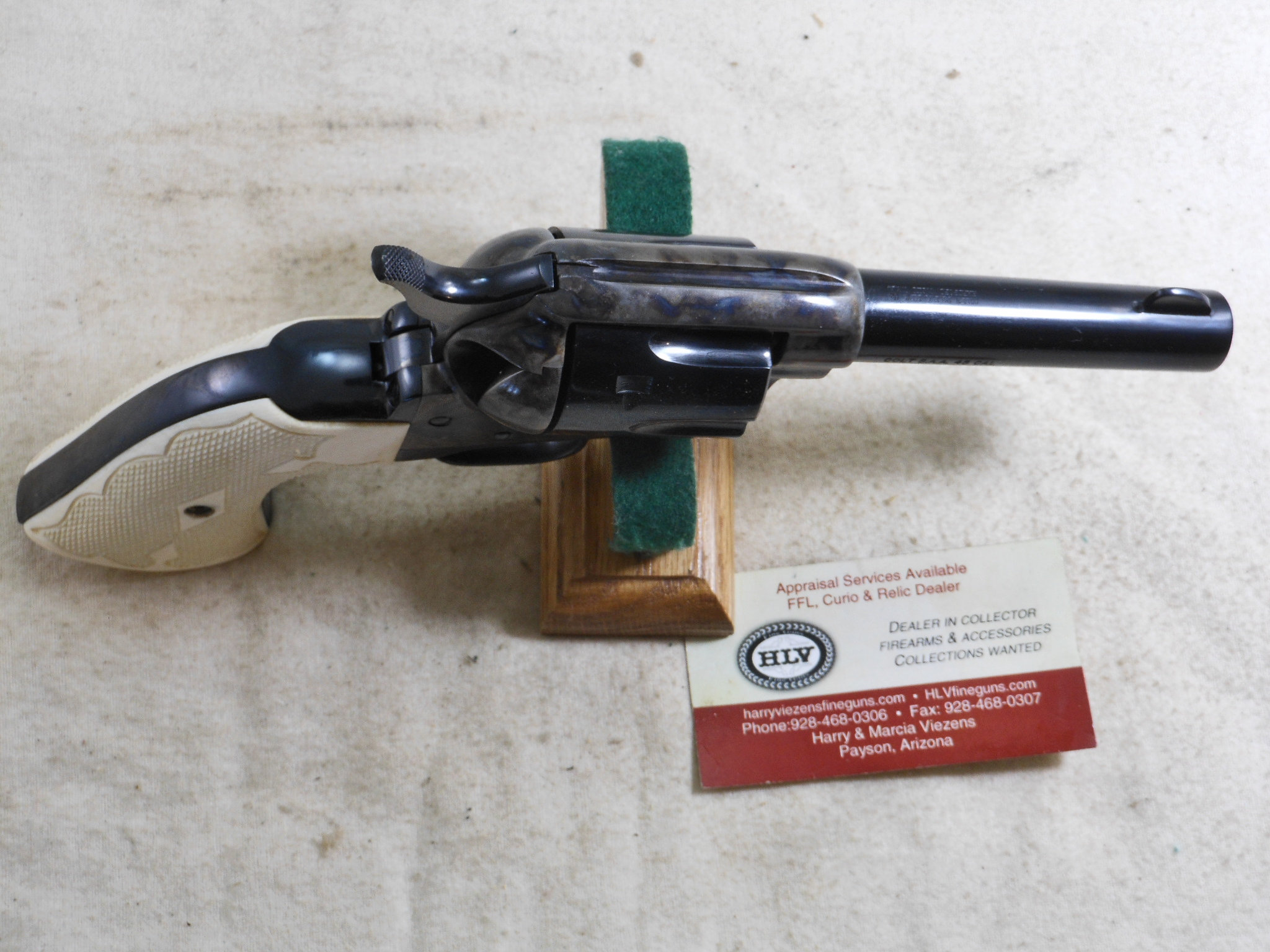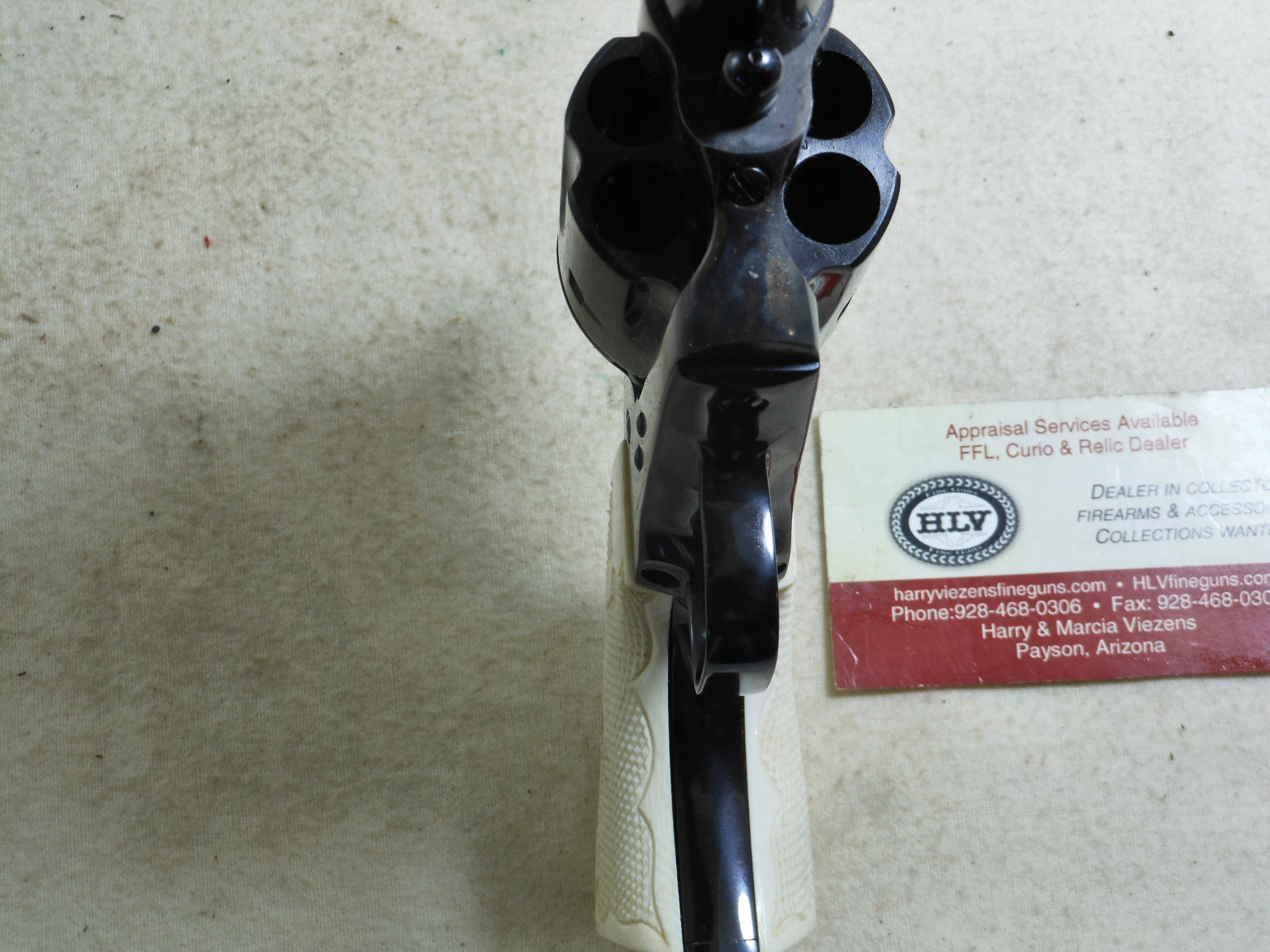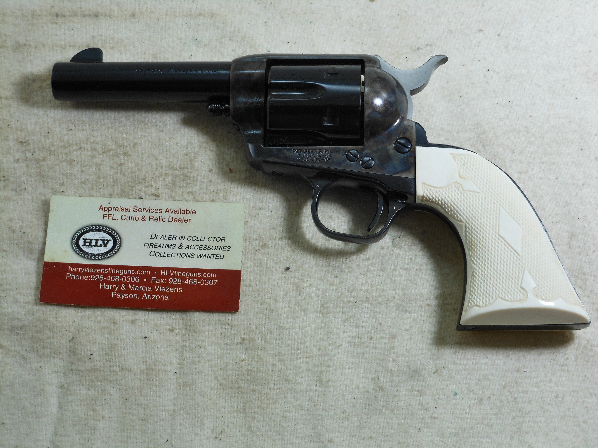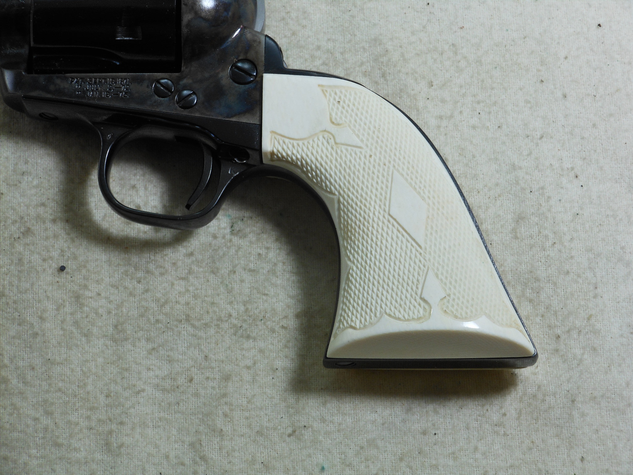 This Colt was produced in 1985. The pistol’s serial number is SA69352. The factory Letter confirms the special Ivory grips and special barrel length. This Colt is chambered for the 45 Colt cartridge. This pistol is in new condition with it’s original box and papers. The barrel is a special order 4 inch barrel without the ejector housing. The frame is the black powder frame without the cross bolt for the cylinder base pin. The ivory grips are checkered in the Fleur De Lis pattern. These ivory grips are stunning with this checkering pattern! The color cased frame is really stunning! There is no sign of being cocked or being played with. The original box has the custom shop label on the end tab. The box jacket is in good condition with no separated end tabs. All of the papers and booklet are present with this box. This is a really special Colt from the Custom Shop! This is the kind of pistol that will always be in high demand for collectors! The special barrel and grips as well as being on the black powder frame really add to the rarity of this fine Colt!