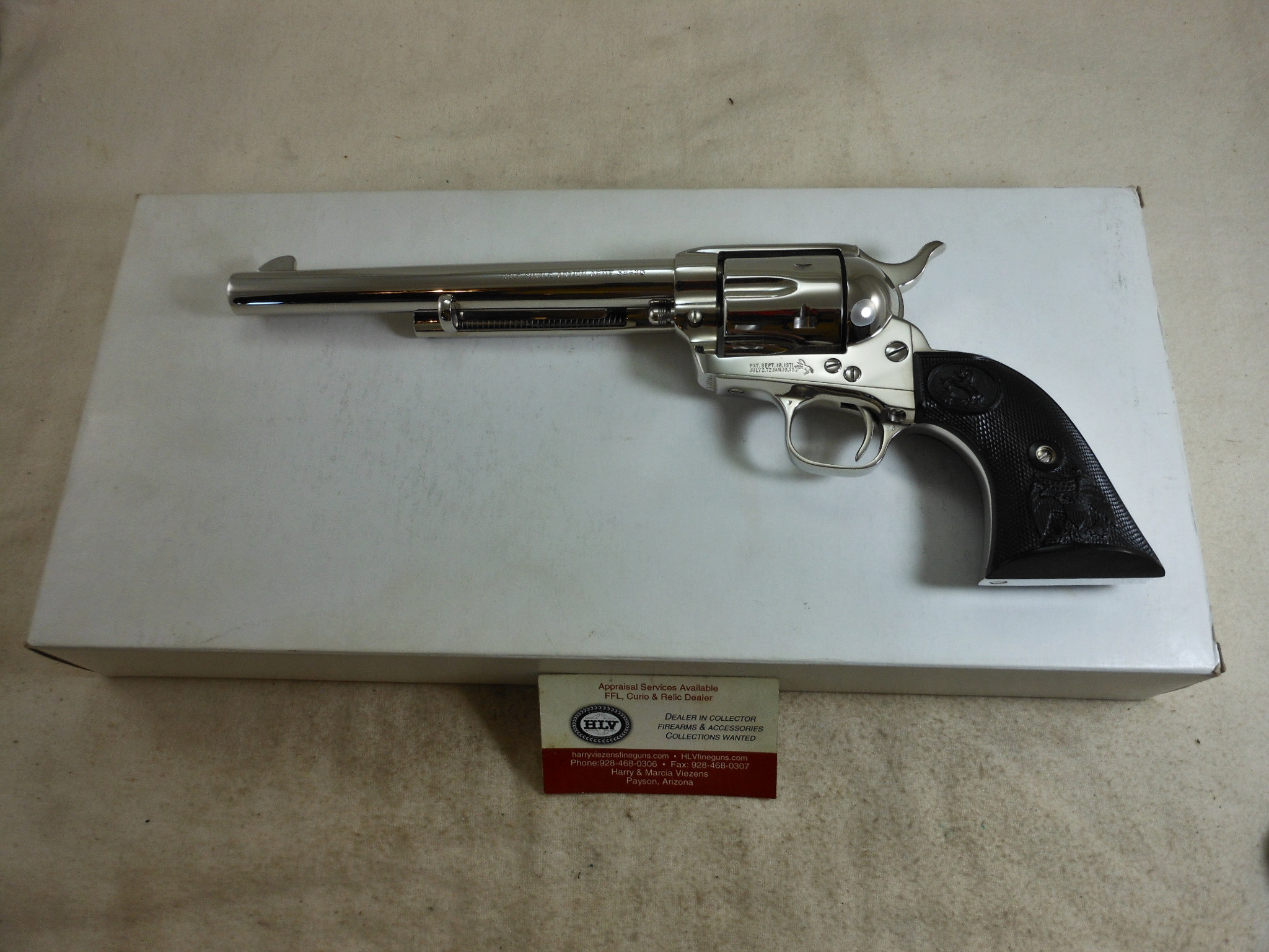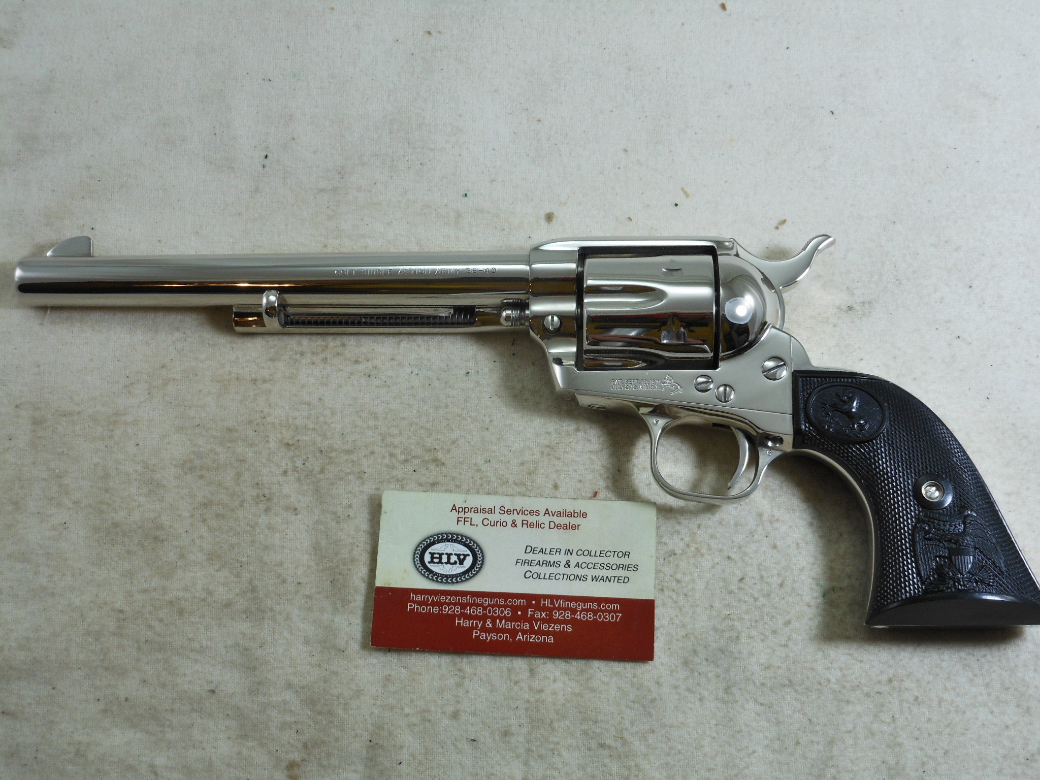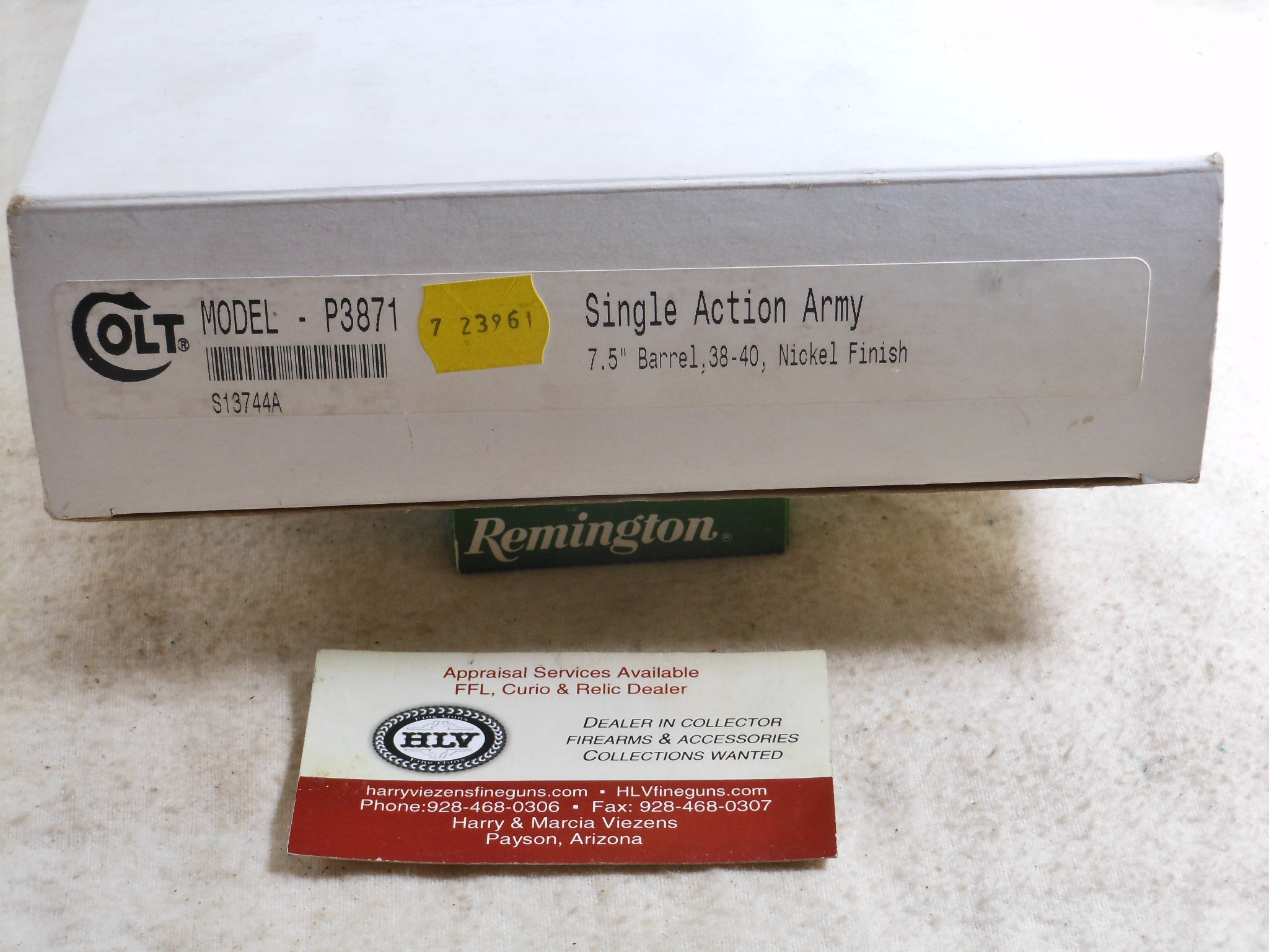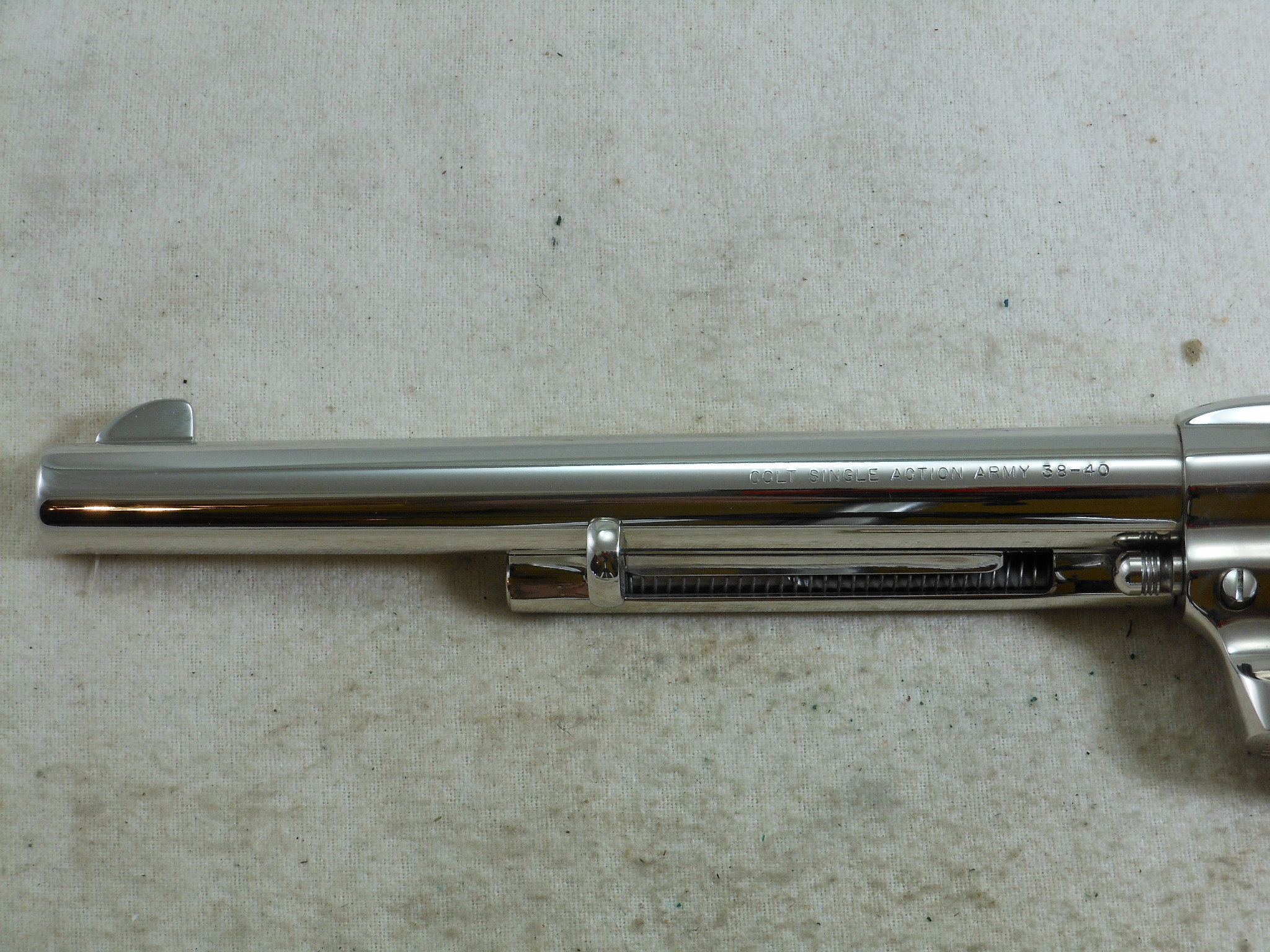 This Colt was produced in 1996. This pistol’s serial number is S13744A. The pistol is in new condition. This Colt has the full high polish nickel finish. The 7 1/2 inch barrel is chambered to shoot the rare 38-40 cartridge chambering. This pistol shows no sign of handling or the action being worked. The original plating is in 100% condition! The black eagle grips are also in new unused condition. Colt made very few 38-40 pistols! Of that group very few were 7 1/2 inch barrels and being plated! This is a very highly collectable Colt! The box is in new condition. The white sleeve is also in new condition with a intact end label serial numbered to this pistol. This pistol is ready to join any fine gun collection!