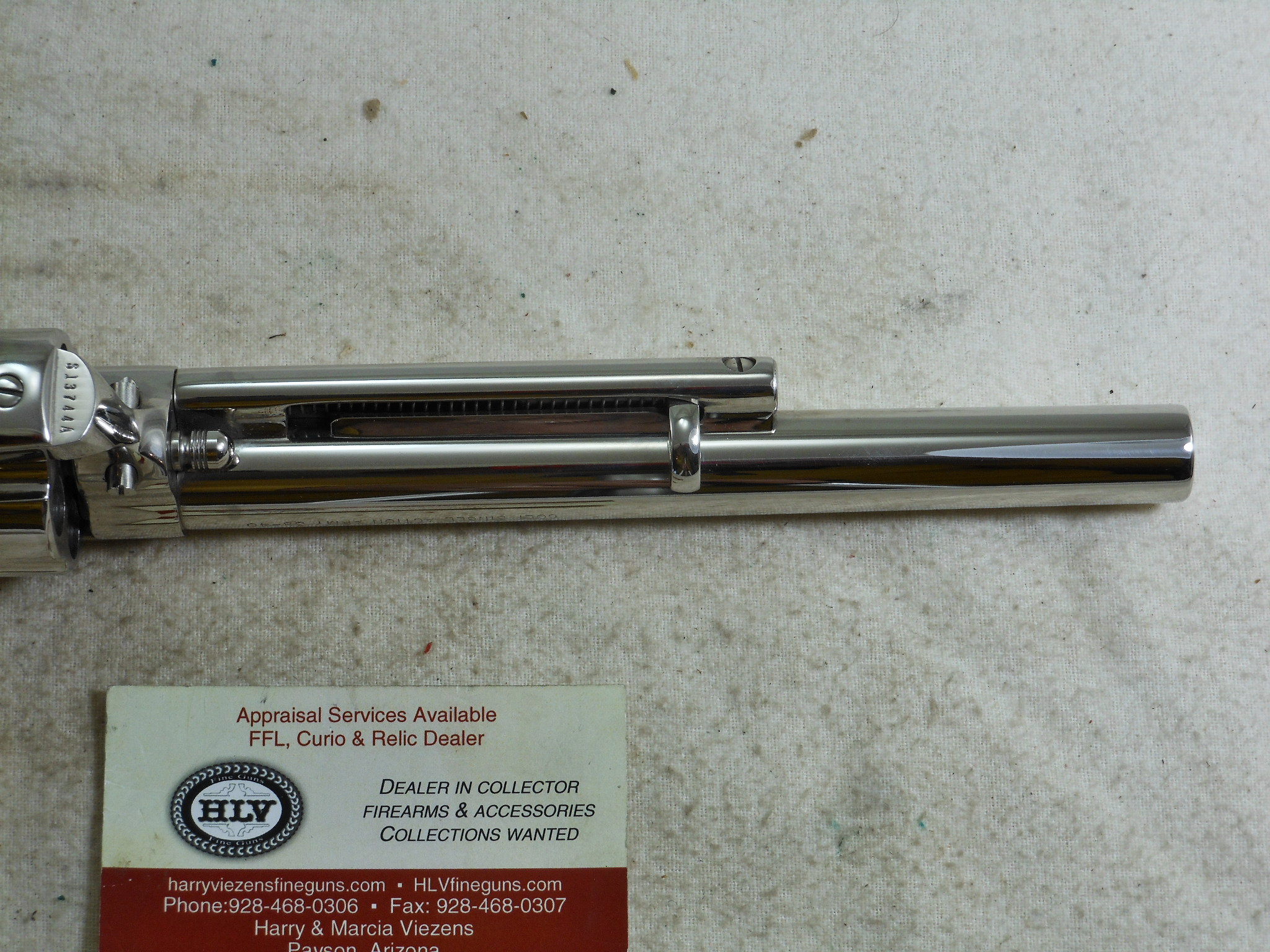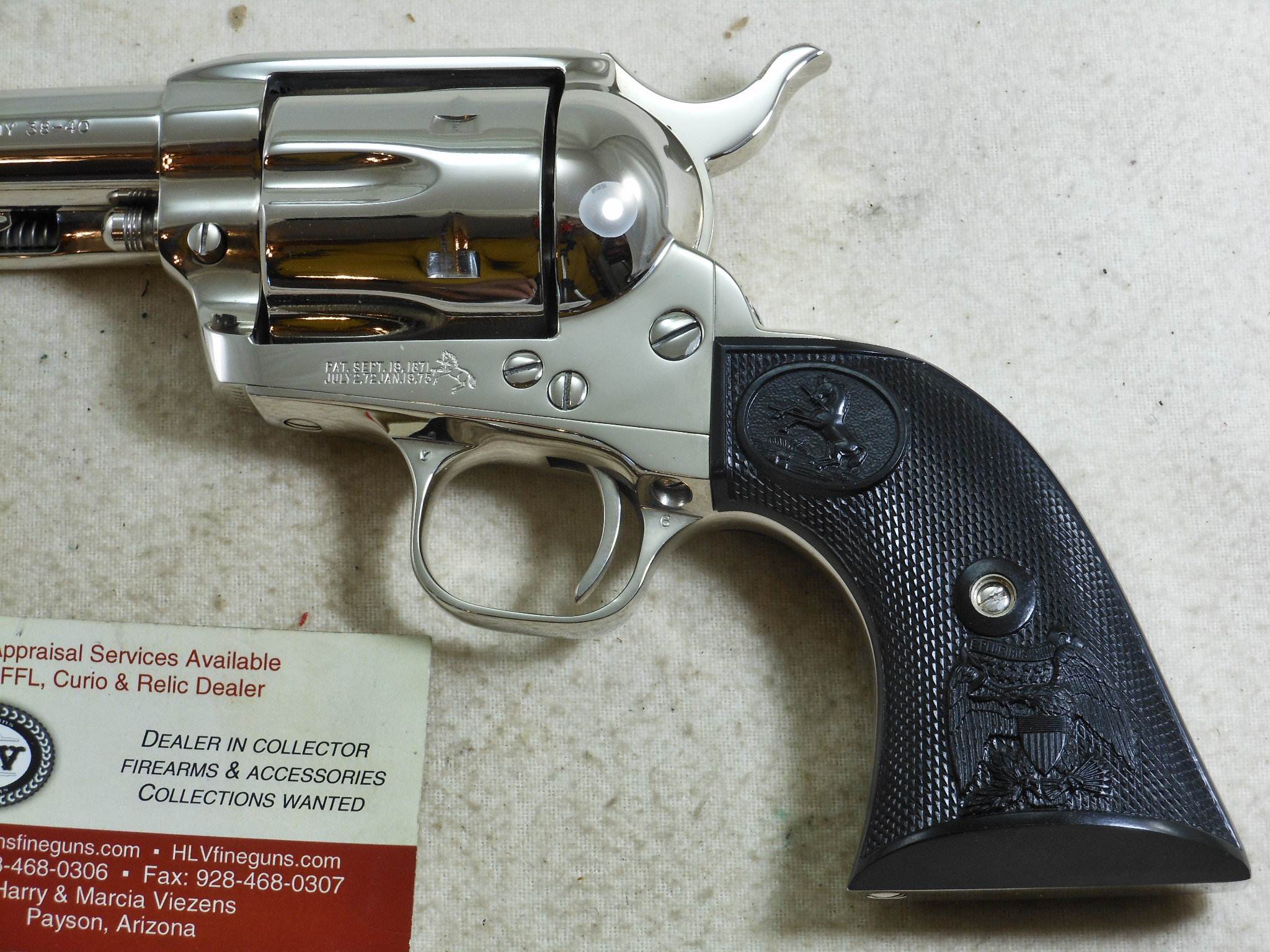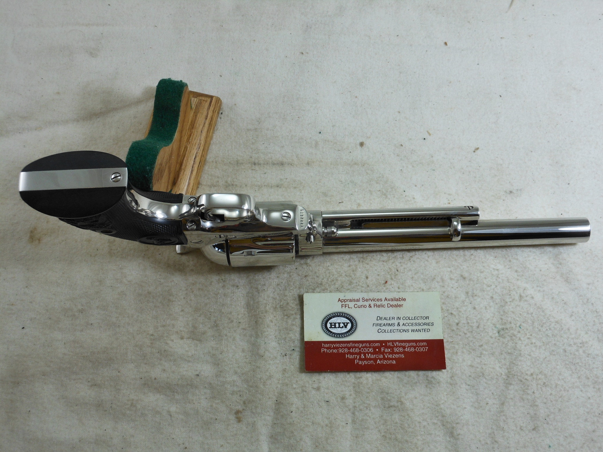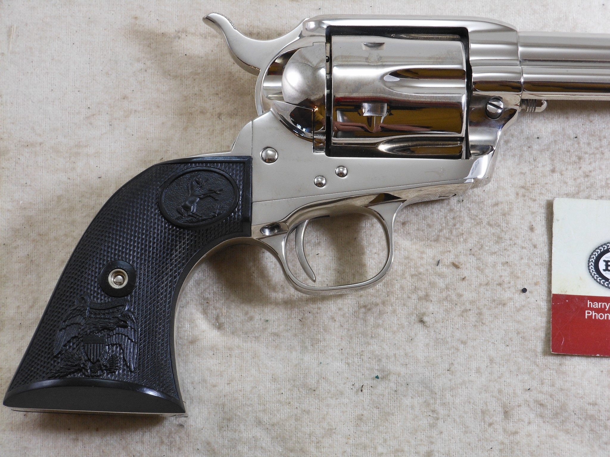 This Colt was produced in 1996. This pistol’s serial number is S13744A. The pistol is in new condition. This Colt has the full high polish nickel finish. The 7 1/2 inch barrel is chambered to shoot the rare 38-40 cartridge chambering. This pistol shows no sign of handling or the action being worked. The original plating is in 100% condition! The black eagle grips are also in new unused condition. Colt made very few 38-40 pistols! Of that group very few were 7 1/2 inch barrels and being plated! This is a very highly collectable Colt! The box is in new condition. The white sleeve is also in new condition with a intact end label serial numbered to this pistol. This pistol is ready to join any fine gun collection!