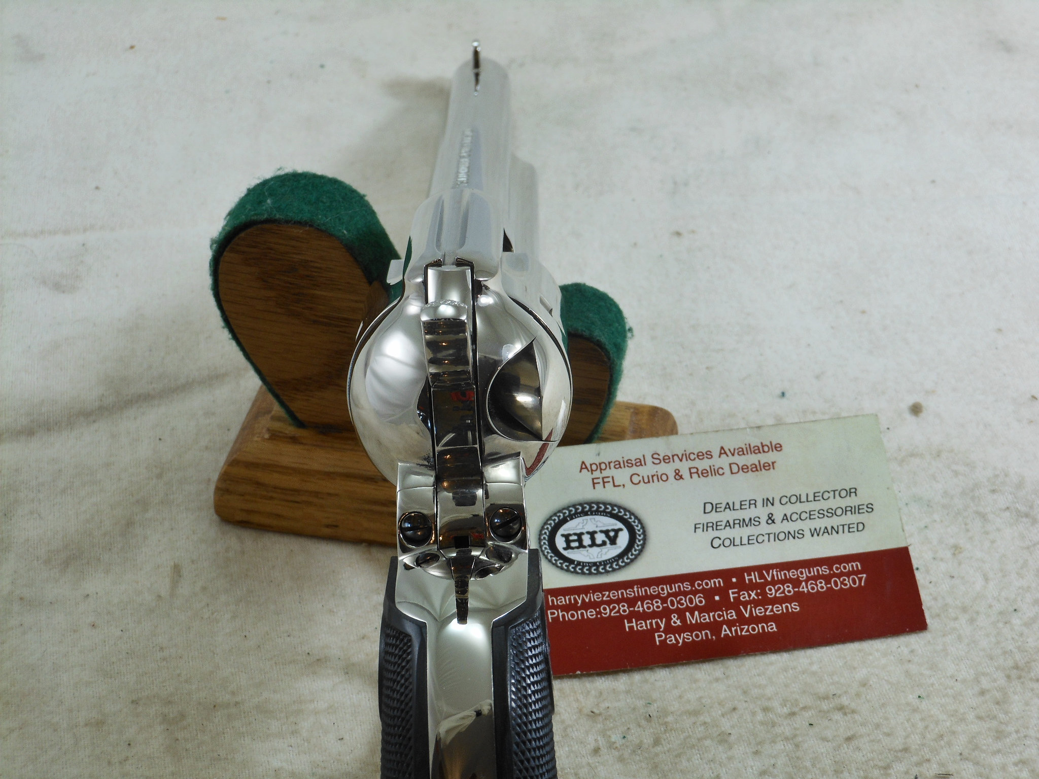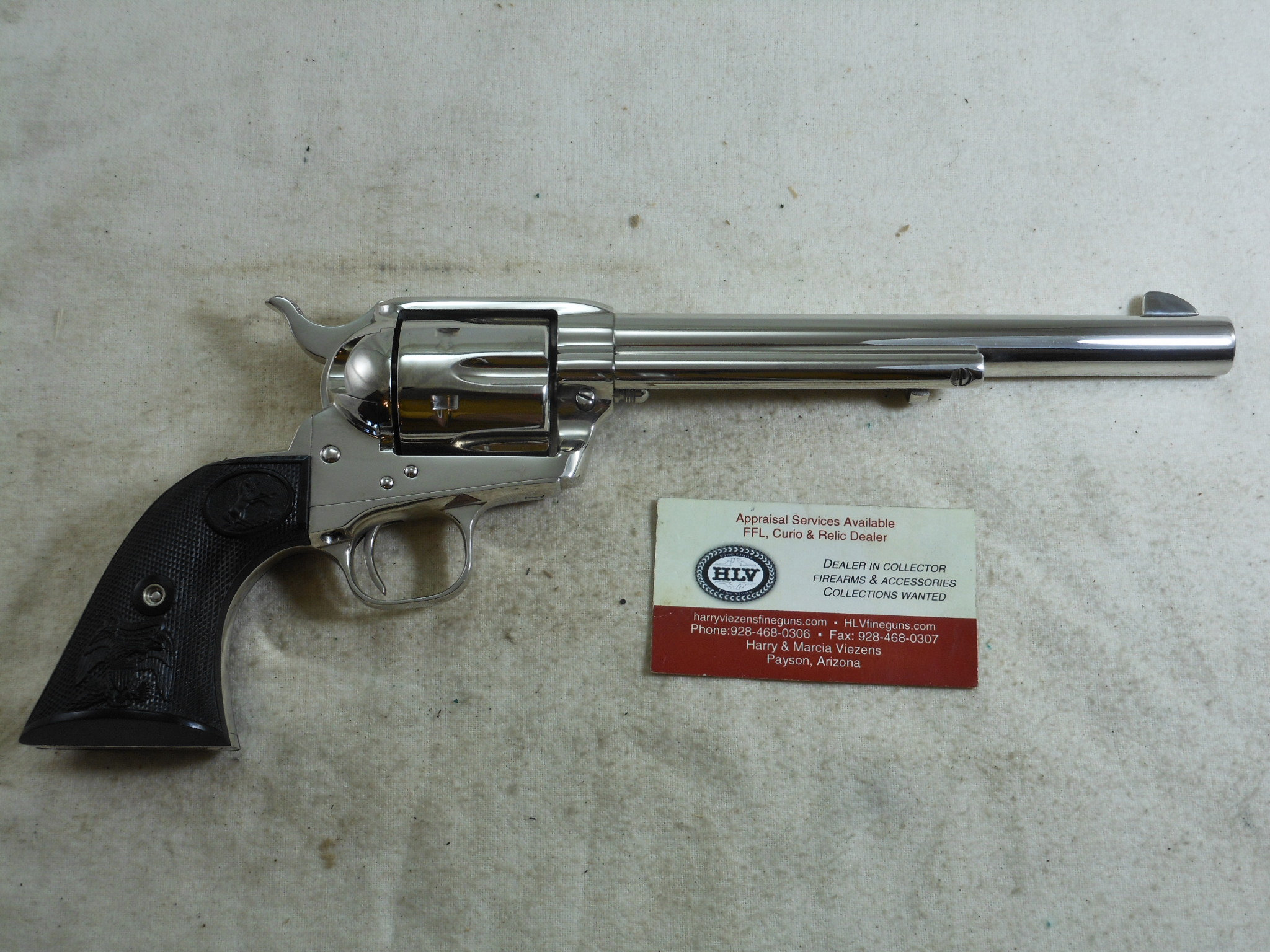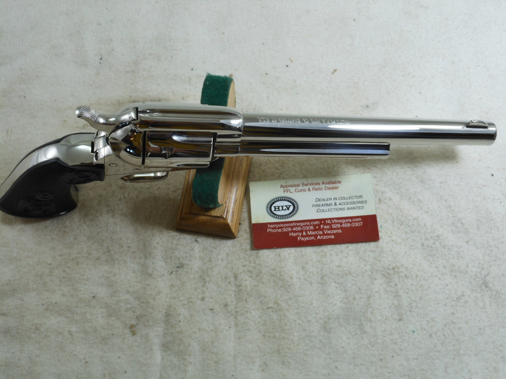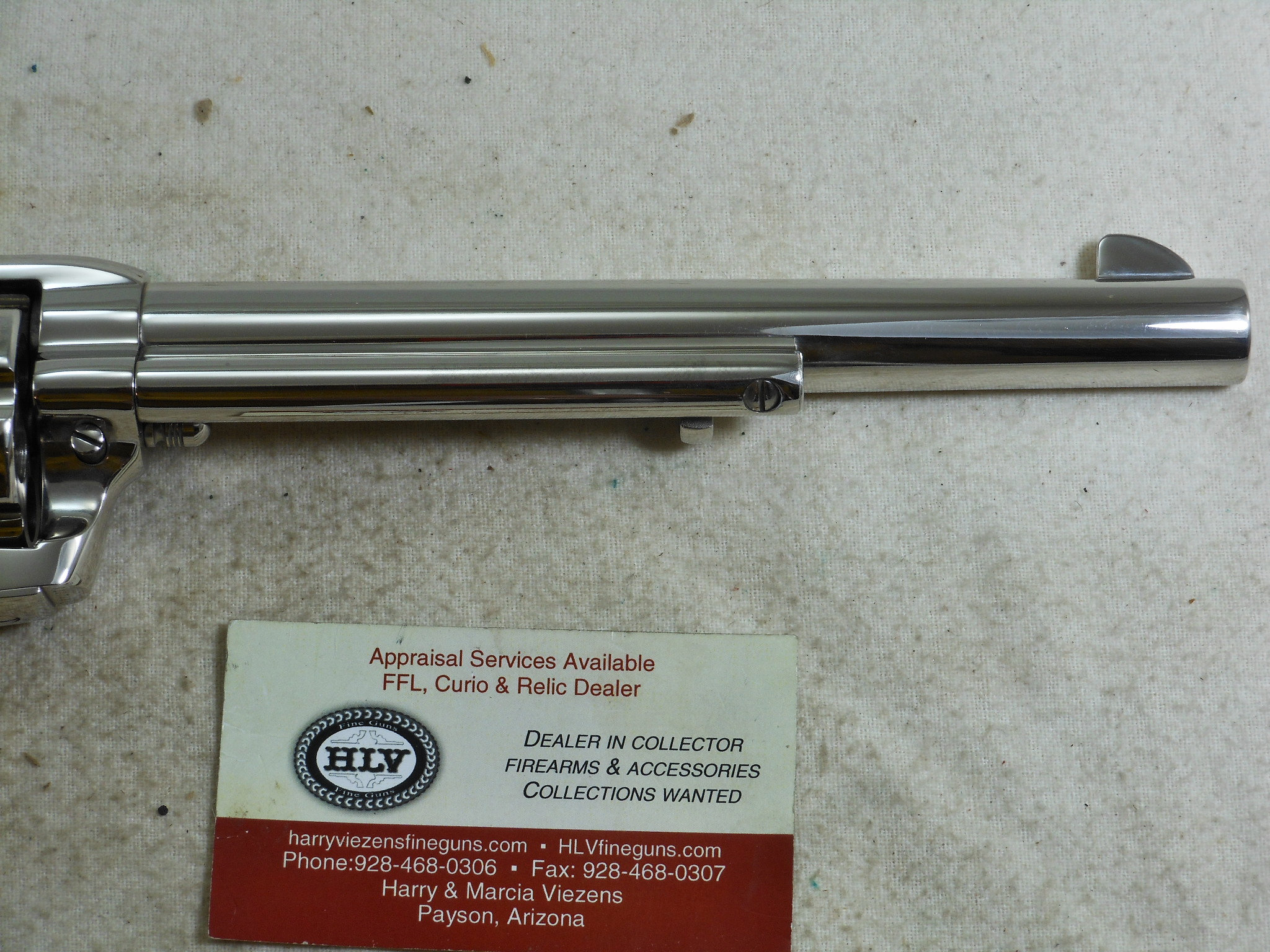 This Colt was produced in 1996. This pistol’s serial number is S13744A. The pistol is in new condition. This Colt has the full high polish nickel finish. The 7 1/2 inch barrel is chambered to shoot the rare 38-40 cartridge chambering. This pistol shows no sign of handling or the action being worked. The original plating is in 100% condition! The black eagle grips are also in new unused condition. Colt made very few 38-40 pistols! Of that group very few were 7 1/2 inch barrels and being plated! This is a very highly collectable Colt! The box is in new condition. The white sleeve is also in new condition with a intact end label serial numbered to this pistol. This pistol is ready to join any fine gun collection!