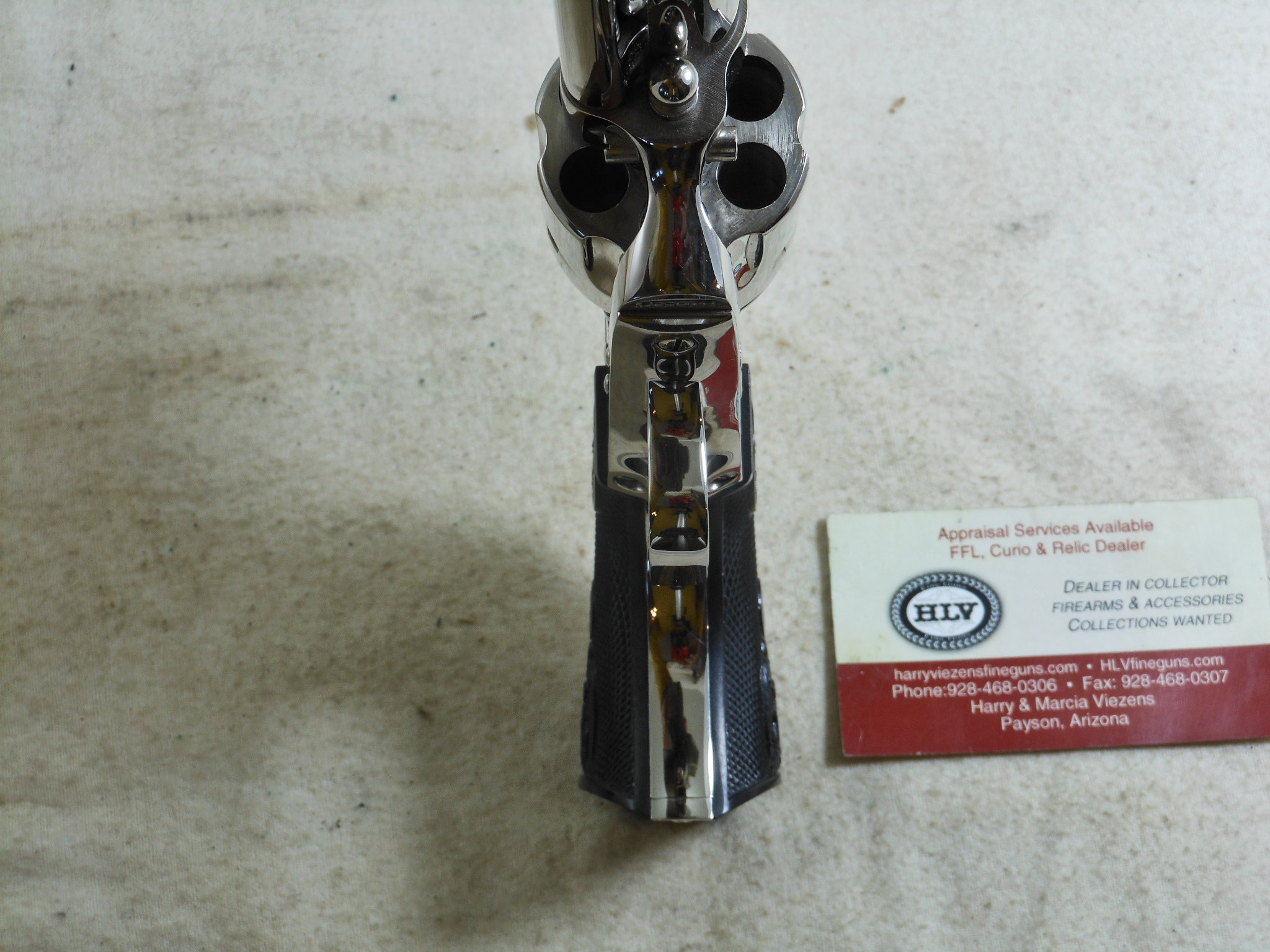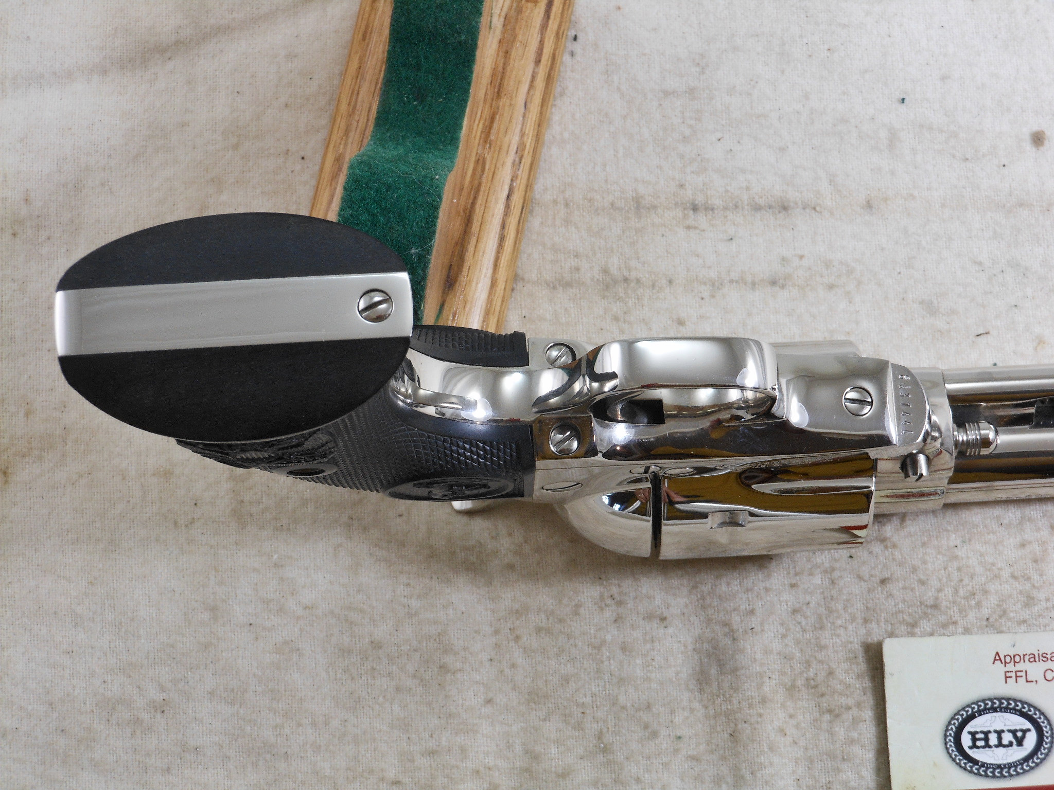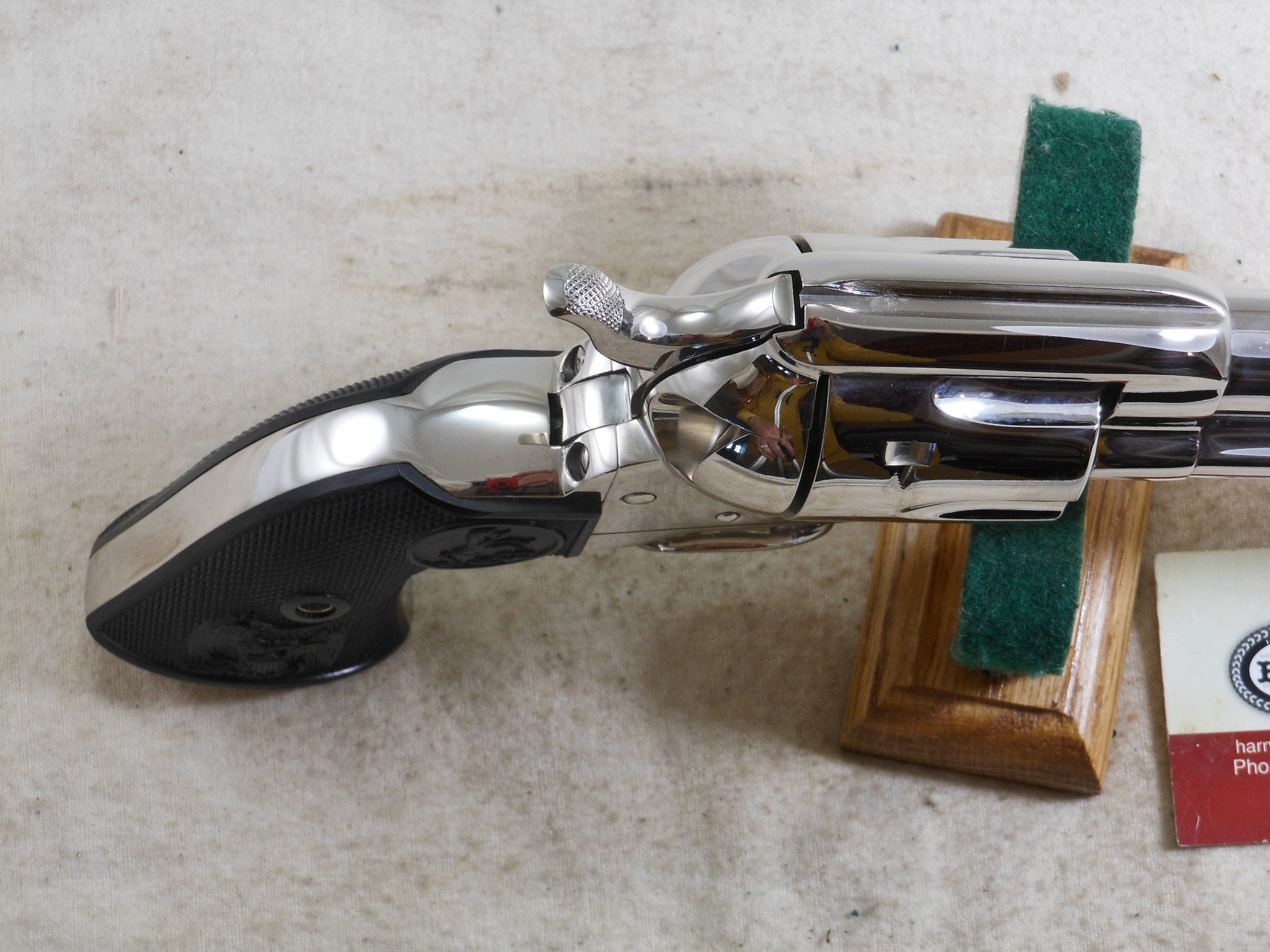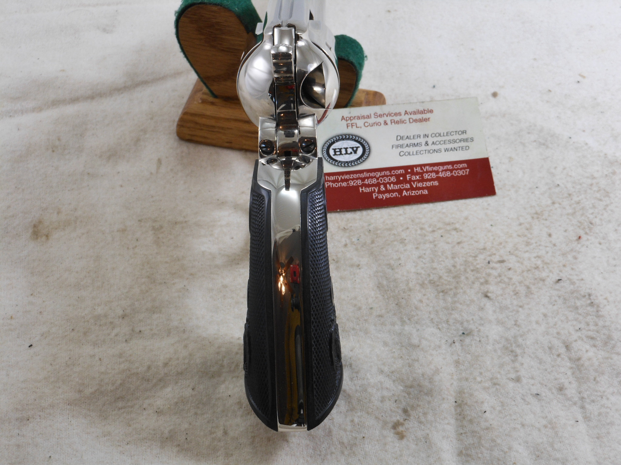 This Colt was produced in 1996. This pistol’s serial number is S13744A. The pistol is in new condition. This Colt has the full high polish nickel finish. The 7 1/2 inch barrel is chambered to shoot the rare 38-40 cartridge chambering. This pistol shows no sign of handling or the action being worked. The original plating is in 100% condition! The black eagle grips are also in new unused condition. Colt made very few 38-40 pistols! Of that group very few were 7 1/2 inch barrels and being plated! This is a very highly collectable Colt! The box is in new condition. The white sleeve is also in new condition with a intact end label serial numbered to this pistol. This pistol is ready to join any fine gun collection!