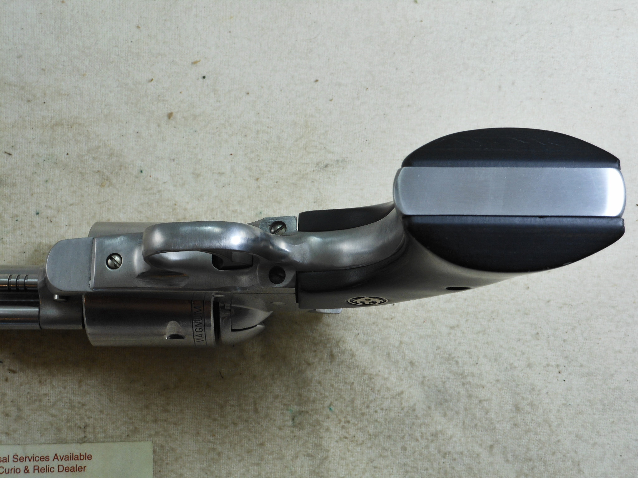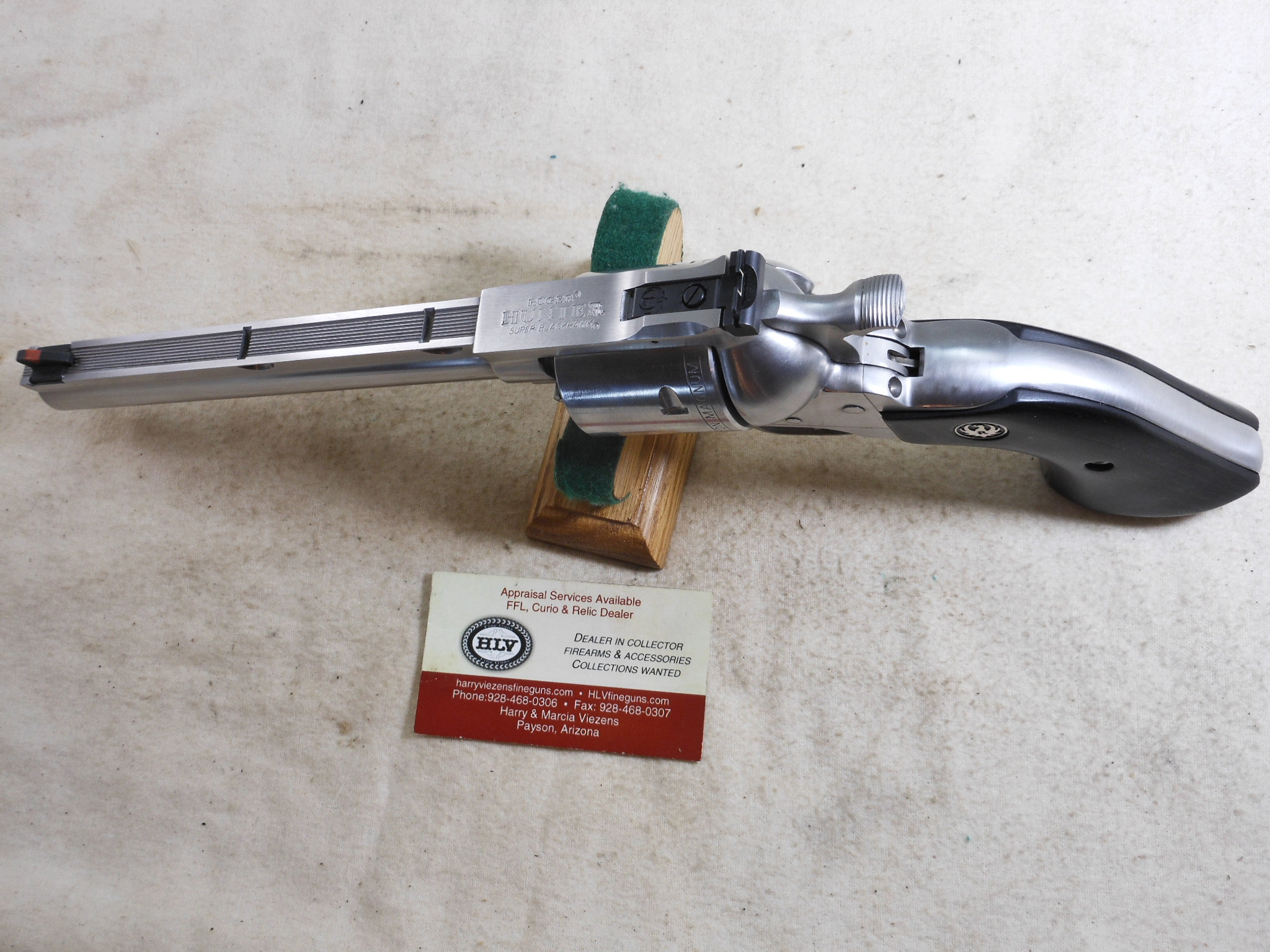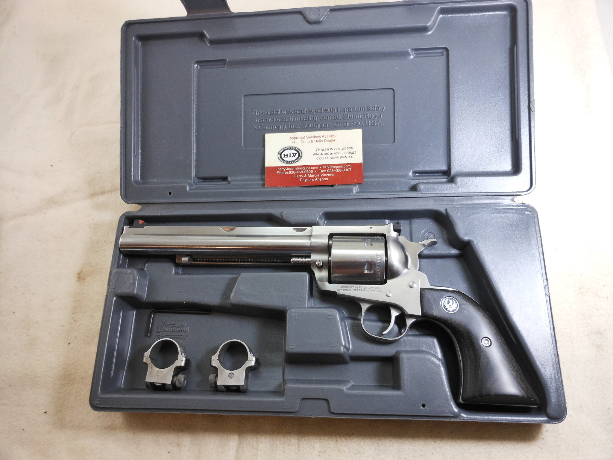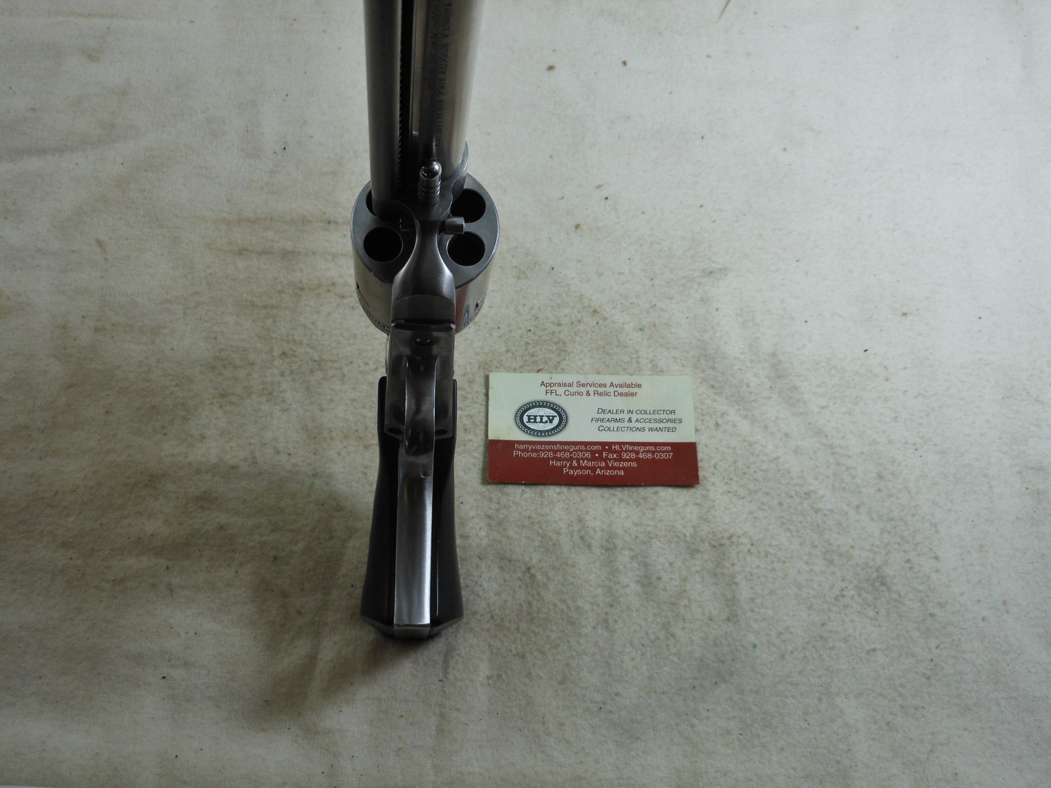 This Ruger was produced in 2019. The pistol’s serial number is 89-18006. This pistol is in new condition. The bore and chambers are in bright minty condition. This New Model Super Black Hawk is the Hunter Model chambered to shoot the 44 Remington Magnum. This pistol is fitted with a 7 1/2 inch barrel. The barrel top rib is cut to fit scope rings. The scope rings are in the box with this pistol. The matted stainless steel finish is in new condition with no issues. The action works correctly as expected. This Plastic box end label is intact and serial numbered to this pistol. This pistol is a multi use pistol and is ready to go to work! This box of 44 Magnum shells is for display only and not for sale!