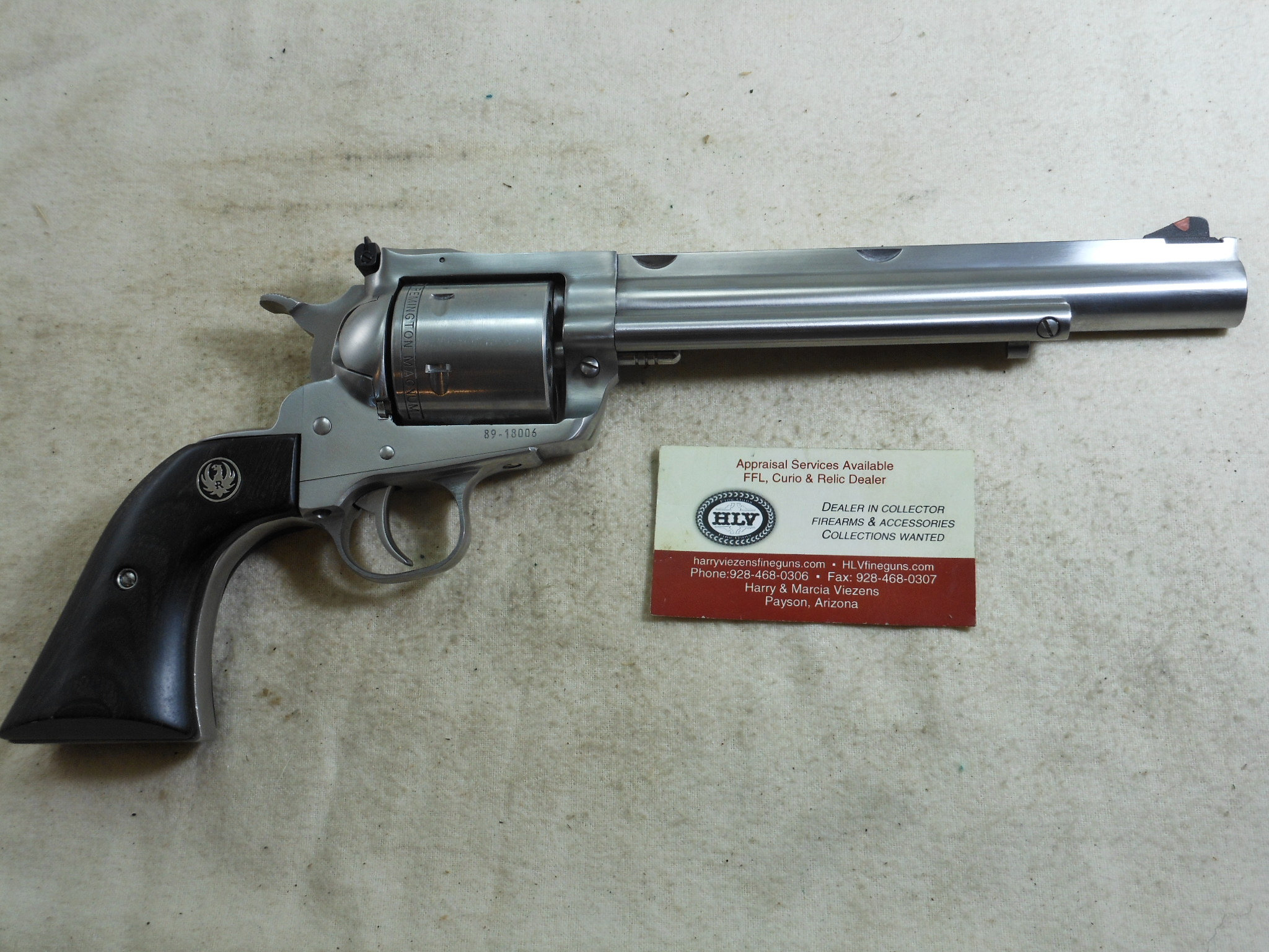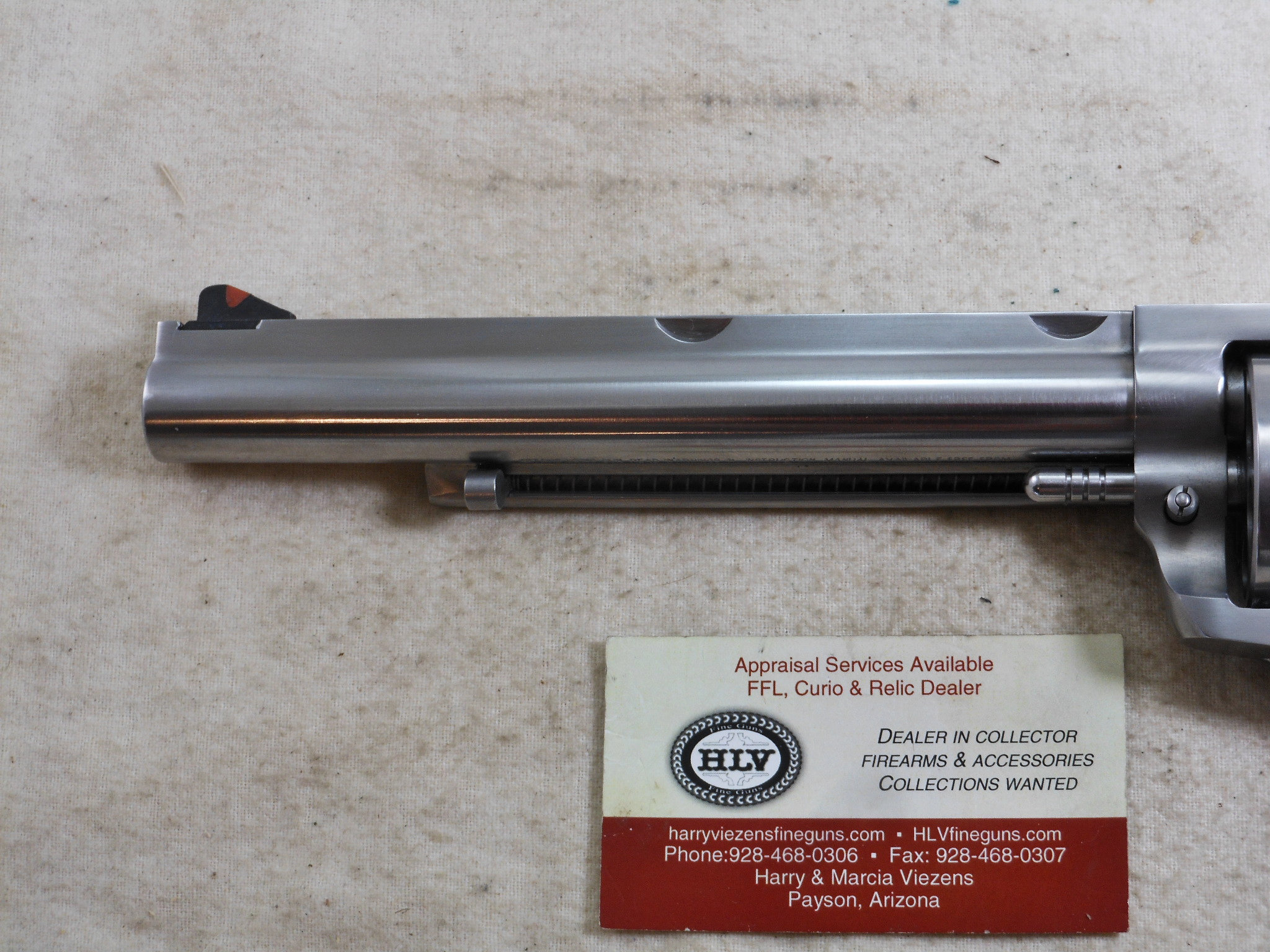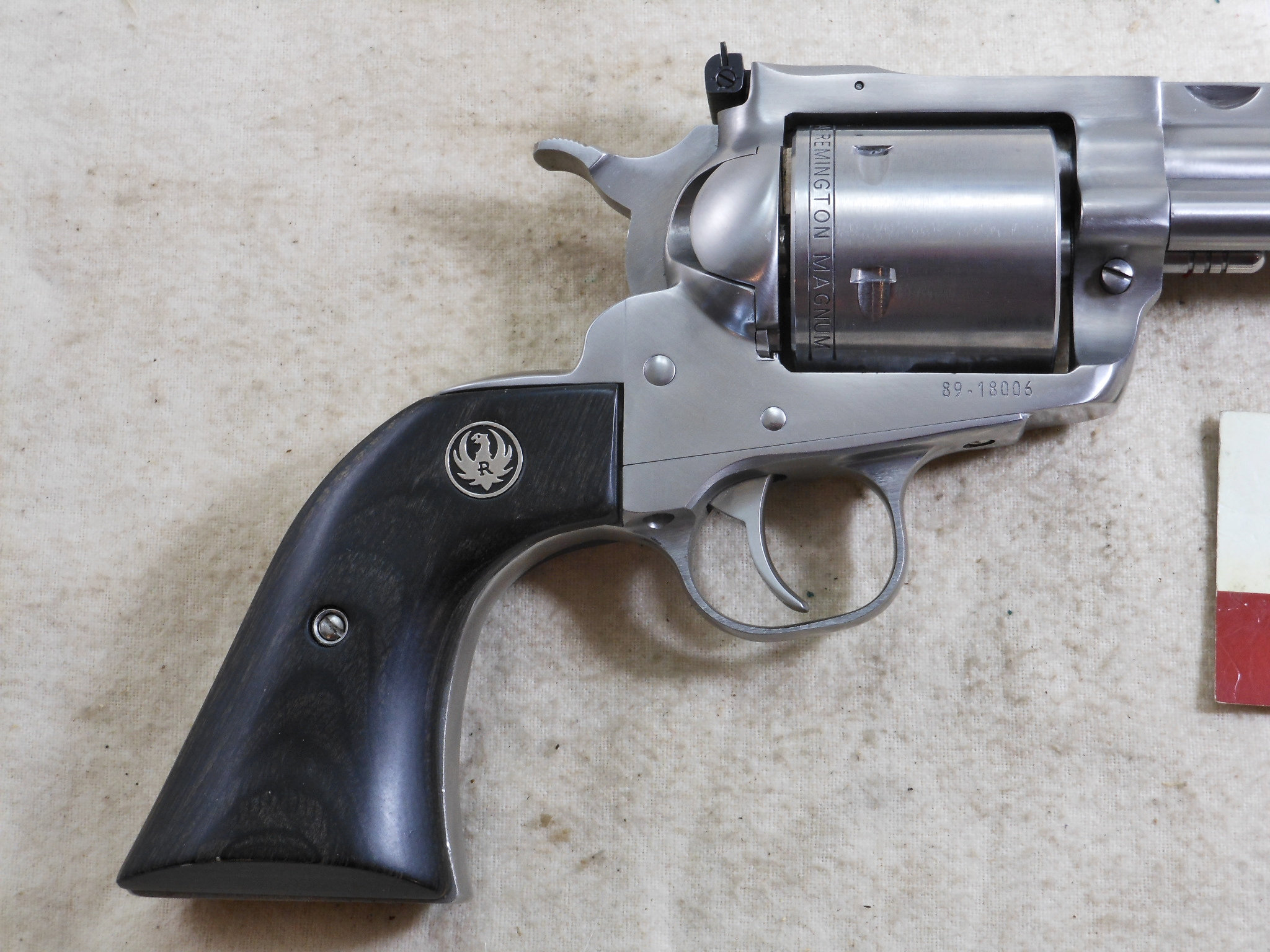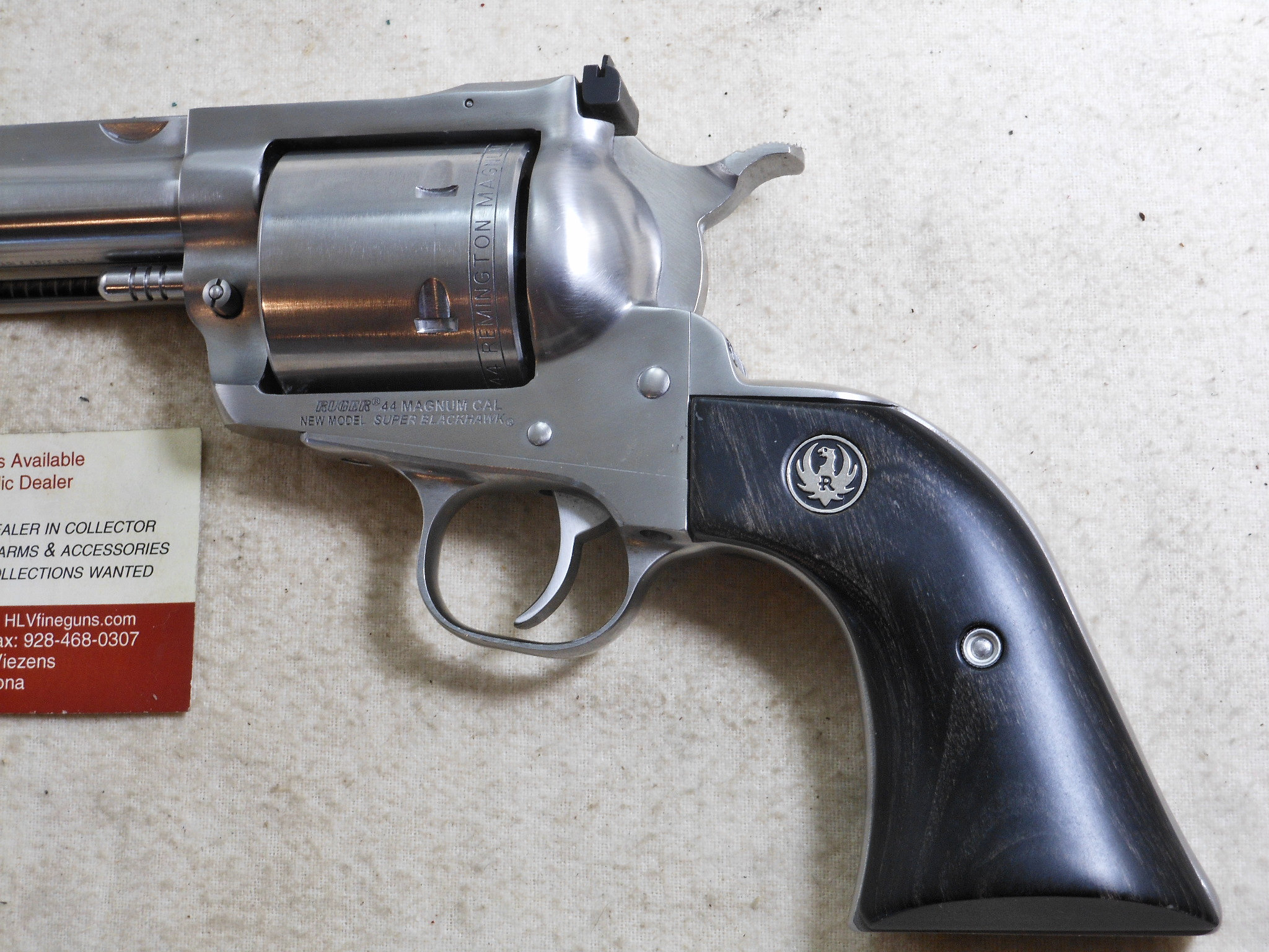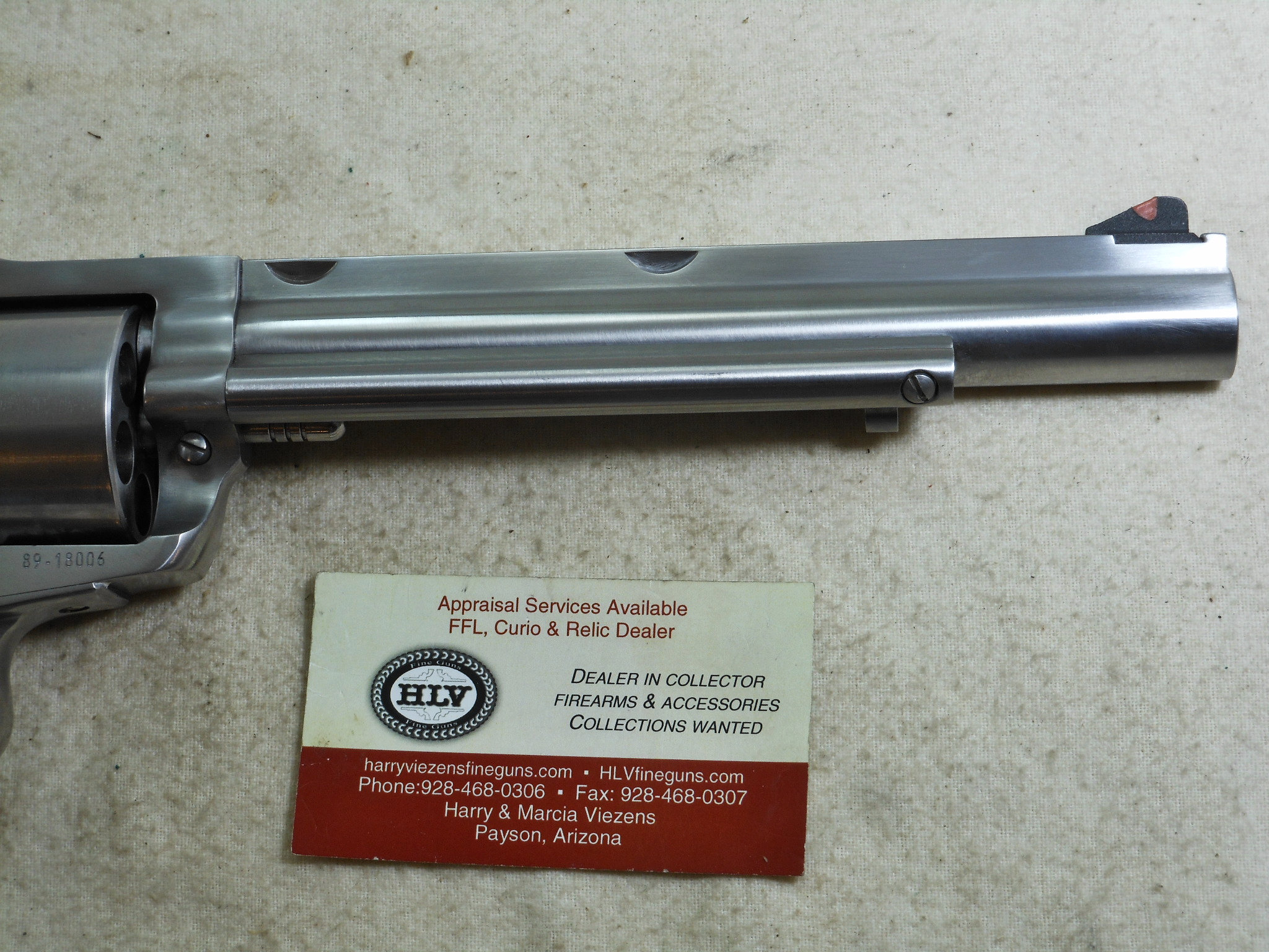 This Ruger was produced in 2019. The pistol’s serial number is 89-18006. This pistol is in new condition. The bore and chambers are in bright minty condition. This New Model Super Black Hawk is the Hunter Model chambered to shoot the 44 Remington Magnum. This pistol is fitted with a 7 1/2 inch barrel. The barrel top rib is cut to fit scope rings. The scope rings are in the box with this pistol. The matted stainless steel finish is in new condition with no issues. The action works correctly as expected. This Plastic box end label is intact and serial numbered to this pistol. This pistol is a multi use pistol and is ready to go to work! This box of 44 Magnum shells is for display only and not for sale!