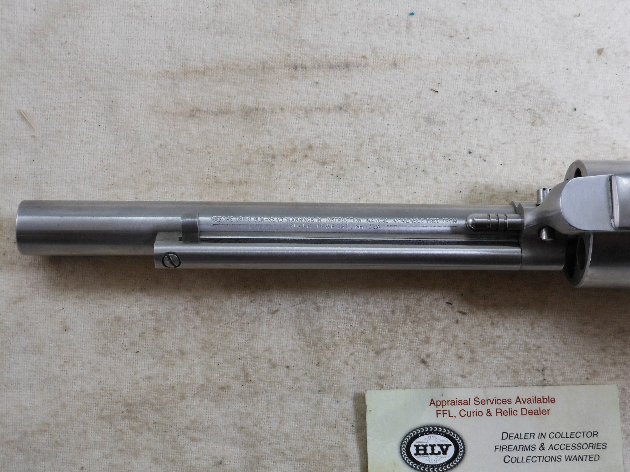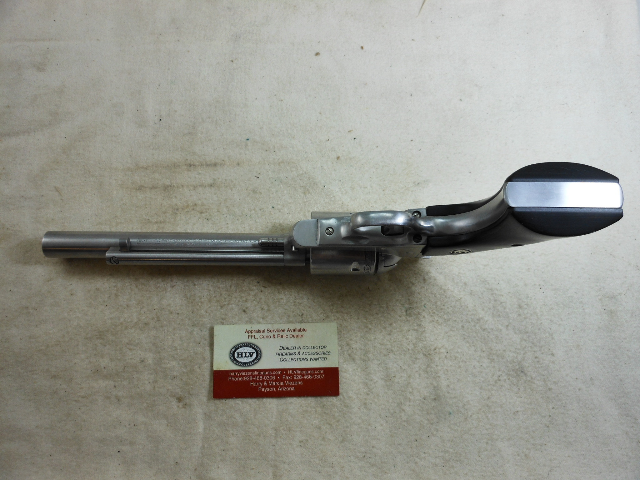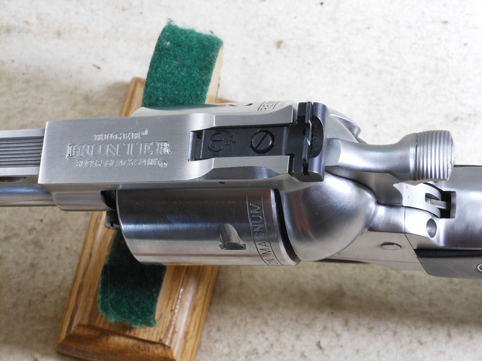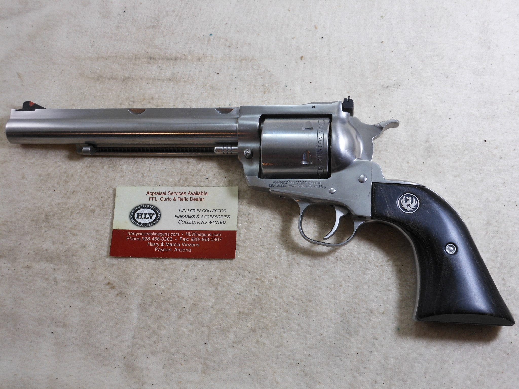 This Ruger was produced in 2019. The pistol’s serial number is 89-18006. This pistol is in new condition. The bore and chambers are in bright minty condition. This New Model Super Black Hawk is the Hunter Model chambered to shoot the 44 Remington Magnum. This pistol is fitted with a 7 1/2 inch barrel. The barrel top rib is cut to fit scope rings. The scope rings are in the box with this pistol. The matted stainless steel finish is in new condition with no issues. The action works correctly as expected. This Plastic box end label is intact and serial numbered to this pistol. This pistol is a multi use pistol and is ready to go to work! This box of 44 Magnum shells is for display only and not for sale!