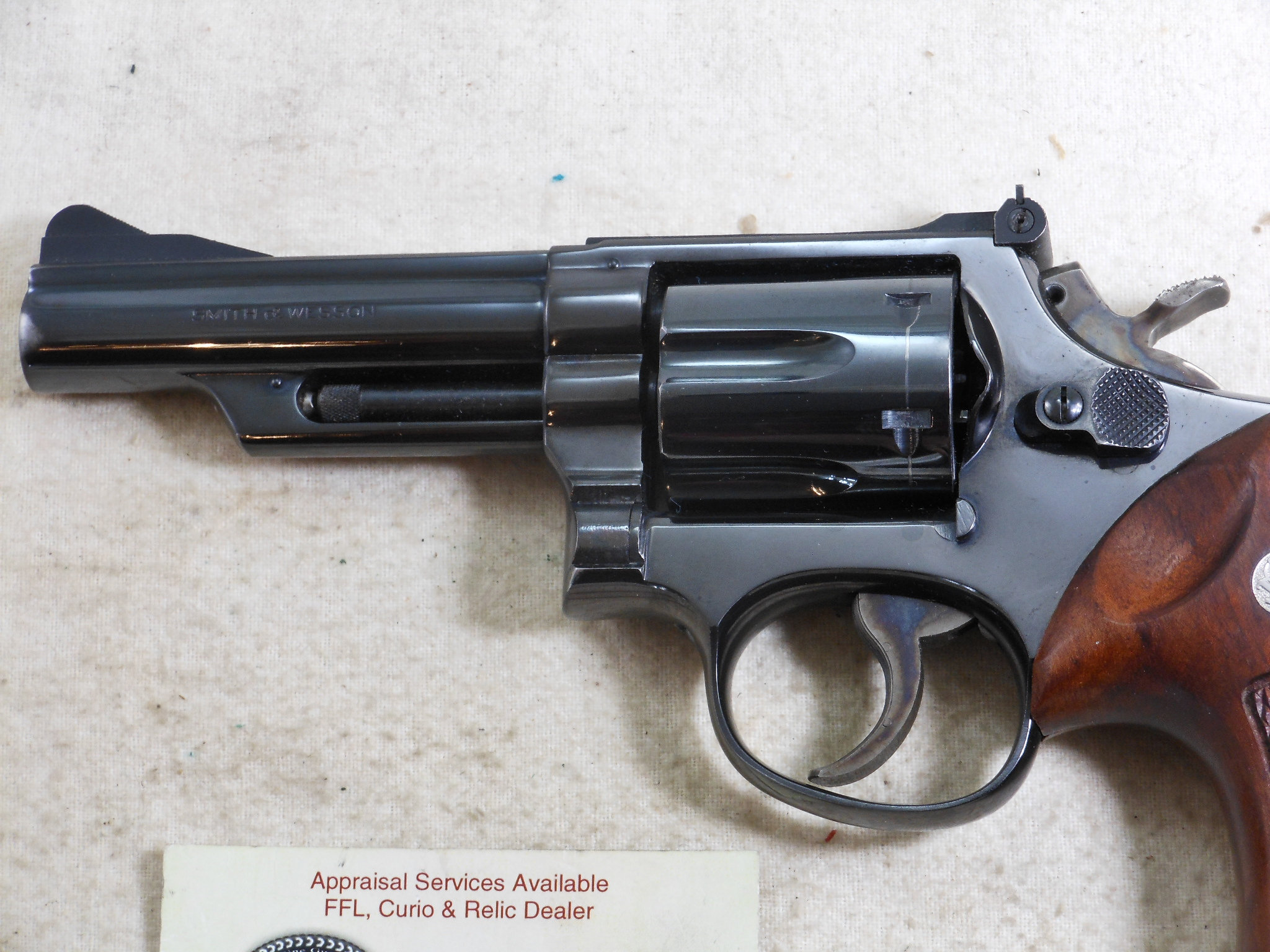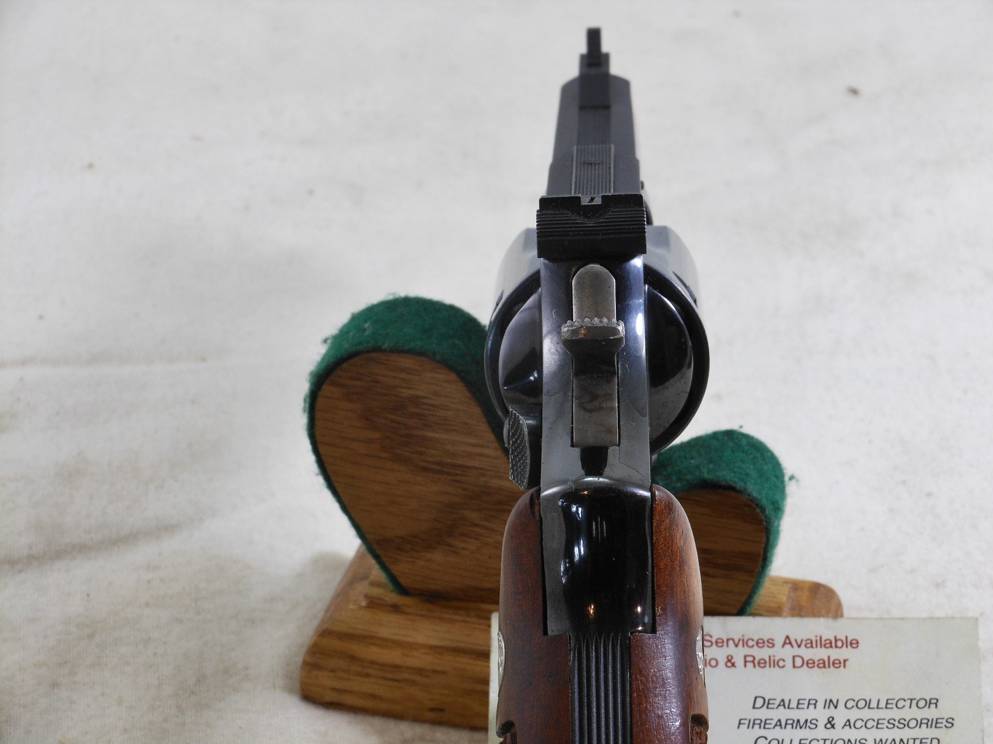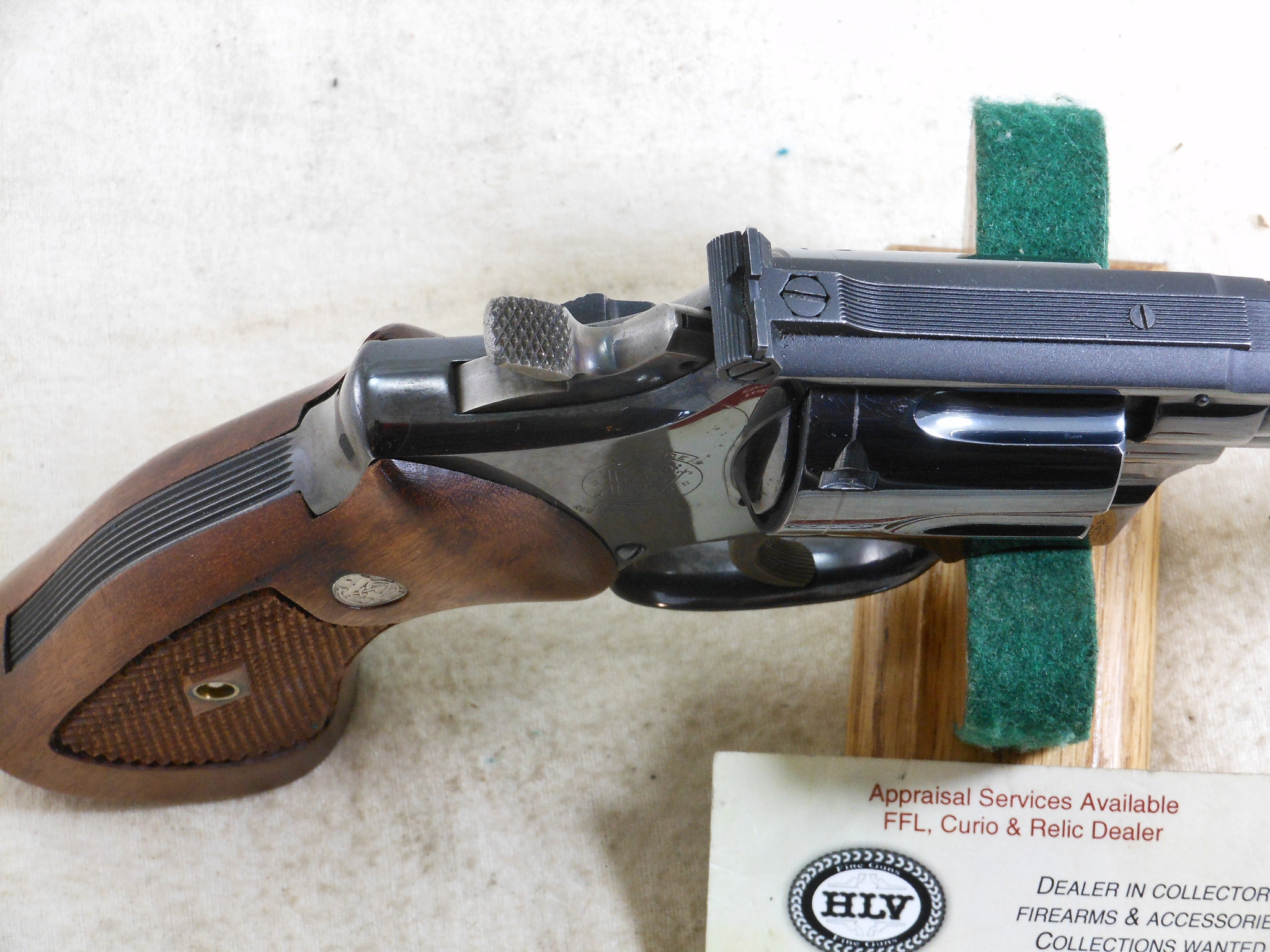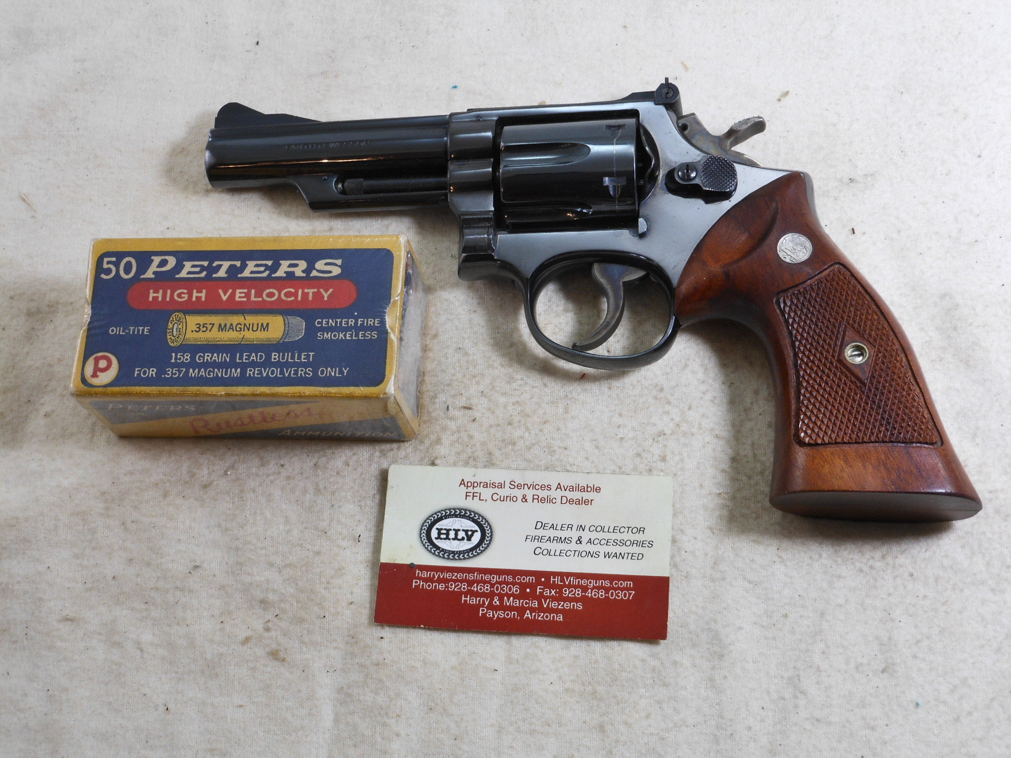 This Smith & Wesson 357 Combat Magnum was produced around 1955 to 1956. The pistol’s serial number is K 260268. The original 4 inch pinned barrel is chambered for the 357 Magnum cartridge. The bore is in bright minty condition. The six chambers are also in bright clean condition. This Smith & Wesson shows very little use and wear. The frame is the correct four screw frame. The original bluing would rate a 97% overall condition. The most blue loss is by the muzzle from holster wear. The color cased finish on the hammer and trigger is very strong and colorful. The action works great as would be expected from Smith & Wesson. The grips are the correct original grips for this pistol. This is a very fine early Model 357 Combat Magnum Pre 19 Pistol! This Smith & Wesson deserves to be in a very fine collection! The Box of 357 Magnum Ammunition is for display only and not for sale!