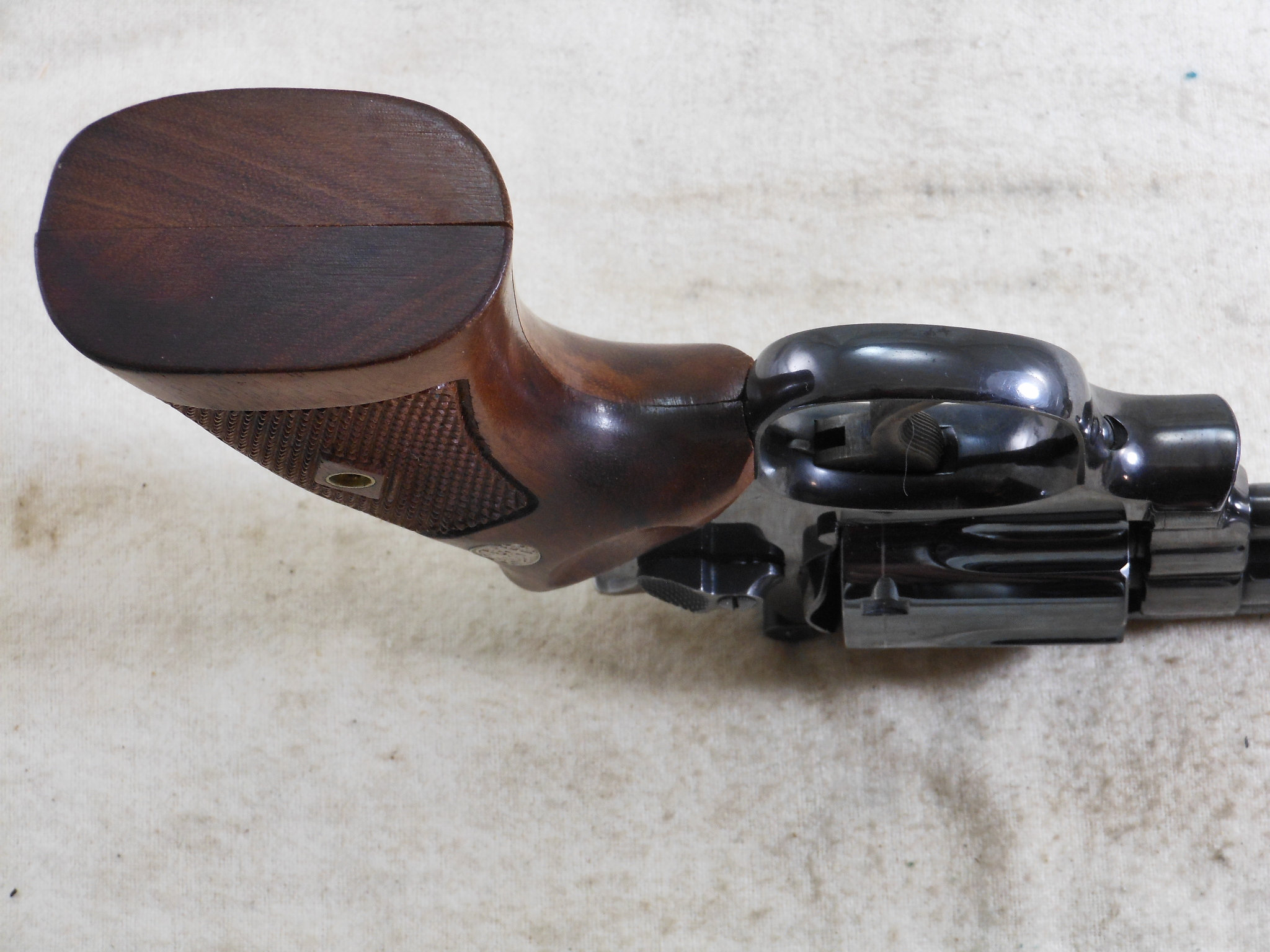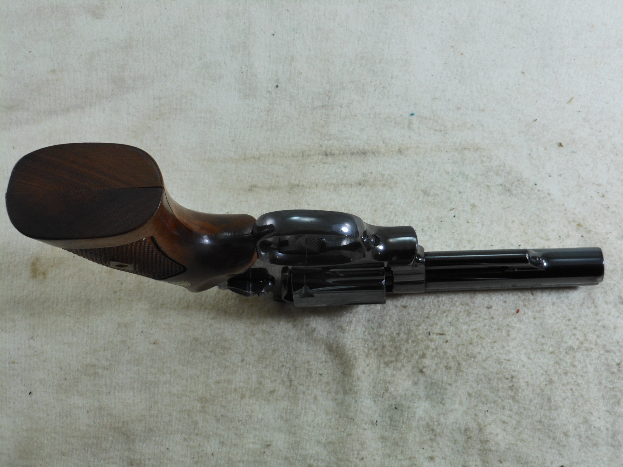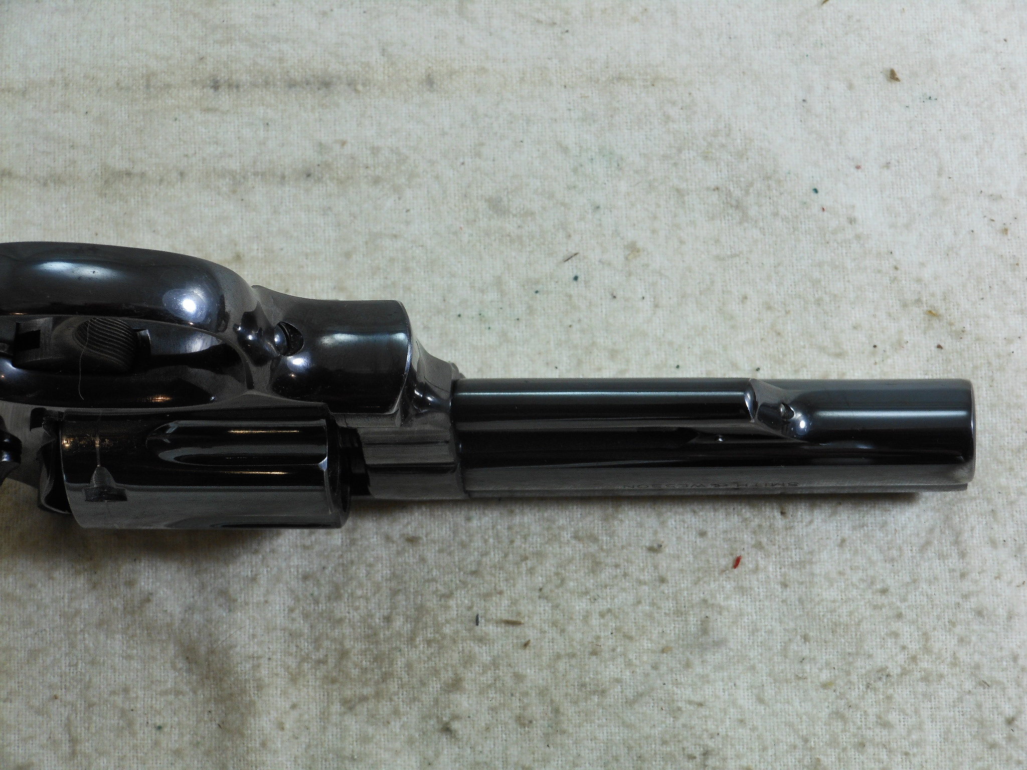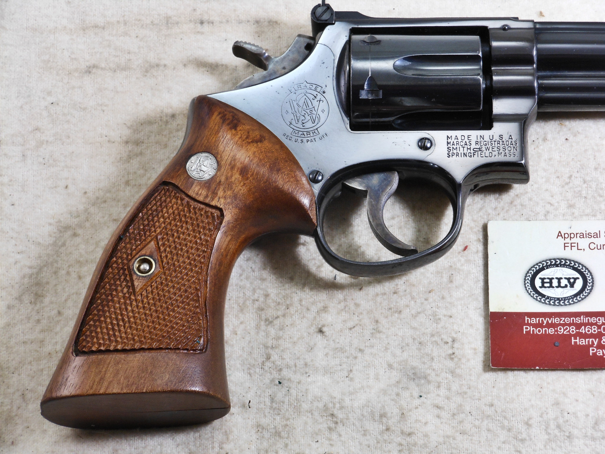 This Smith & Wesson 357 Combat Magnum was produced around 1955 to 1956. The pistol’s serial number is K 260268. The original 4 inch pinned barrel is chambered for the 357 Magnum cartridge. The bore is in bright minty condition. The six chambers are also in bright clean condition. This Smith & Wesson shows very little use and wear. The frame is the correct four screw frame. The original bluing would rate a 97% overall condition. The most blue loss is by the muzzle from holster wear. The color cased finish on the hammer and trigger is very strong and colorful. The action works great as would be expected from Smith & Wesson. The grips are the correct original grips for this pistol. This is a very fine early Model 357 Combat Magnum Pre 19 Pistol! This Smith & Wesson deserves to be in a very fine collection! The Box of 357 Magnum Ammunition is for display only and not for sale!