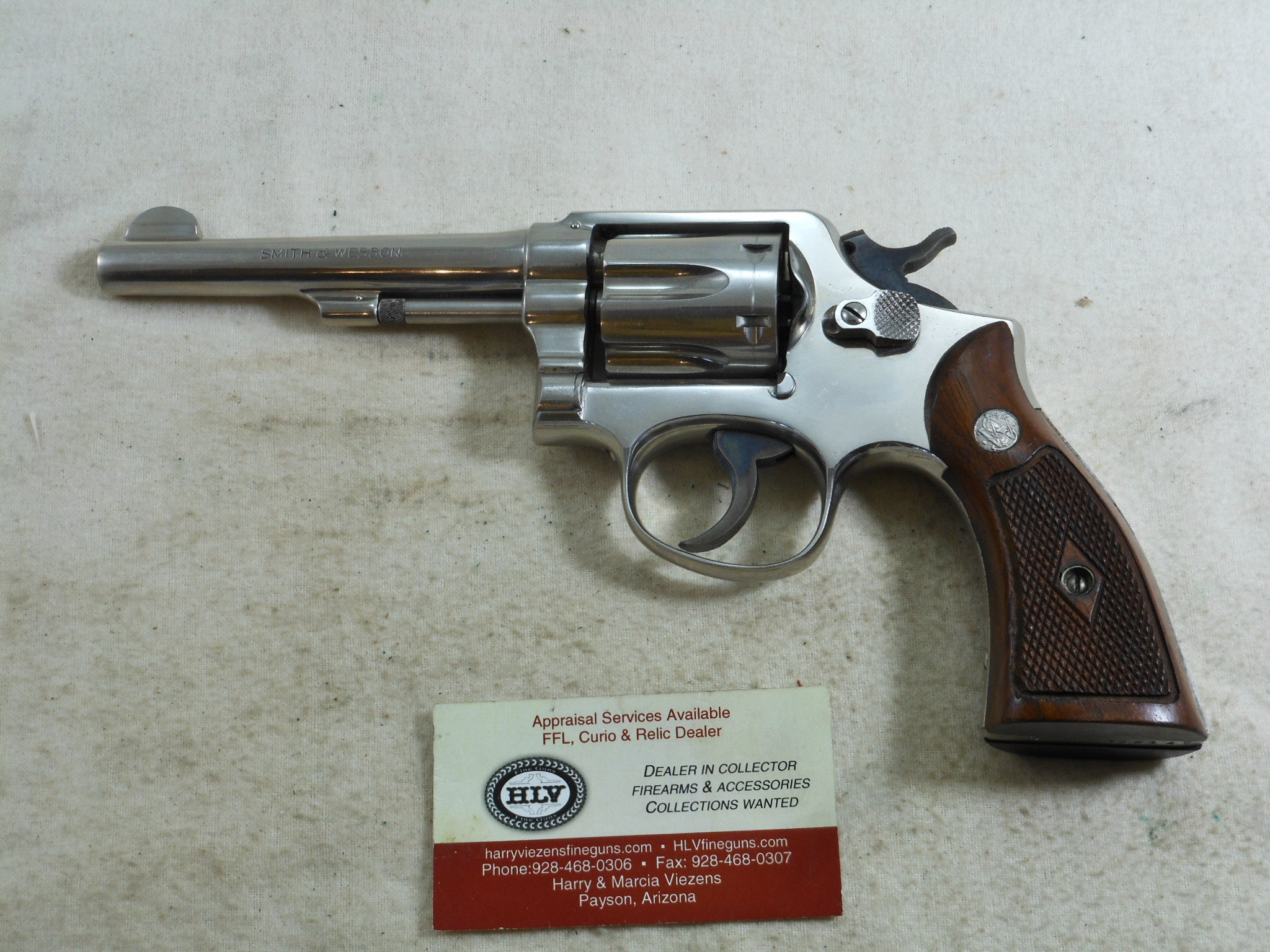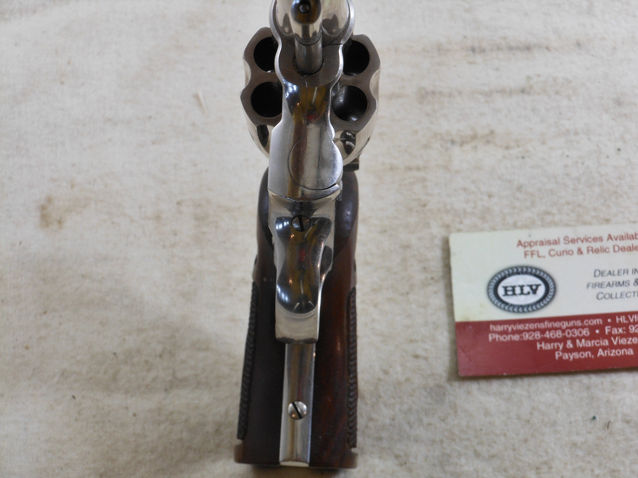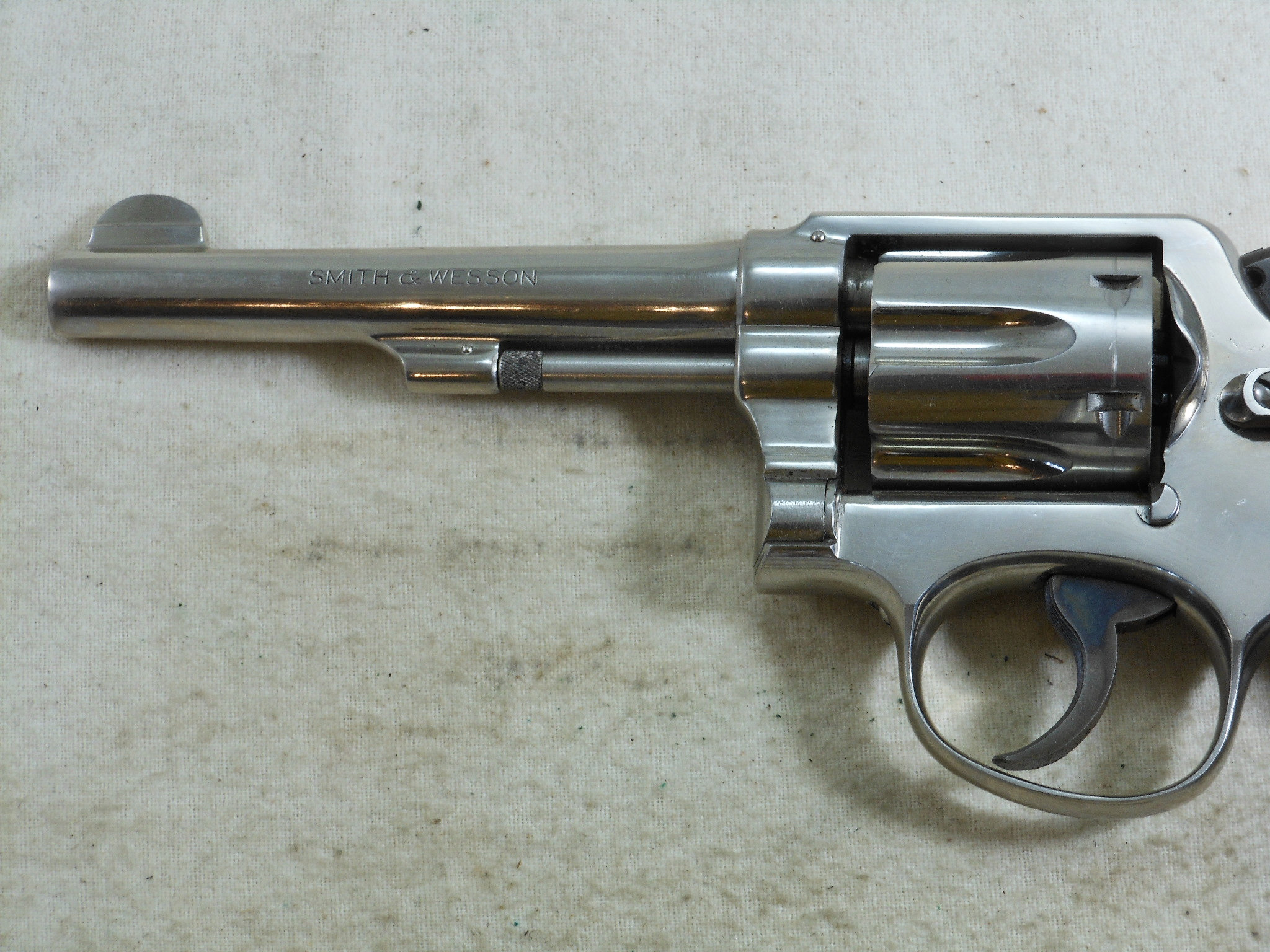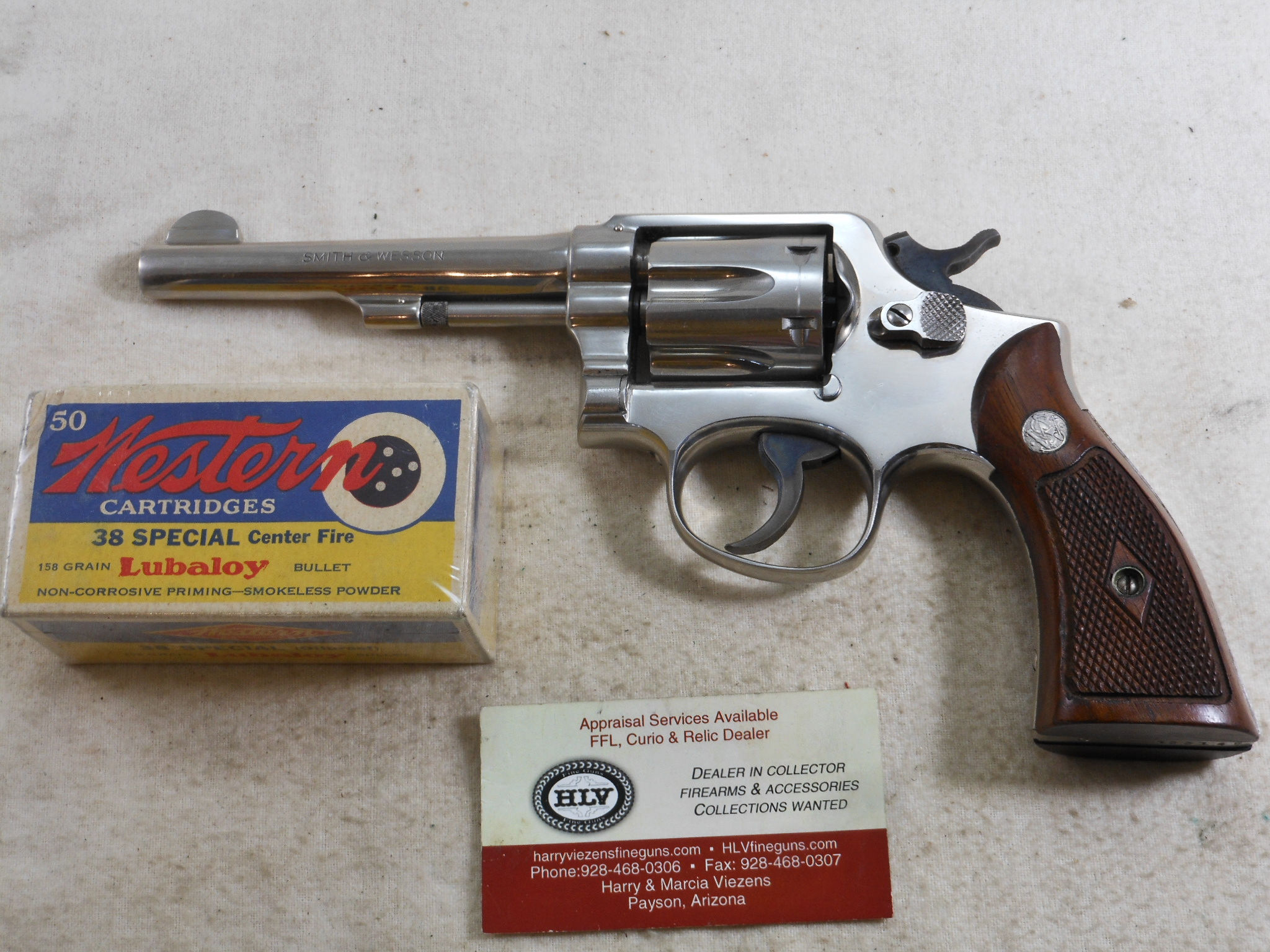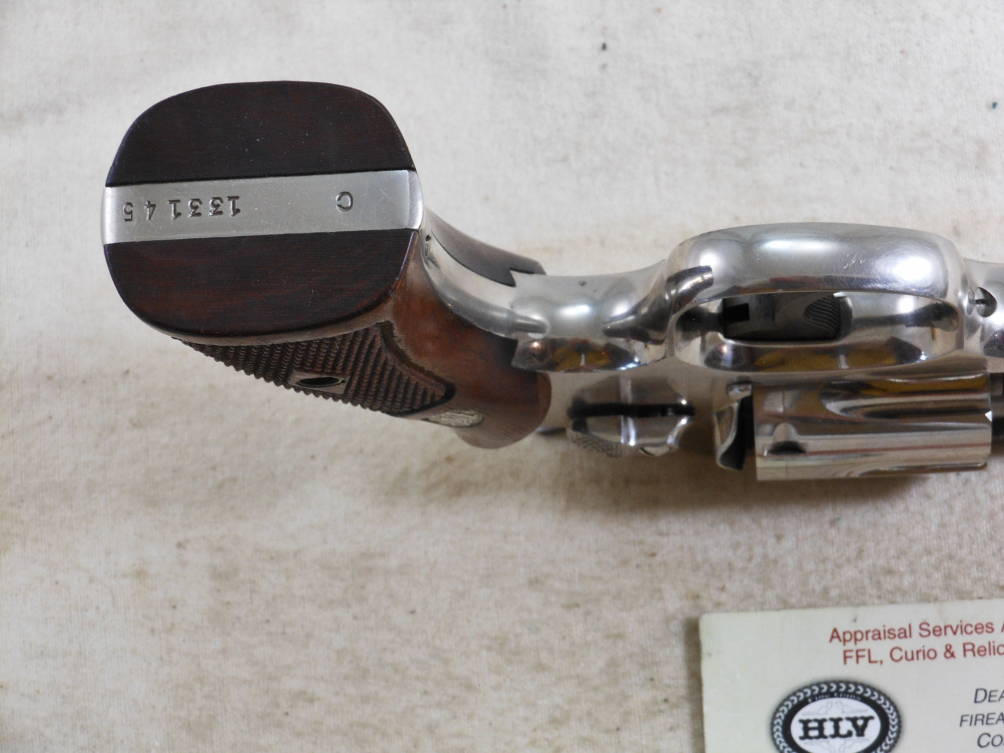 This Smith & Wesson Pre model 10 was produced around 1951. This pistol is a five screw “K” Frame pistol with the pinned barrel. The pistol’s serial number is C 133145. It has the 5 inch barrel chambered to shoot the 38 Special cartridge. The bore and chambers are in minty condition. This pistol shows very little use or being fired. The cylinder face still has the factory plating intact. This factory nickel finish is in very fine bright condition. There is very little sign of wear or use on this nickel finish. This nickel finish would rate a 98% or better condition. The hammer and trigger retain strong color cased finish. The action works great as would be expected of Smith & Wesson. There is the usual light drag line between the cylinder stops. The grips are the correct style grips for this model pistol. These grips are in very fine condition and fit this pistol properly. The grips are however serial numbered to another pistol. This is really a very stunning pistol! This Smith & Wesson belongs in any fine collection and will be a real standout! The Western box of shells is for display only and not for sale!