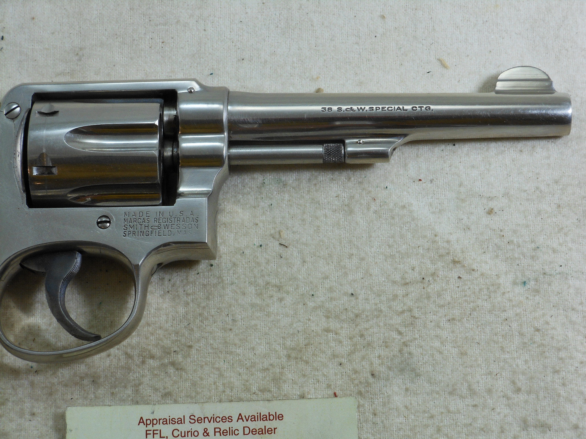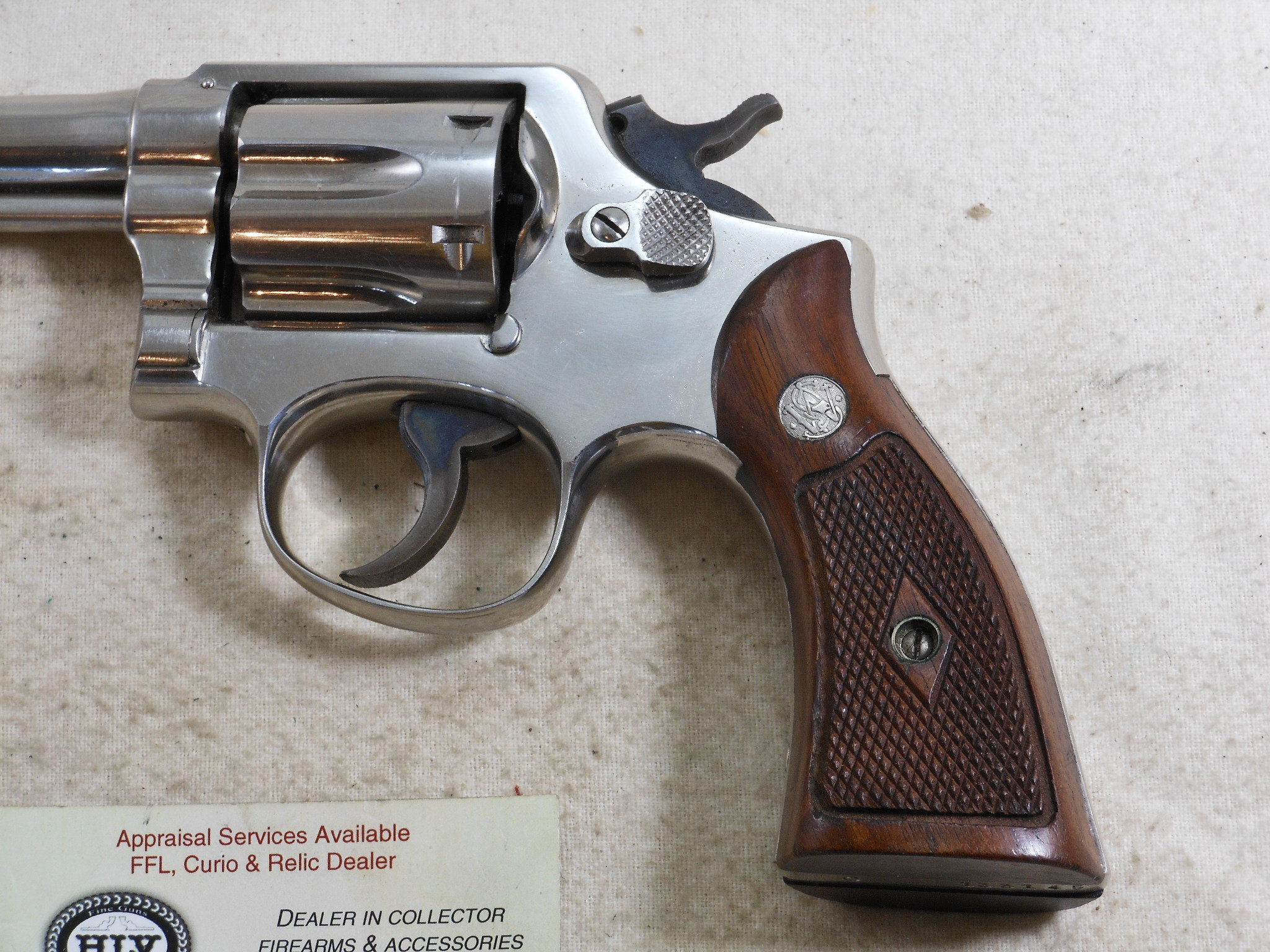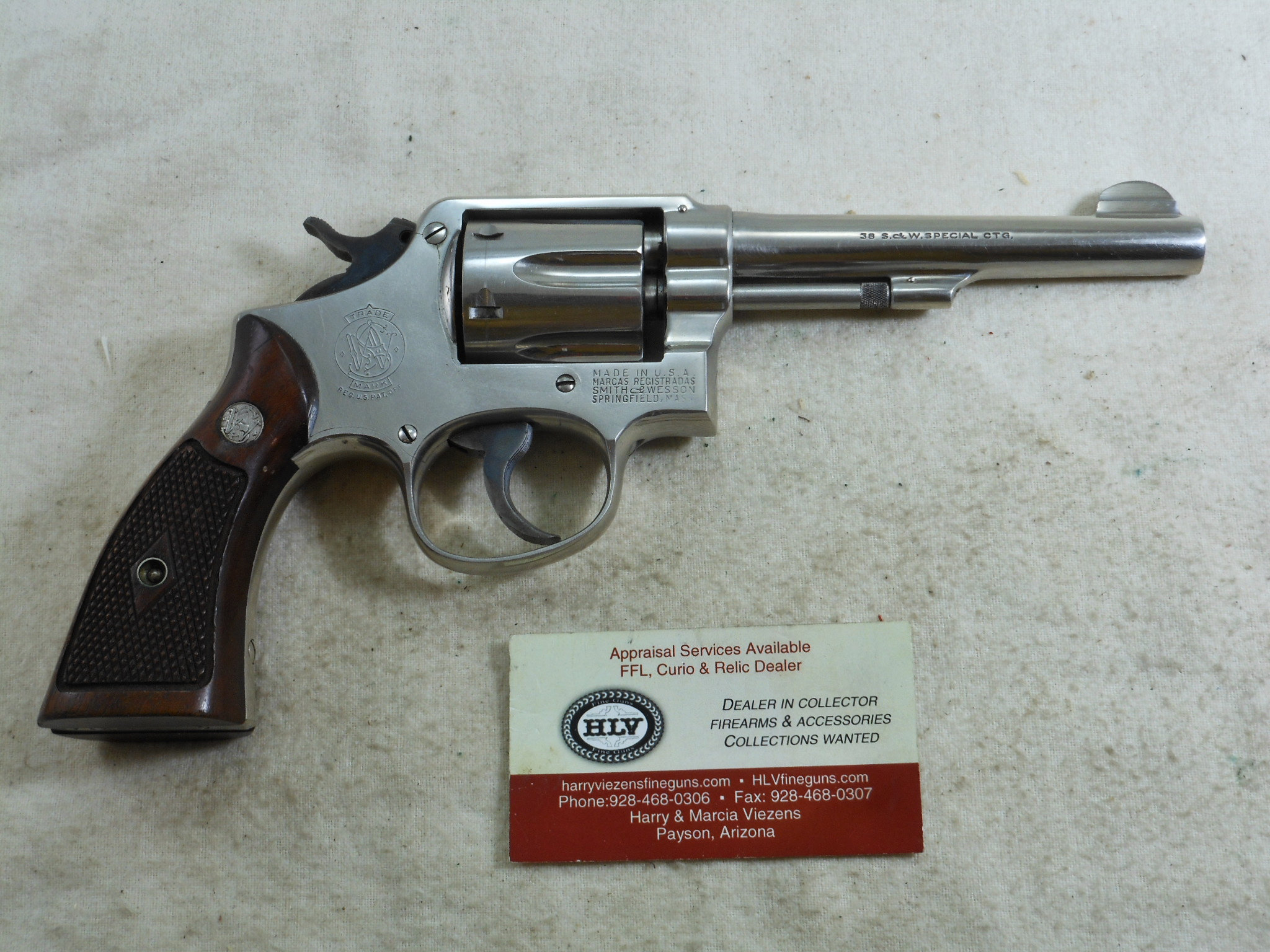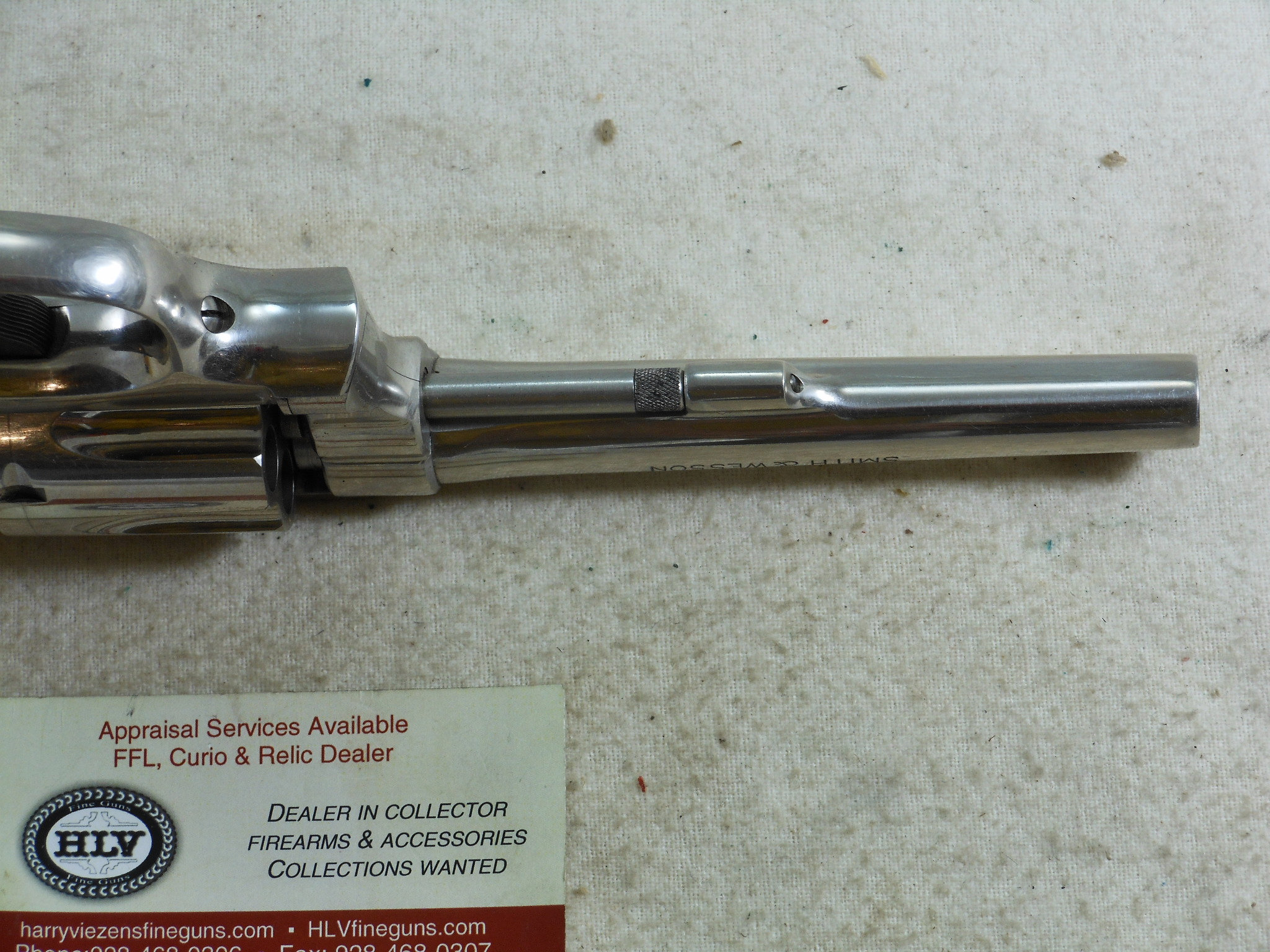 This Smith & Wesson Pre model 10 was produced around 1951. This pistol is a five screw “K” Frame pistol with the pinned barrel. The pistol’s serial number is C 133145. It has the 5 inch barrel chambered to shoot the 38 Special cartridge. The bore and chambers are in minty condition. This pistol shows very little use or being fired. The cylinder face still has the factory plating intact. This factory nickel finish is in very fine bright condition. There is very little sign of wear or use on this nickel finish. This nickel finish would rate a 98% or better condition. The hammer and trigger retain strong color cased finish. The action works great as would be expected of Smith & Wesson. There is the usual light drag line between the cylinder stops. The grips are the correct style grips for this model pistol. These grips are in very fine condition and fit this pistol properly. The grips are however serial numbered to another pistol. This is really a very stunning pistol! This Smith & Wesson belongs in any fine collection and will be a real standout! The Western box of shells is for display only and not for sale!