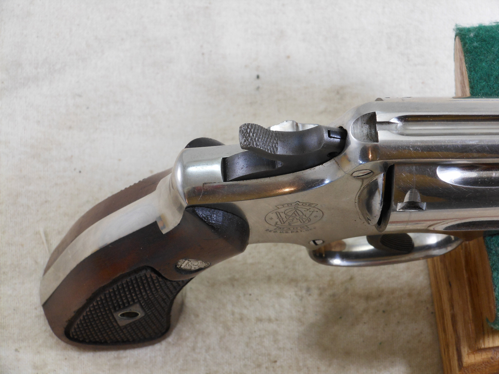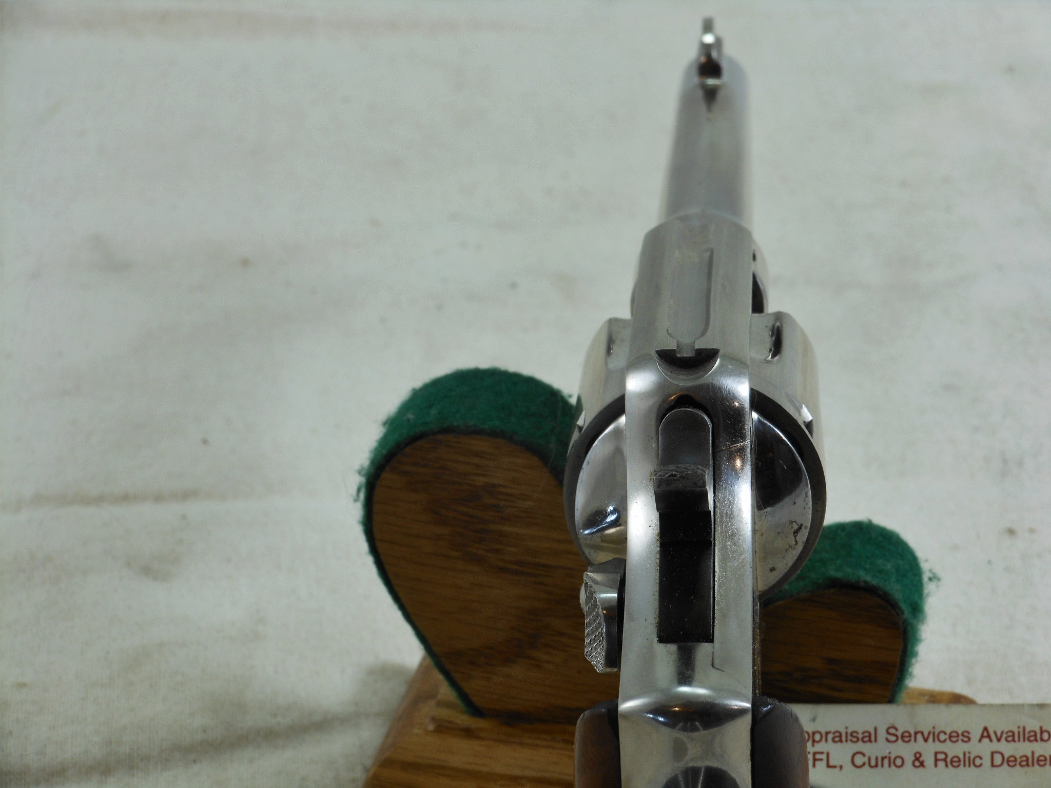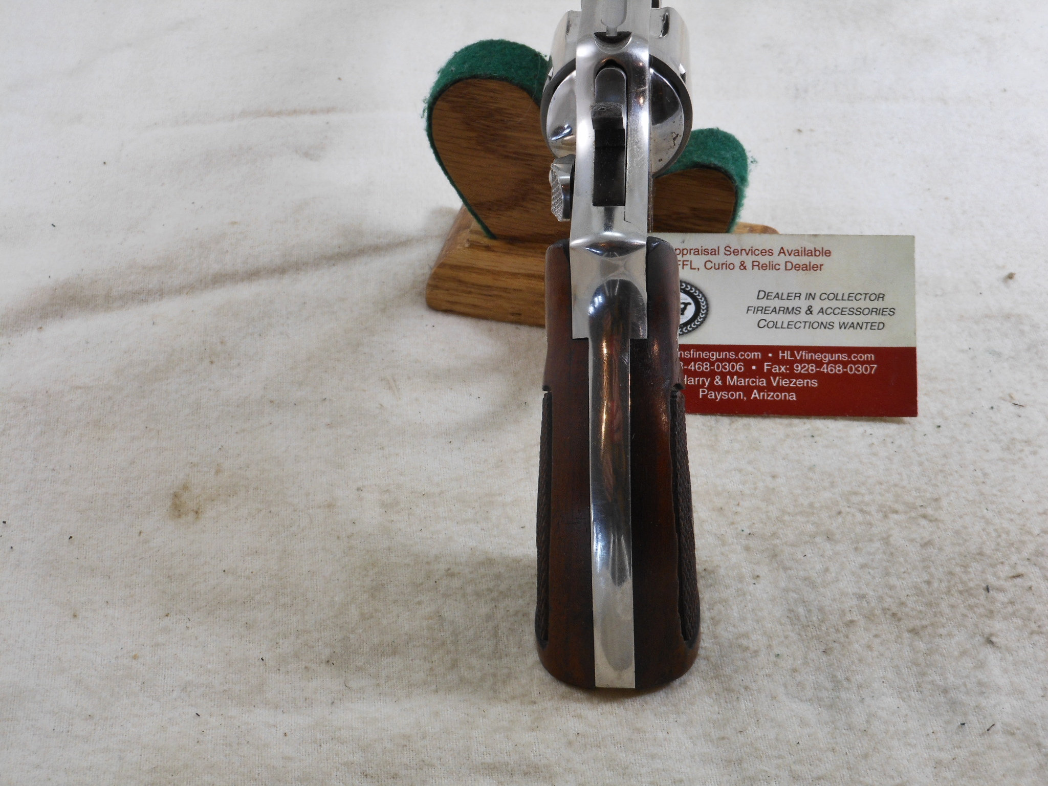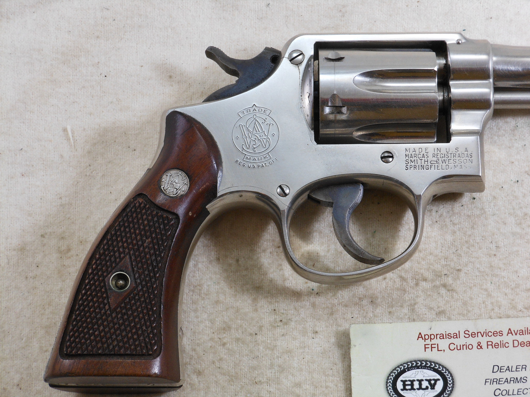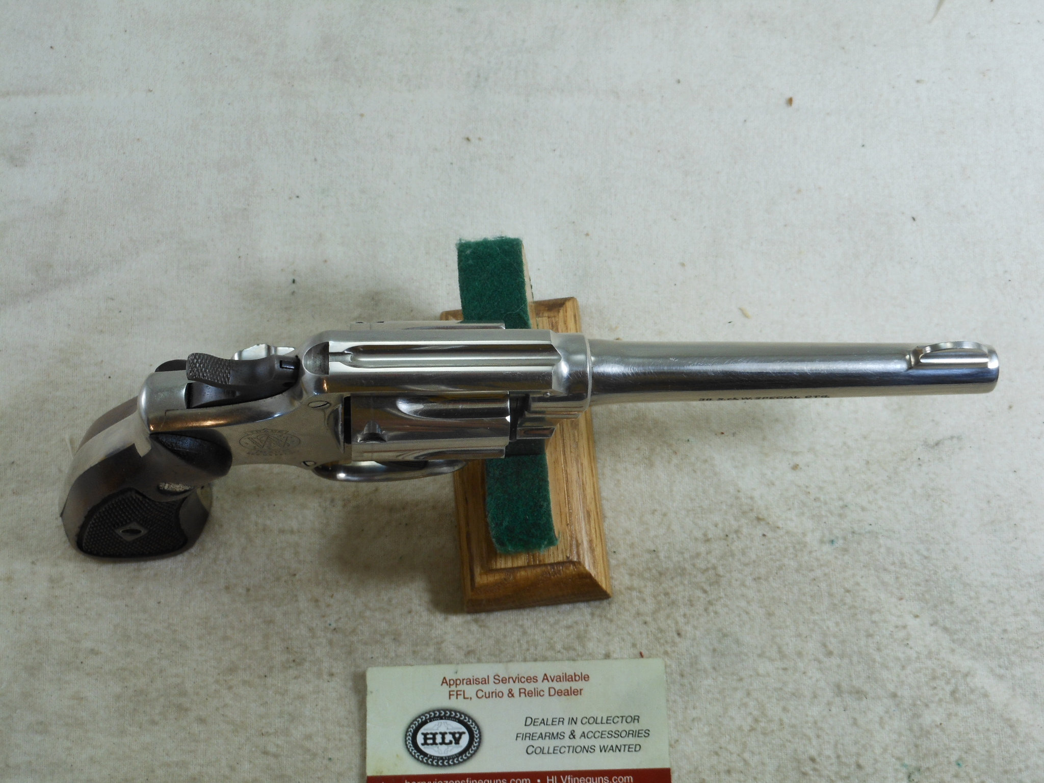 This Smith & Wesson Pre model 10 was produced around 1951. This pistol is a five screw “K” Frame pistol with the pinned barrel. The pistol’s serial number is C 133145. It has the 5 inch barrel chambered to shoot the 38 Special cartridge. The bore and chambers are in minty condition. This pistol shows very little use or being fired. The cylinder face still has the factory plating intact. This factory nickel finish is in very fine bright condition. There is very little sign of wear or use on this nickel finish. This nickel finish would rate a 98% or better condition. The hammer and trigger retain strong color cased finish. The action works great as would be expected of Smith & Wesson. There is the usual light drag line between the cylinder stops. The grips are the correct style grips for this model pistol. These grips are in very fine condition and fit this pistol properly. The grips are however serial numbered to another pistol. This is really a very stunning pistol! This Smith & Wesson belongs in any fine collection and will be a real standout! The Western box of shells is for display only and not for sale!