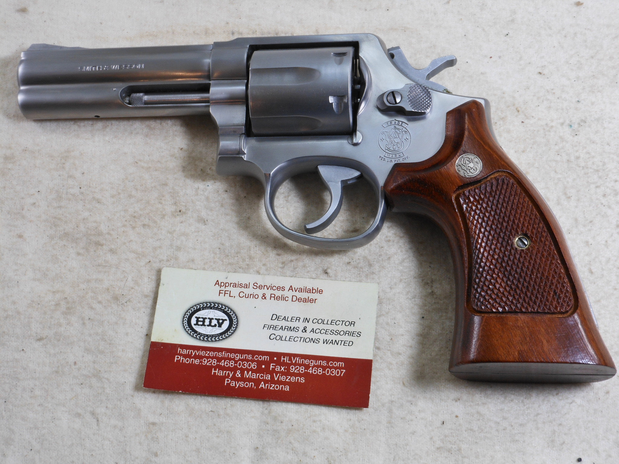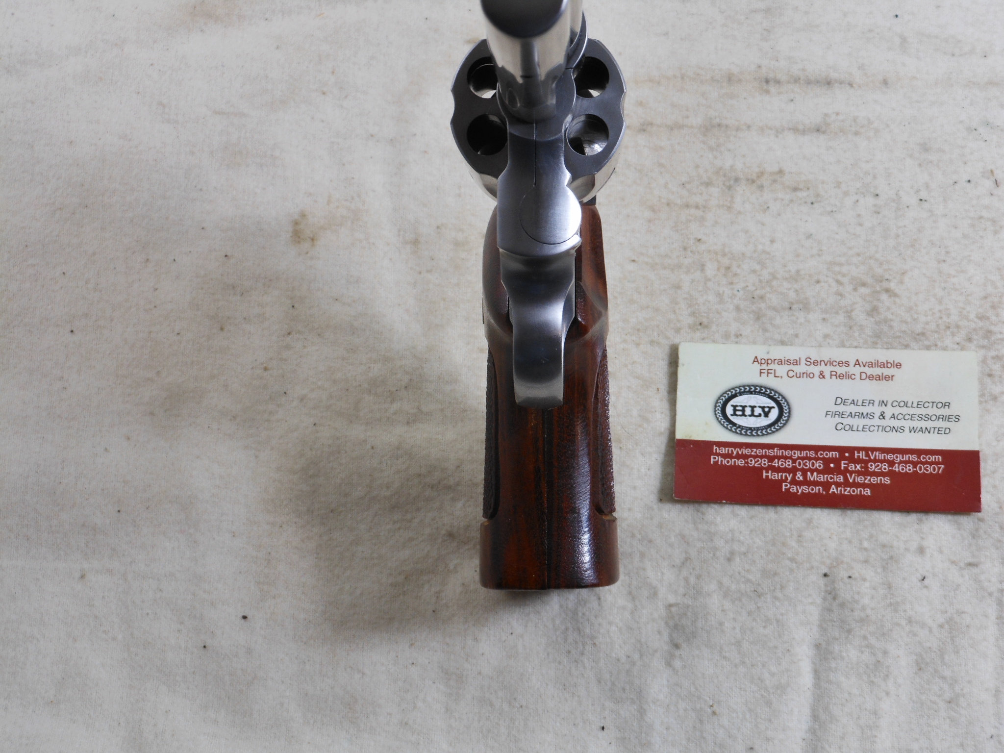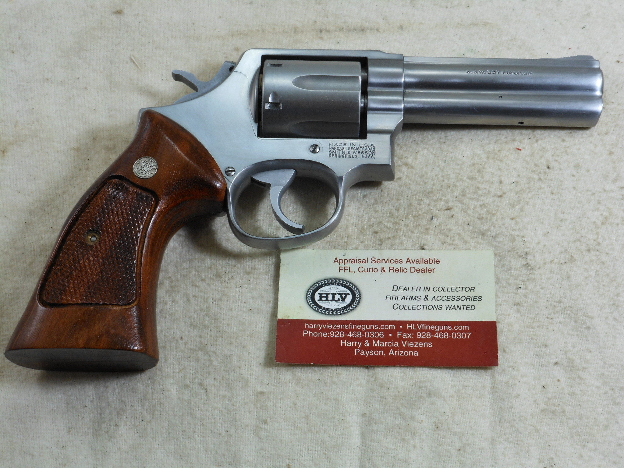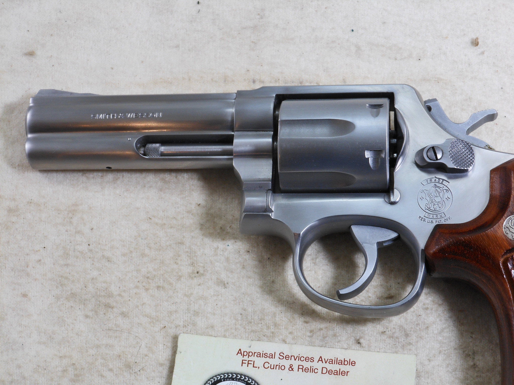 This Smith & Wesson was produced in 1987. The pistol’s serial number is BAN 4838. It has the 4 inch stainless steel barrel with the standard ramp sight. The bore is in minty condition. This pistol would rate a 99% condition! This pistol is all stainless steel. This Smith & Wesson is in almost new condition. There is very little sign of use and being fired. The grips are original to this pistol. The action works as you would expect from Smith & Wesson! This is a really good looking pistol! Smith & Wesson built this pistol to be a tough gun and stand much wear and field use! The Box Of Shell Is For Display Only And Not For Sale!