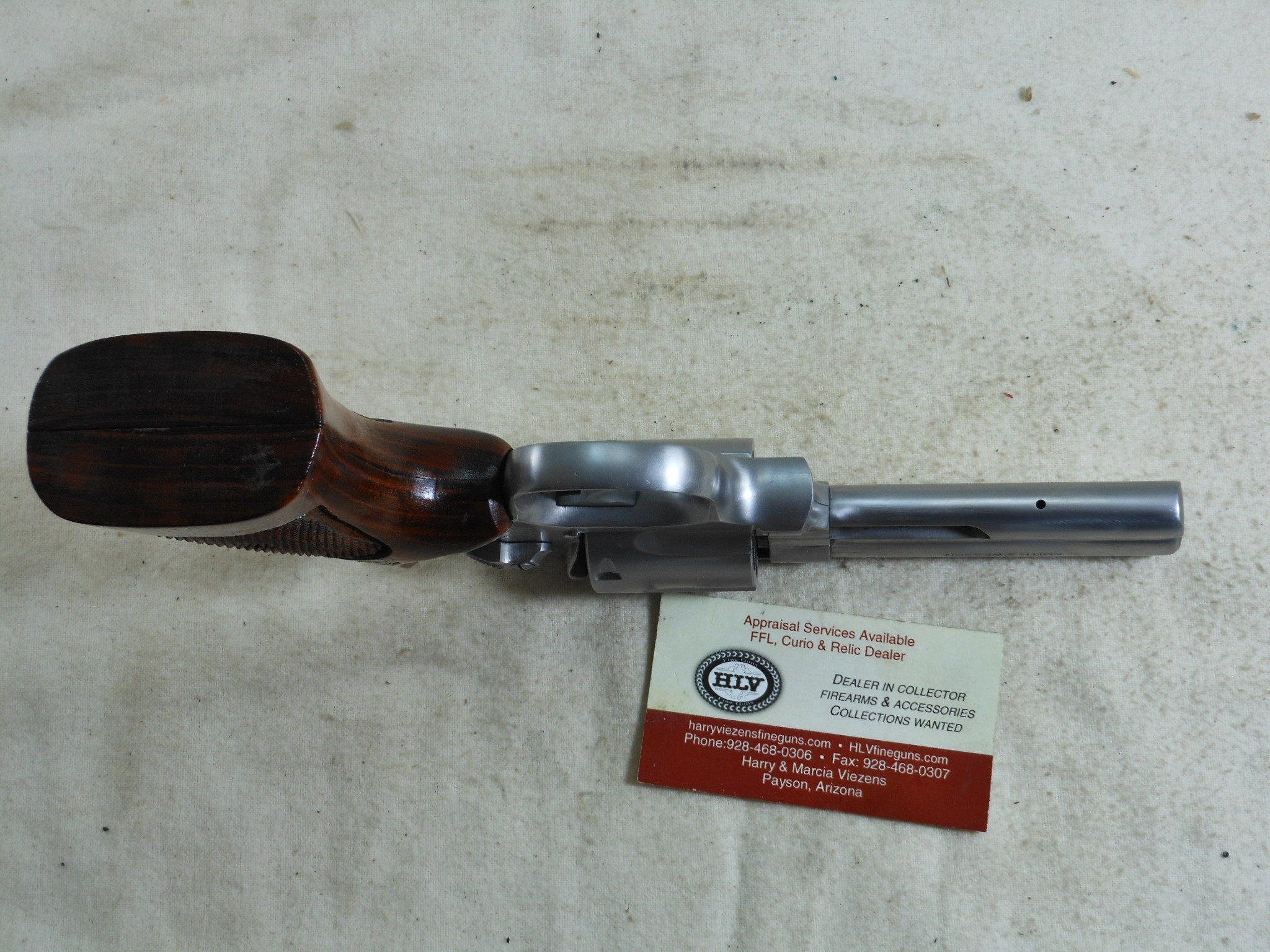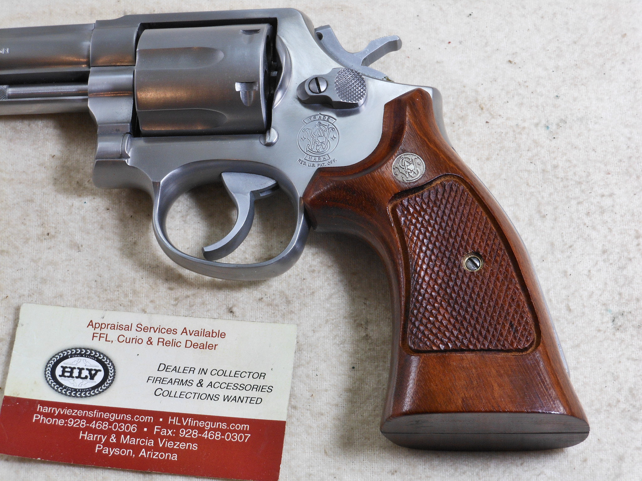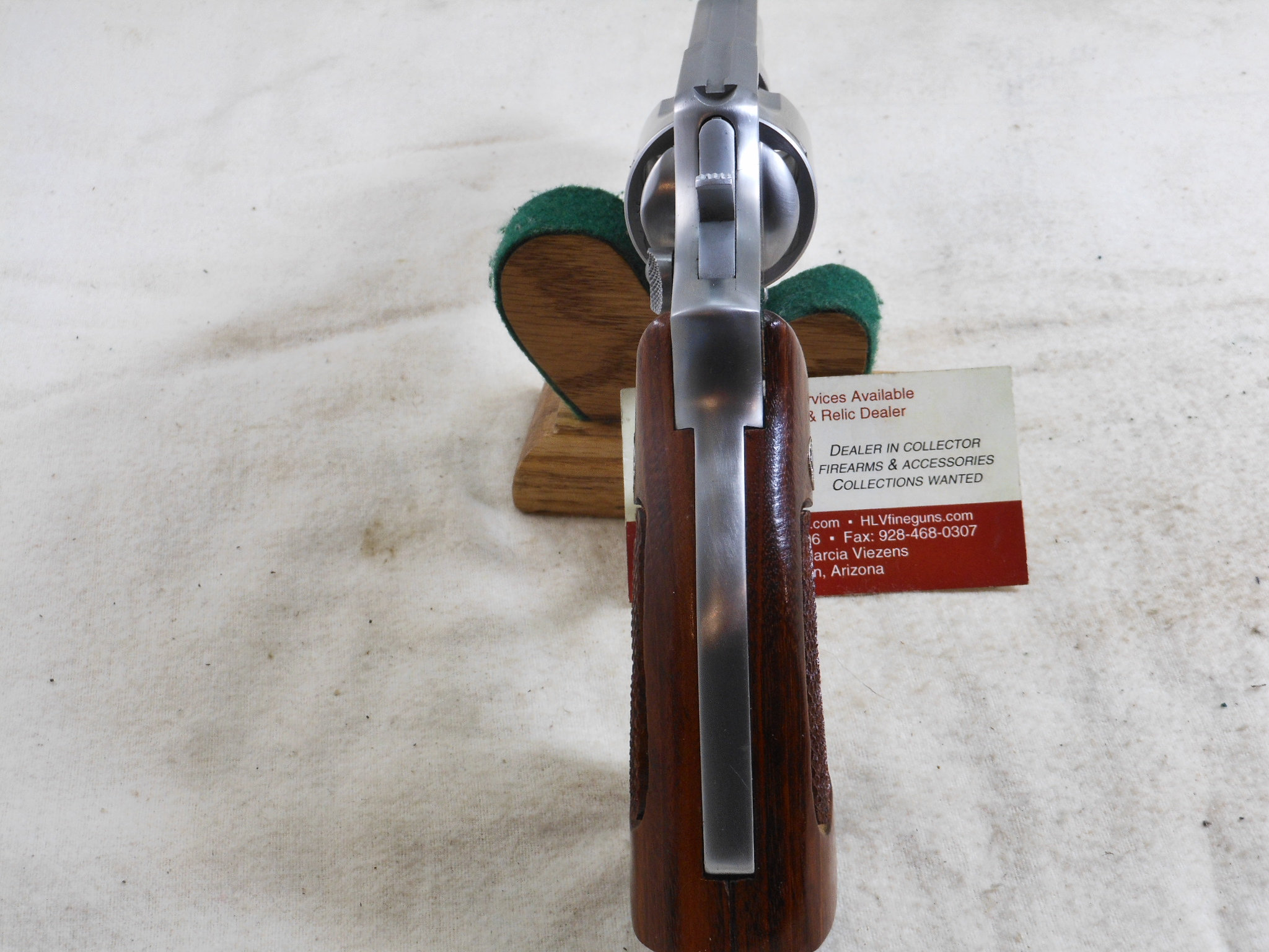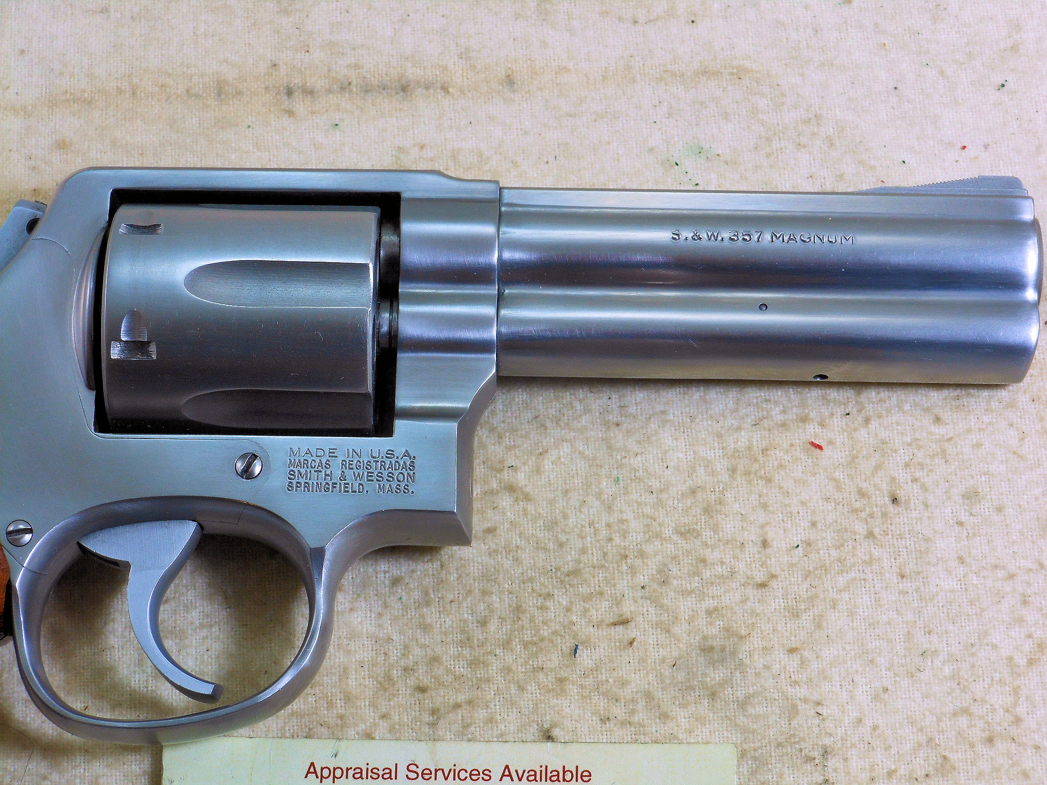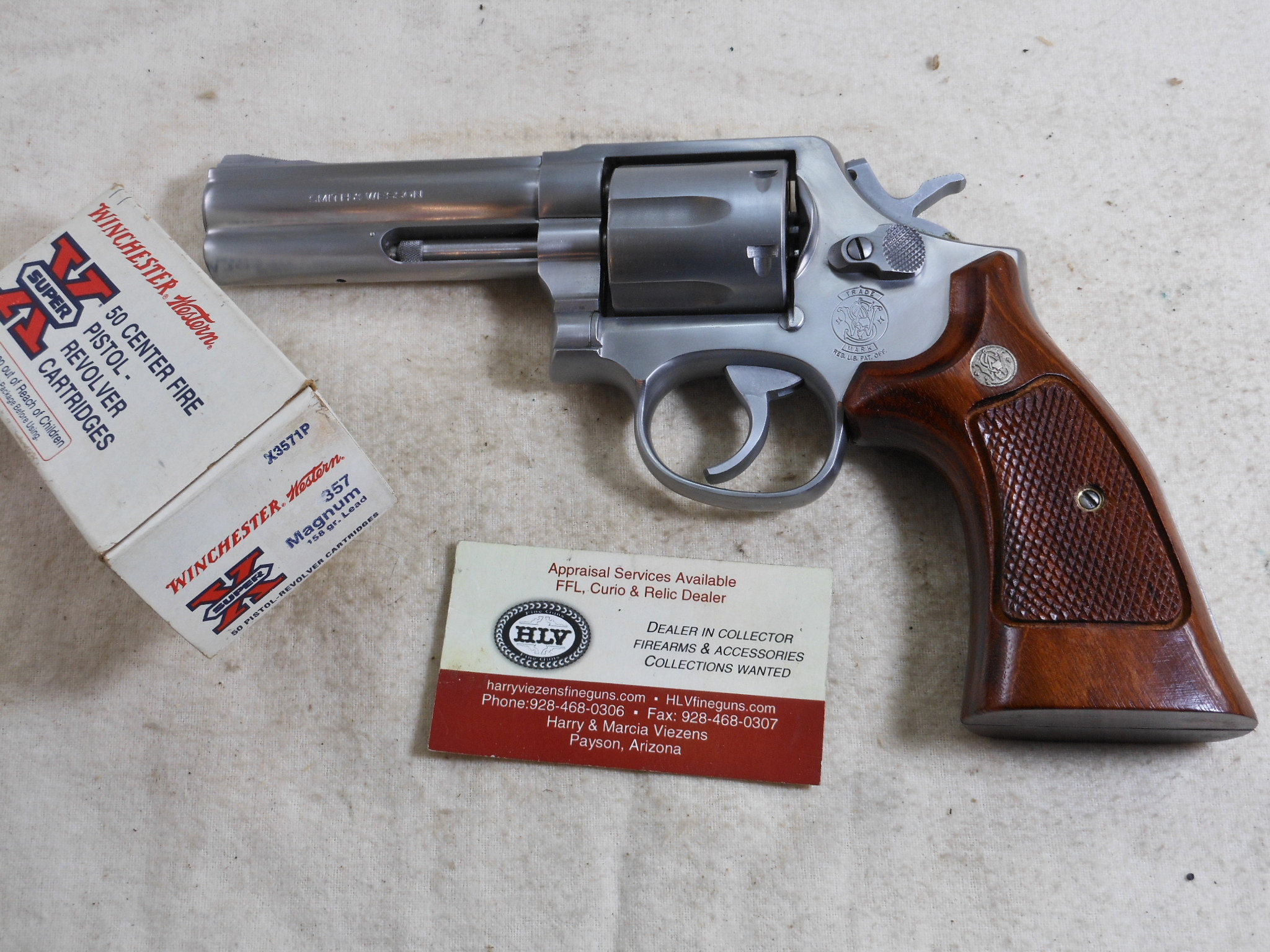 This Smith & Wesson was produced in 1987. The pistol’s serial number is BAN 4838. It has the 4 inch stainless steel barrel with the standard ramp sight. The bore is in minty condition. This pistol would rate a 99% condition! This pistol is all stainless steel. This Smith & Wesson is in almost new condition. There is very little sign of use and being fired. The grips are original to this pistol. The action works as you would expect from Smith & Wesson! This is a really good looking pistol! Smith & Wesson built this pistol to be a tough gun and stand much wear and field use! The Box Of Shell Is For Display Only And Not For Sale!