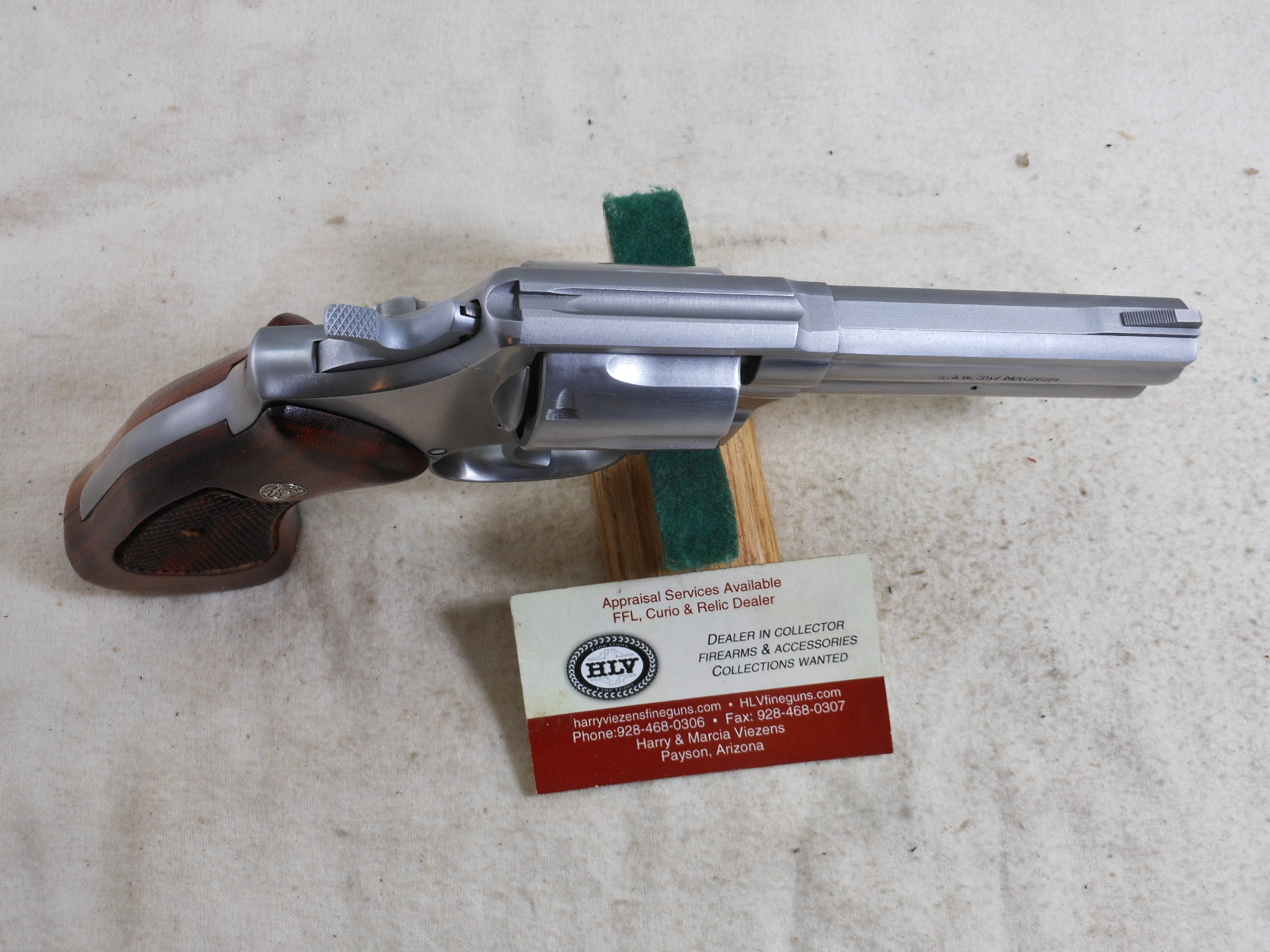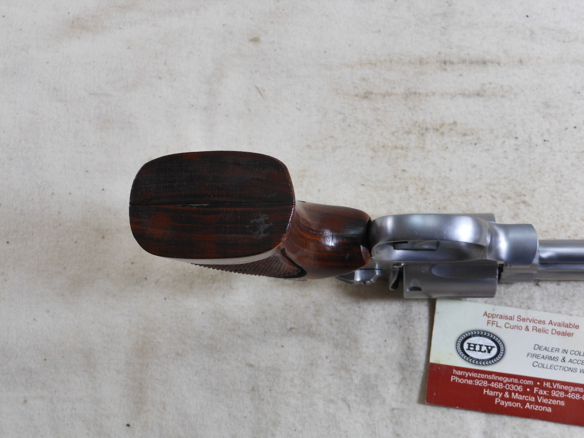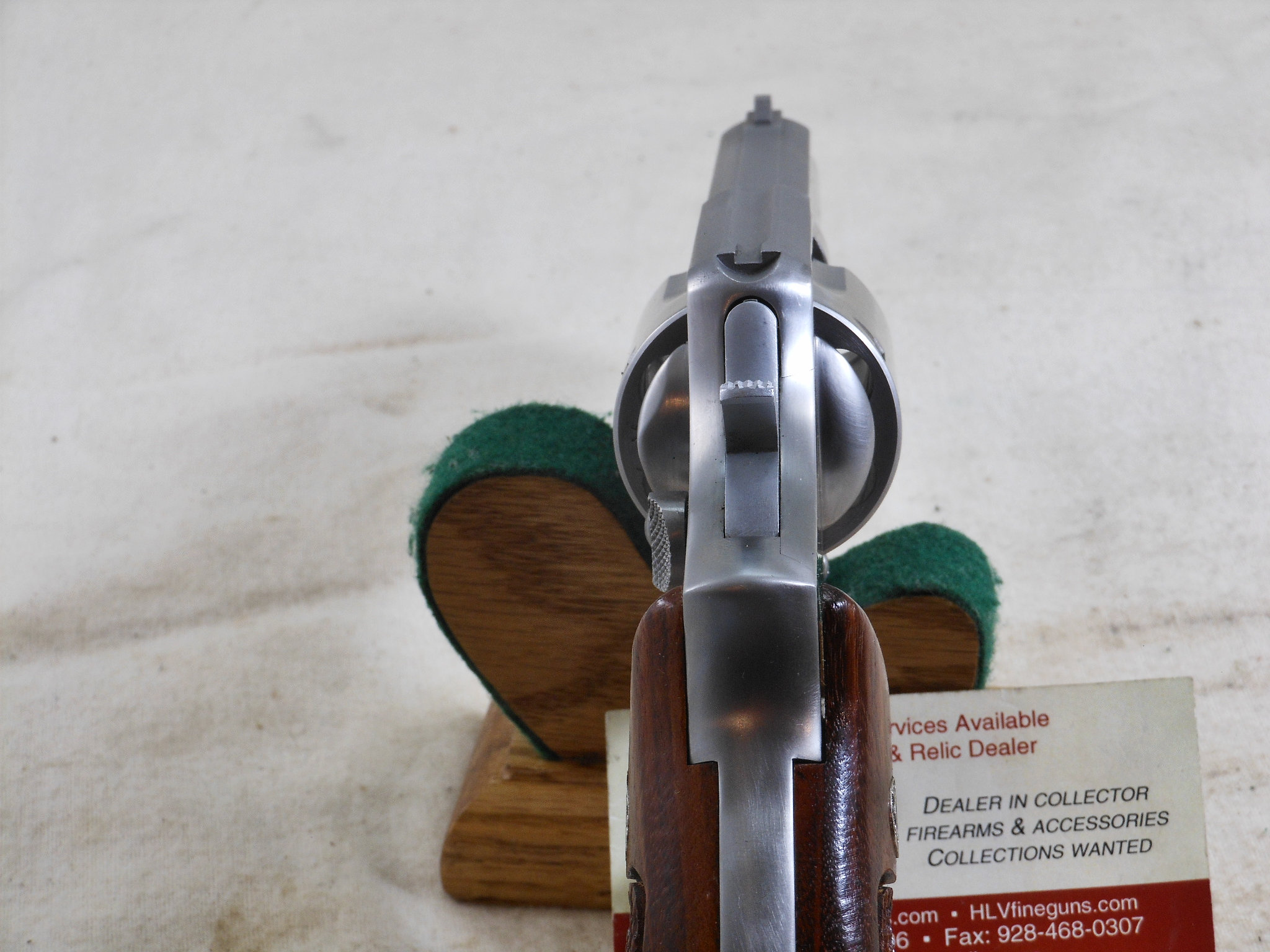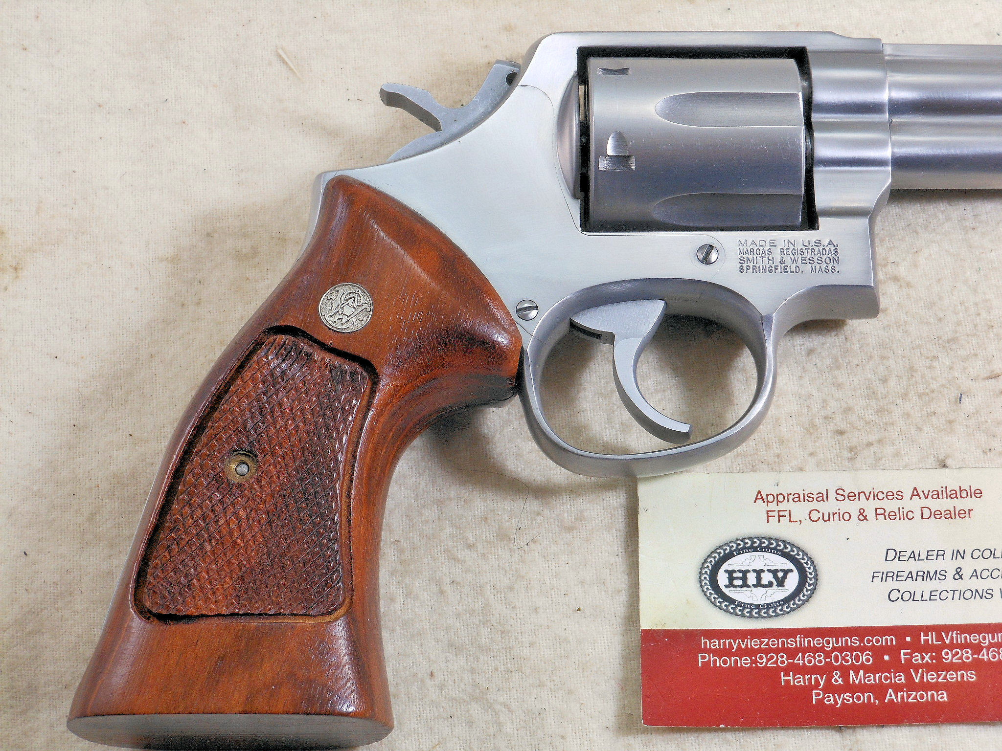 This Smith & Wesson was produced in 1987. The pistol’s serial number is BAN 4838. It has the 4 inch stainless steel barrel with the standard ramp sight. The bore is in minty condition. This pistol would rate a 99% condition! This pistol is all stainless steel. This Smith & Wesson is in almost new condition. There is very little sign of use and being fired. The grips are original to this pistol. The action works as you would expect from Smith & Wesson! This is a really good looking pistol! Smith & Wesson built this pistol to be a tough gun and stand much wear and field use! The Box Of Shell Is For Display Only And Not For Sale!