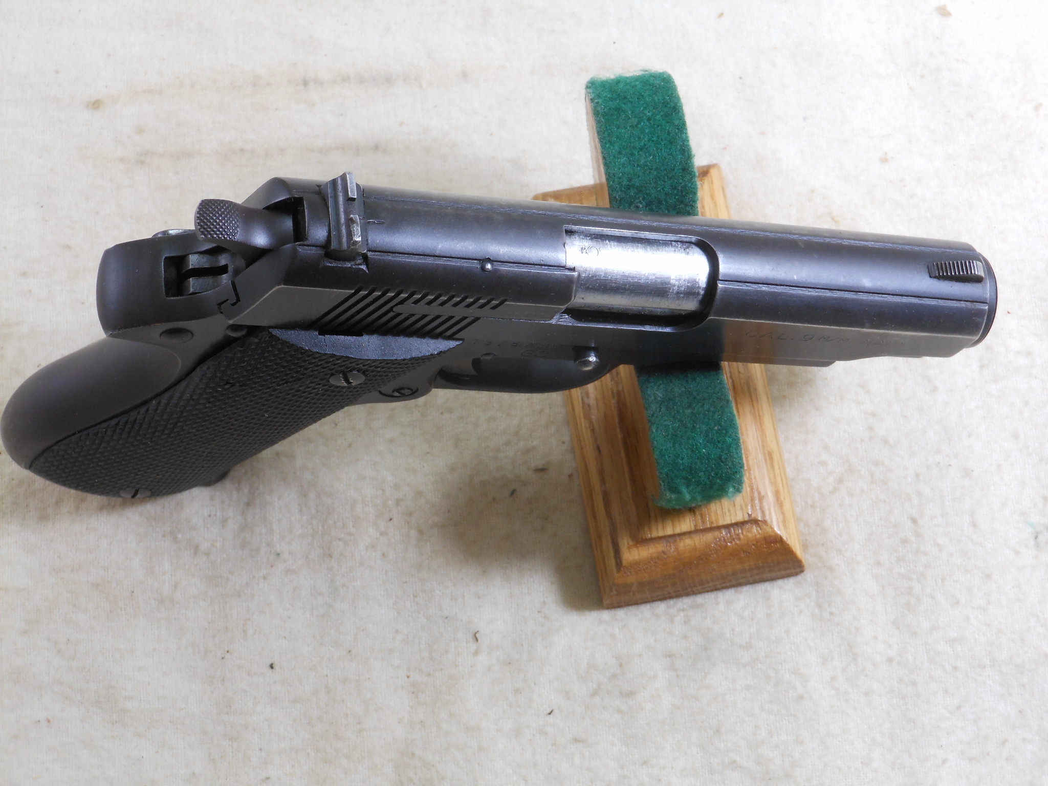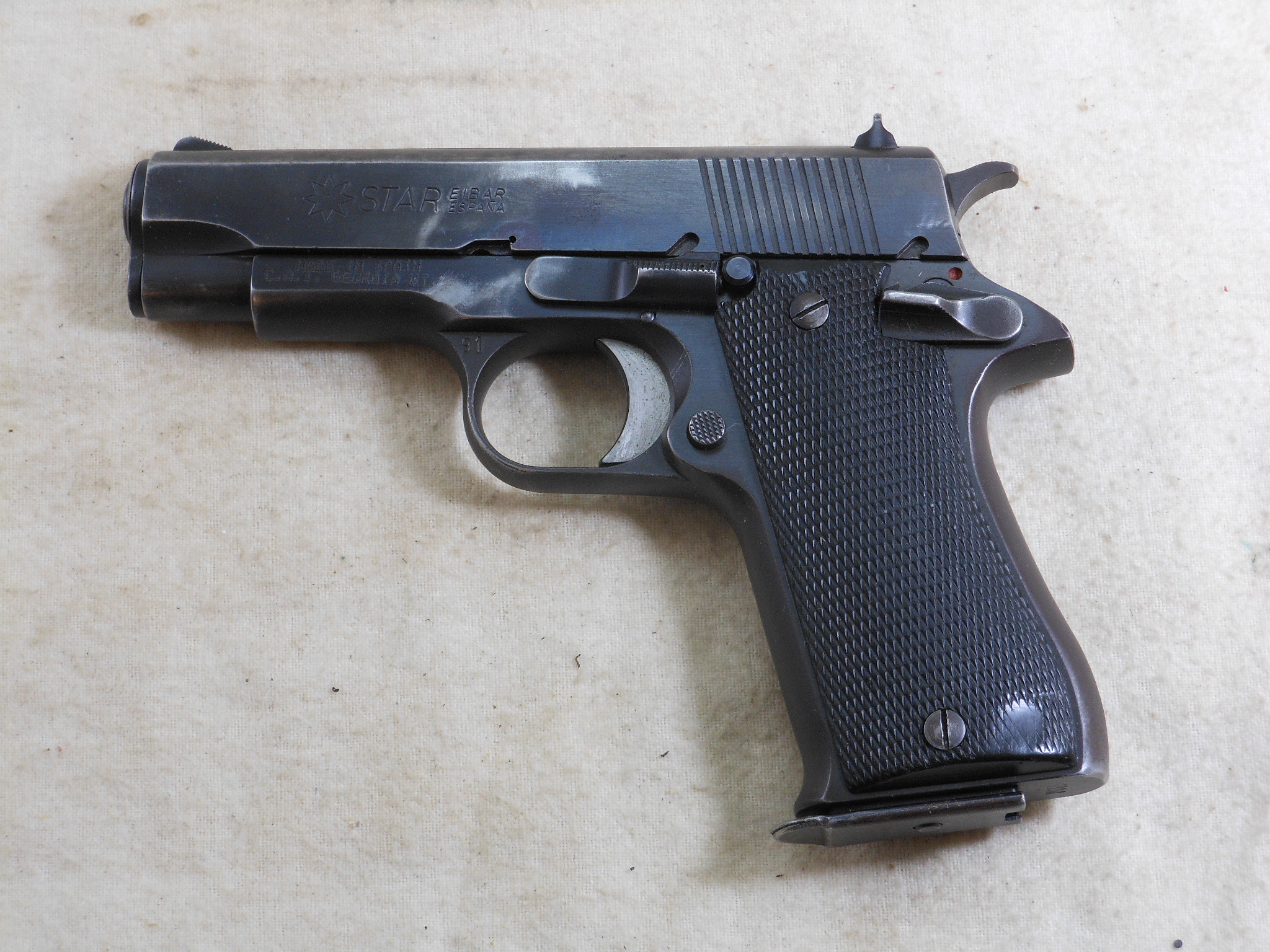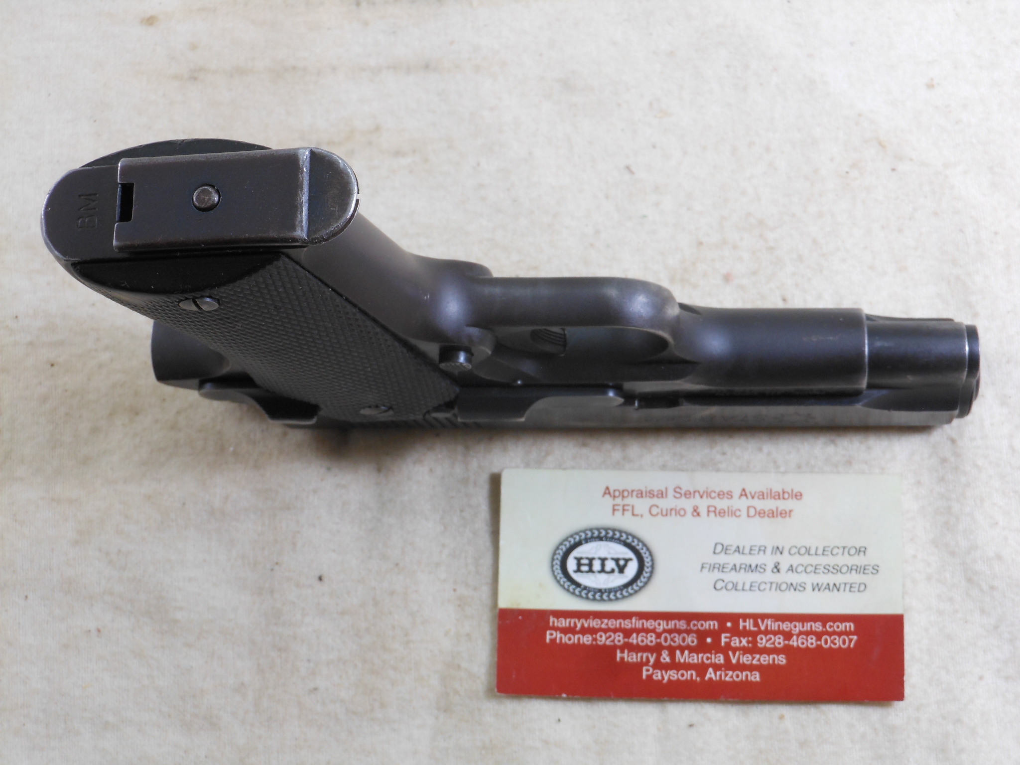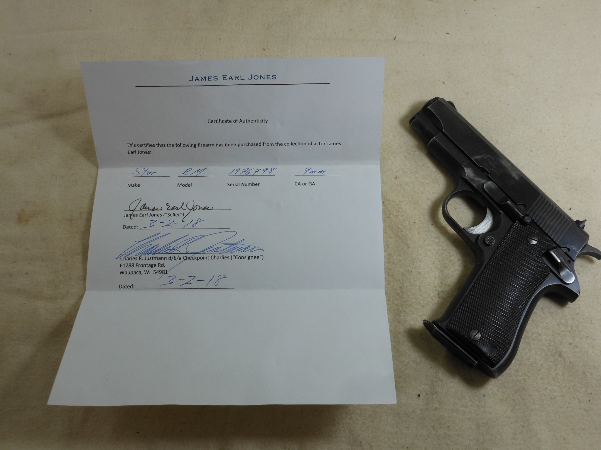 This Star Model BM in 9m/m Luger is in fine shooting order. This Pistol’s serial number is 1976798. I have the original letter of provenance from James Earl Jones. to Check Point Charlie who was a well known dealer. This pistol does have the Import stamp on the frame. The importer is C.A.I. from Virginia. This pistol shows wear and use but no abuse. It appears to be a very well made pistol. The bore is bright with sharp lands. The black plastic grips are fully checkered showing some wear in spots. The magazine is a correct magazine for this pistol. This is a chance to own a pistol from a famous actor with provenance!